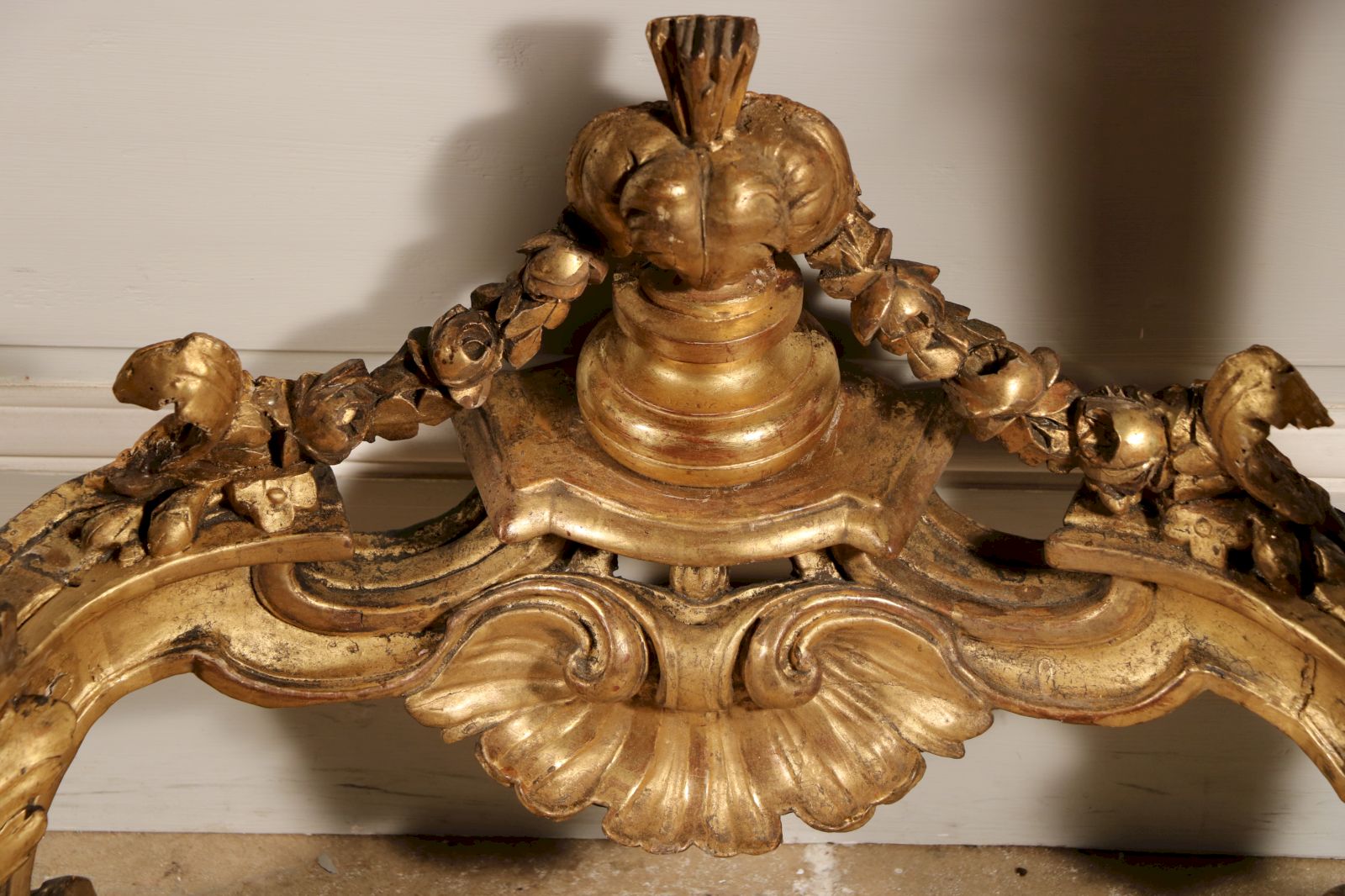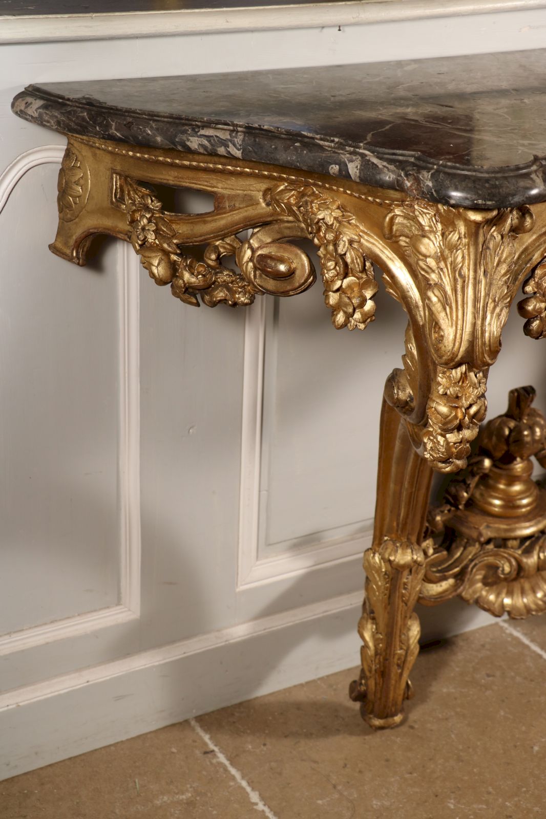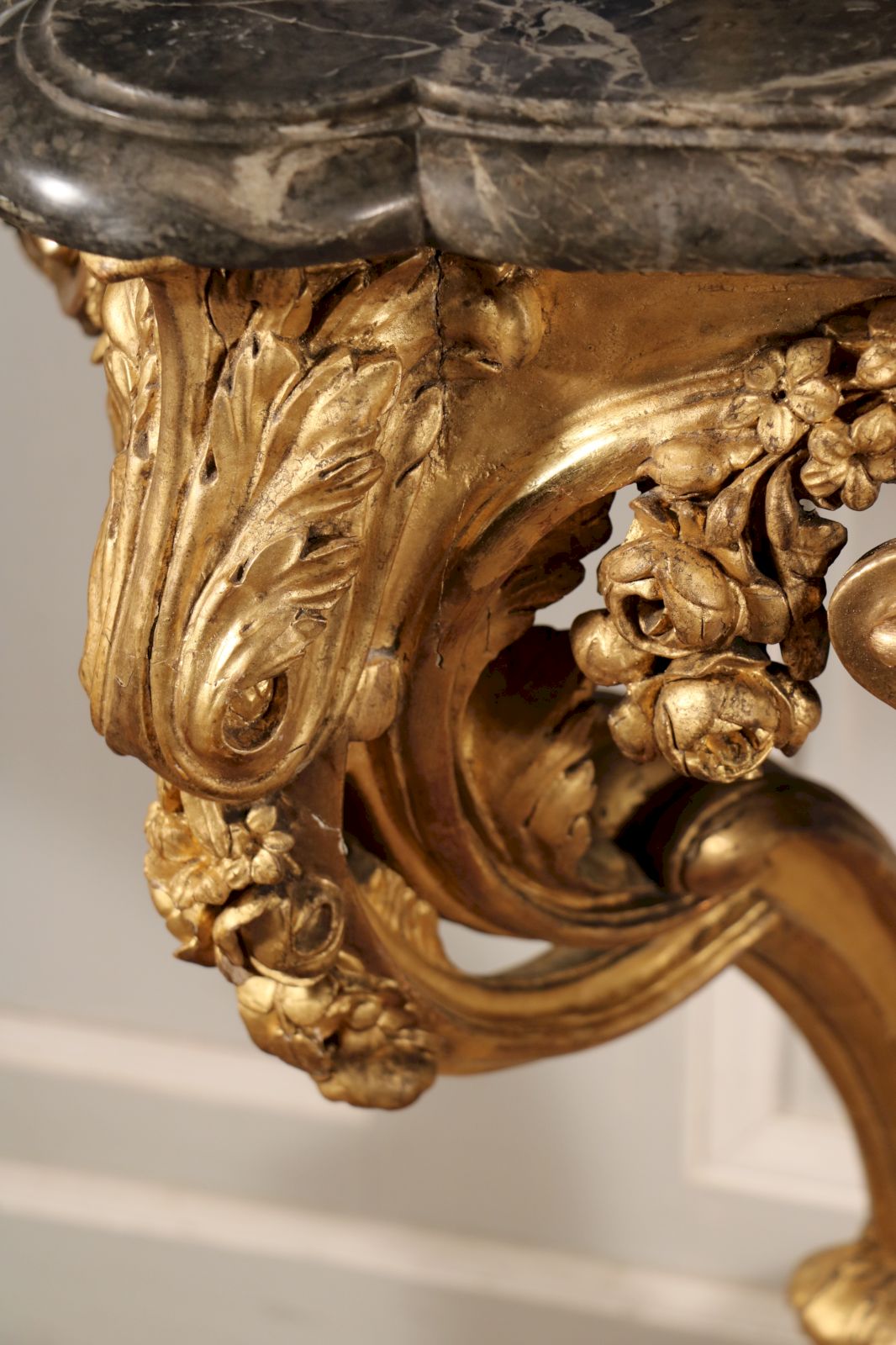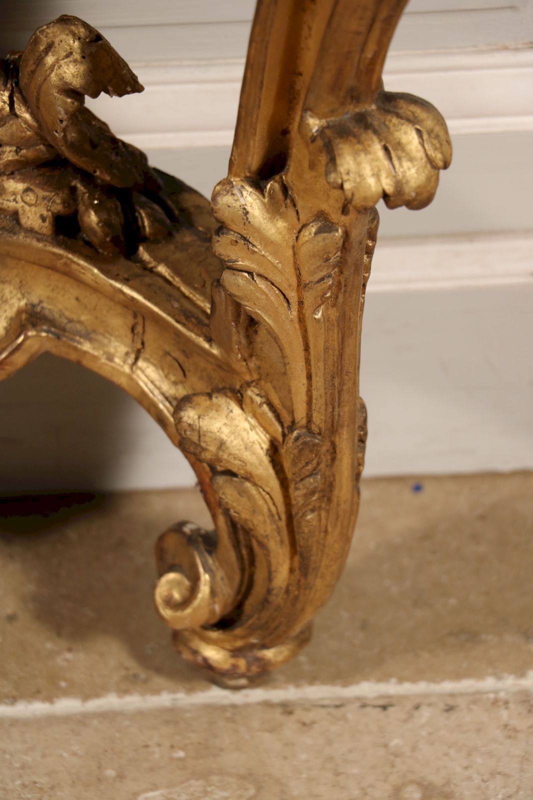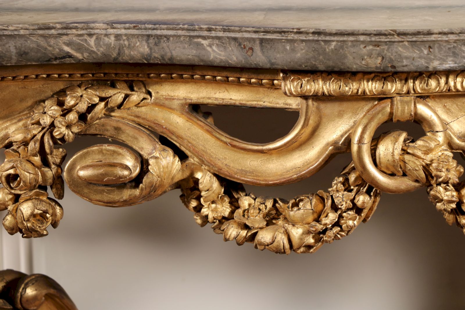 Console, bois sculpté, stuqué et doré, dessus de marbre taillé en bec de corbin, fin de l’époque Louis XV. Dim. (H x L x P): 132 x 81,5 x 51,5 cm. La console présente une ceinture en arbalète reposant sur deux pieds cintrés en console, rejoints entre eux par une entretoise occupée d’une noix. La ceinture et le piètement sont ajourés par une fin travail de sculpture associant les courbes sinueuses du rocaille finissant enrichi d’acanthe, et les guirlandes de fleurs retombant en festons depuis un anneau central, suivant une manière plus néoclassique, comme le rang de perles placé au-dessous du marbre. L’entretoise en occupée par une coquille héritée de projets souvent reproduits de l’architecte Contant d’Ivry. Au-dessus d’elle se dresse un élément rapporté (remplaçant très certainement un socle trop dégradé). Ce dernier est couronné de l’aigrette, elle authentique, d’où festonnent deux guirlandes. Celle de gauche a été copiée, celle de droite est originale. Le piètement s’achève en deux puissantes feuilles d’acanthe enroulées sur elles-mêmes. Cette console est une réalisation tardive dans le règne de Louis XV. Elle est déjà fortement imprégnée des suppliques aux orfèvres de Cochin et des voeux pieux de l’abbé Dubois pour un retour au classicisme et au modèle antique. Ce retour s’opère dès le retour de Rome de Soufflot et de Marigny et est accompagné par madame de Pompadour dans les dernières années de sa vie. Reprises anciennes à la dorure (à la mixtion) et reprises effectuées à la feuille dans le cadre d’une récente restauration. La guirlande gauche de la noix et le support de l’aigrette rapportés.