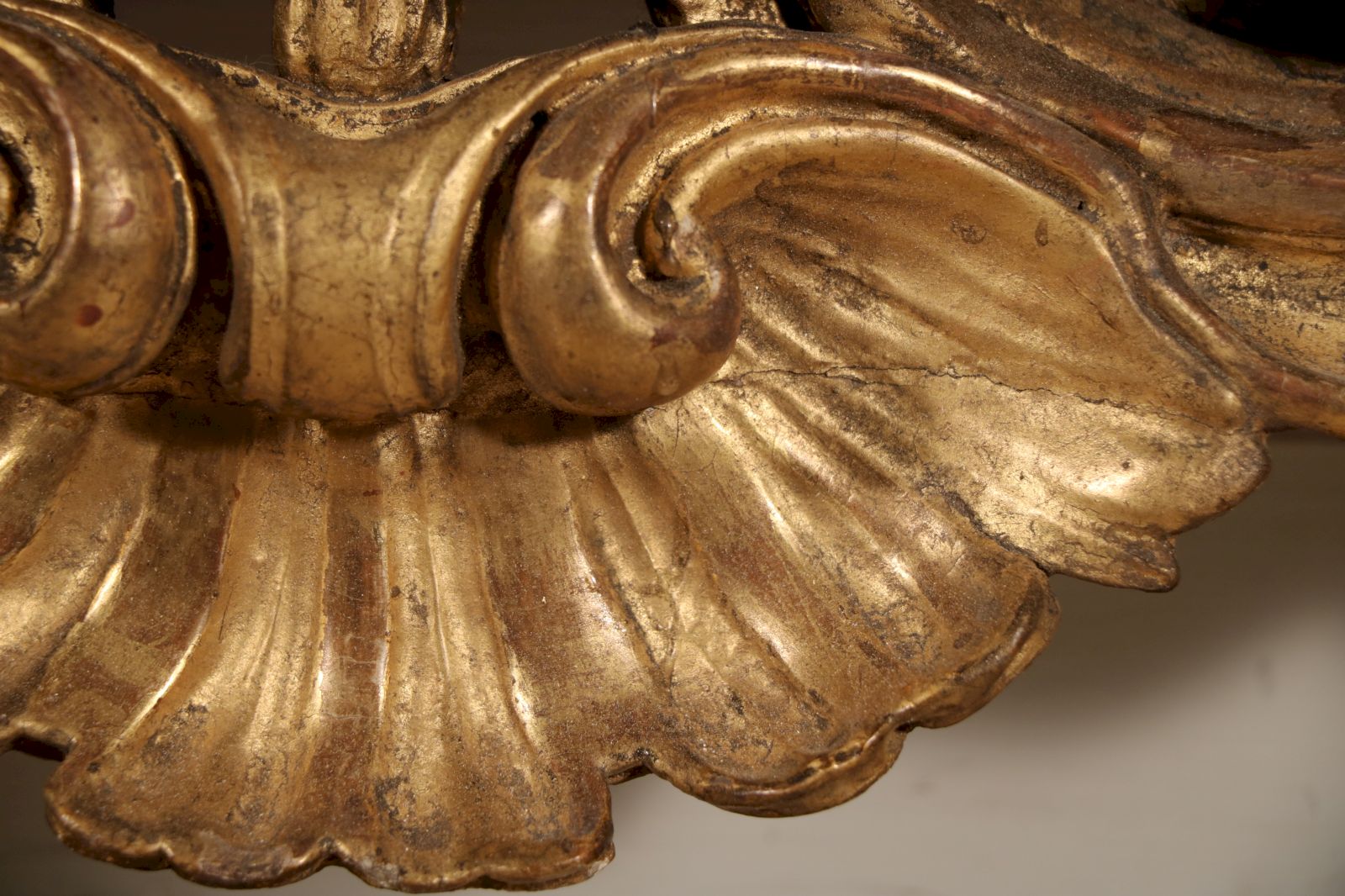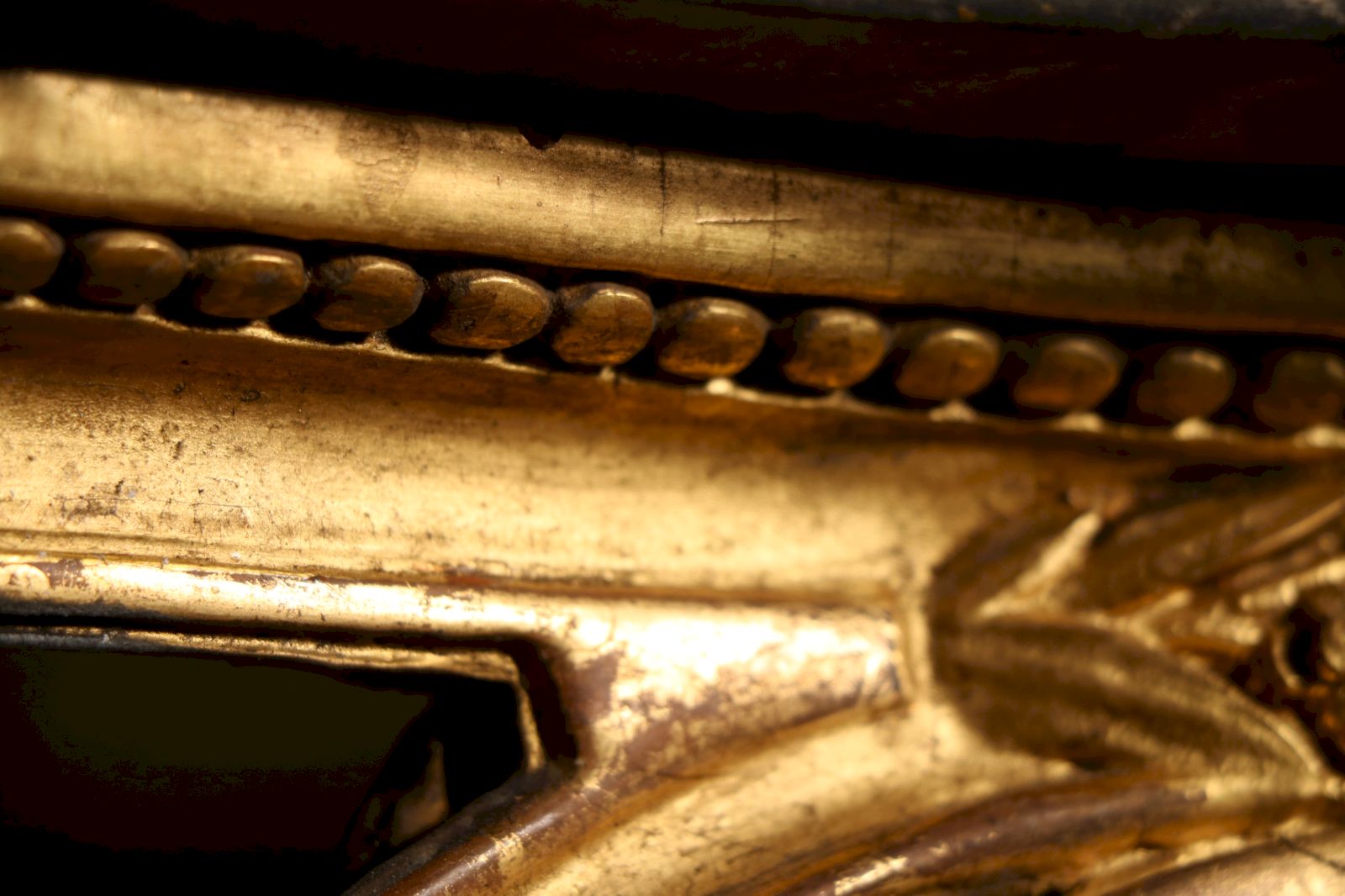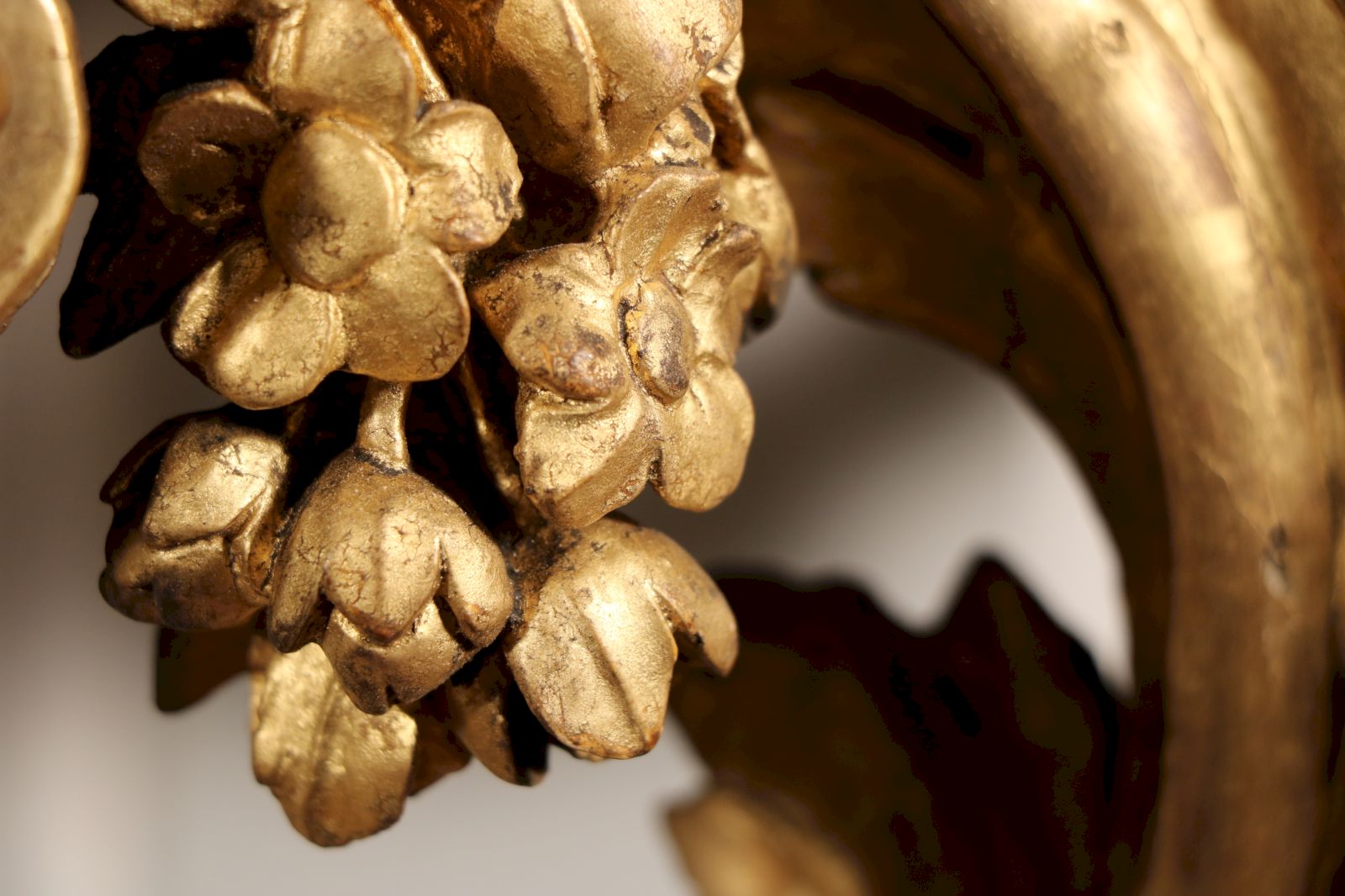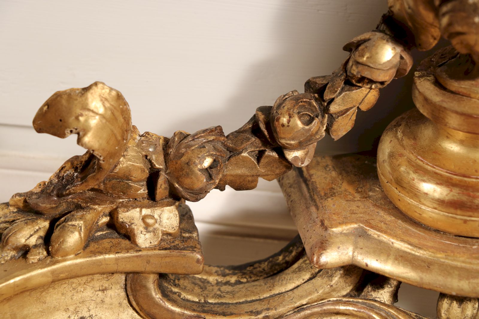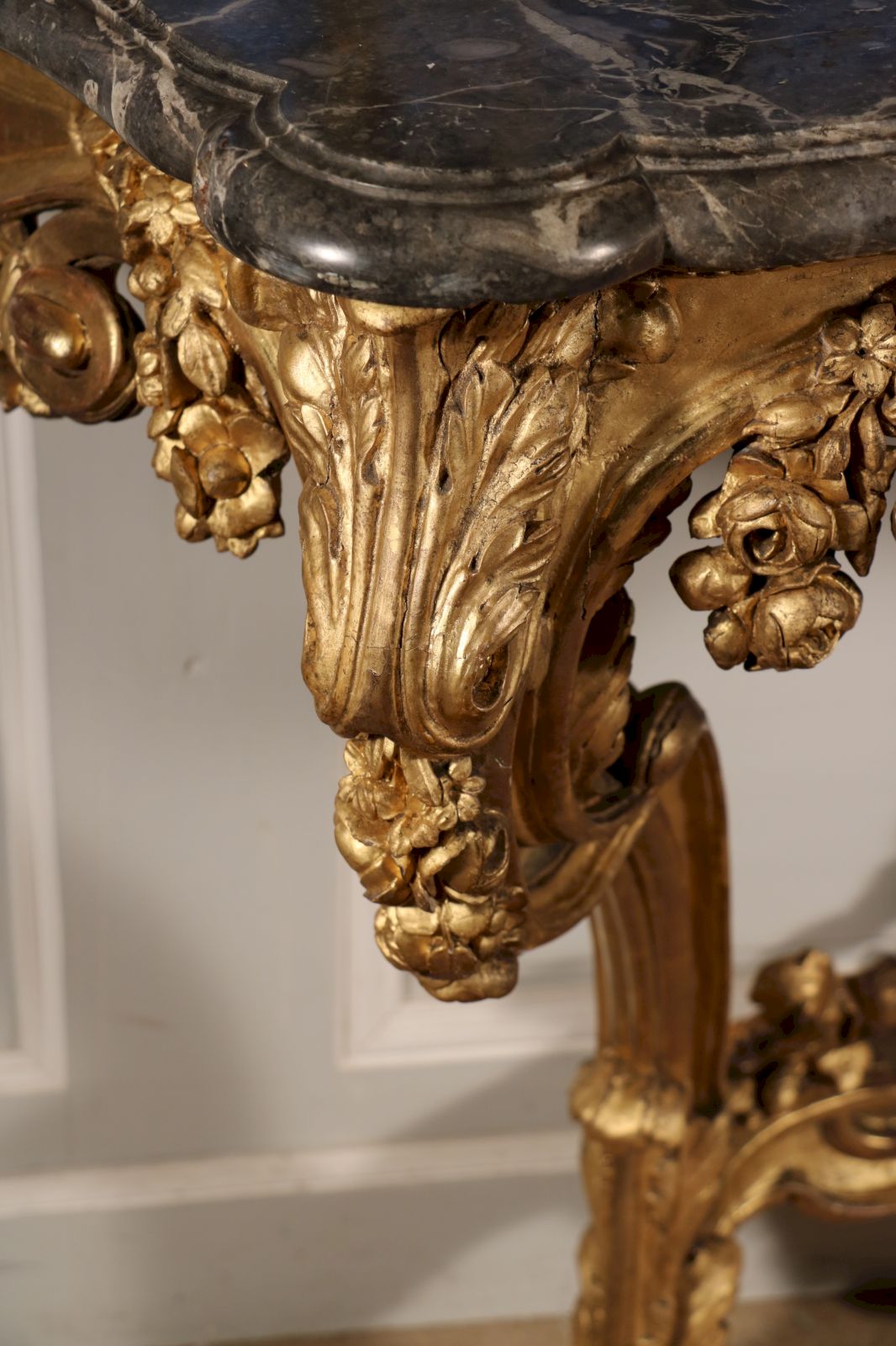 Console, bois sculpté, stuqué et doré, dessus de marbre taillé en bec de corbin, fin de l’époque Louis XV. Dim. (H x L x P): 132 x 81,5 x 51,5 cm. La console présente une ceinture en arbalète reposant sur deux pieds cintrés en console, rejoints entre eux par une entretoise occupée d’une noix. La ceinture et le piètement sont ajourés par une fin travail de sculpture associant les courbes sinueuses du rocaille finissant enrichi d’acanthe, et les guirlandes de fleurs retombant en festons depuis un anneau central, suivant une manière plus néoclassique, comme le rang de perles placé au-dessous du marbre. L’entretoise en occupée par une coquille héritée de projets souvent reproduits de l’architecte Contant d’Ivry. Au-dessus d’elle se dresse un élément rapporté (remplaçant très certainement un socle trop dégradé). Ce dernier est couronné de l’aigrette, elle authentique, d’où festonnent deux guirlandes. Celle de gauche a été copiée, celle de droite est originale. Le piètement s’achève en deux puissantes feuilles d’acanthe enroulées sur elles-mêmes. Cette console est une réalisation tardive dans le règne de Louis XV. Elle est déjà fortement imprégnée des suppliques aux orfèvres de Cochin et des voeux pieux de l’abbé Dubois pour un retour au classicisme et au modèle antique. Ce retour s’opère dès le retour de Rome de Soufflot et de Marigny et est accompagné par madame de Pompadour dans les dernières années de sa vie. Reprises anciennes à la dorure (à la mixtion) et reprises effectuées à la feuille dans le cadre d’une récente restauration. La guirlande gauche de la noix et le support de l’aigrette rapportés.