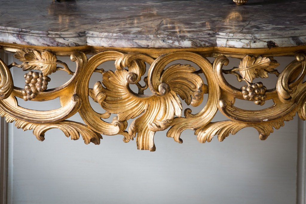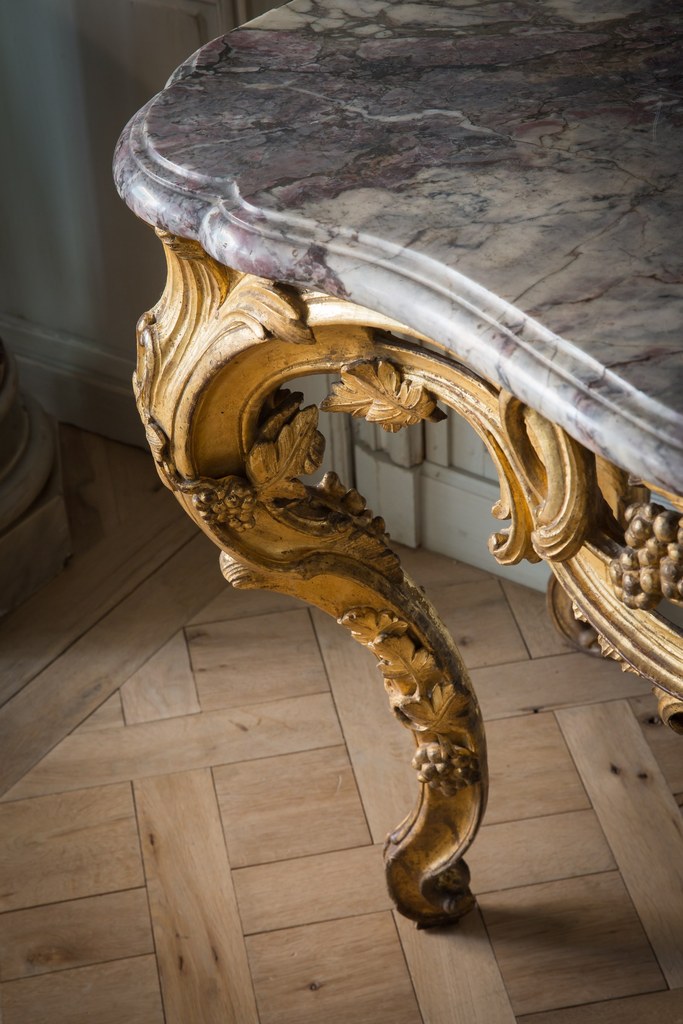 Une grande console en bois sculpté, doré et ajouré à décor de coquilles et de pampres de vigne. Le plateau est en marbre brèche gris violet à cognée et bec de corbin. La ceinture mouvementée, la coquille centrale ajourée et asymétrique ainsi que les courbes et contre-courbes des quatre pieds sont des marqueurs du style rocaille. Cette console provient d’un château du lyonnais dans le sud de la France. Marbre restauré. Restauration de deux talonnettes des pieds arrière. Restauration d’usage et d’entretien. Dim. console (H x L x P) : 94 x 158 x 77 cm.
