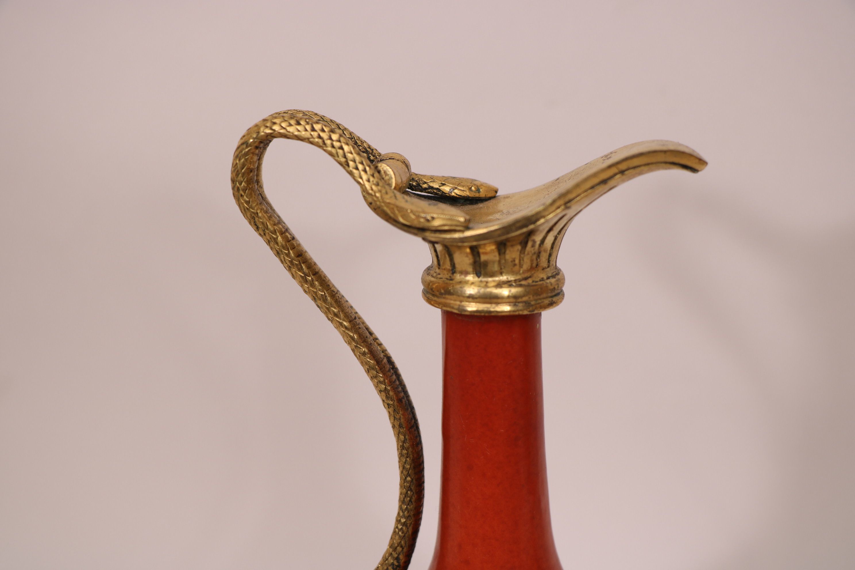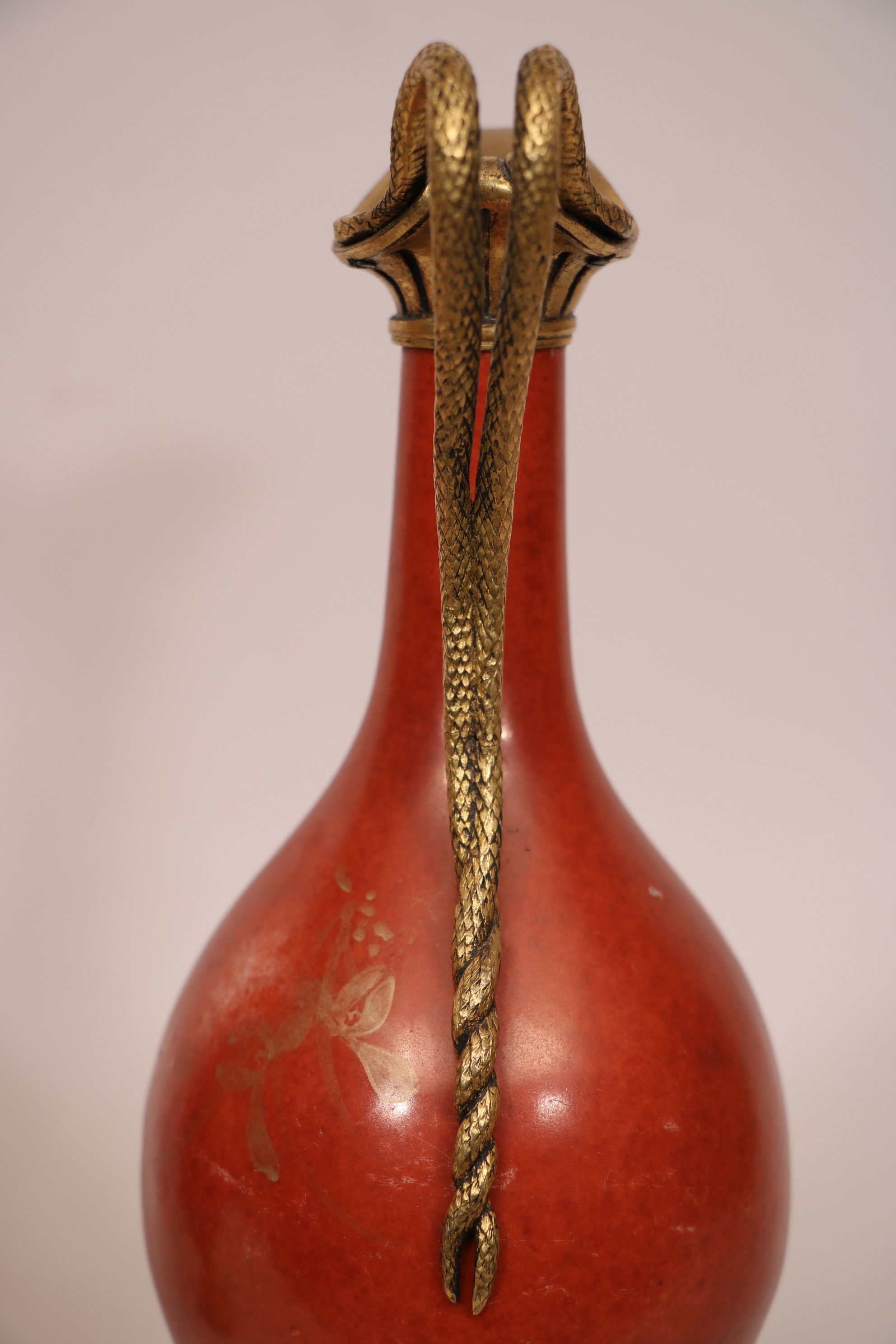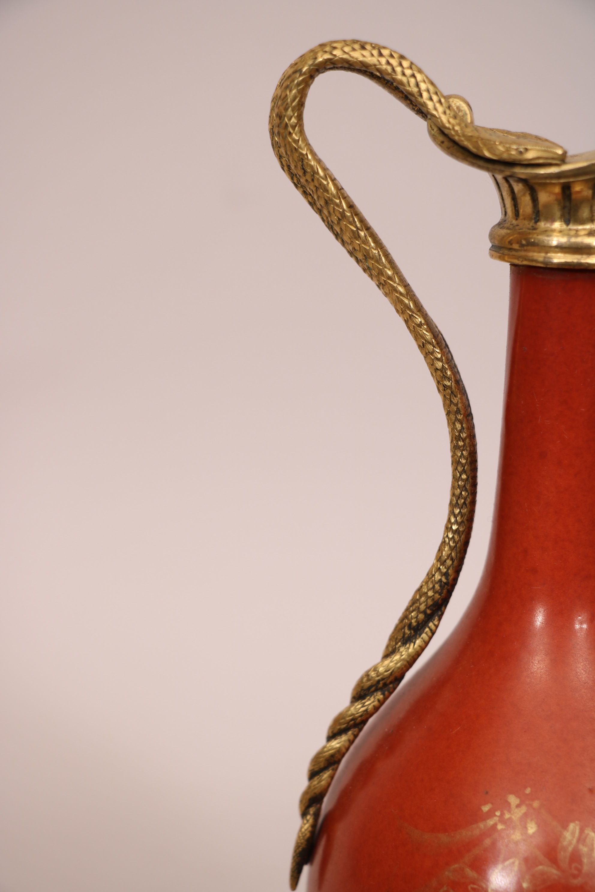 Paire d’aiguières en porcelaine de Chine à fond corail avec des traces de décors de couleur or. La monture est en bronze ciselé et doré, et se compose d’une anse formée par deux serpents s’appuyant sur un faux bec verseur sculpté de cannelure et de moulure à l’antique. Elles reposent sur un pied-douche en bronze doré et ciselé, sculpté de feuilles d’acanthe. Epoque Louis XVI Usure de la dorure des bronzes et des vases. Restaurations d’usage et d’entretien H. 24,5 x L. 9 x P. 8 cm