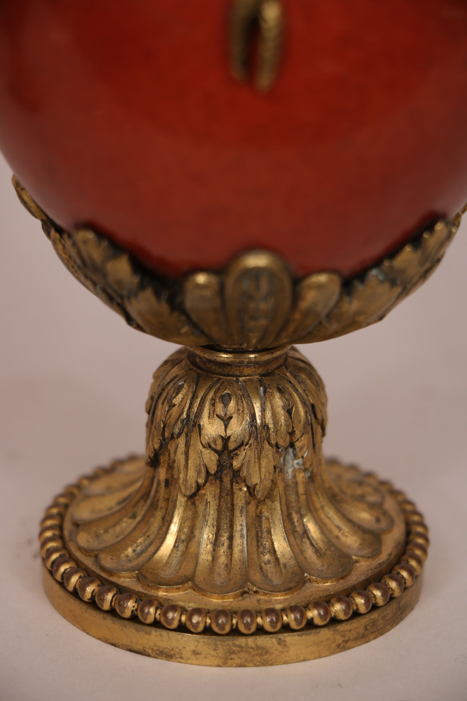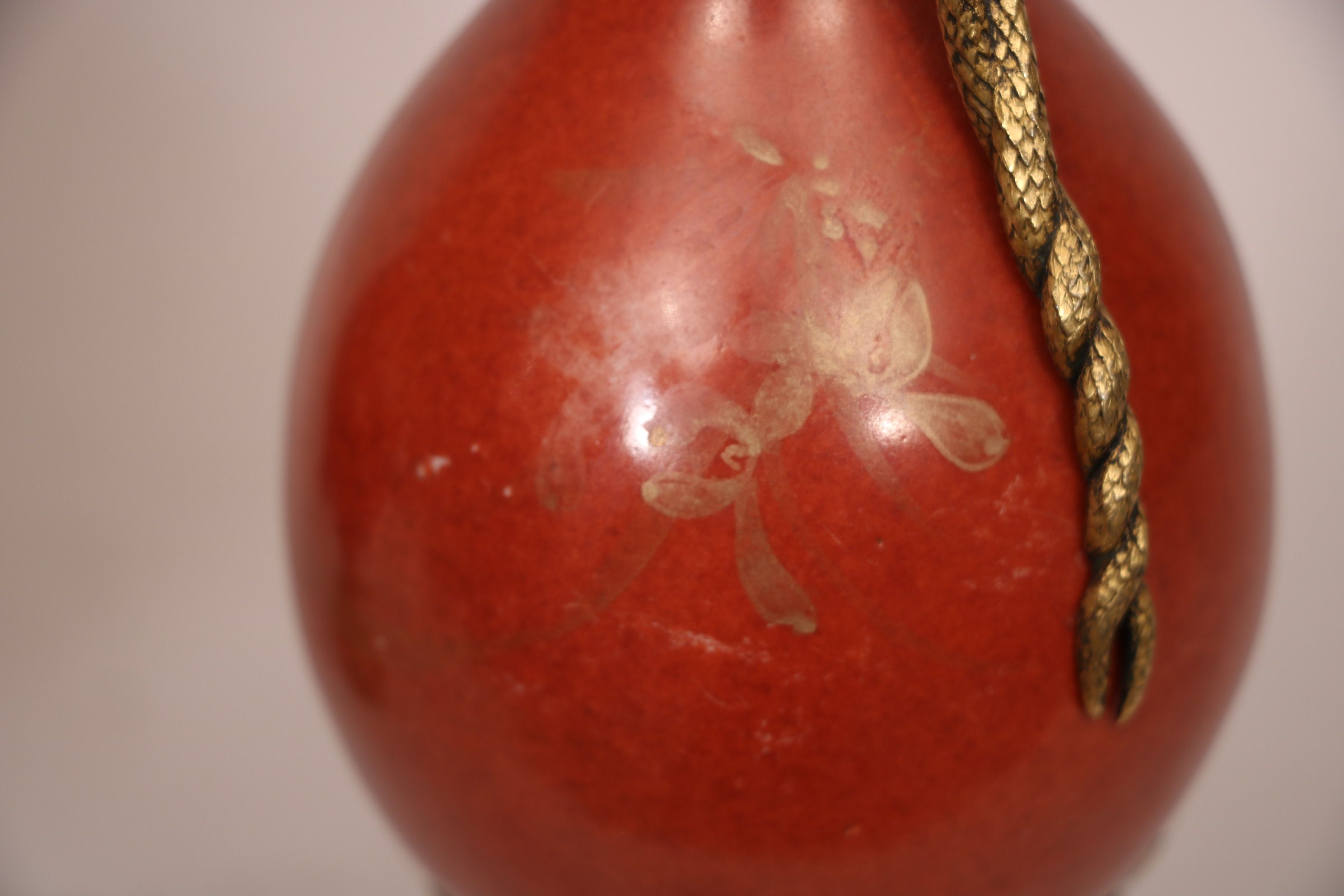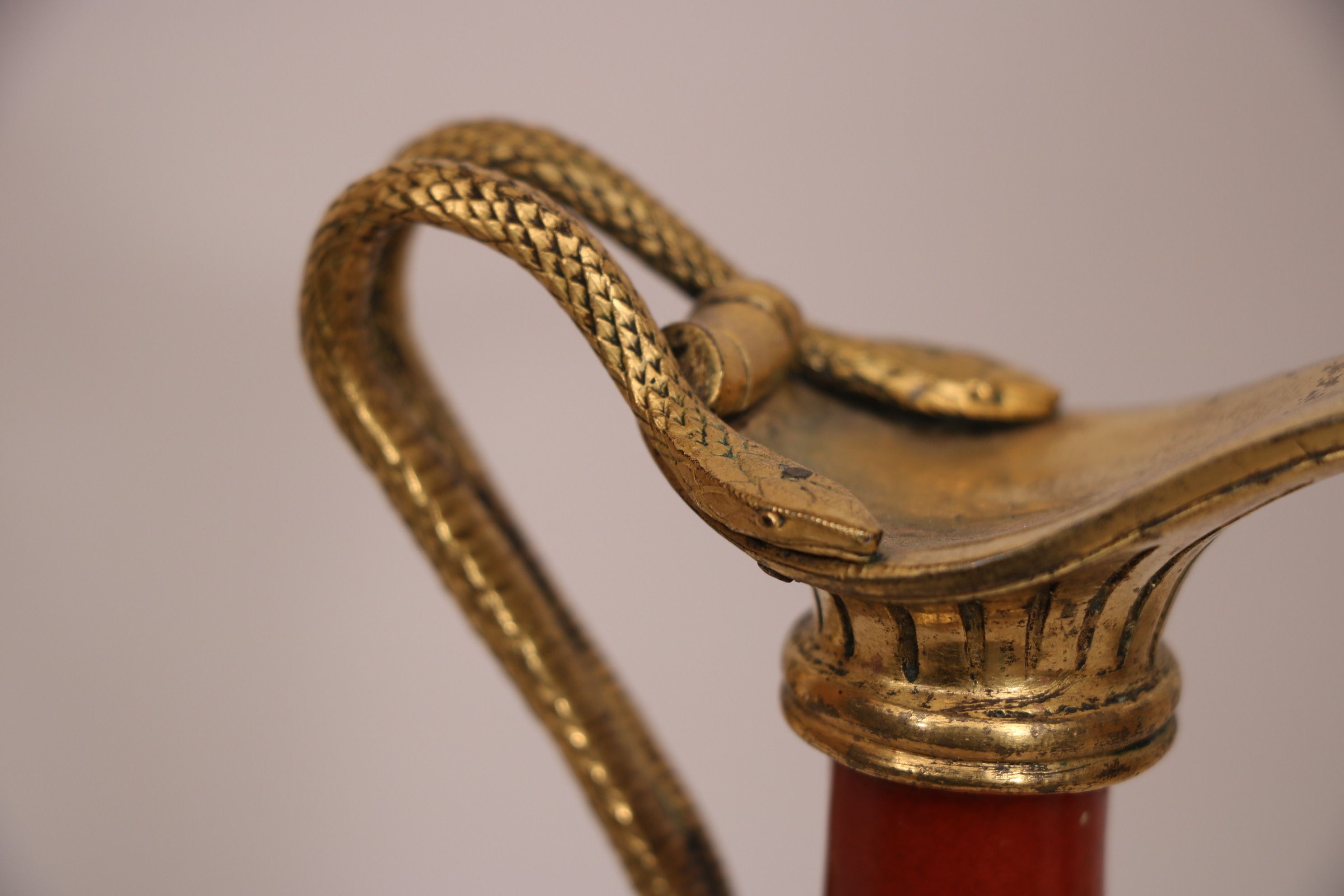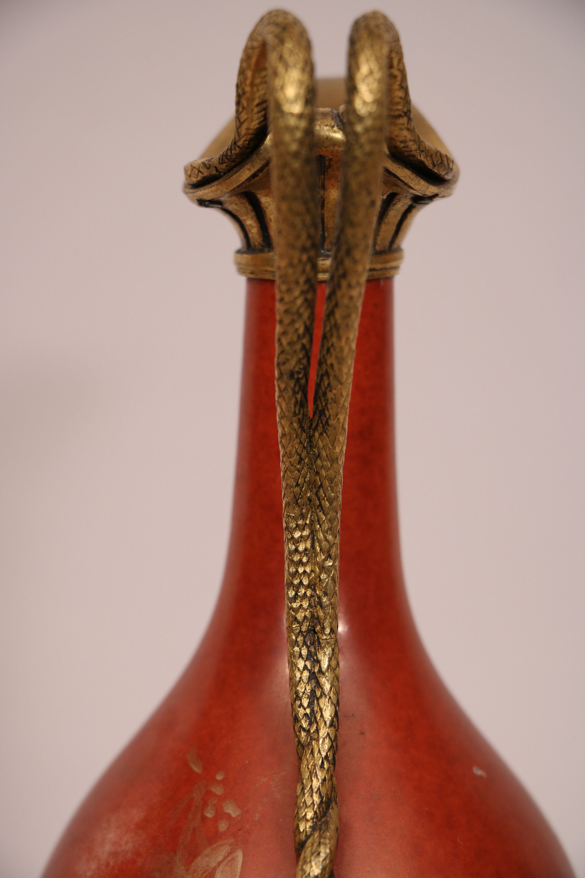 Paire d’aiguières en porcelaine de Chine à fond corail avec des traces de décors de couleur or. La monture est en bronze ciselé et doré, et se compose d’une anse formée par deux serpents s’appuyant sur un faux bec verseur sculpté de cannelure et de moulure à l’antique. Elles reposent sur un pied-douche en bronze doré et ciselé, sculpté de feuilles d’acanthe. Epoque Louis XVI Usure de la dorure des bronzes et des vases. Restaurations d’usage et d’entretien H. 24,5 x L. 9 x P. 8 cm