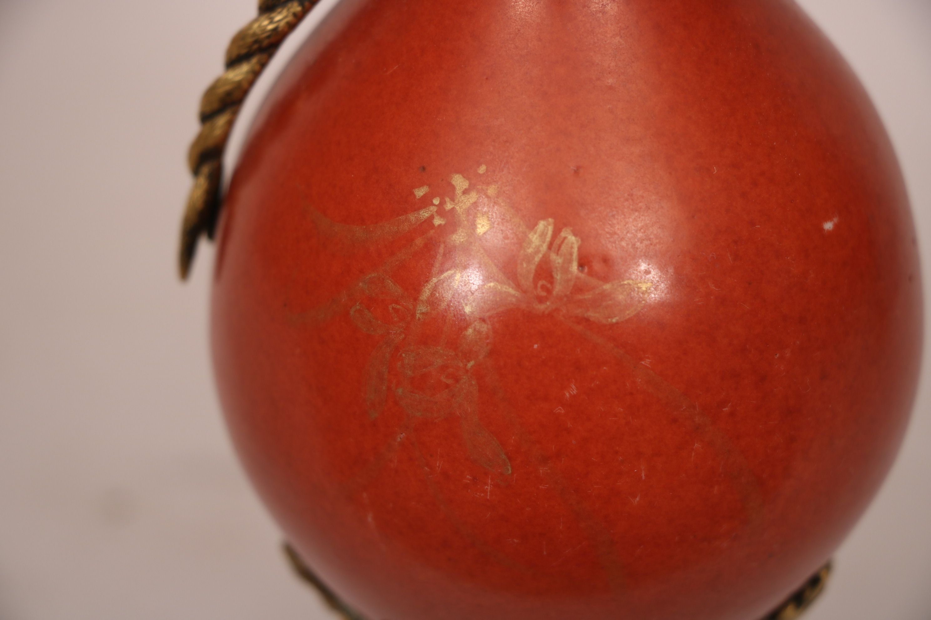 Belle paire d’aiguières néoclassiques témoignant de la persistance du goût pour les chinoiseries et pour les porcelaines montées jusqu’à la fin de l’époque Louis XVI. La deuxième moitié du XVIIIe siècle favorise les pièces monochromes, tel cette pièce corail à décor poudré or comportant une inscription, importée par la Compagnie des Indes. La monture est très fine et très élégante. Les anses sont formées par deux serpents entrelacés, suivant un motif fort à la mode dans les années 1780. Les têtes des serpents reposent sur les cols à cannelures. Les pieds sont à canaux chargés d’acanthe et ceint d’un rang de perles, et surmonté d’un tore de feuilles placé au bas de la panse des vases. Les pièces corail sont très rares et recherchées.