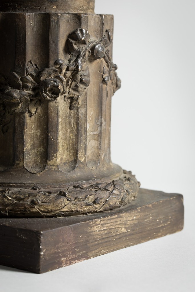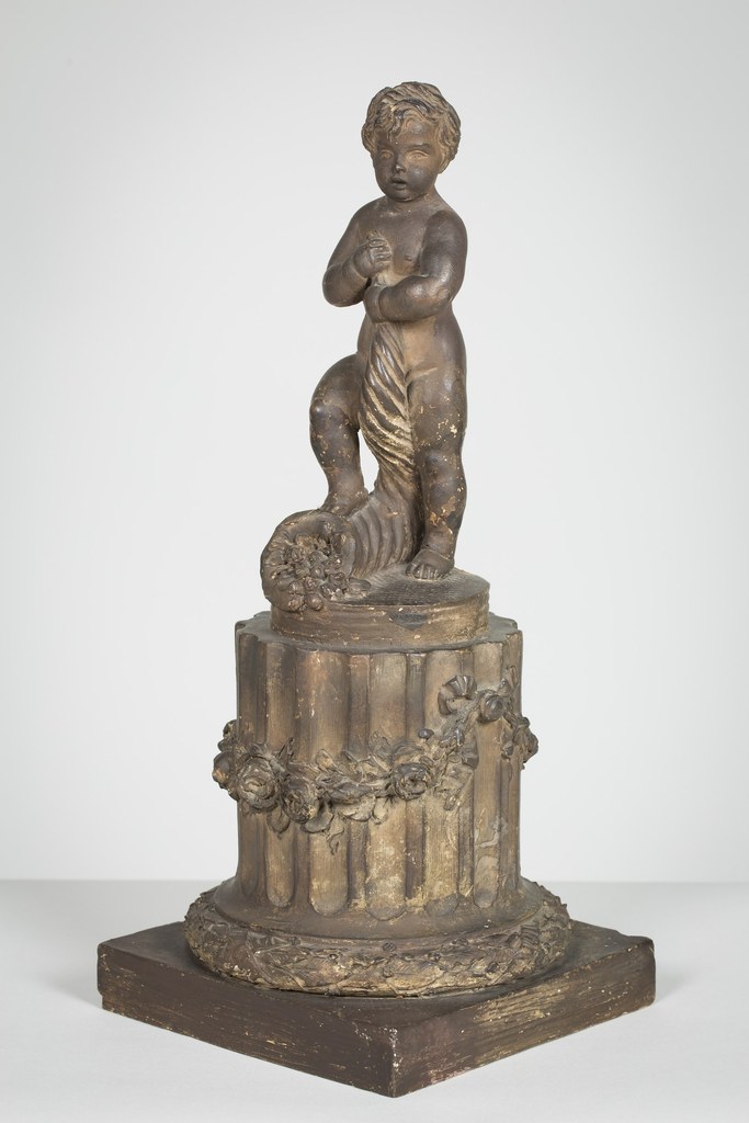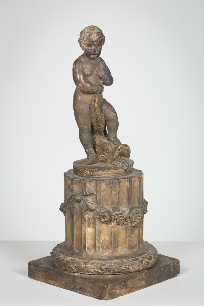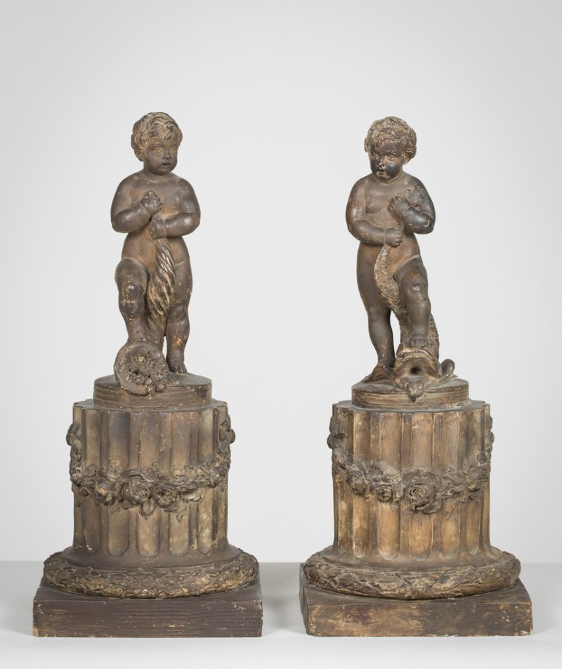 Paire de terres cuites représentant deux putti debout chacun sur un fût de colonne, l’un tenant un dauphin par la queue et l’autre une corne d’abondance. Fin du XVIIIe siècle Légère restauration H. 37 x L. 16 x P. 16 cm Le traitement des putti, du dauphin et des roses de la guirlande ainsi que les références à l’antique avec le fût de colonne et les lauriers sont caractéristiques du style néoclassique très en vogue sous Louis XVI. L’iconographie associant la corne d’abondance avec la figure du dauphin permet un rapprochement avec les projets de surtout en biscuit édités à l’occasion de la naissance du fils de Marie-Antoinette et de Louis XVI le 22 octobre 1781. L’arrivée si attendue d’un hériter mâle à la couronne de France est perçue comme un gage de stabilité politique pour le pays. C’est également l’occasion pour la manufacture de Sèvres de produire des groupes sculptés, ornements de table en terres cuites ou biscuits associant les allégories de l’abondance et le dauphin. Lors des repas « à la française », des décors sculptés en porcelaine occupaient le centre de table avec des candélabres, des corbeilles … Ces surtouts pouvaient avoir des thèmes choisis dans la littérature, reprendre des statues fameuses ou suivre l’actualité.