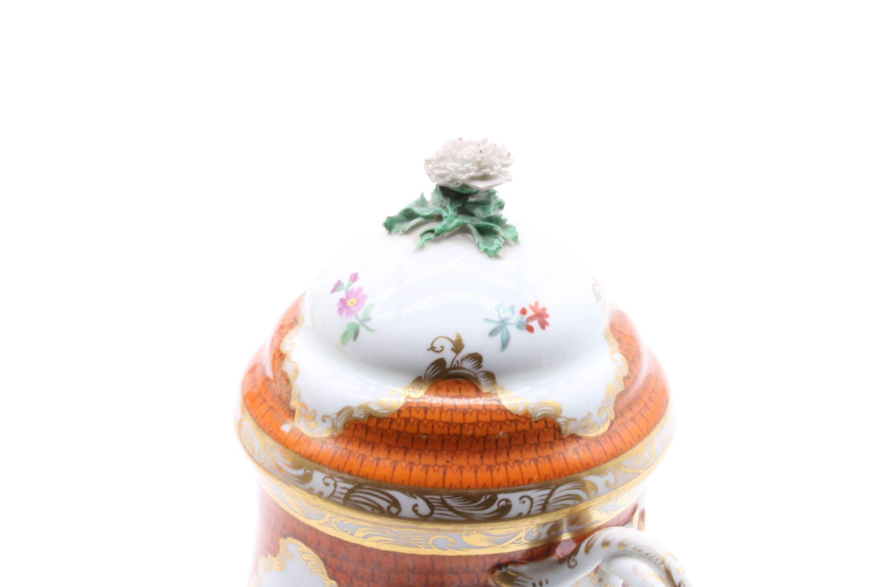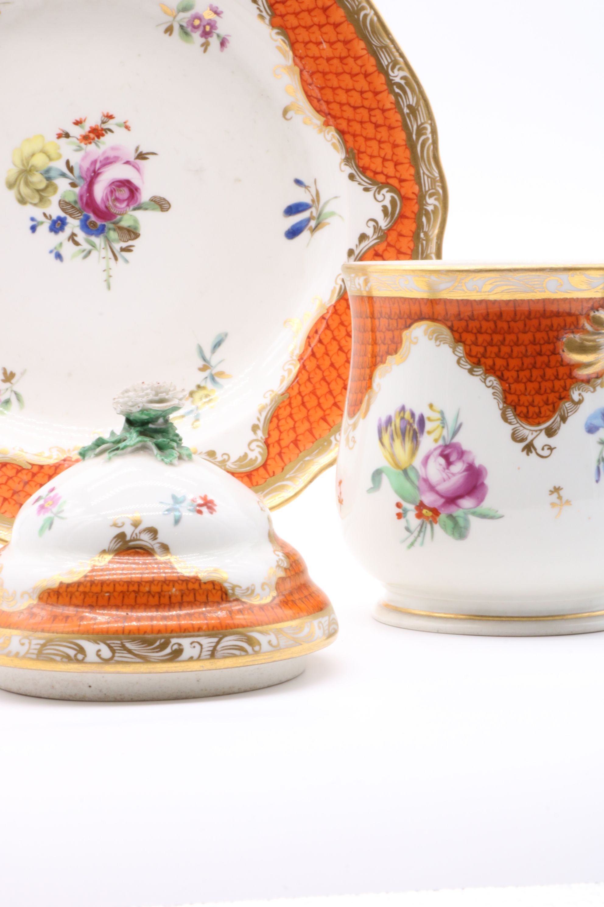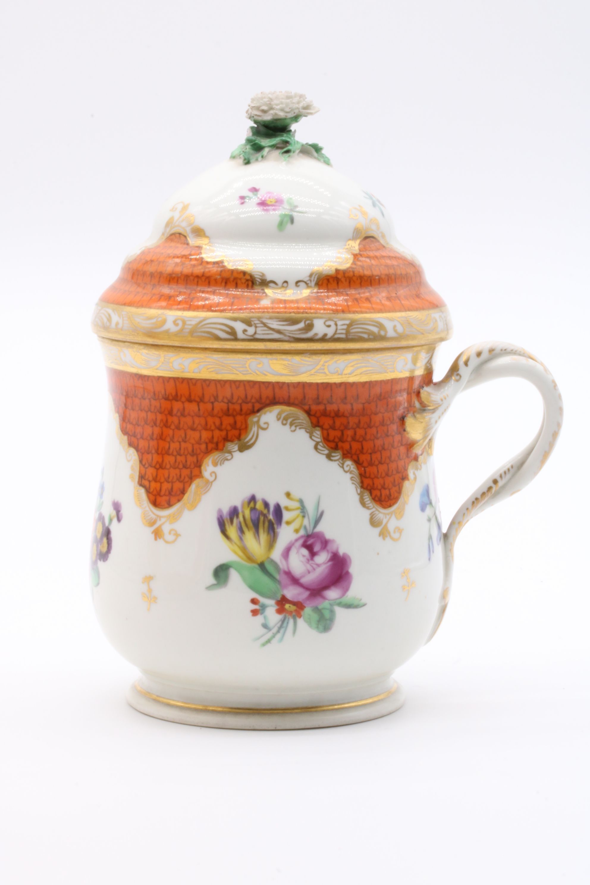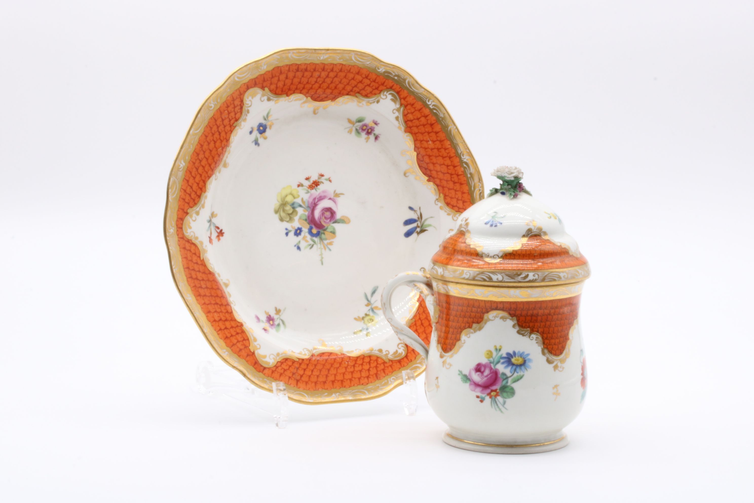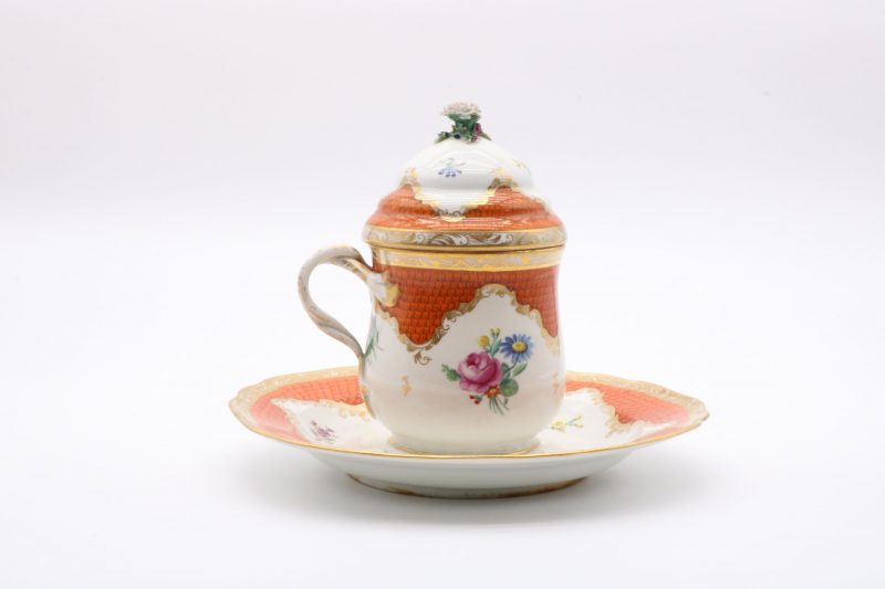 Pot couvert et son présentoir en porcelaine de Vienne à destination du marché ottoman appelé « Cherbetlik » (afin de boire la boisson turque « sahlep »). L’ensemble est en porcelaine polychrome à dominante corail et rehaussée d’or. De nombreux motifs floraux et de motifs d’écailles festonnées ornent le couvercle, le pot et l’assiette. Le couvercle présente une fleur en porcelaine sur son dessus et le pot possède une anse simulant des branchages entrelacés. Marque à l’écusson peinte en bleu sous couverte Epoque XVIIIe siècle Restaurations d’usage H. 18,5 x D. 10 cm (pot) D. 24,5 cm (assiette)
