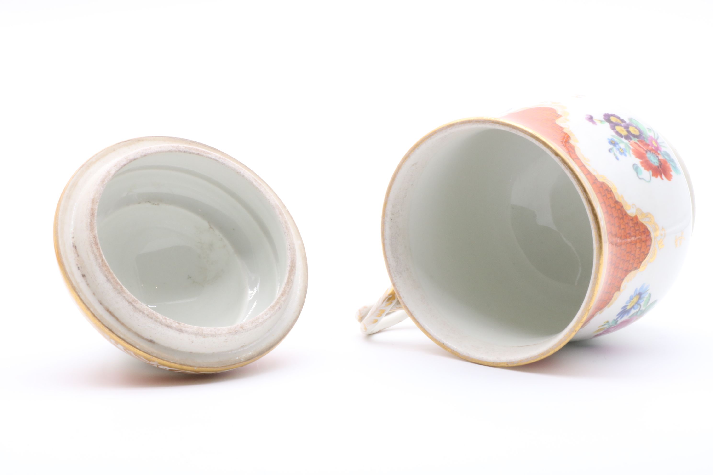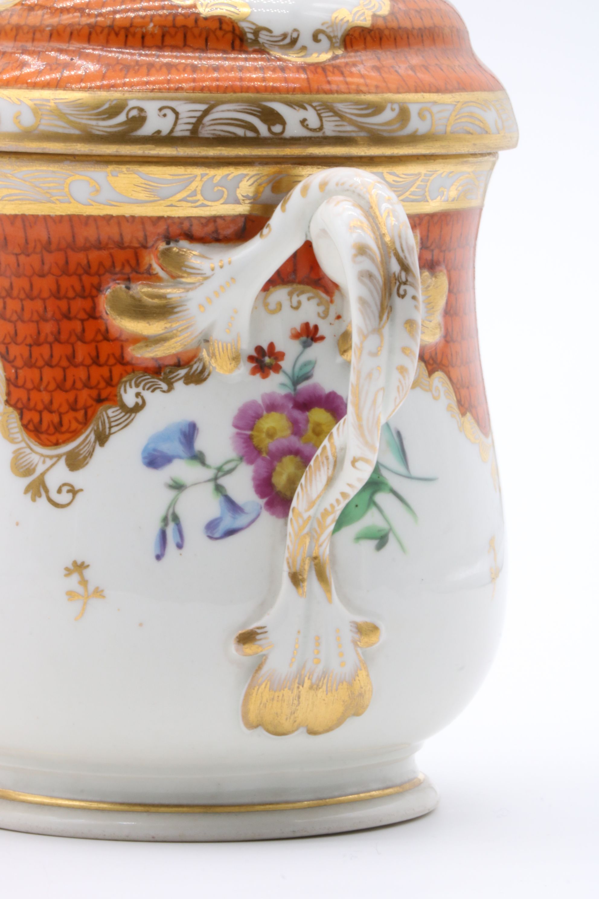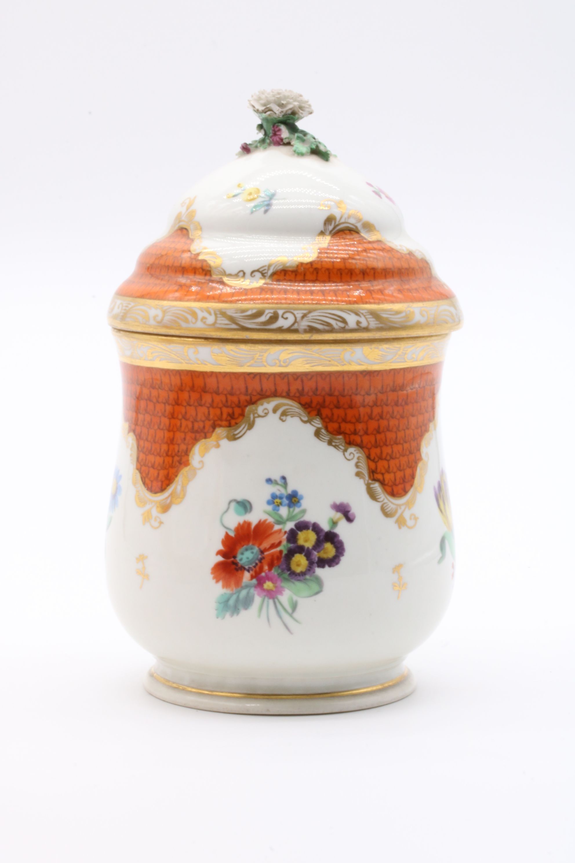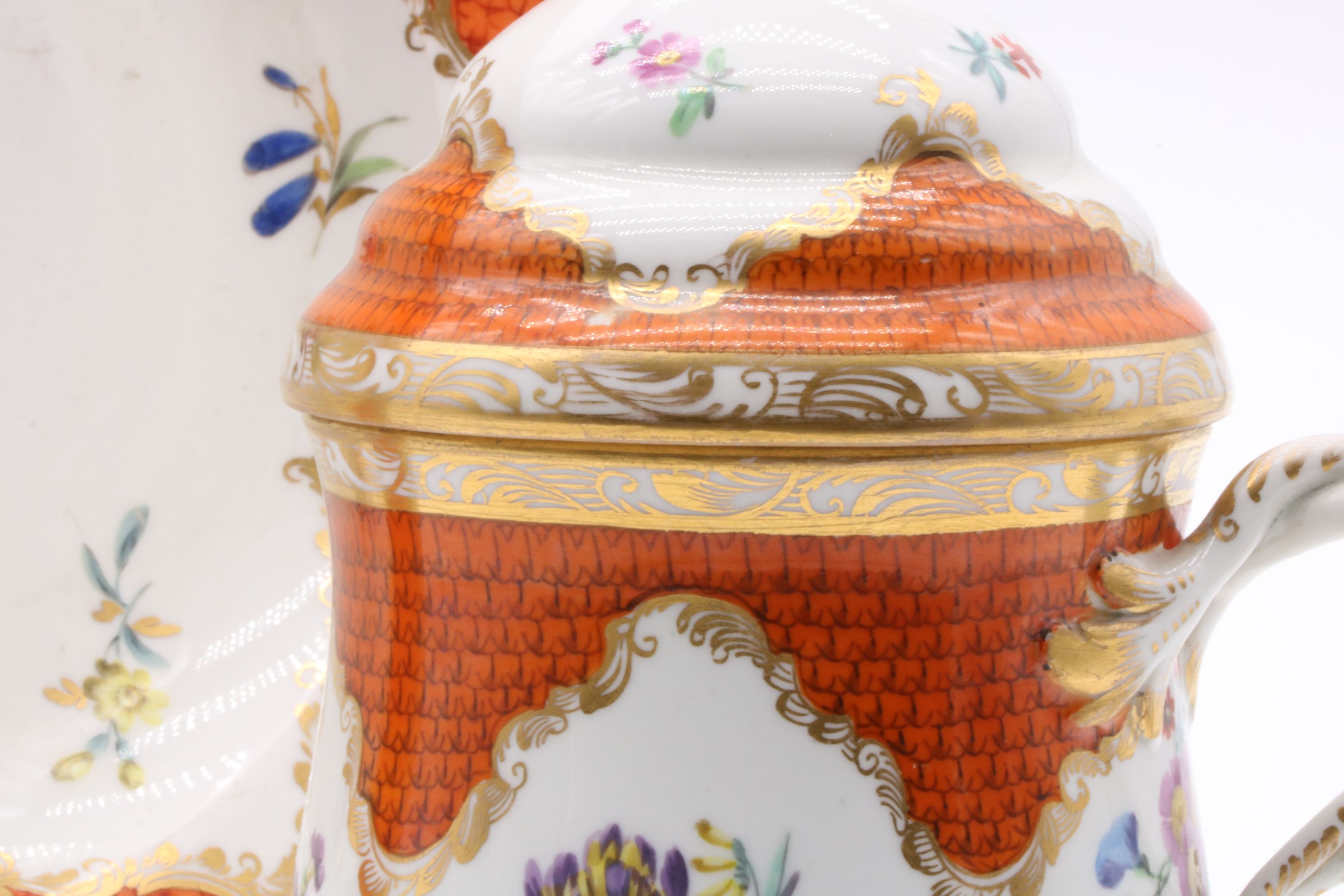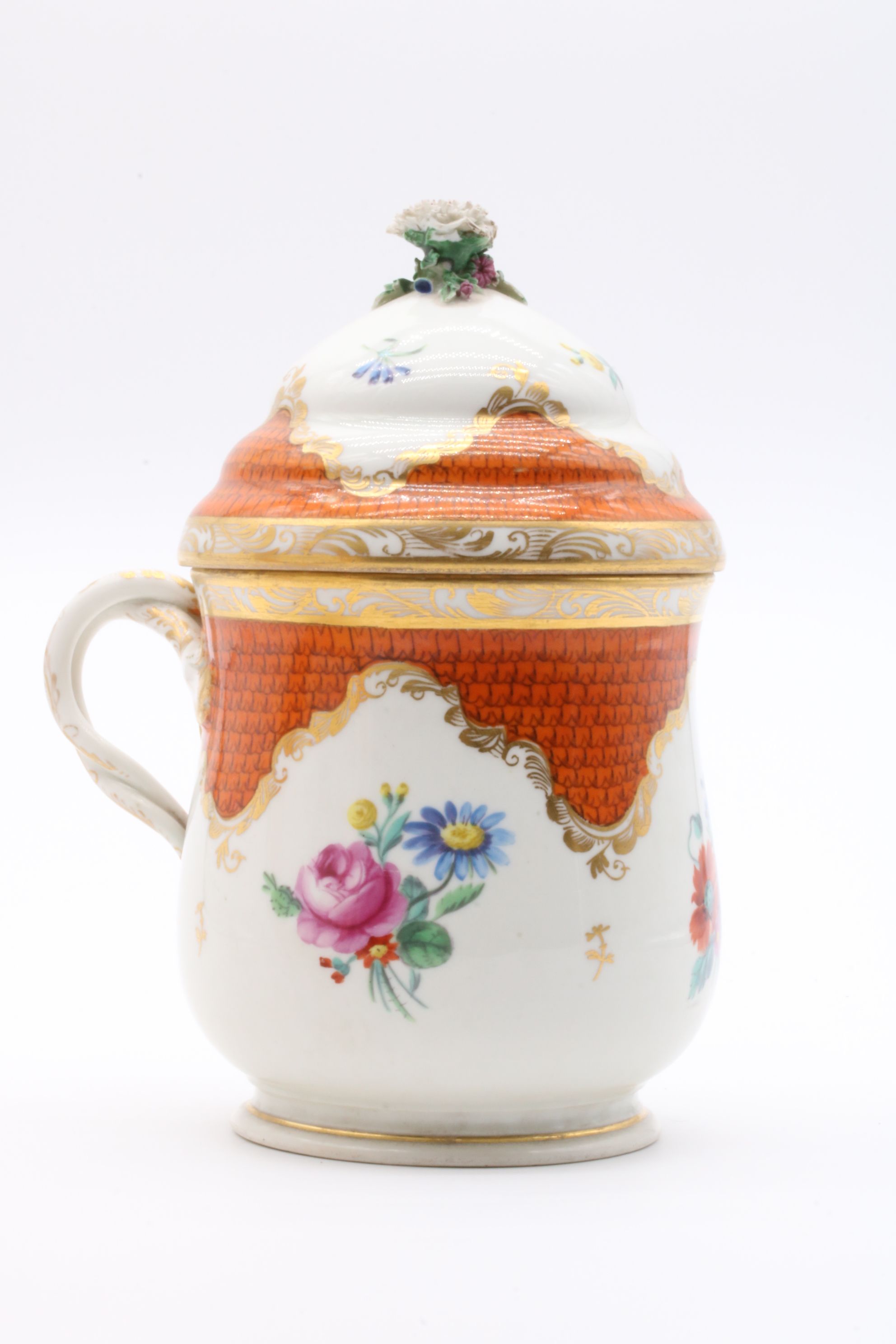 Pot couvert et son présentoir en porcelaine de Vienne à destination du marché ottoman appelé « Cherbetlik » (afin de boire la boisson turque « sahlep »). L’ensemble est en porcelaine polychrome à dominante corail et rehaussée d’or. De nombreux motifs floraux et de motifs d’écailles festonnées ornent le couvercle, le pot et l’assiette. Le couvercle présente une fleur en porcelaine sur son dessus et le pot possède une anse simulant des branchages entrelacés. Marque à l’écusson peinte en bleu sous couverte Epoque XVIIIe siècle Restaurations d’usage H. 18,5 x D. 10 cm (pot) D. 24,5 cm (assiette)