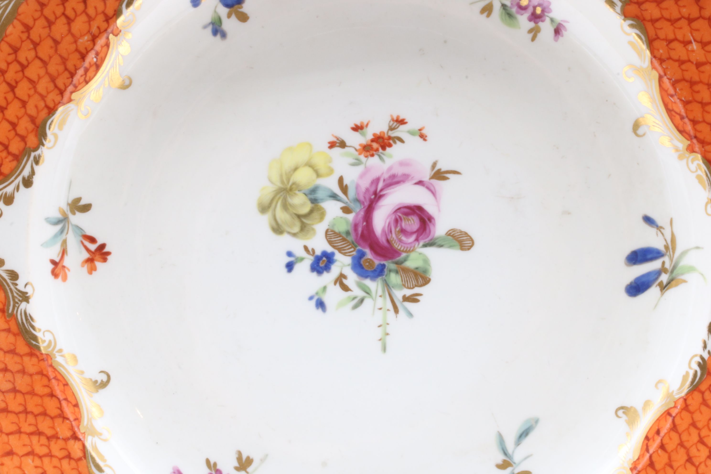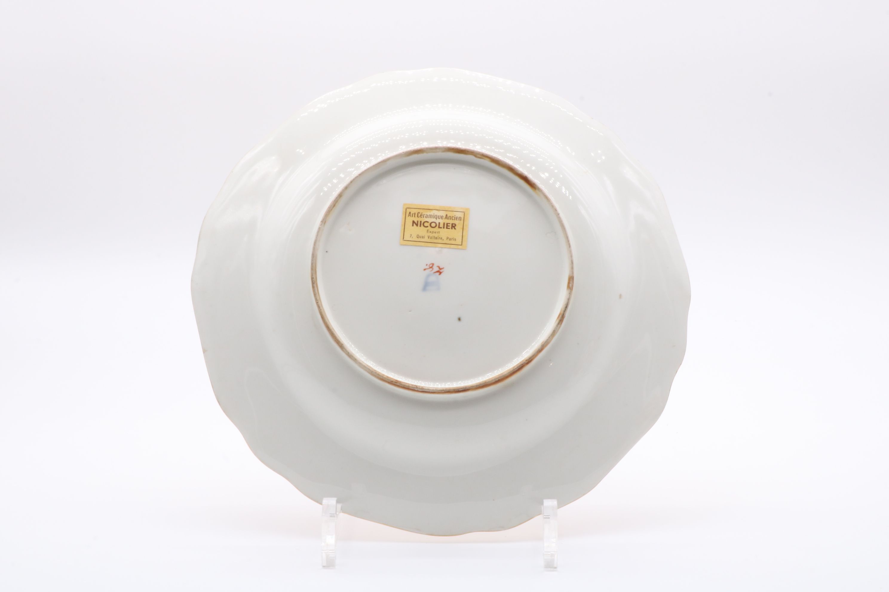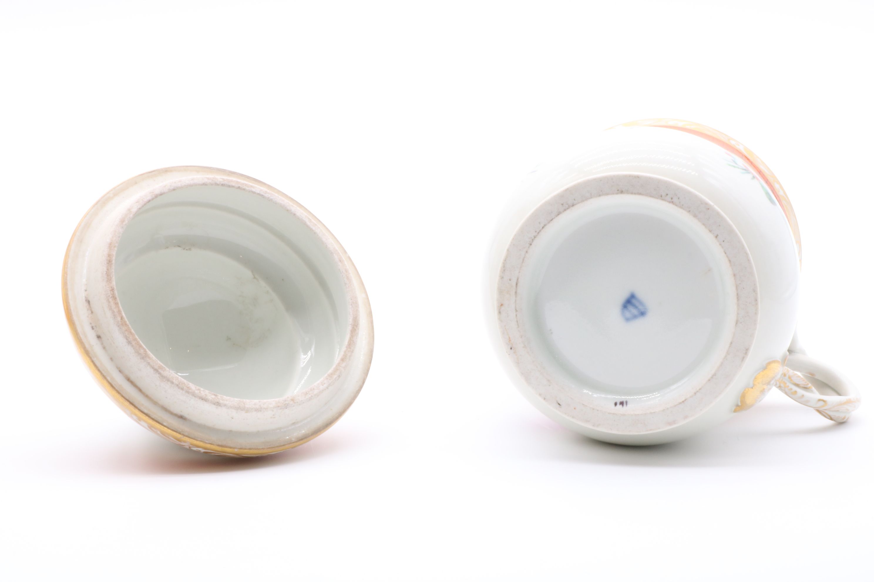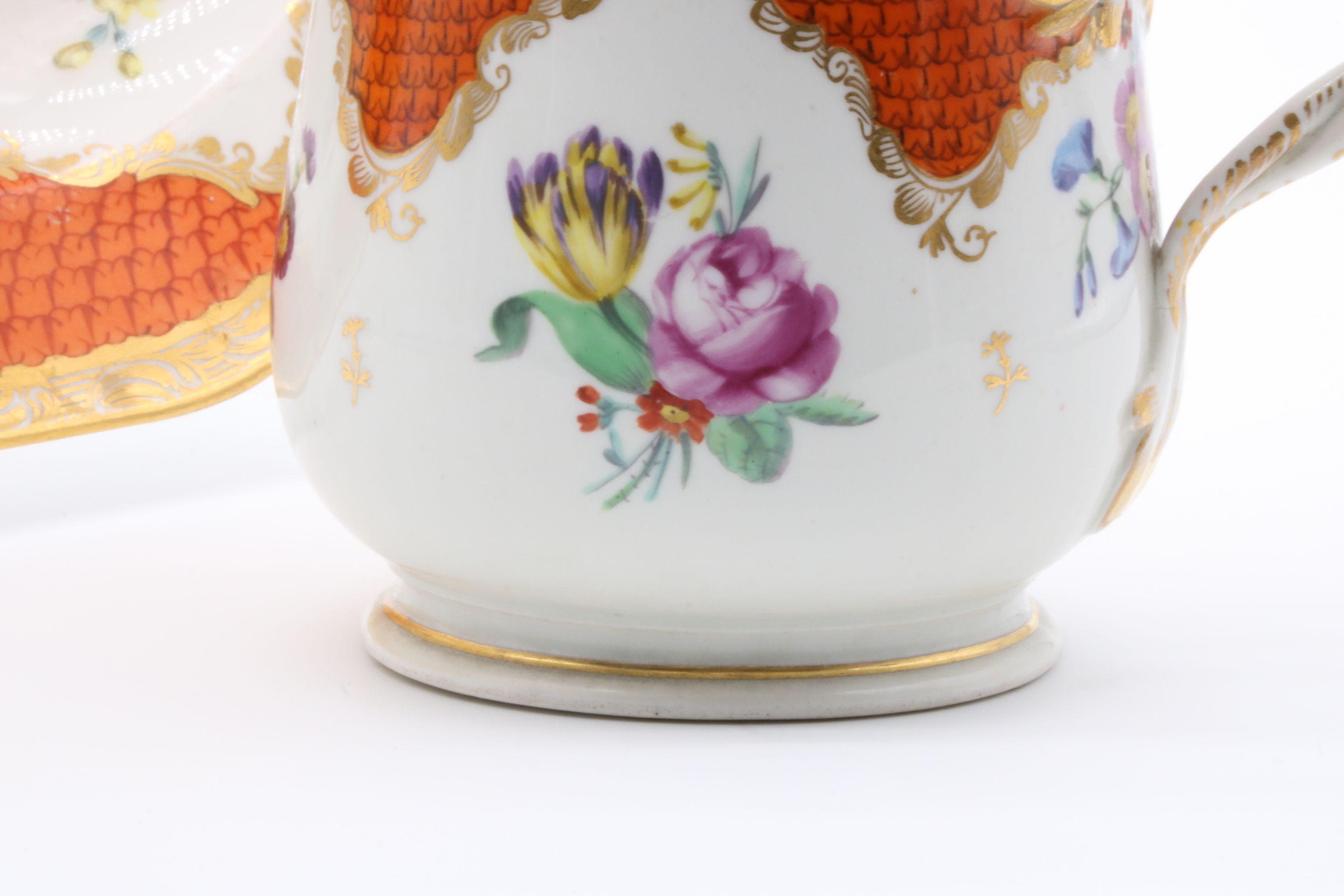 Pot couvert et son présentoir en porcelaine de Vienne à destination du marché ottoman appelé « Cherbetlik » (afin de boire la boisson turque « sahlep »). L’ensemble est en porcelaine polychrome à dominante corail et rehaussée d’or. De nombreux motifs floraux et de motifs d’écailles festonnées ornent le couvercle, le pot et l’assiette. Le couvercle présente une fleur en porcelaine sur son dessus et le pot possède une anse simulant des branchages entrelacés. Marque à l’écusson peinte en bleu sous couverte Epoque XVIIIe siècle Restaurations d’usage H. 18,5 x D. 10 cm (pot) D. 24,5 cm (assiette)