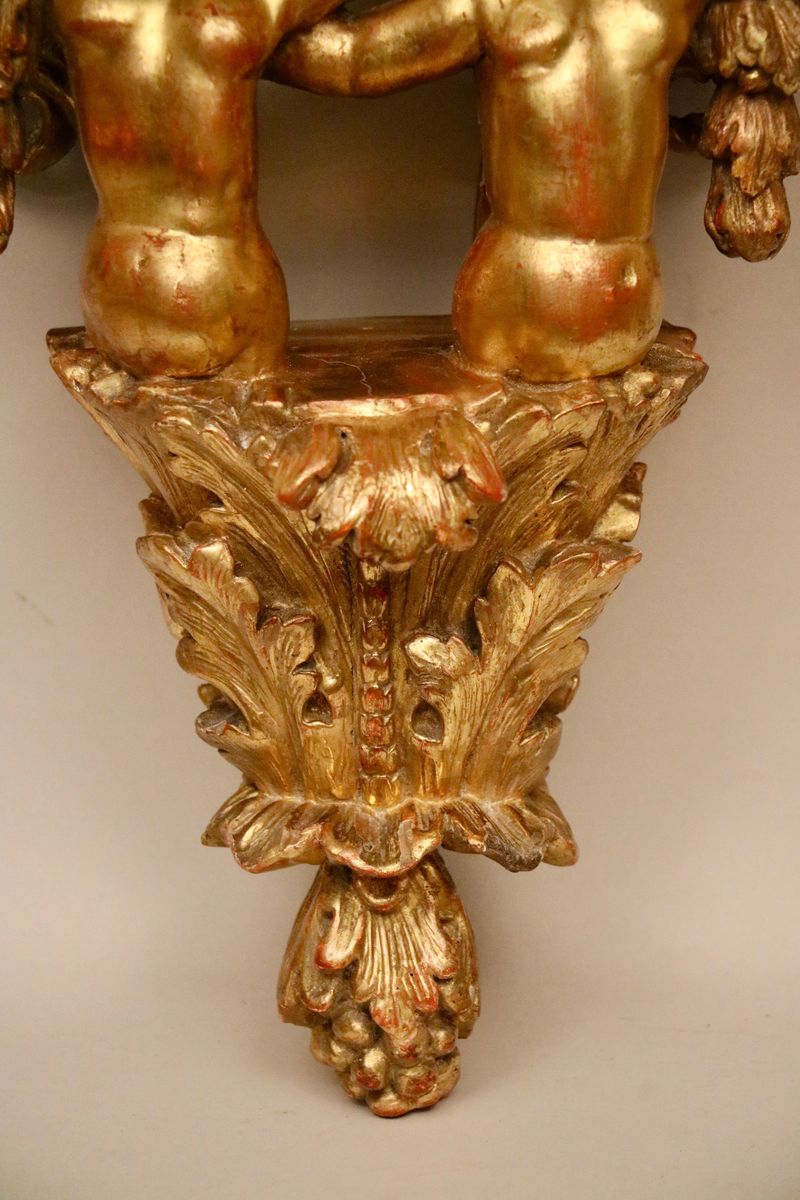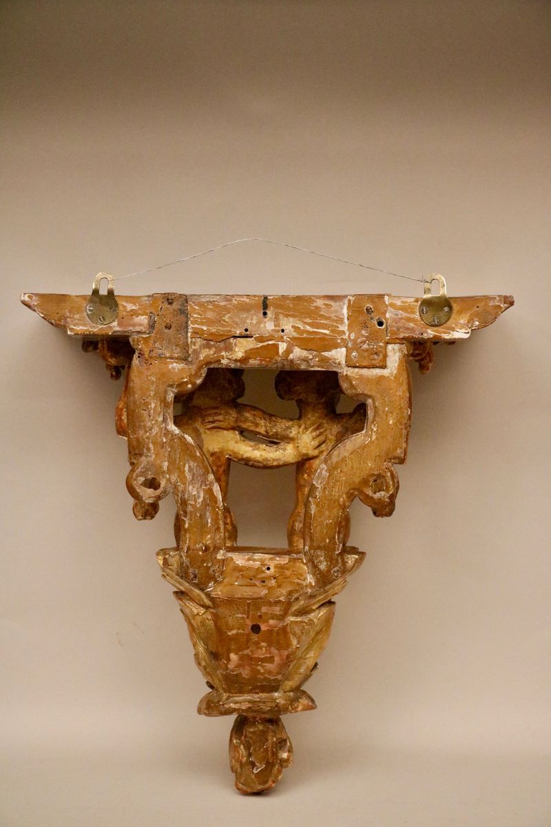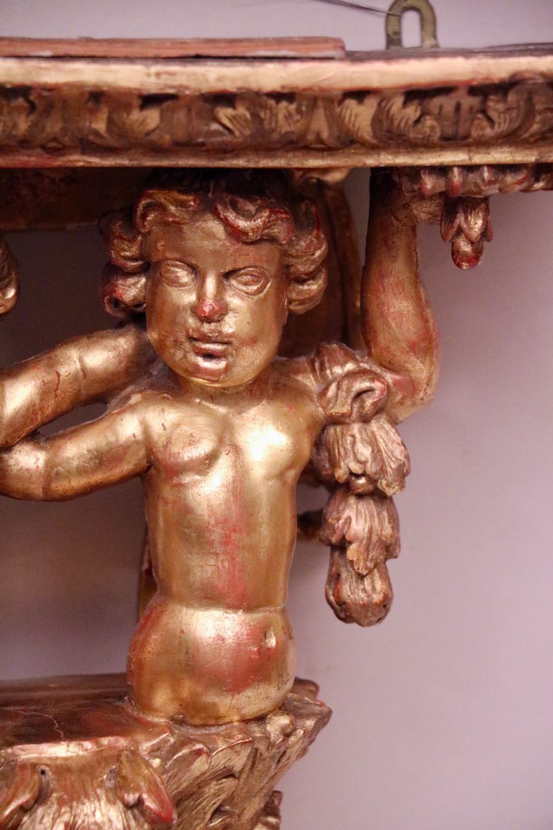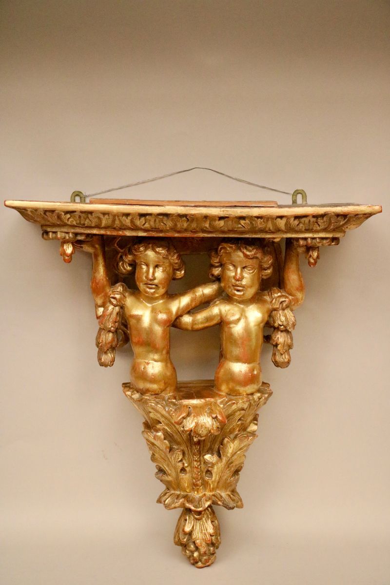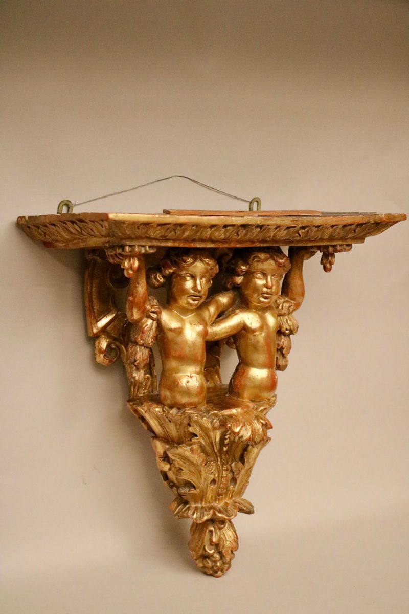 Console en bois doré et sculpté ornée de deux enfants soutenant l'entablement sur lequel est ciselé une frise feuillagée, la partie inférieure présentant un important culot agrémenté d'acanthes et achevé en pomme de pin. Epoque XVIIIe Siècle Deux fixations changées H. 40 x L. 38 x P. 19 cm