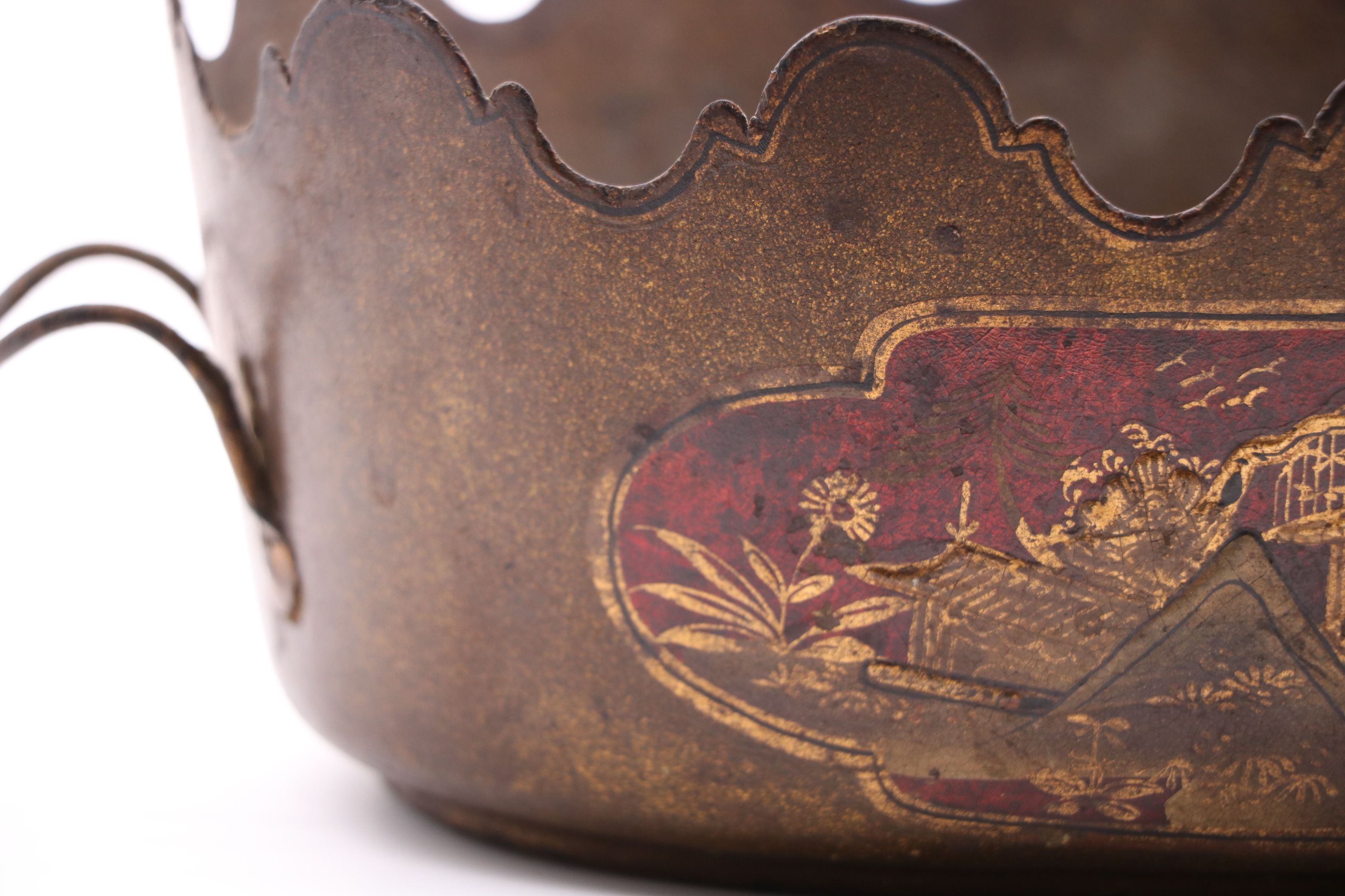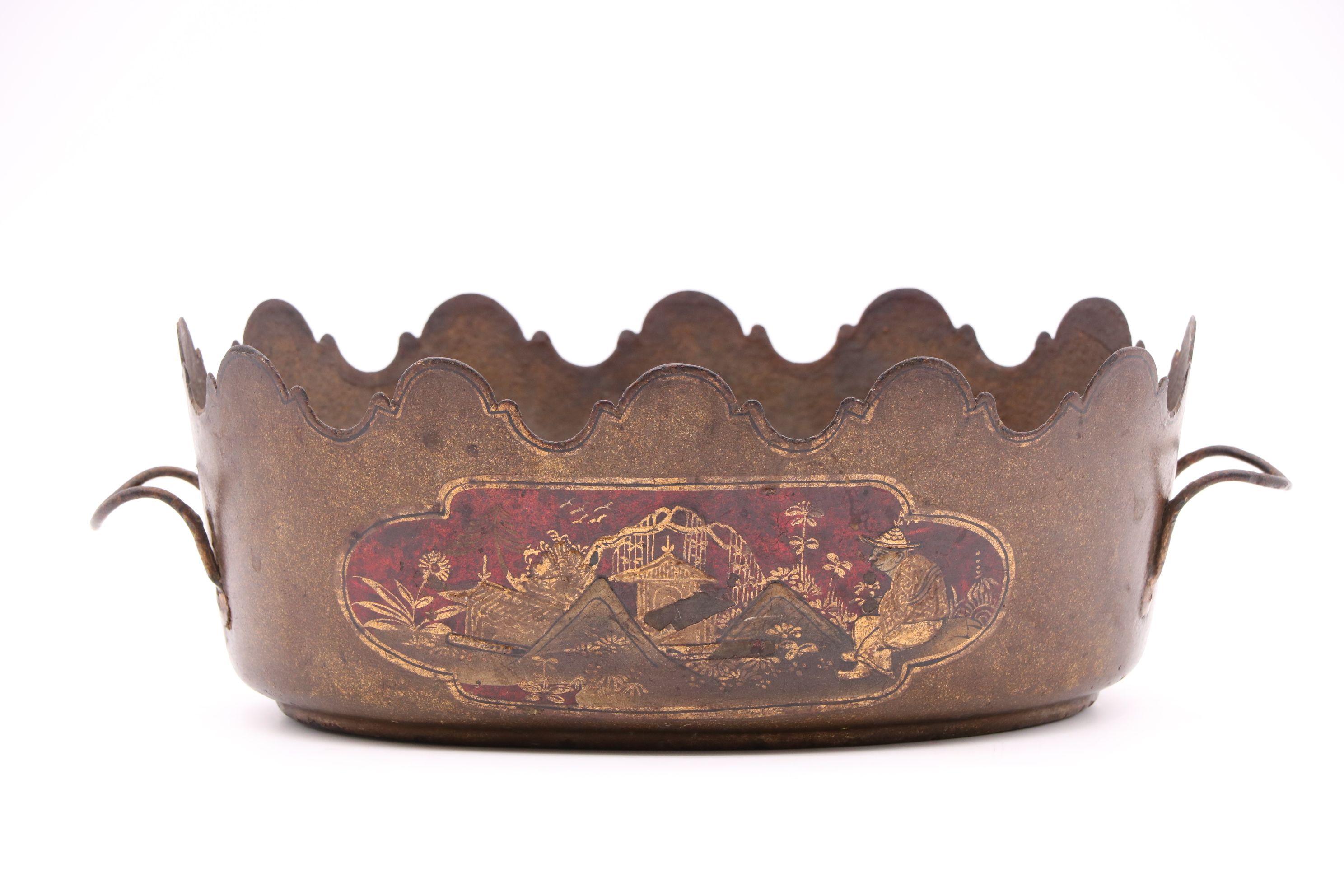 Paire de rafraîchissoirs en laque aventurine au décor « aux chinois » inscrit dans des cartouches. Elles sont encadrées par deux anses en métal. Milieu du XVIIIe siècle Restaurations d’usage, usures H. 11 x L. 33 x P. 20 cm