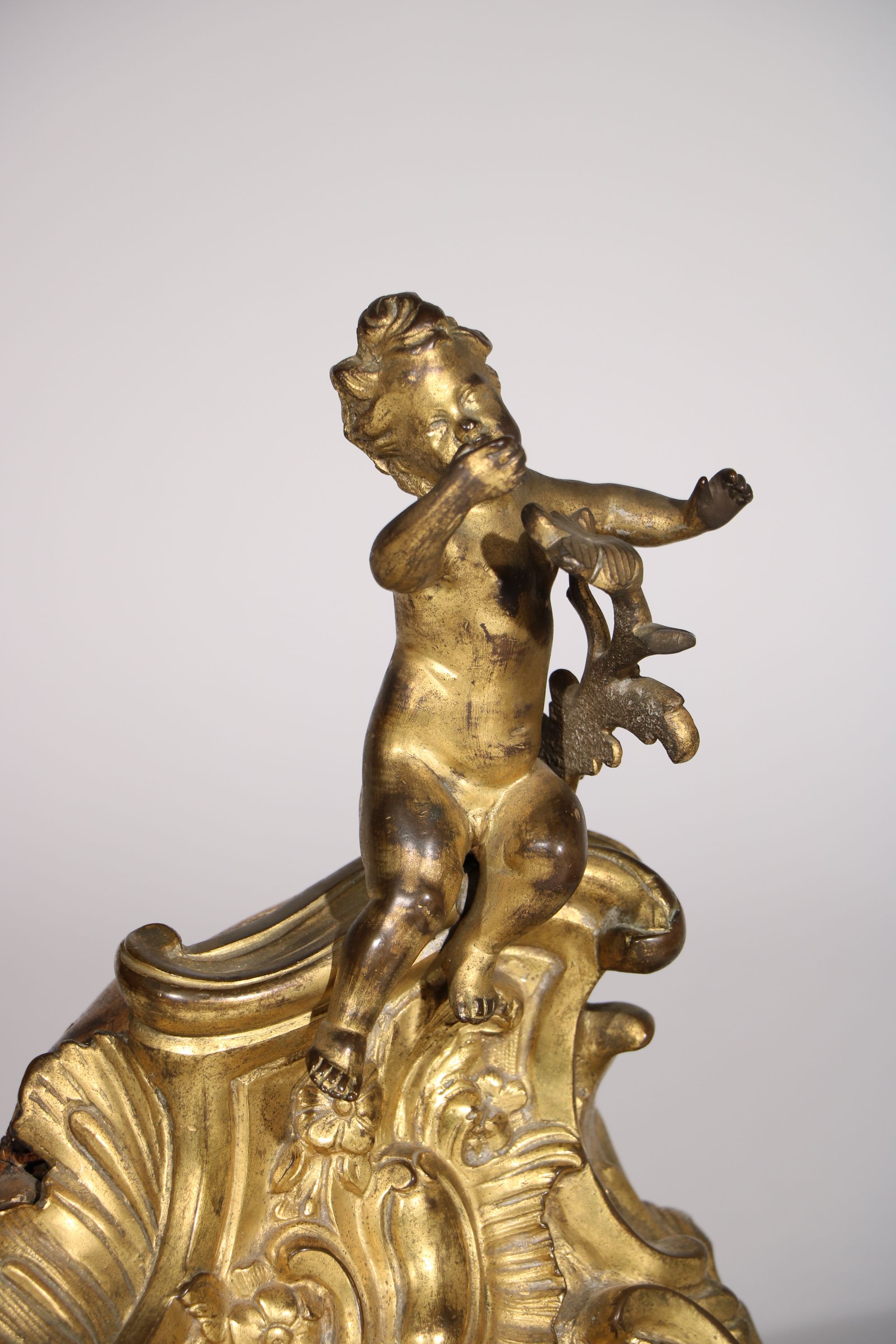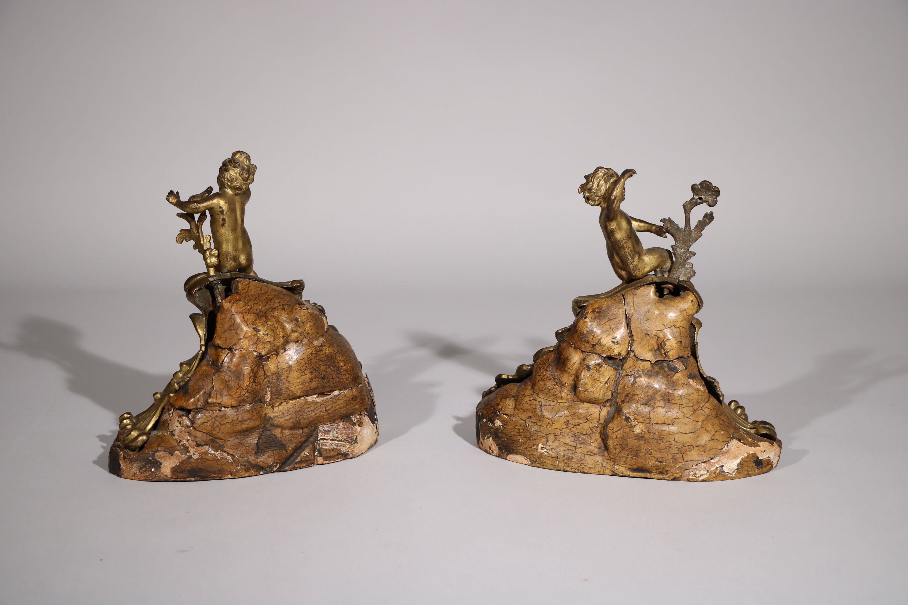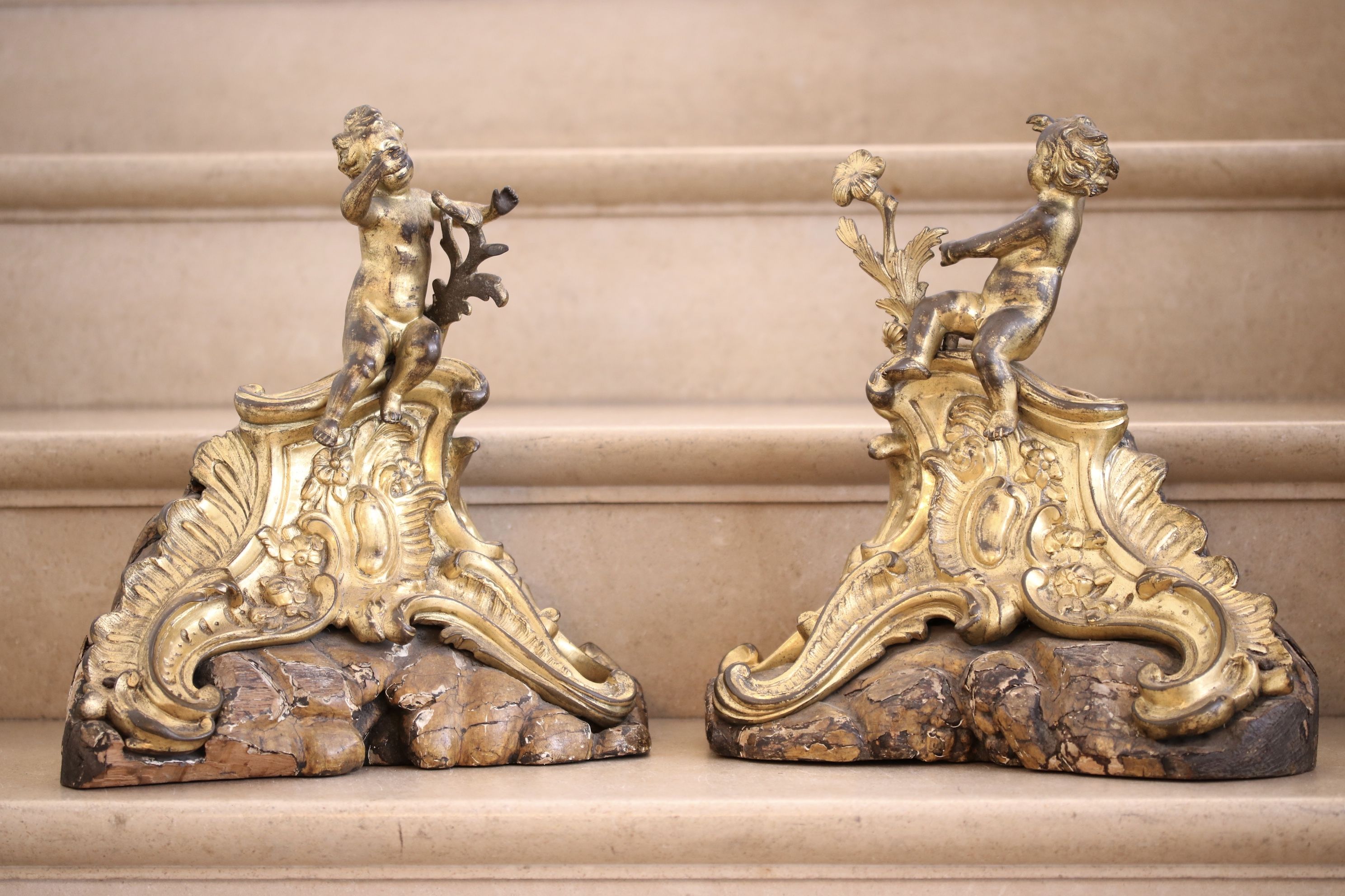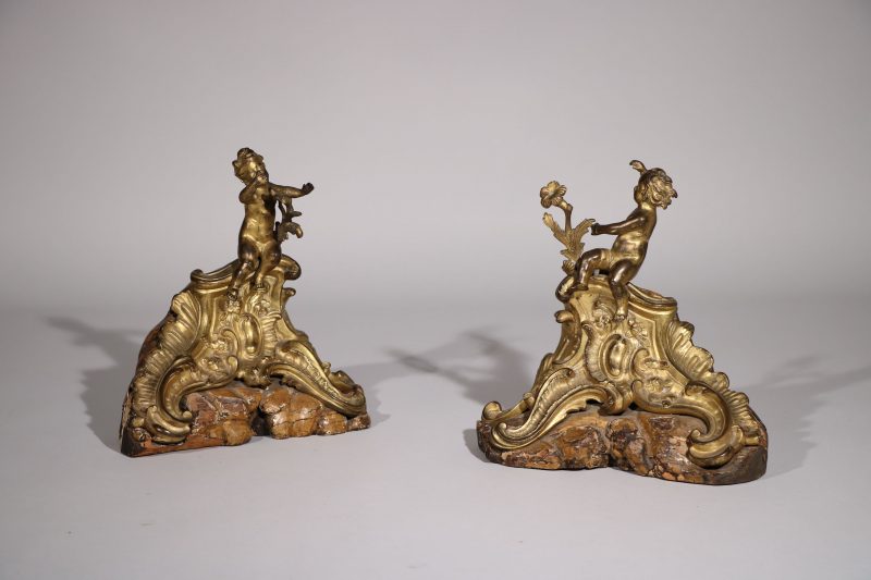 Paire de chenets en bronze doré et ciselé à décor d’un jeune garçon et d’une jeune fille à la fleur assise sur des motifs de rocailles. Les chenets sont inscrits dans des socles en bois patiné à l’imitation des rochers. Epoque Louis XV H. 33 x L. 32 x P. 16 cm