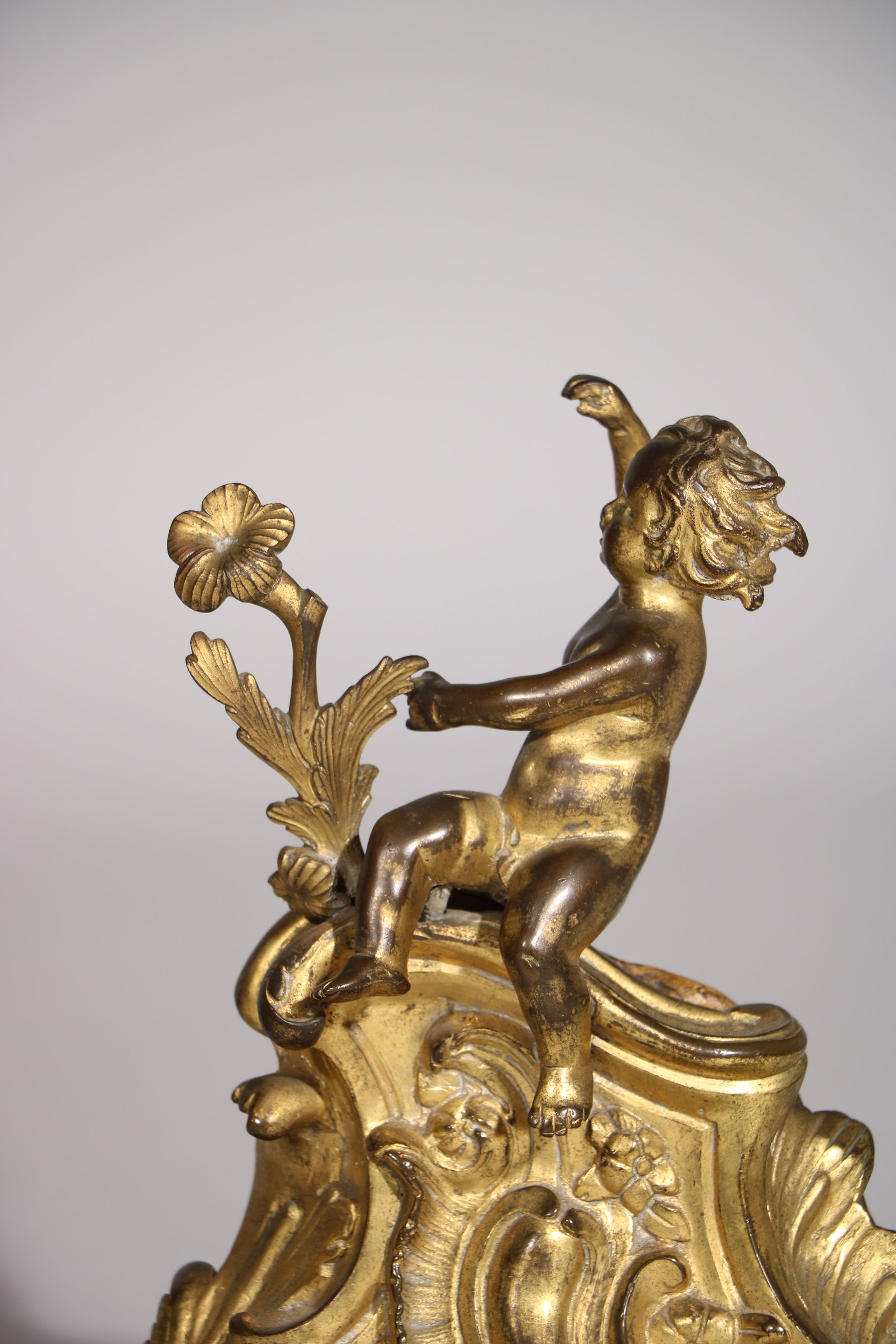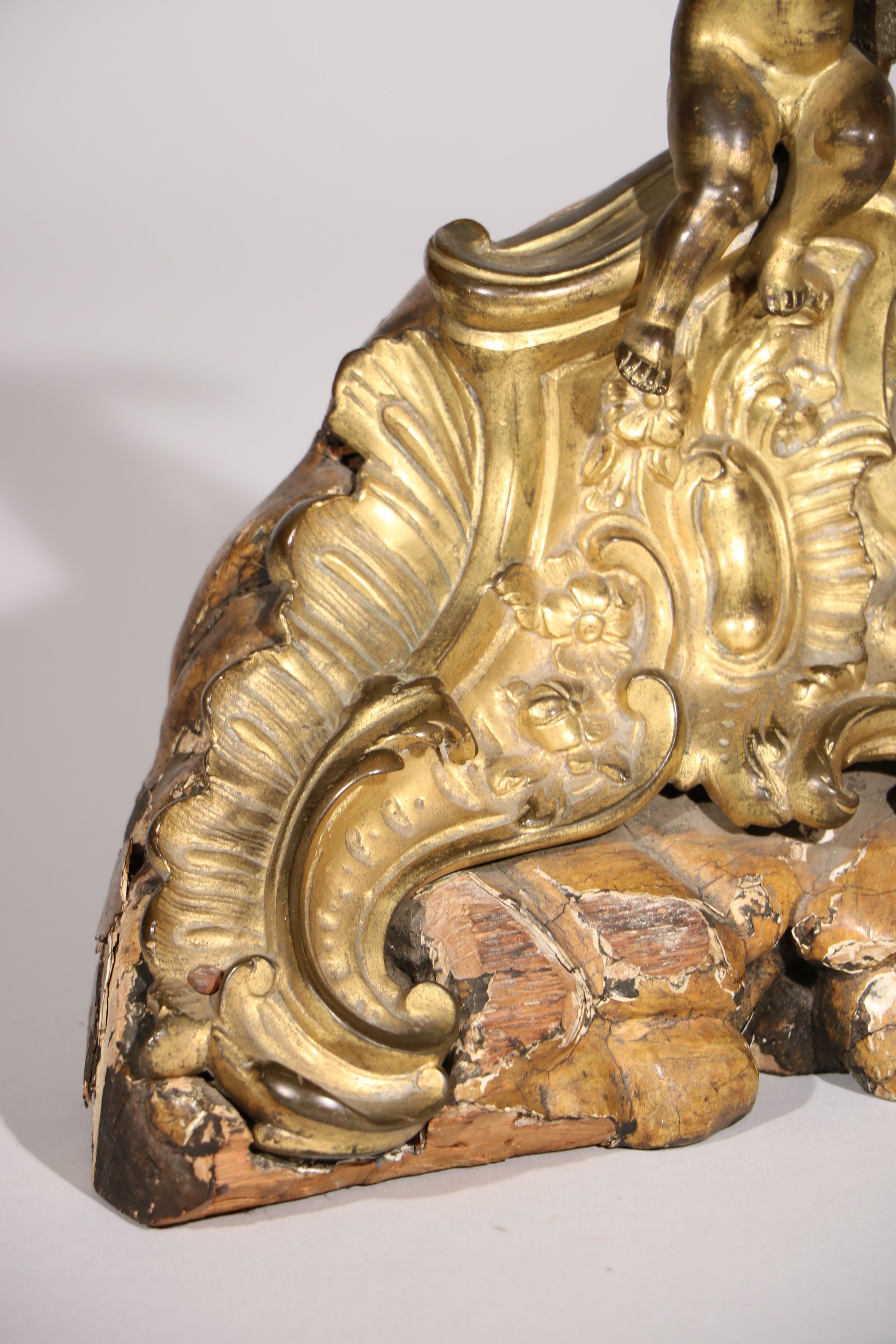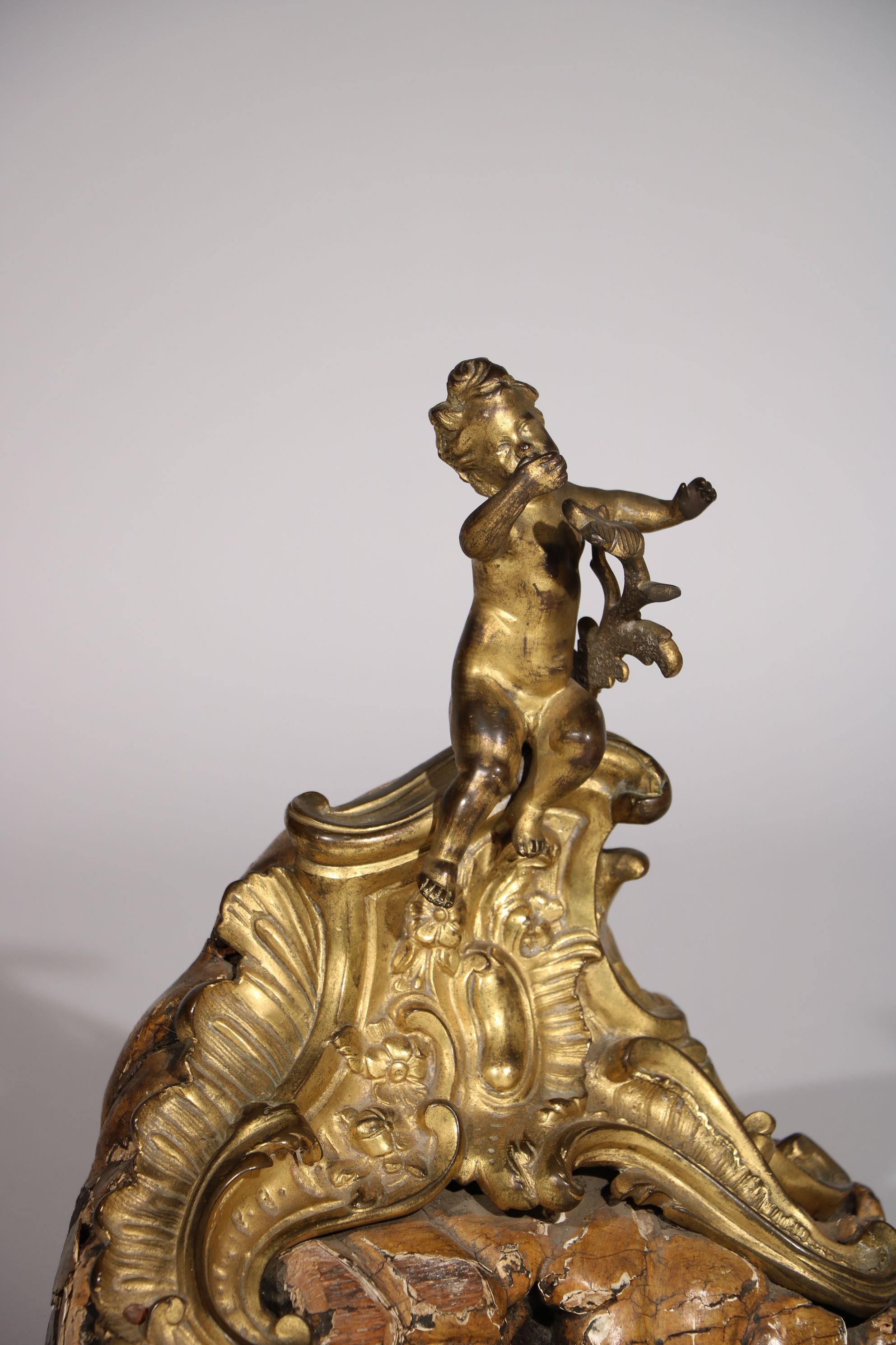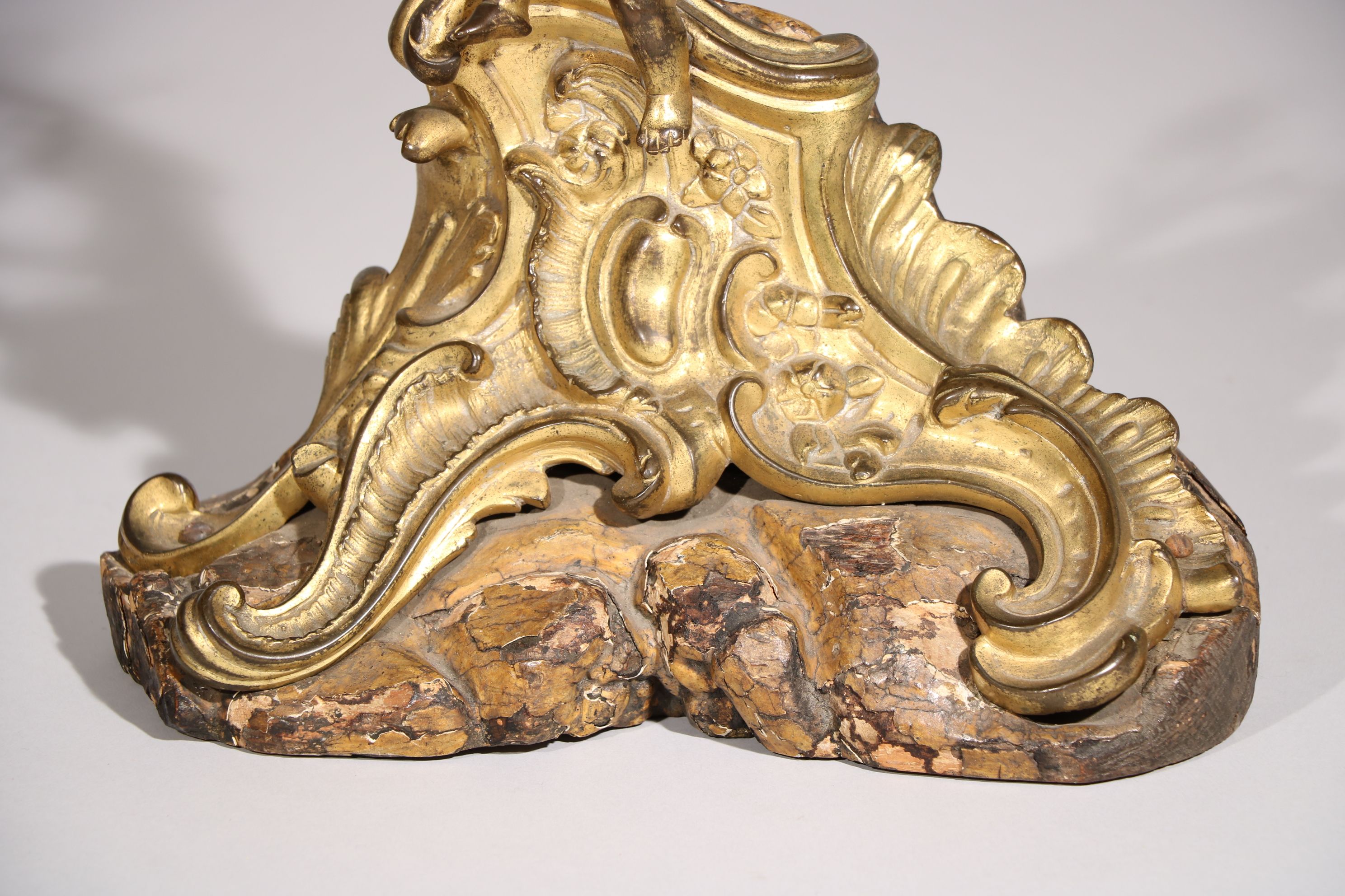 Paire de chenets en bronze doré et ciselé à décor d’un jeune garçon et d’une jeune fille à la fleur assise sur des motifs de rocailles. Les chenets sont inscrits dans des socles en bois patiné à l’imitation des rochers. Epoque Louis XV H. 33 x L. 32 x P. 16 cm