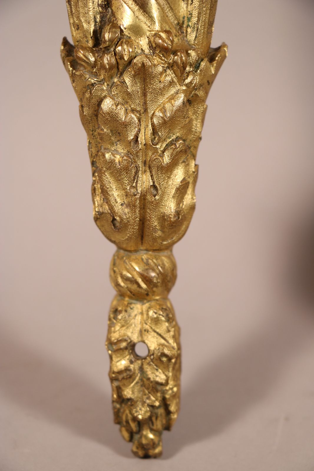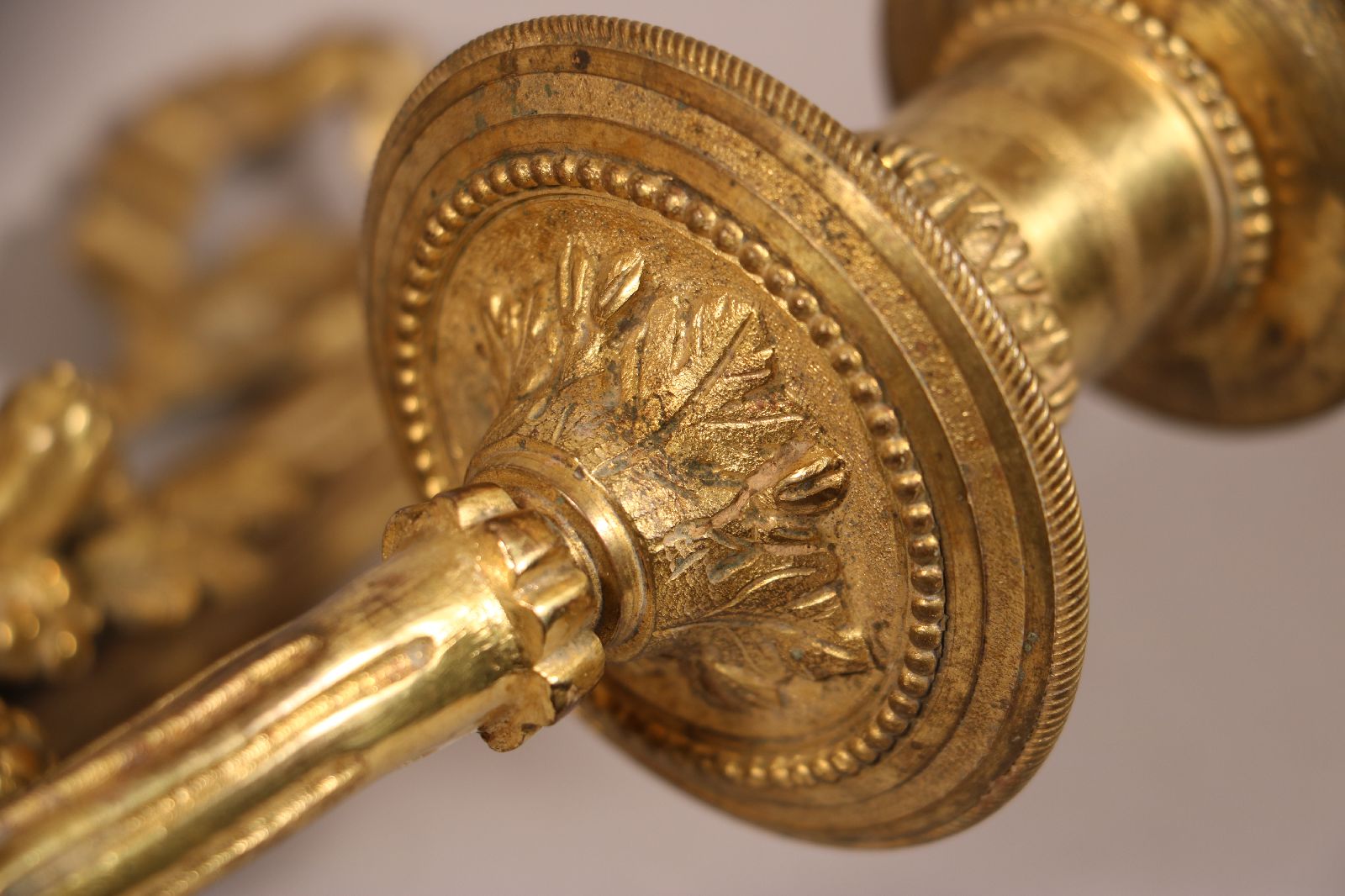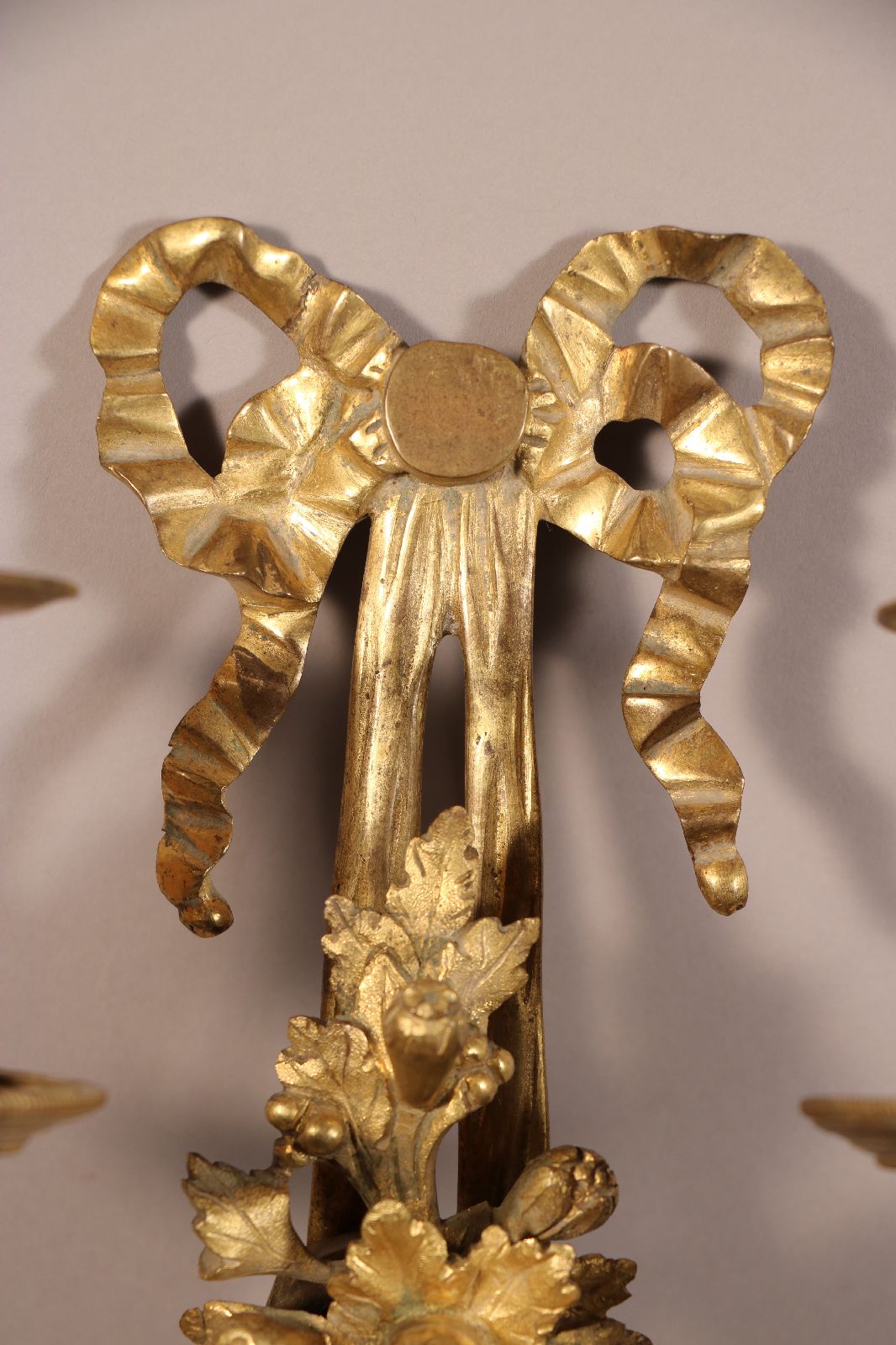 Paire d’appliques, carquois et rubans Vers 1780 Belle paire d’applique à carquois à deux branches en bronze doré d’époque Louis XVI La tige est composée d’un noeud de ruban tout fait néoclassique soutenant une sorte de carquois à cannelures torses chargé de fleurs qui s’achève en culots d’acanthe. De ses côtés émergent les deux bras de lumière finement ciselés. Des appliques à carquois de fleurs du même modèle, à trois branches, figurent au Palais Impérial de Pavlovsk en Russie, et firent manifestement partie des achats de Maria-Feodorovna et du futur Paul Ier de Russie lors de leur passage en France sous le nom de comte et de comtesse du Nord en 1783. Une autre paire est conservée au château de Moncley (Doubs) DIM : H.44 x L.24,5 cm. Dorure en bon état de conservation