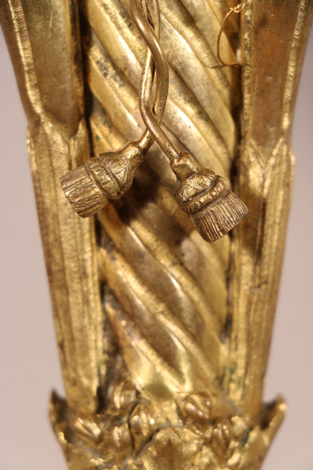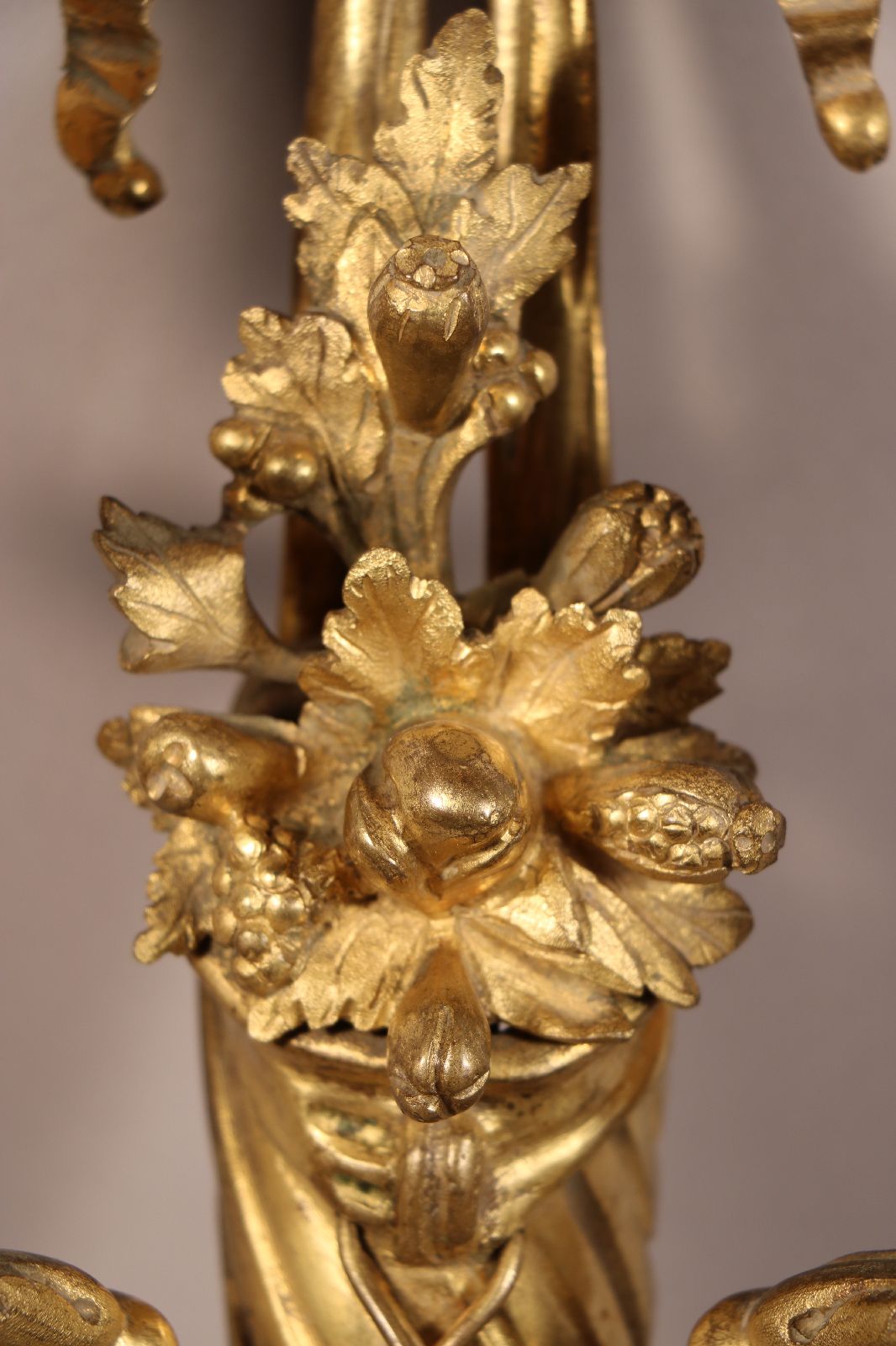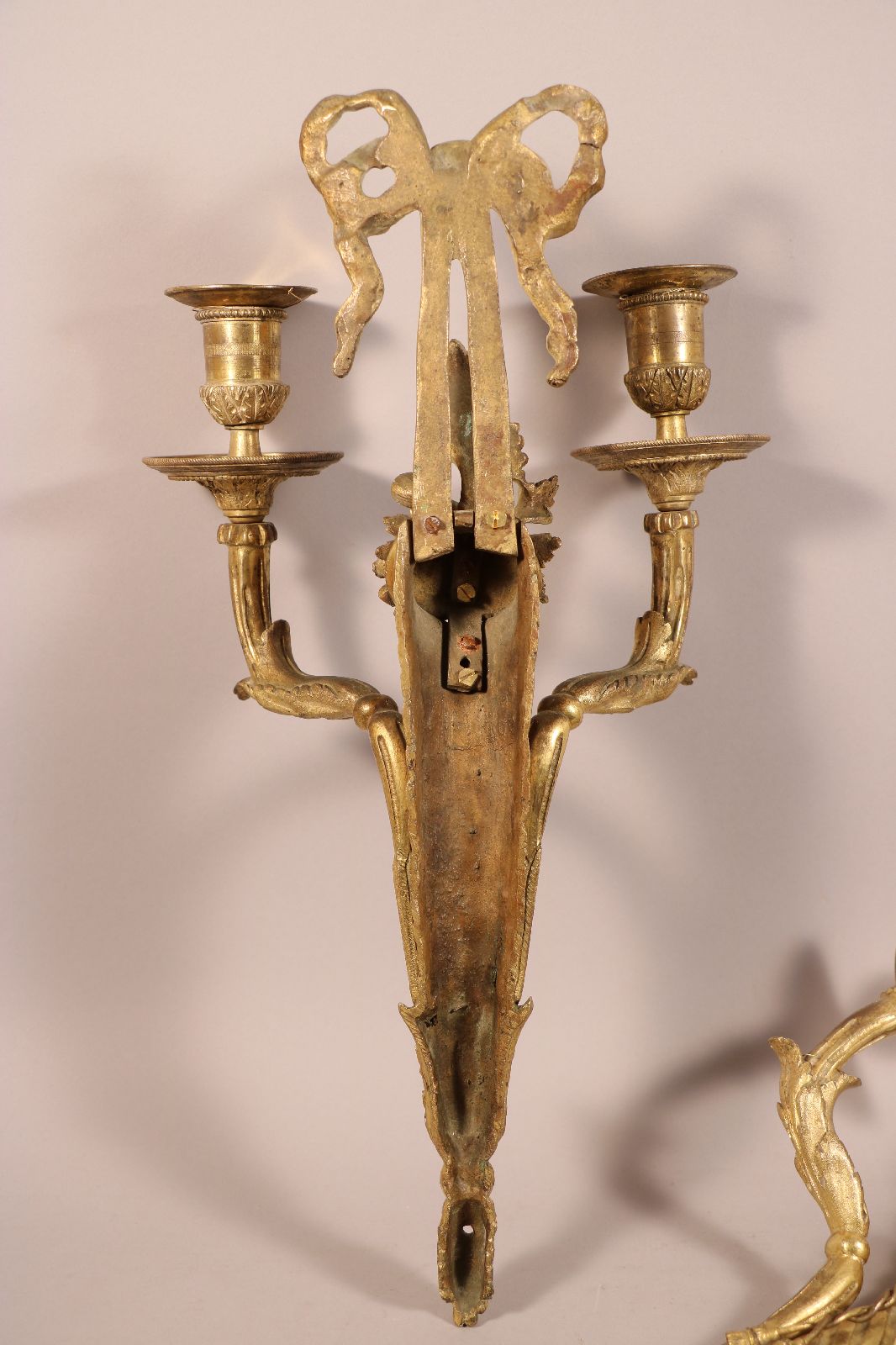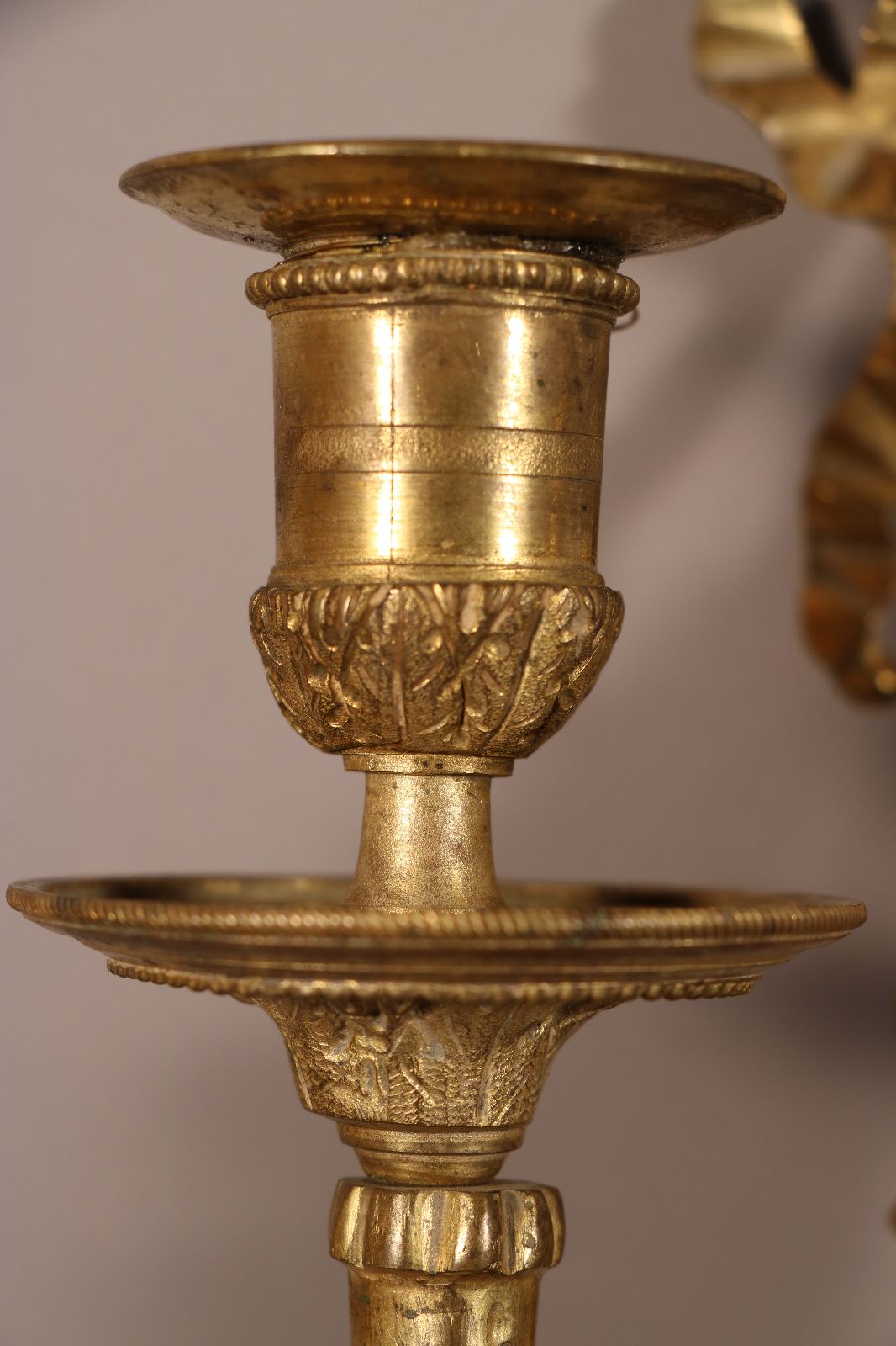 Paire d’appliques, carquois et rubans Vers 1780 Belle paire d’applique à carquois à deux branches en bronze doré d’époque Louis XVI La tige est composée d’un noeud de ruban tout fait néoclassique soutenant une sorte de carquois à cannelures torses chargé de fleurs qui s’achève en culots d’acanthe. De ses côtés émergent les deux bras de lumière finement ciselés. Des appliques à carquois de fleurs du même modèle, à trois branches, figurent au Palais Impérial de Pavlovsk en Russie, et firent manifestement partie des achats de Maria-Feodorovna et du futur Paul Ier de Russie lors de leur passage en France sous le nom de comte et de comtesse du Nord en 1783. Une autre paire est conservée au château de Moncley (Doubs) DIM : H.44 x L.24,5 cm. Dorure en bon état de conservation