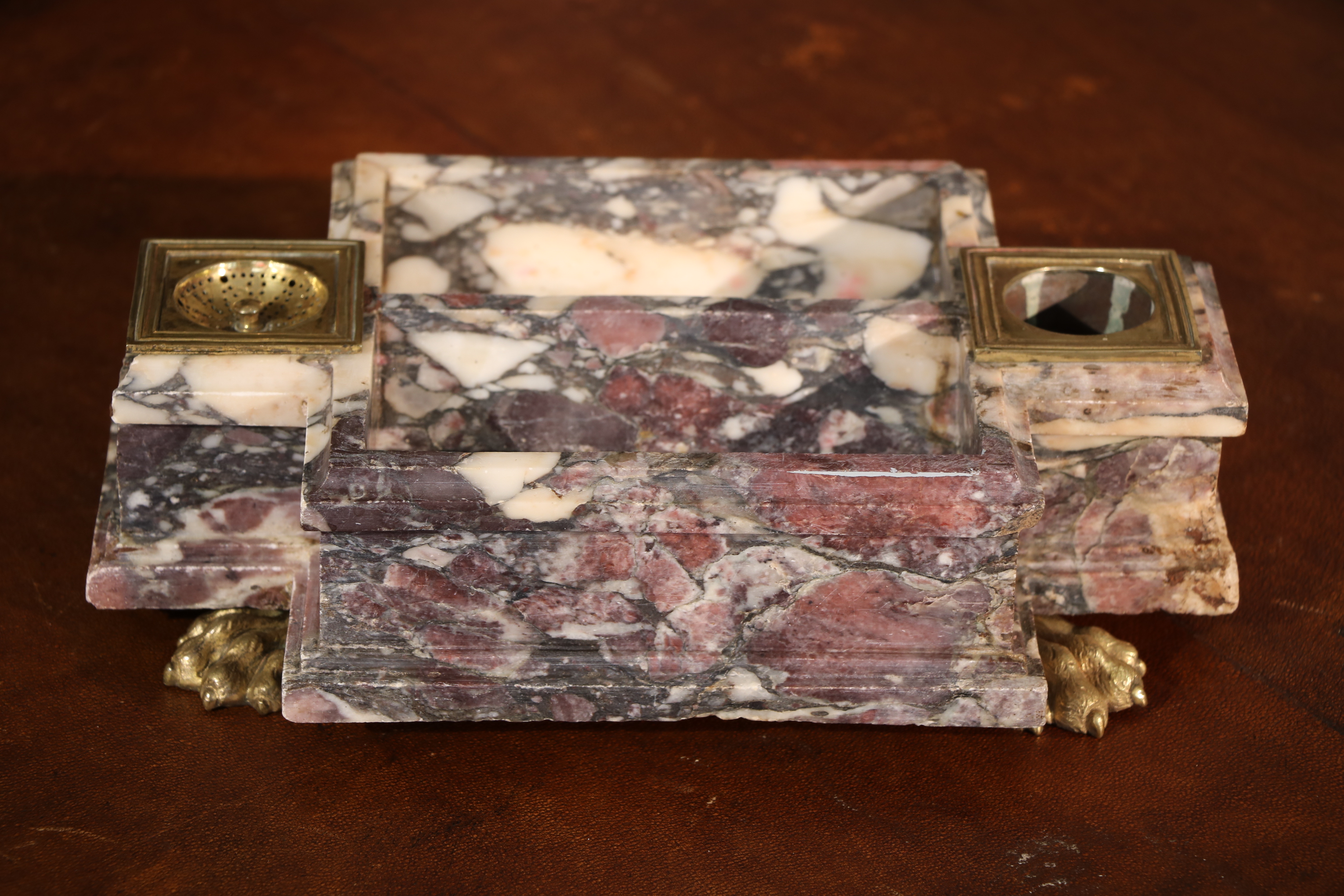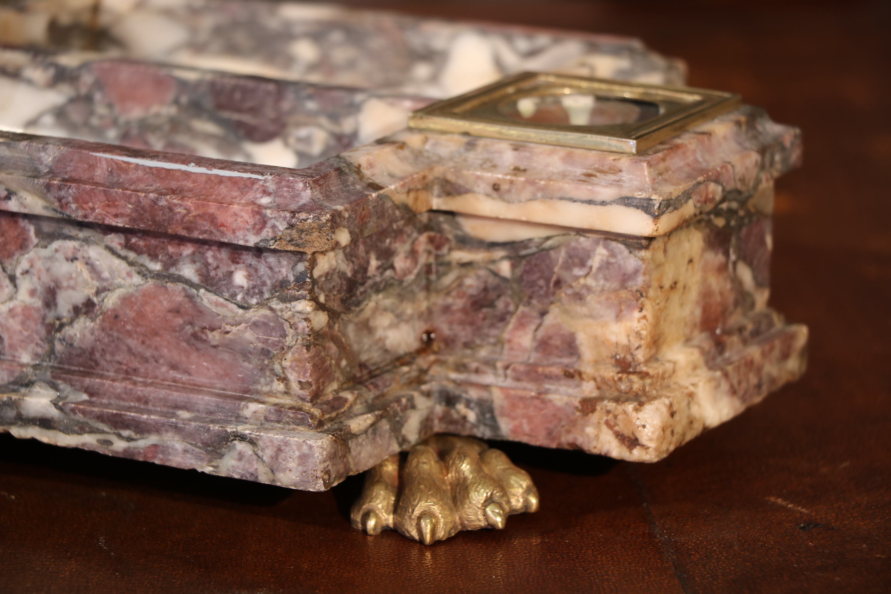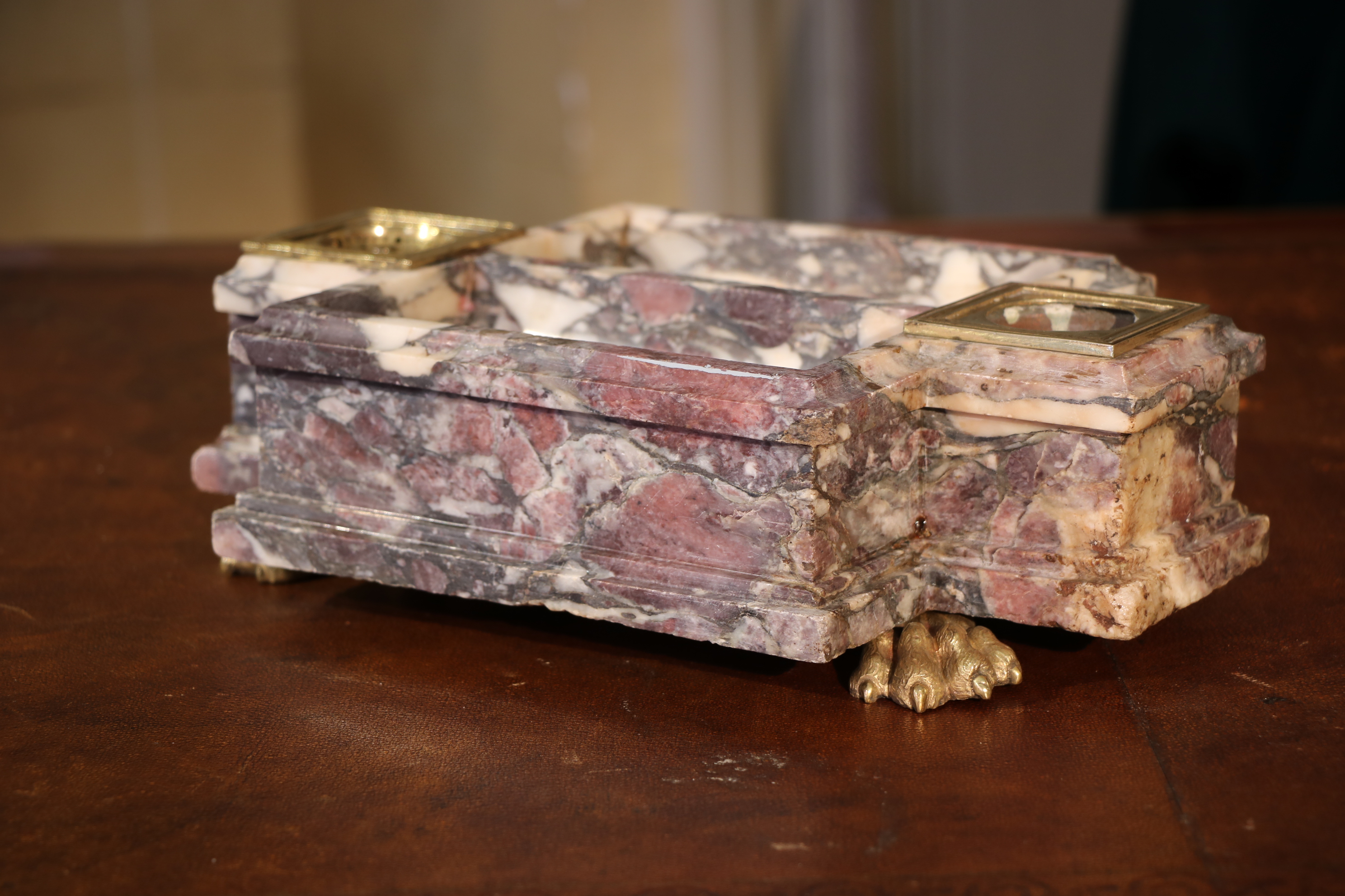 Encrier en brèche violette mouluré. L’encrier est garni de bronzes dorés en pieds formant des pâtes de lion et encrier. Epoque Louis XIV Restaurations d’usage H. 8, 5 x L. 18,5 x P. 29,5 cm