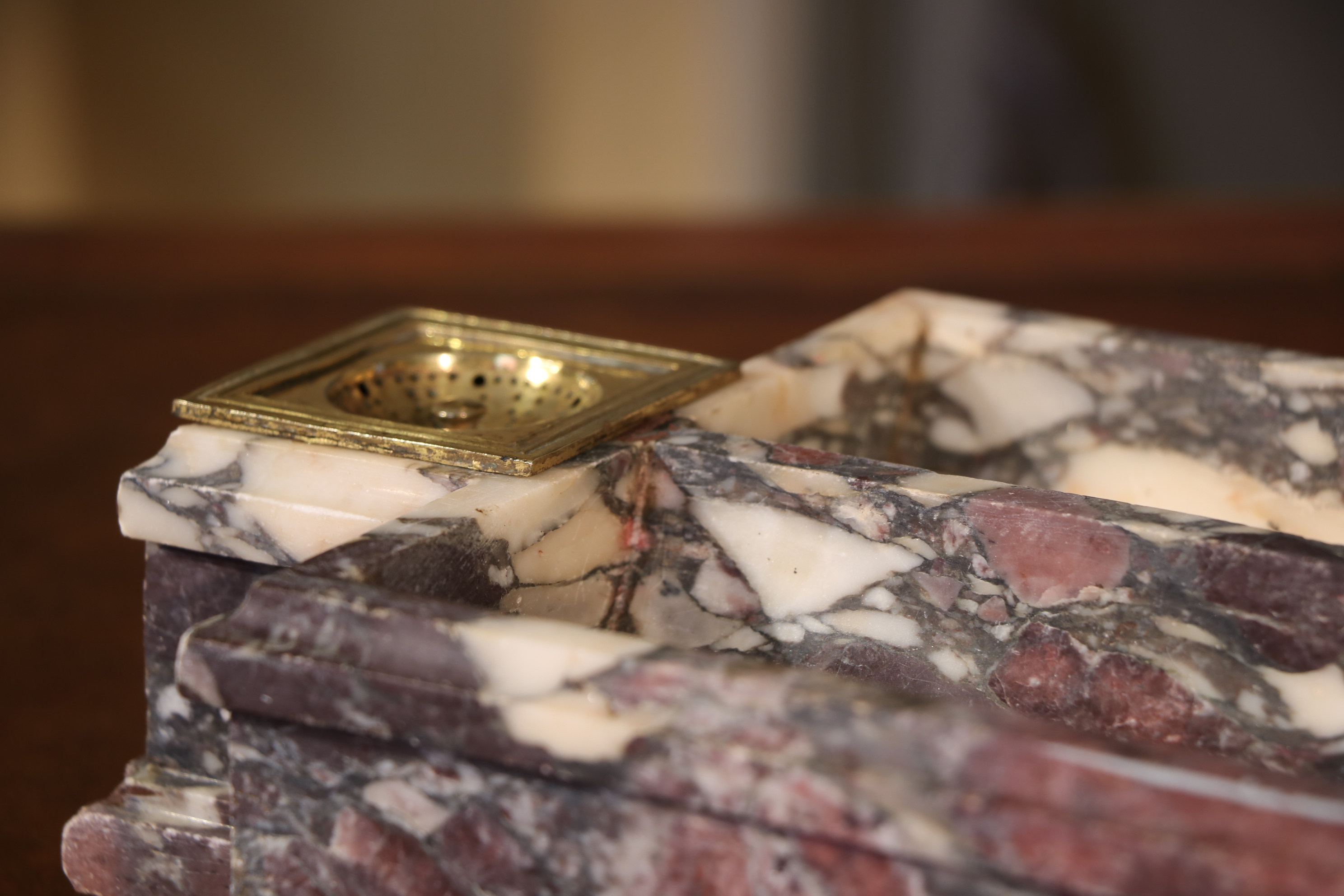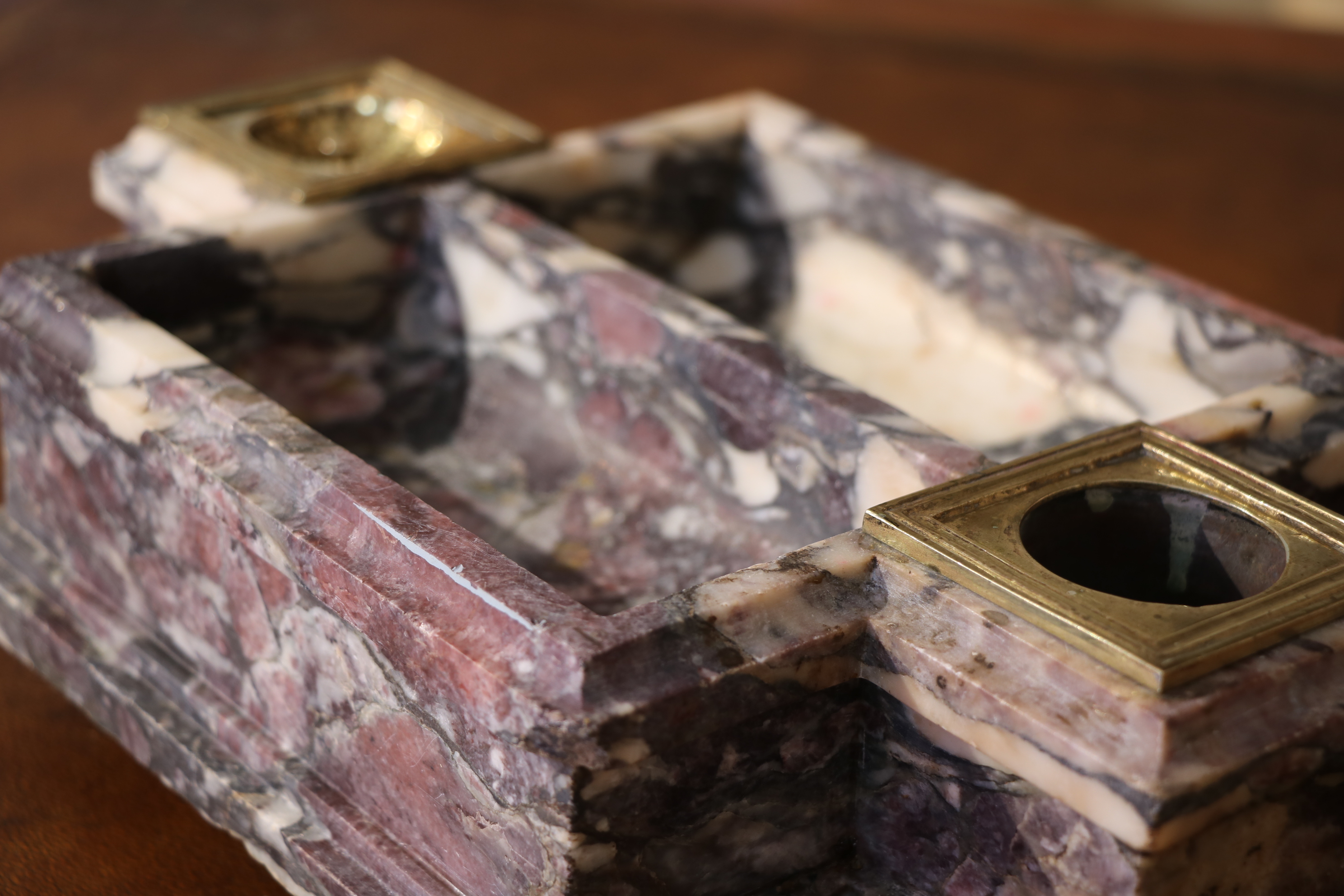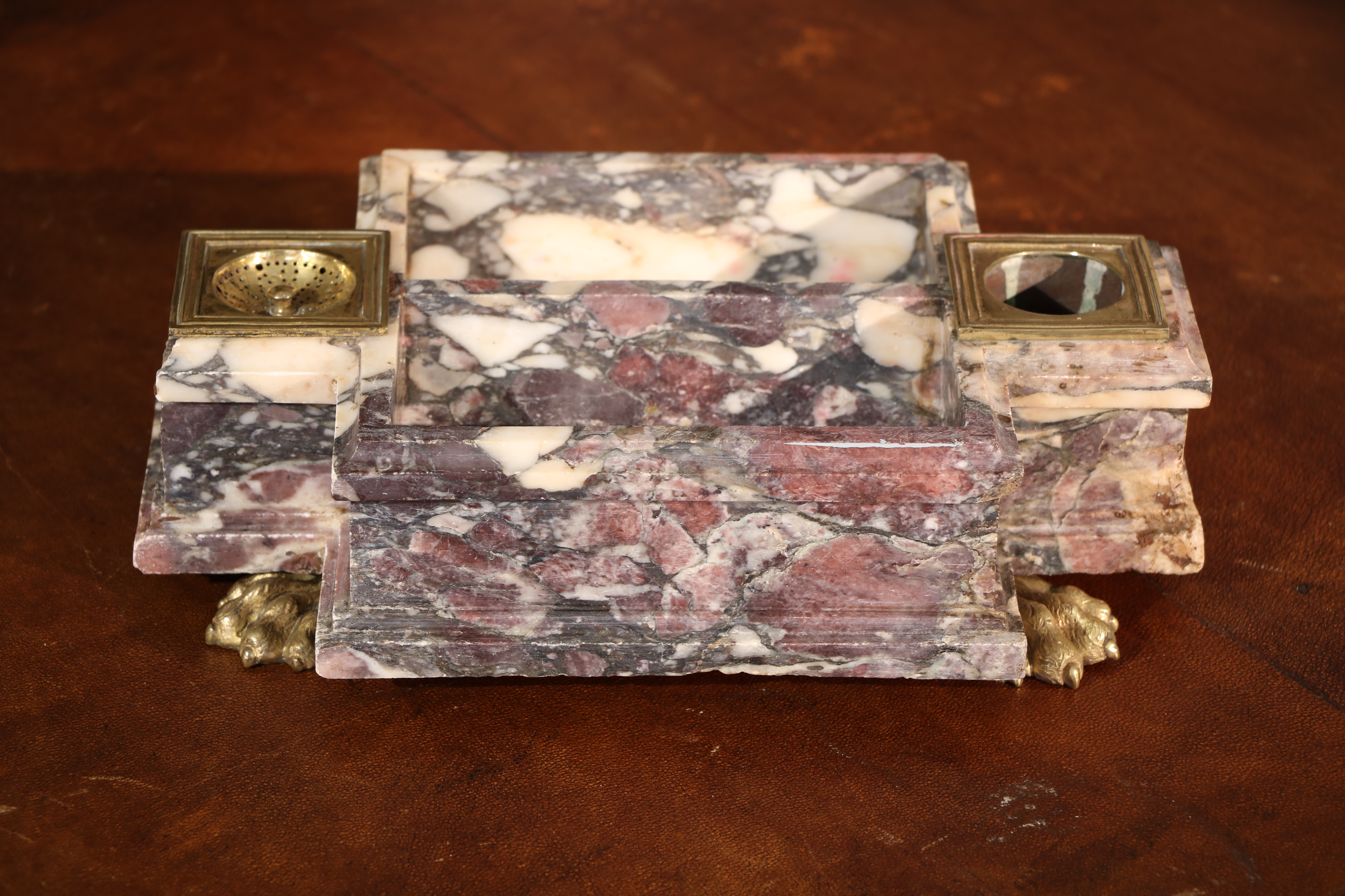 Encrier en brèche violette mouluré. L’encrier est garni de bronzes dorés en pieds formant des pâtes de lion et encrier. Epoque Louis XIV Restaurations d’usage H. 8, 5 x L. 18,5 x P. 29,5 cm
