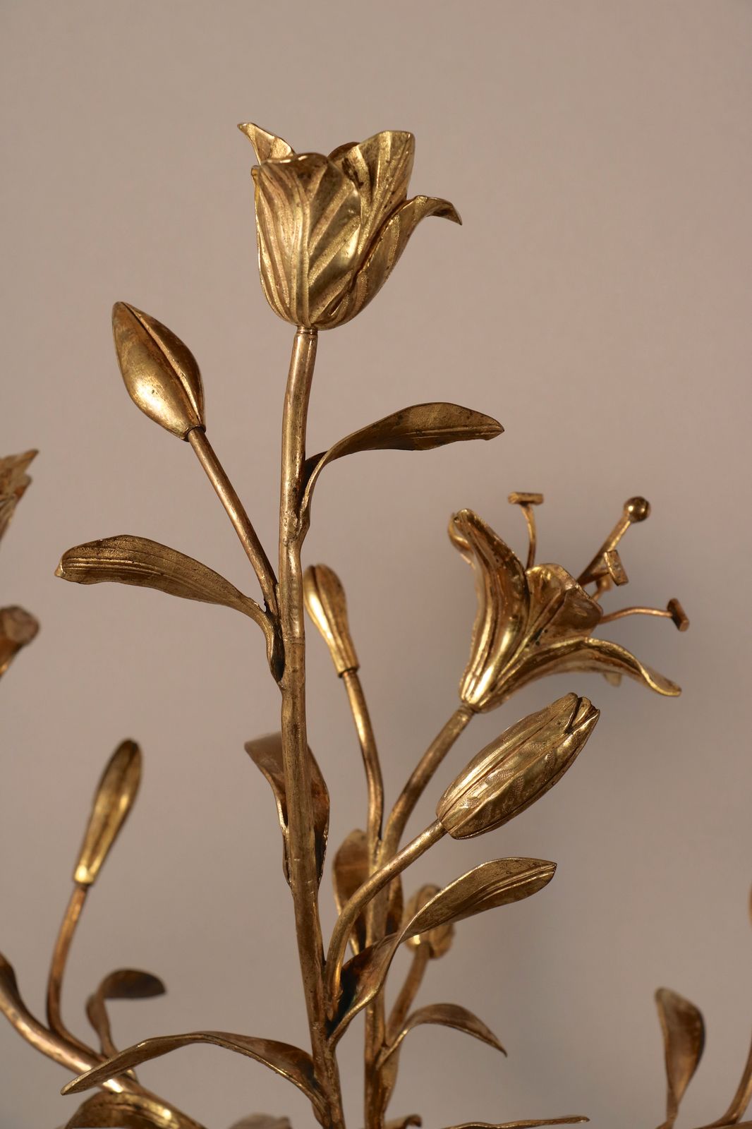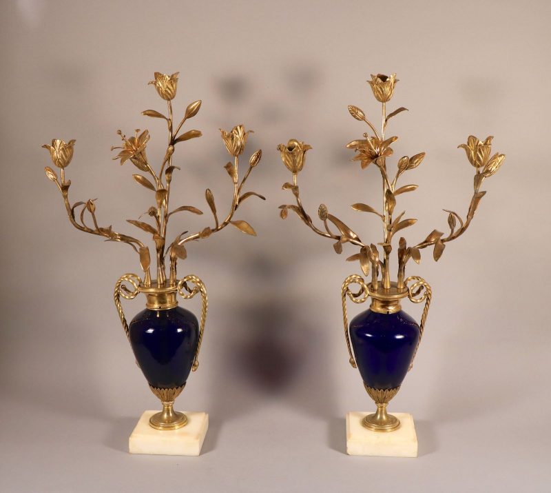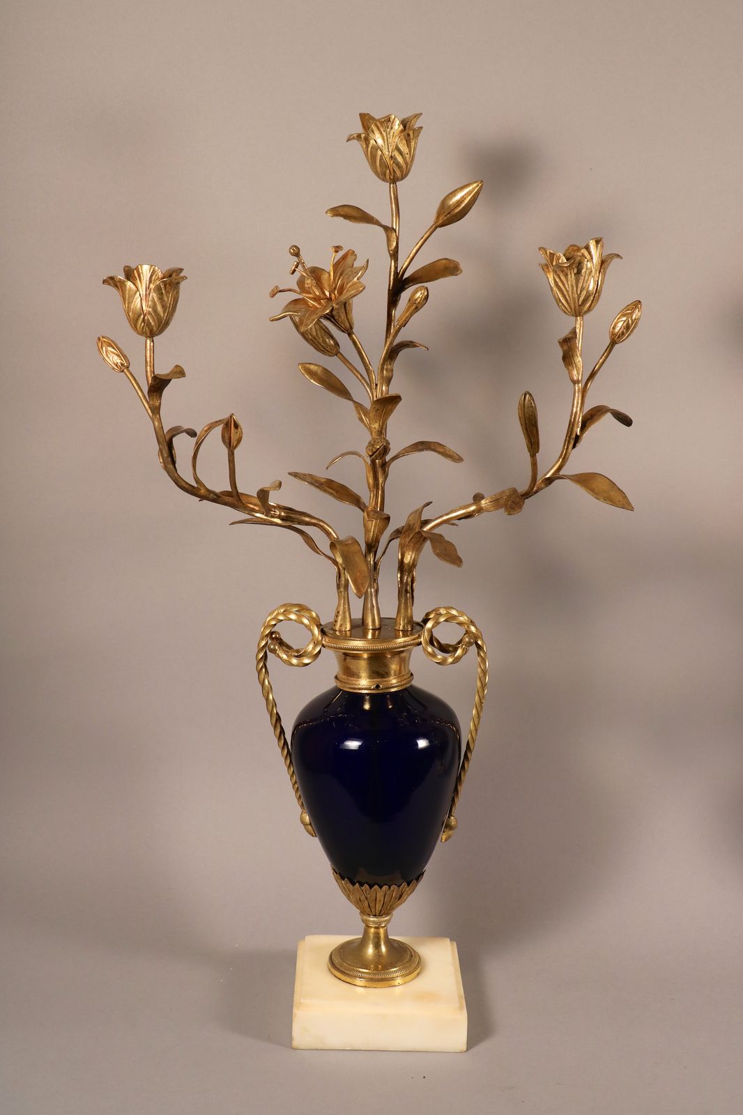 Paire de candélabres à trois bras de lumière en forme de vase garni de tulipes et d’un lys. Le vase balustre est composé d’une panse en verre bleu, d’un piédouche, de deux anses torsadées et d’un col en bronze doré. Trois des branches de tulipes forment les bras de lumière. Au centre, la dernière branche est une fleur de lys plus épanouie. Dès 1760, les premiers candélabres lys apparaissent. Les branches sont parfois tenues par des putti ou des figures féminines. Ici, un vase balustre en verre accueille les fleurs. La forme du vase à l’antique, le jeu entre les matériaux contrastés (verre, bronze, marbre), l’usage de marbre blanc de Carrare permettent de dater cette paire de l’époque Louis XVI et plus précisément des années 1780. Restaurations d’usage et d’entretien. H. 53 x L. 29 x P. 16 cm