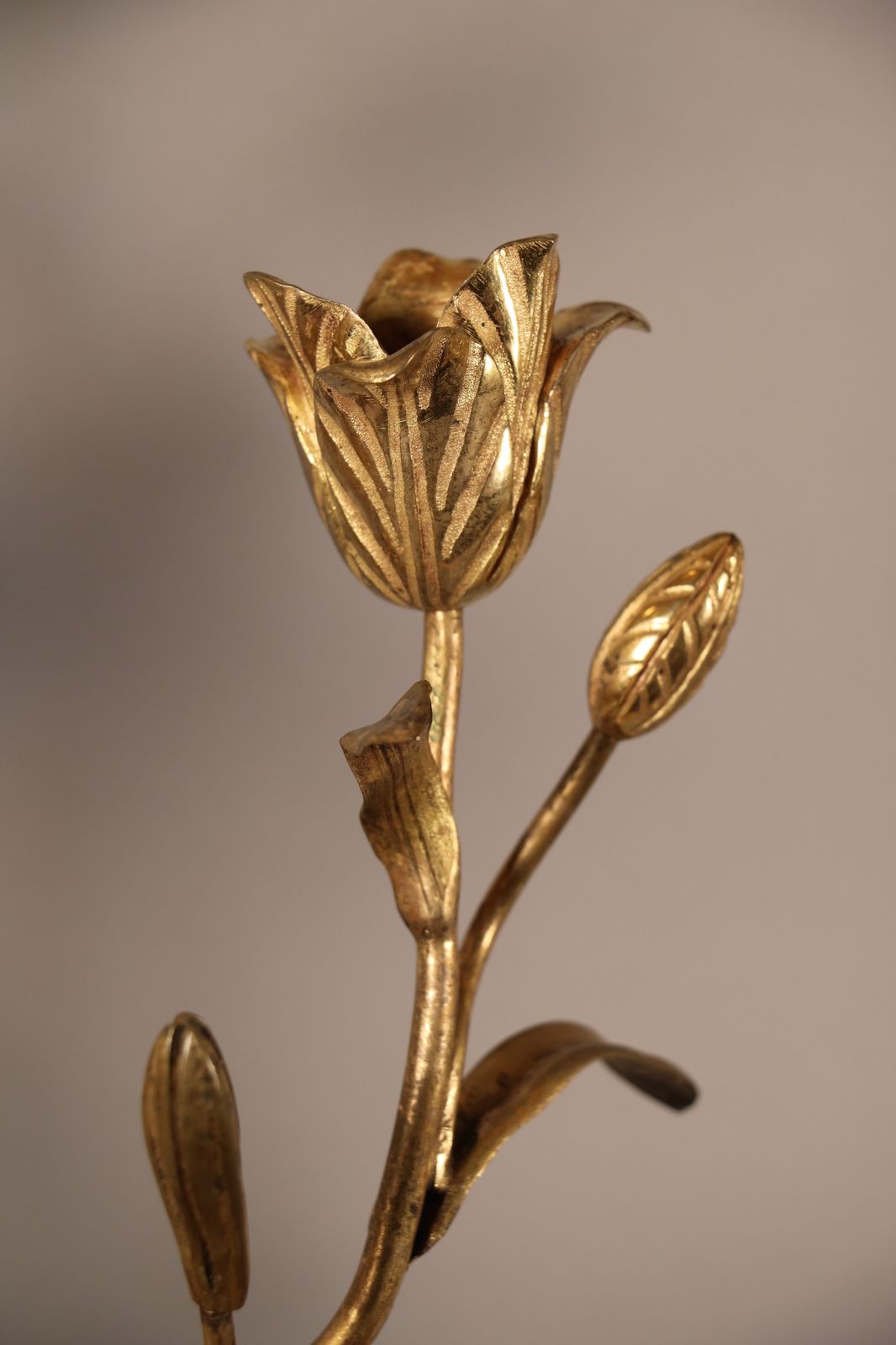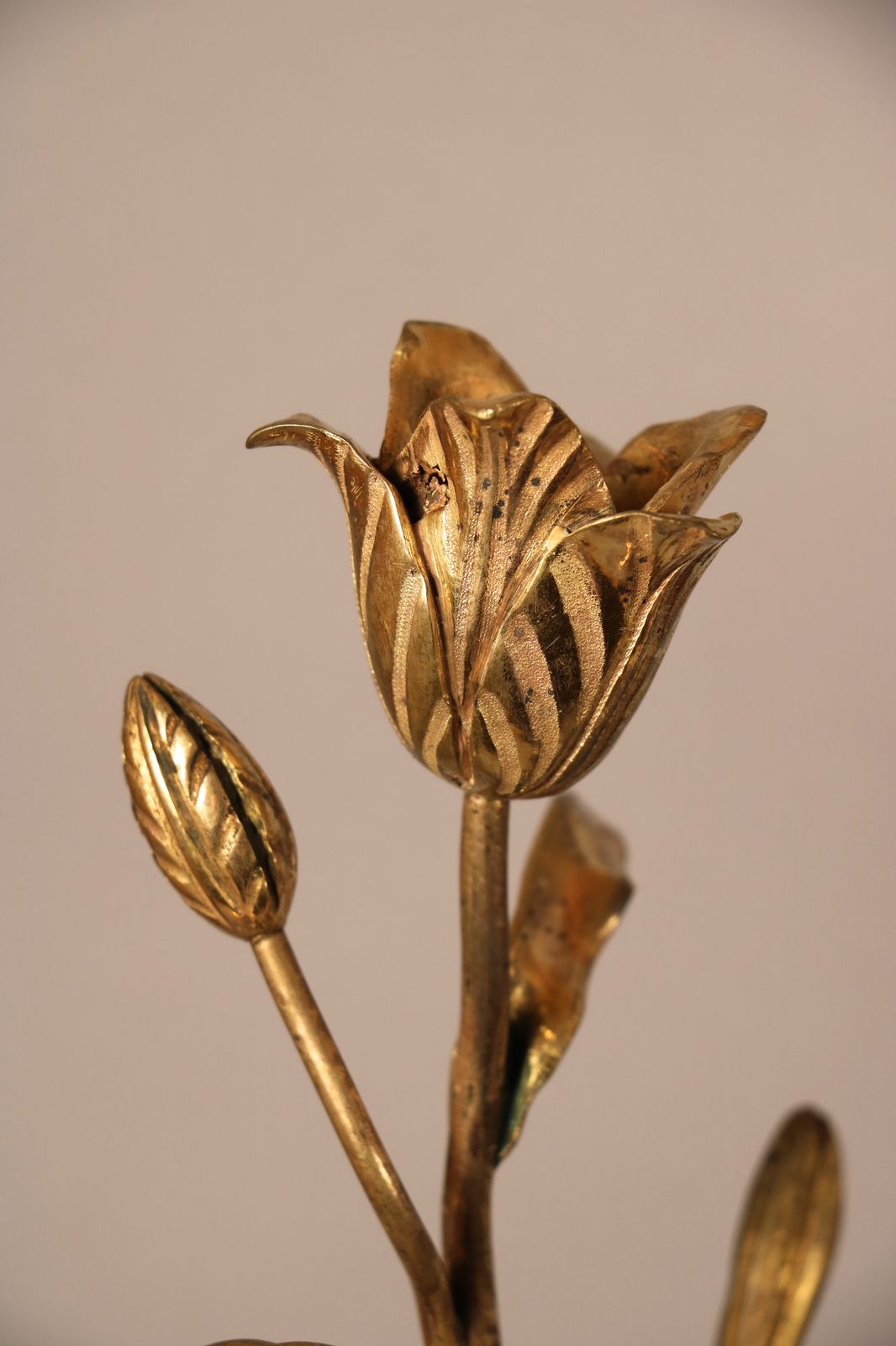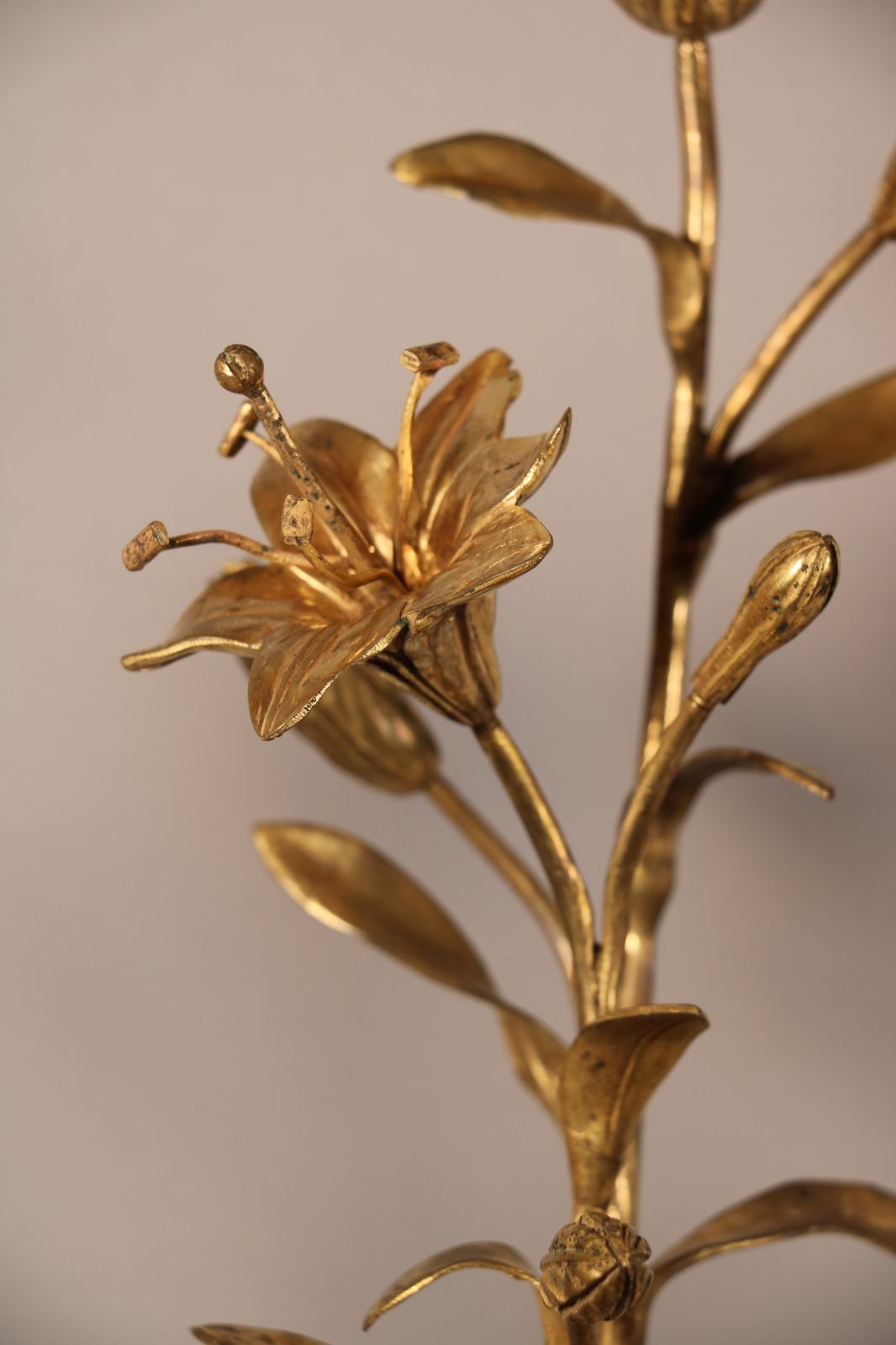 Paire de candélabres à trois bras de lumière en forme de vase garni de tulipes et d’un lys. Le vase balustre est composé d’une panse en verre bleu, d’un piédouche, de deux anses torsadées et d’un col en bronze doré. Trois des branches de tulipes forment les bras de lumière. Au centre, la dernière branche est une fleur de lys plus épanouie. Dès 1760, les premiers candélabres lys apparaissent. Les branches sont parfois tenues par des putti ou des figures féminines. Ici, un vase balustre en verre accueille les fleurs. La forme du vase à l’antique, le jeu entre les matériaux contrastés (verre, bronze, marbre), l’usage de marbre blanc de Carrare permettent de dater cette paire de l’époque Louis XVI et plus précisément des années 1780. Restaurations d’usage et d’entretien. H. 53 x L. 29 x P. 16 cm