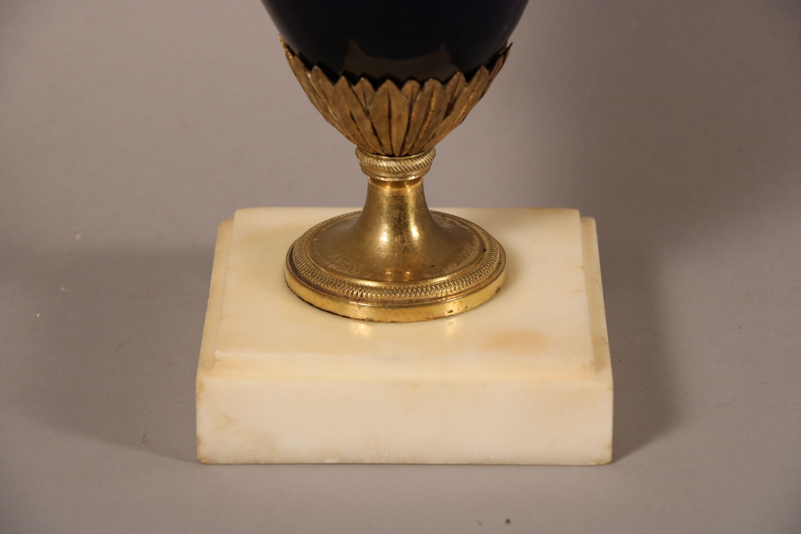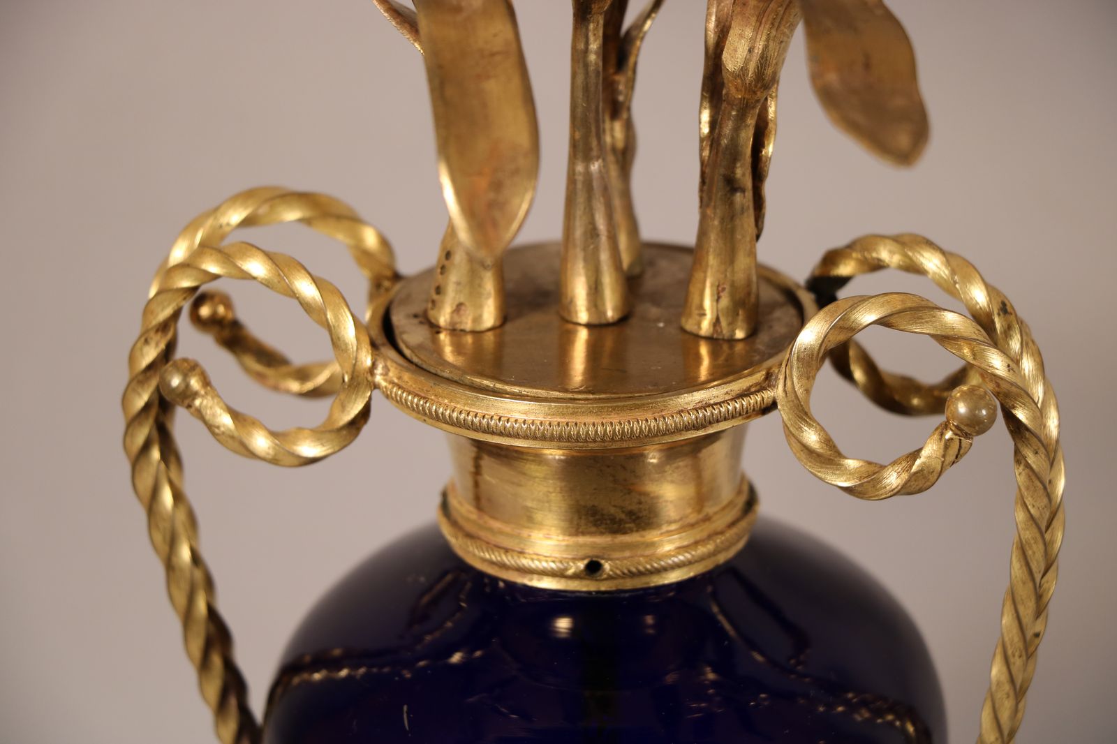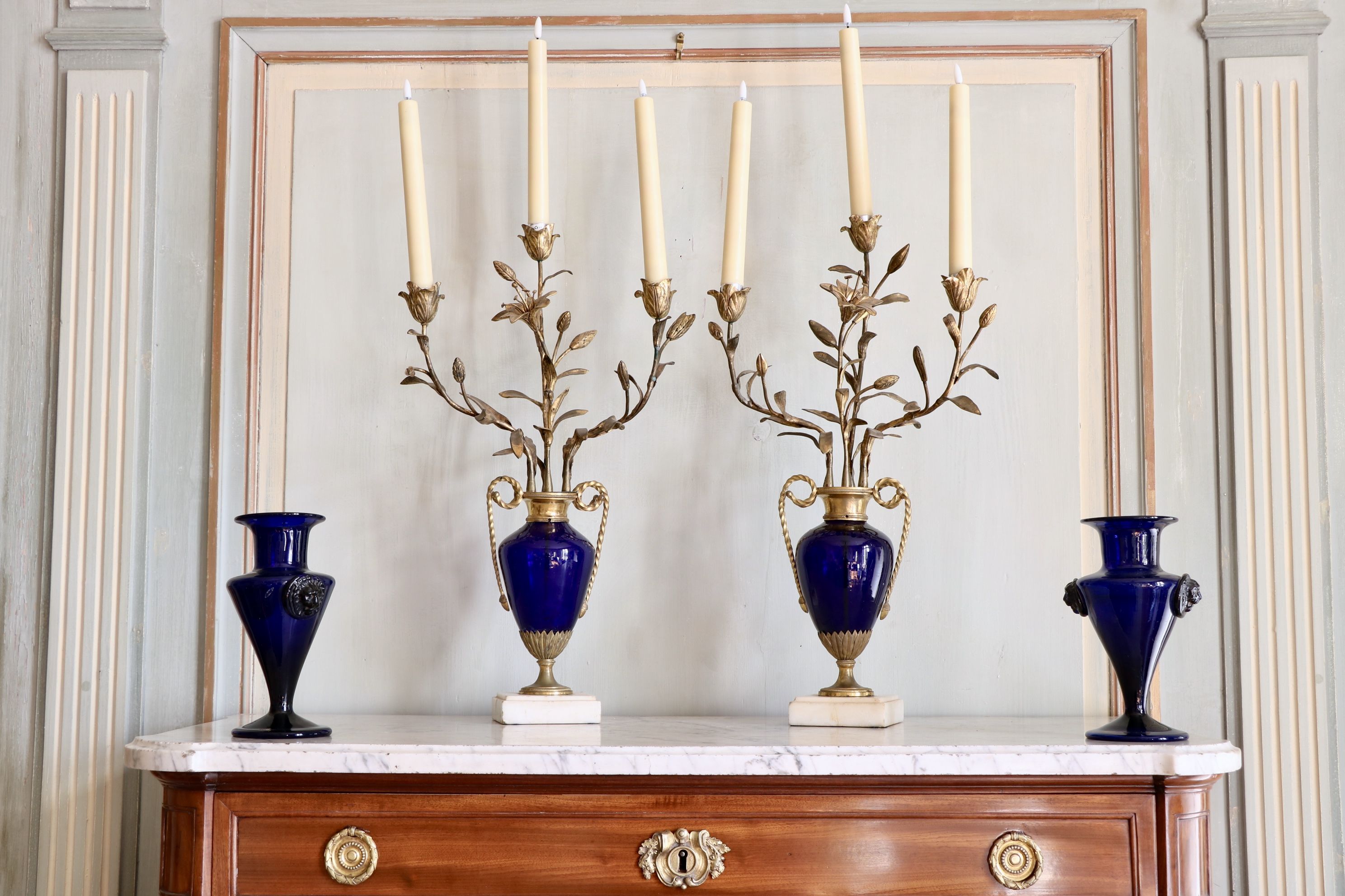 Paire de candélabres, verre bleu, bronze doré, marbre de Carrare, époque Louis XVI.