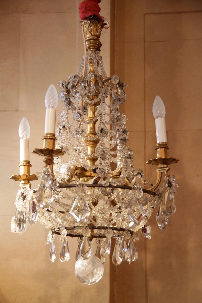 Lustre à Lacé - Vers 1950 Dans l'Esprit Du XVIIIe Siècle Très belle reproduction de lustre à lacé Lacé de perles et agrémenté de pampilles, fleurs, gouttes et d'une boule ciselée, le tout sur une armature de bronze. Voupelles ouvragées et binets à pans. Réalisé vers 1950 dans l'esprit de l'époque Louis XIV Dimensions (H x D) : 76 x 53 cm