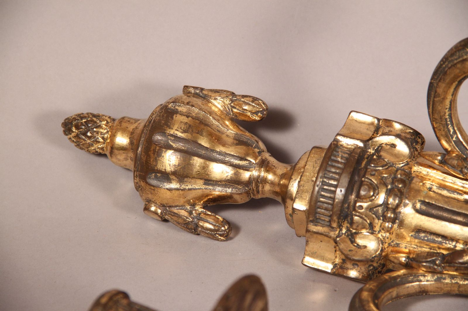 Paire d’appliques à deux lumières en bronze doré, d’époque Louis XVI. Ces appliques présentent une tige cannelée en colonne ionique tirée de l’Antique, surmontée d’un vase à pomme de pain et guirlandes de laurier cloutées. Les bras supportent des bobèches et leurs binets à canaux. Les branches et la tige sont réunies par des festons de laurier. L’ensemble a été doré au mercure et à la feuille. La dorure a subi les usures inexorables du temps mais présente son aspect original. Les deux bras ont été percés à la tiges, aux bobèches et aux binets pour électrification. vers 1770-1780. H. 36,5 x L. 26,5 x P. 14 cm