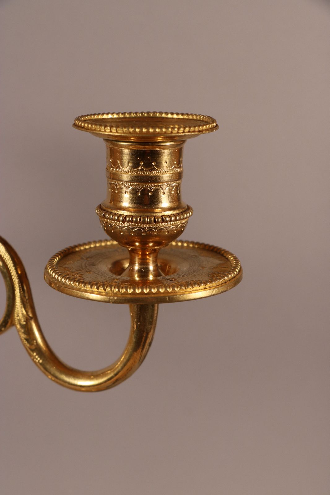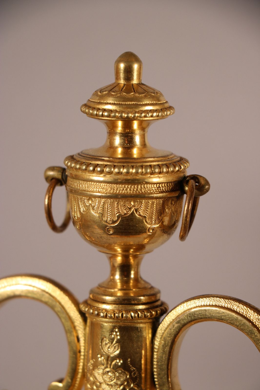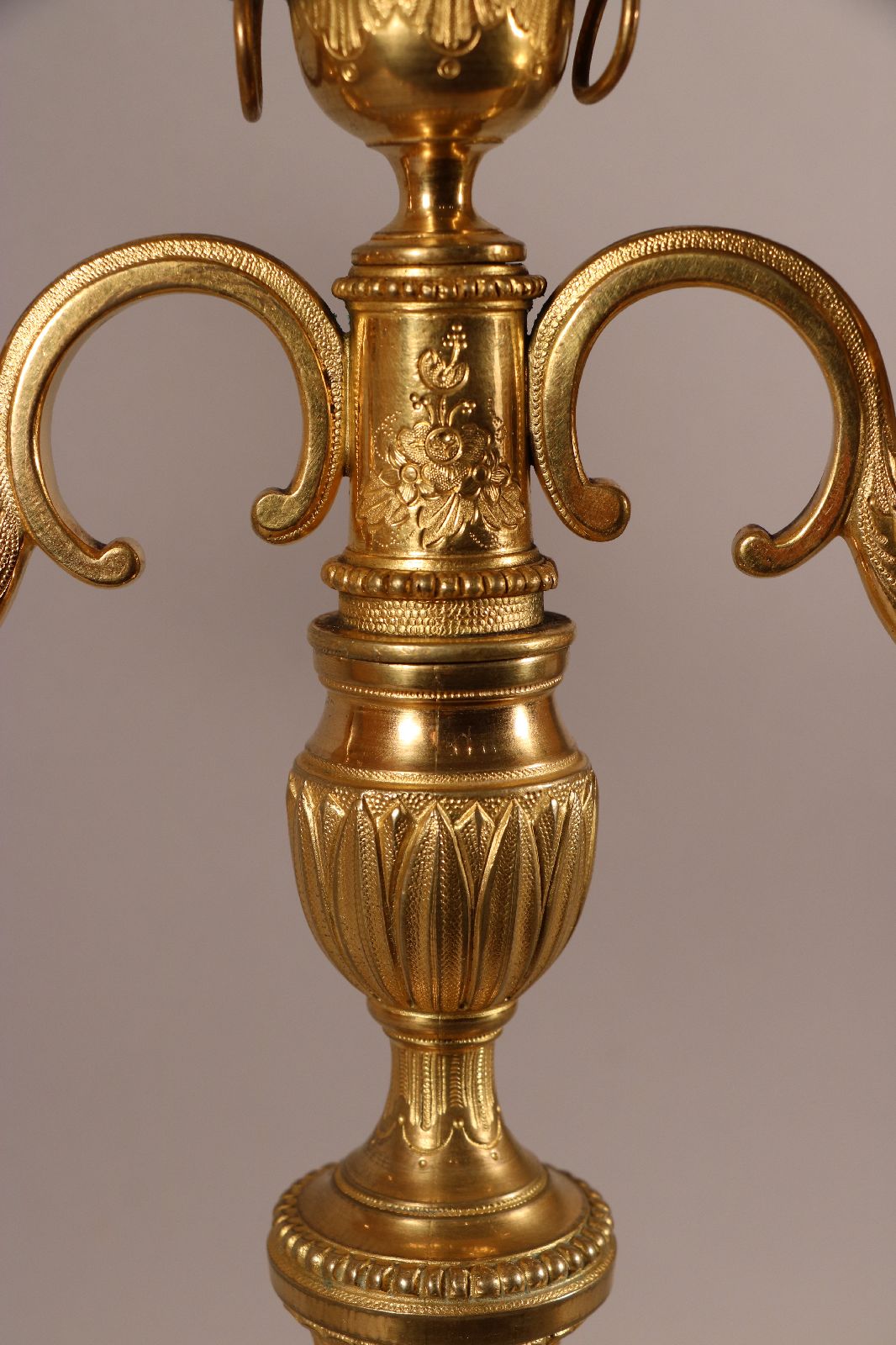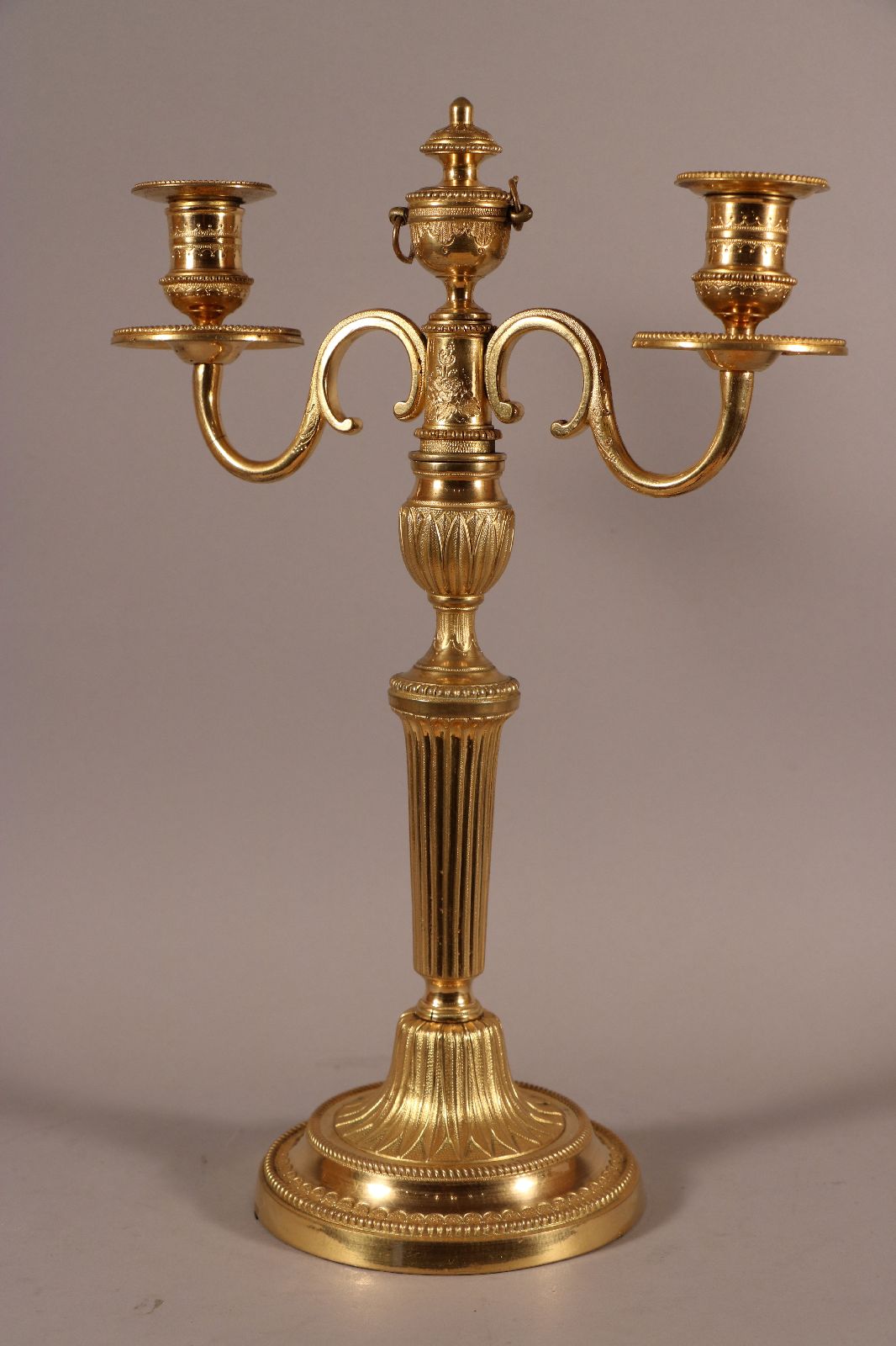 Paire de candélabres à deux bras de lumière en bronze ciselé et doré surmonté d’un pot à feu en forme de cassolette dont les contours sont surlignés par des filets de perles. Le fût cannelé repose sur une base circulaire et est surmonté d’une coupe à décor végétal. Celle-ci est ornée de perles, de filets torsadés et de feuillages. De fins rinceaux ornent les bras de lumière. Quant aux binets, ils sont surlignés de perles et agrémentés de ciselures fines. Des lignes sobres et un fût à cannelures sont des caractéristiques du style Louis XVI, de la fin du XVIIIe siècle. Accidents de fonte sur des candélabres visibles sur les photographies. Dim. (H x L x P) : 39 x 26,5 x 13,5 cm