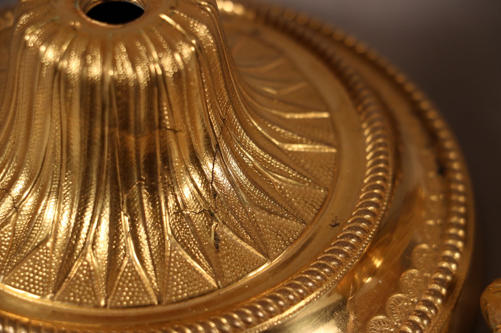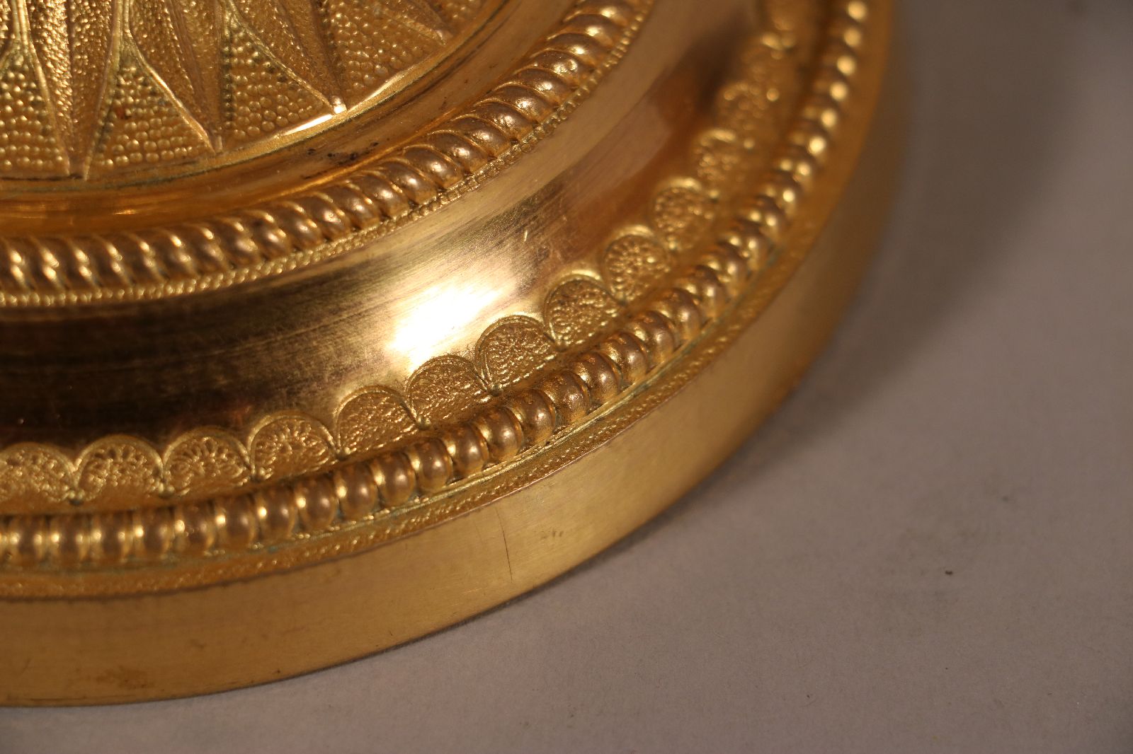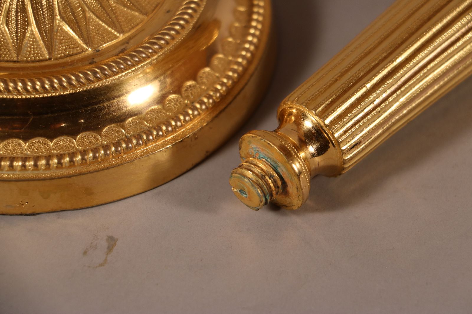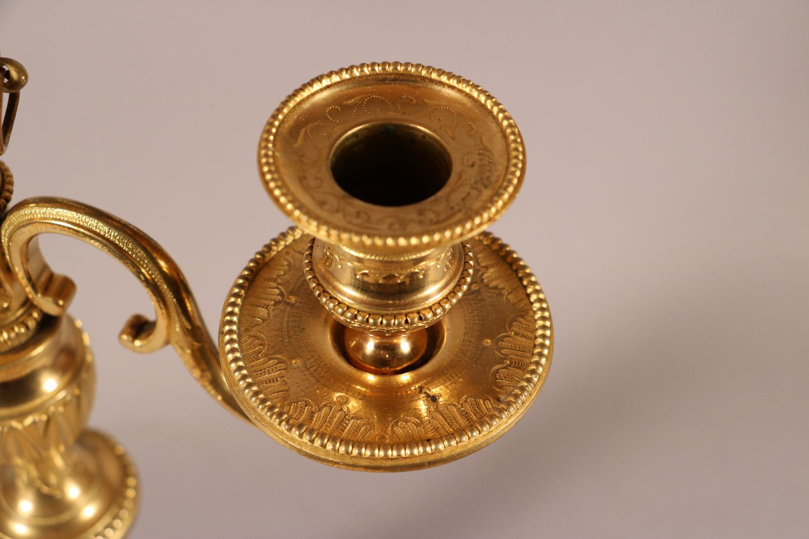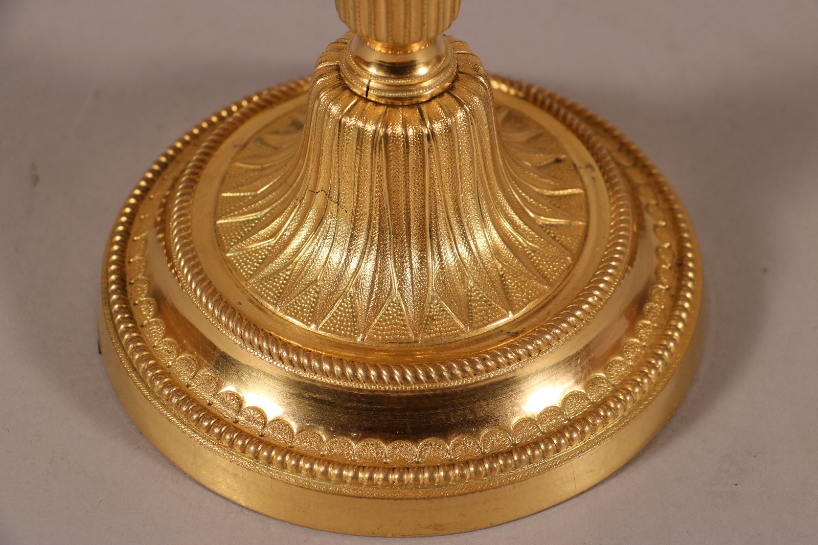 Paire de candélabres à deux bras de lumière en bronze ciselé et doré surmonté d’un pot à feu en forme de cassolette dont les contours sont surlignés par des filets de perles. Le fût cannelé repose sur une base circulaire et est surmonté d’une coupe à décor végétal. Celle-ci est ornée de perles, de filets torsadés et de feuillages. De fins rinceaux ornent les bras de lumière. Quant aux binets, ils sont surlignés de perles et agrémentés de ciselures fines. Des lignes sobres et un fût à cannelures sont des caractéristiques du style Louis XVI, de la fin du XVIIIe siècle. Accidents de fonte sur des candélabres visibles sur les photographies. Dim. (H x L x P) : 39 x 26,5 x 13,5 cm