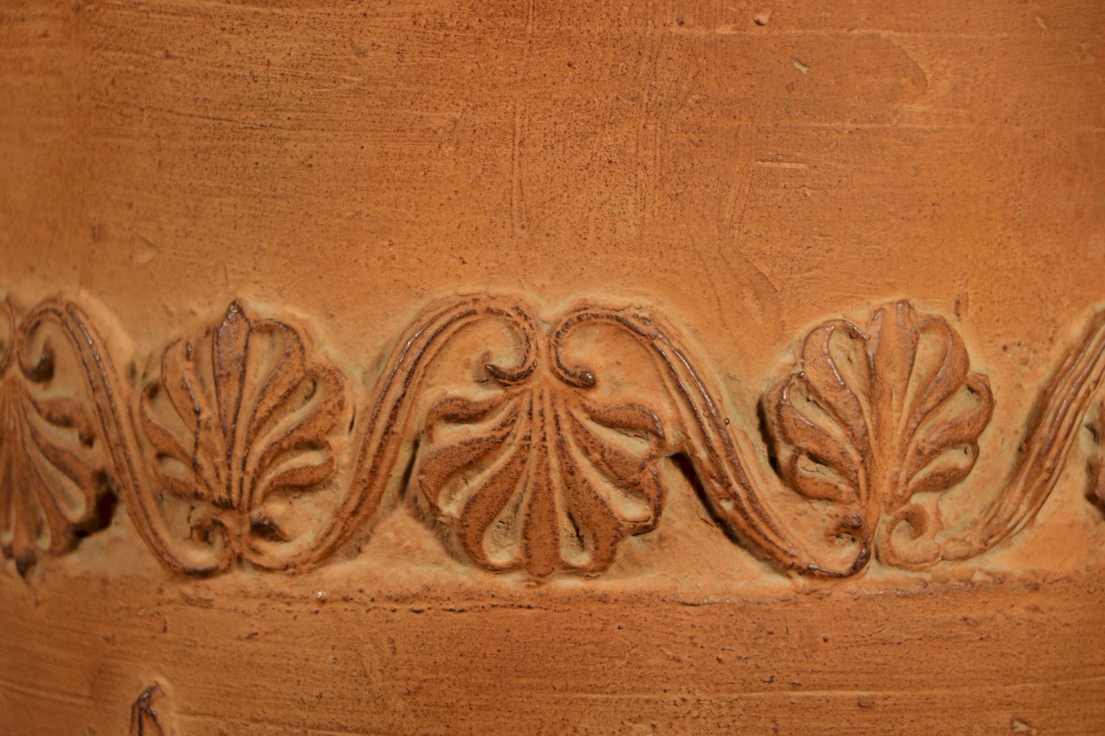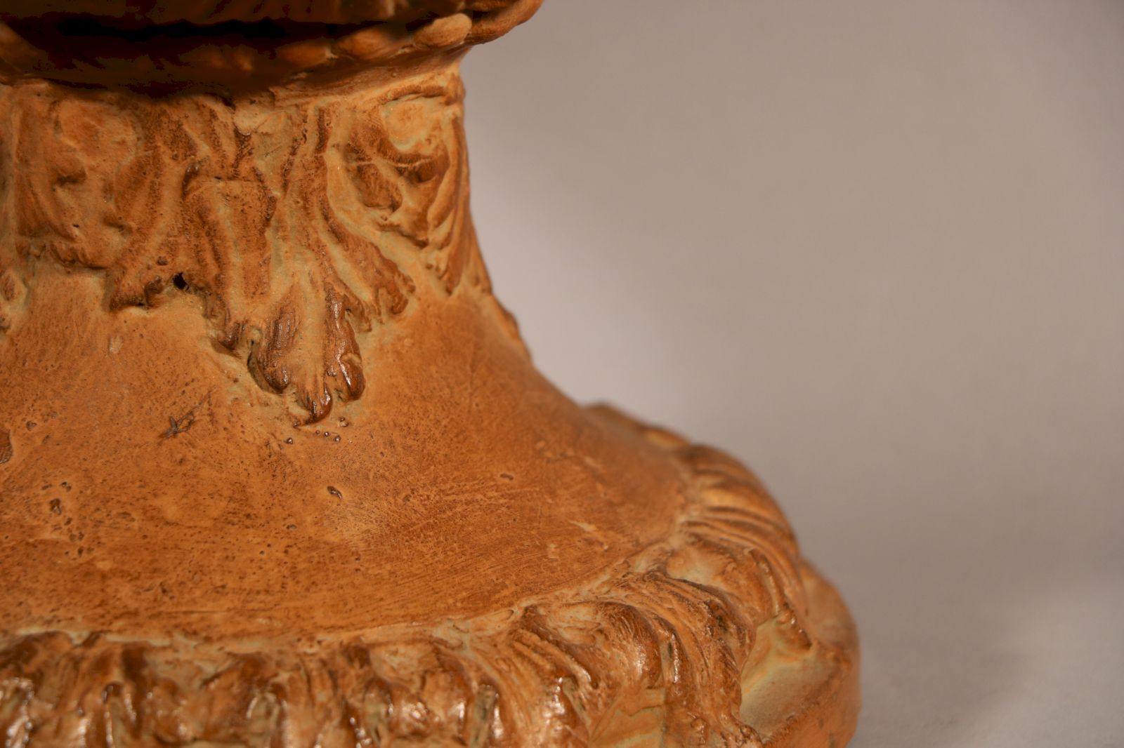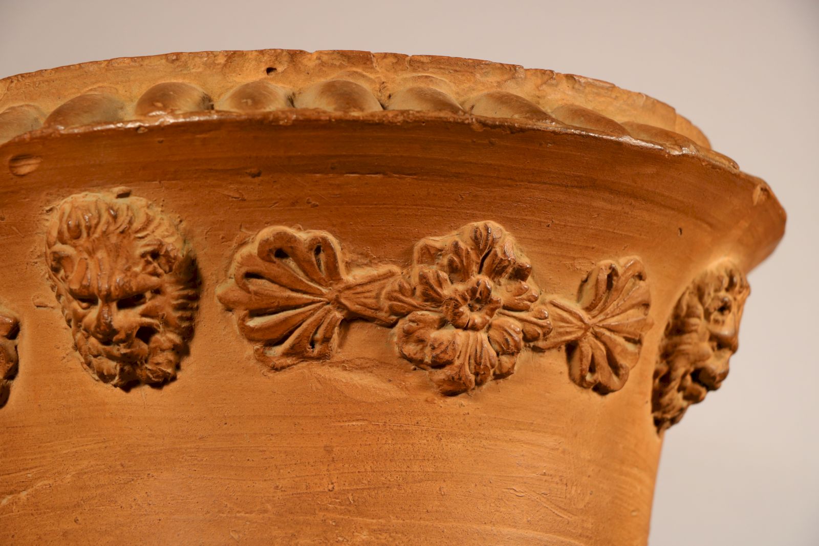Vase Médicis en terre cuite et à décor moulé. La lèvre godronnée est soulignée par une alternance de têtes de lion et de fleurs encadrées de palmettes. Une frise de palmettes surmonte de grandes feuilles qui garnissent le fond. Des acanthes ornent le piédouche. Ce type de vase reprend la forme de cloche inspirée de modèles antiques sur un piédouche. Cette forme de vase est très populaire à partir de la Renaissance suite à la découverte du vase Médicis, pièce exceptionnelle d’1,73 mètres et richement sculpté ou du vase Borghèse. A partir du XVIIe siècle, ce type de cratères a été produit pour agrémenter les jardins et les terrasses. Avec le goût néoclassique, ces vases « à l’antique » sont à la mode. H. 50 x D. 36,5 cm
