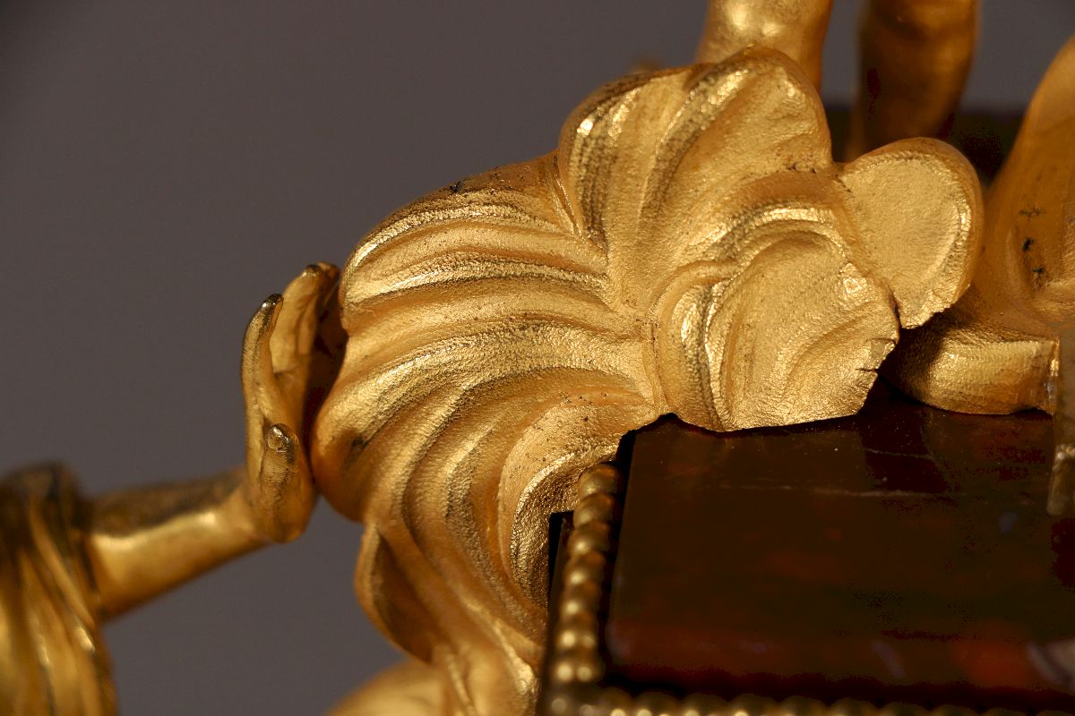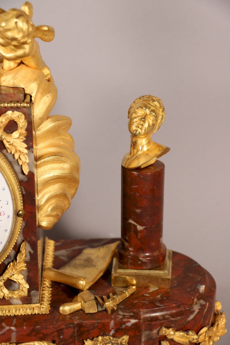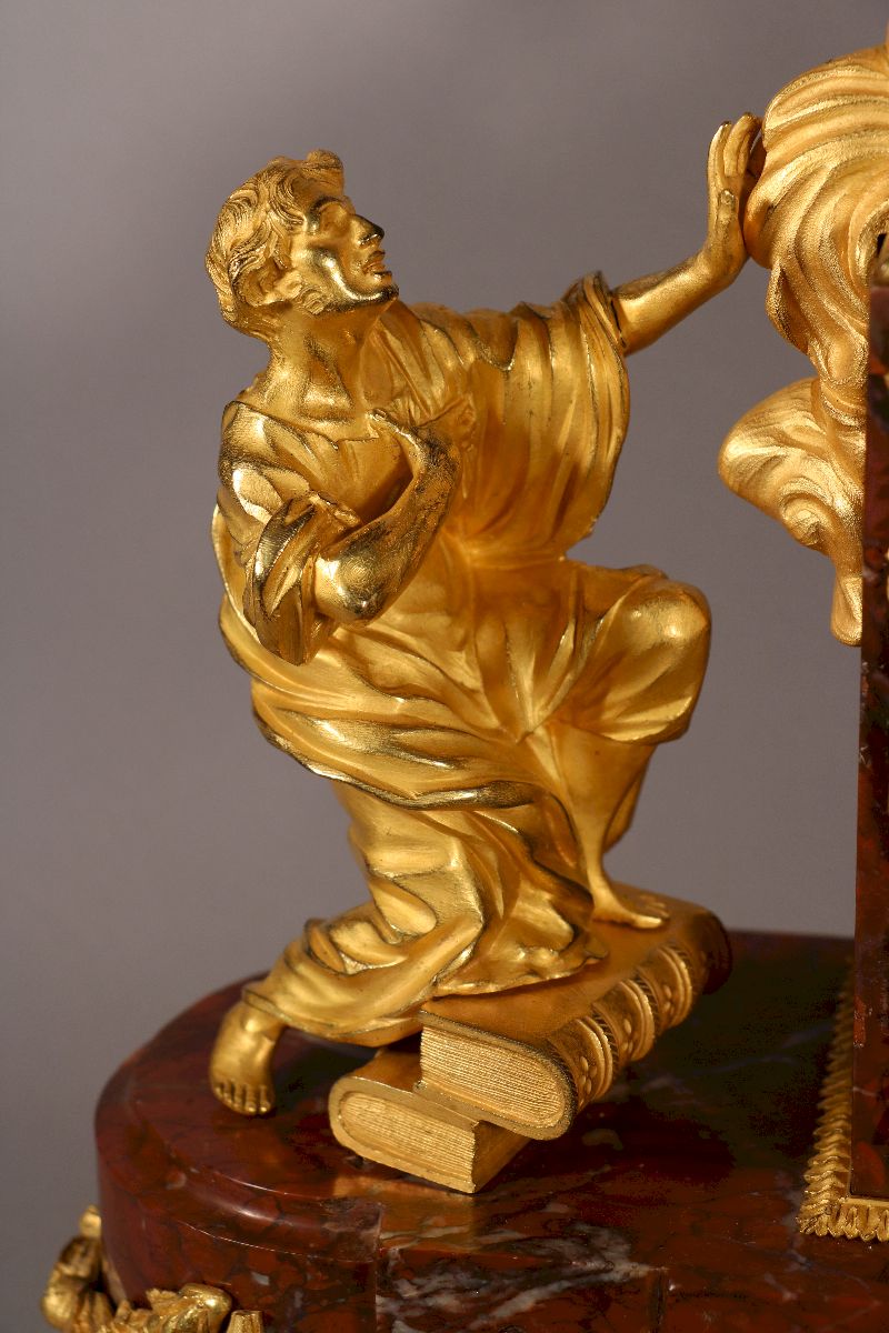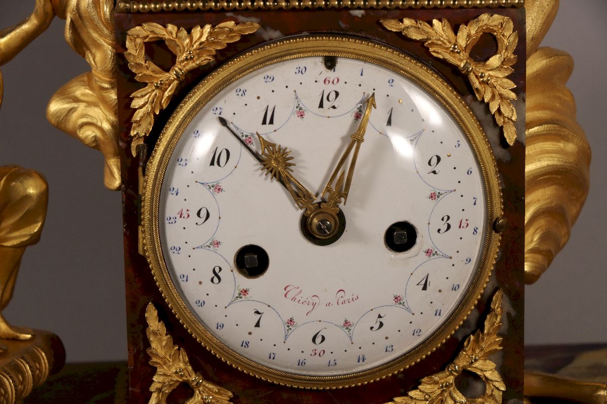 Pendule, bronze doré et marbre rouge veiné, à l’histoire de Pygmalion et de Galatée , cadran émaillé polychrome signé Thiery à Paris. Dim. (H x L x P): 38 x 37 x 13 cm. L’instant saisi pour ce modèle de pendule, est celui où le voeu de Pygmalion se réalise. Sa sculpture prend vie. Galatée s’anime sous ses yeux ébahis. Afin que le sujet soit très explicite, un buste placé sur une colonne et des instruments nécessaires au sculpteur sont disséminés sur la caisse de la pendule. Les figures ont été inspirées par le groupe d’Etienne Maurice Falconet. Très belle et riche dorure avec ses anciens brunis bien conservés. Modèle rare en très bon état de conservation.