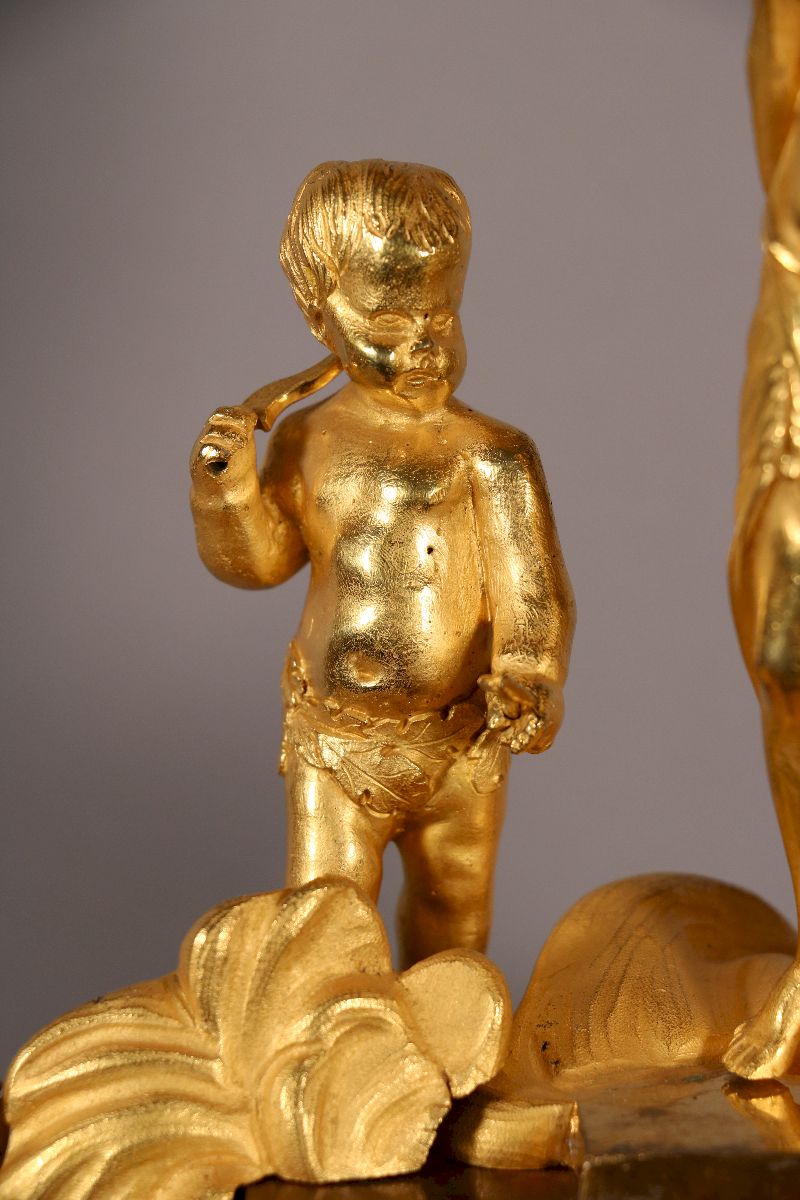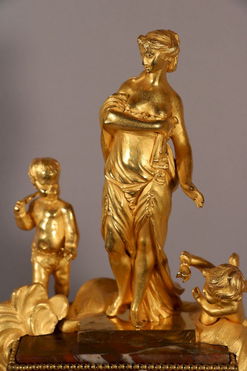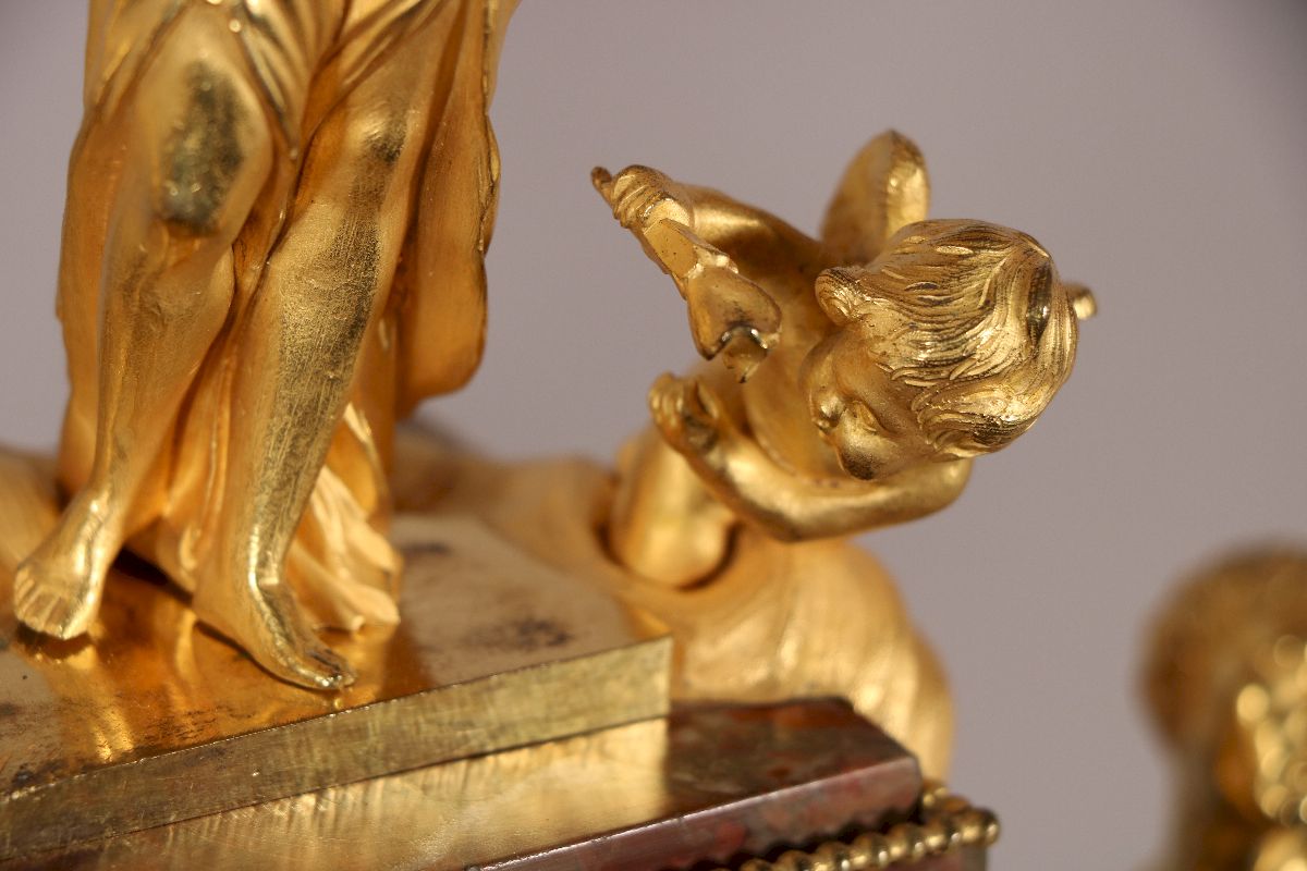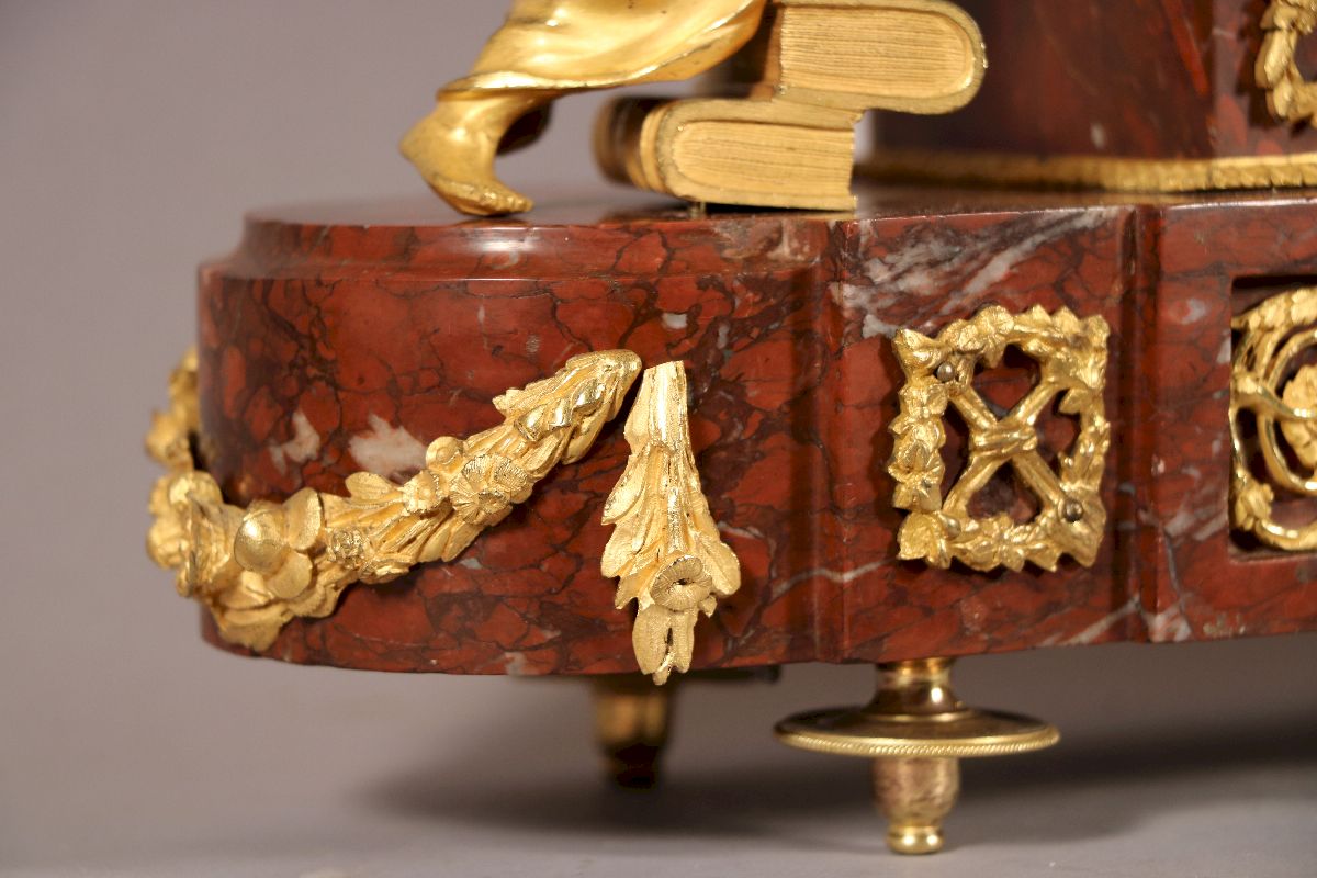Pendule, bronze doré et marbre rouge veiné, à l’histoire de Pygmalion et de Galatée , cadran émaillé polychrome signé Thiery à Paris. Dim. (H x L x P): 38 x 37 x 13 cm. L’instant saisi pour ce modèle de pendule, est celui où le voeu de Pygmalion se réalise. Sa sculpture prend vie. Galatée s’anime sous ses yeux ébahis. Afin que le sujet soit très explicite, un buste placé sur une colonne et des instruments nécessaires au sculpteur sont disséminés sur la caisse de la pendule. Les figures ont été inspirées par le groupe d’Etienne Maurice Falconet. Très belle et riche dorure avec ses anciens brunis bien conservés. Modèle rare en très bon état de conservation.