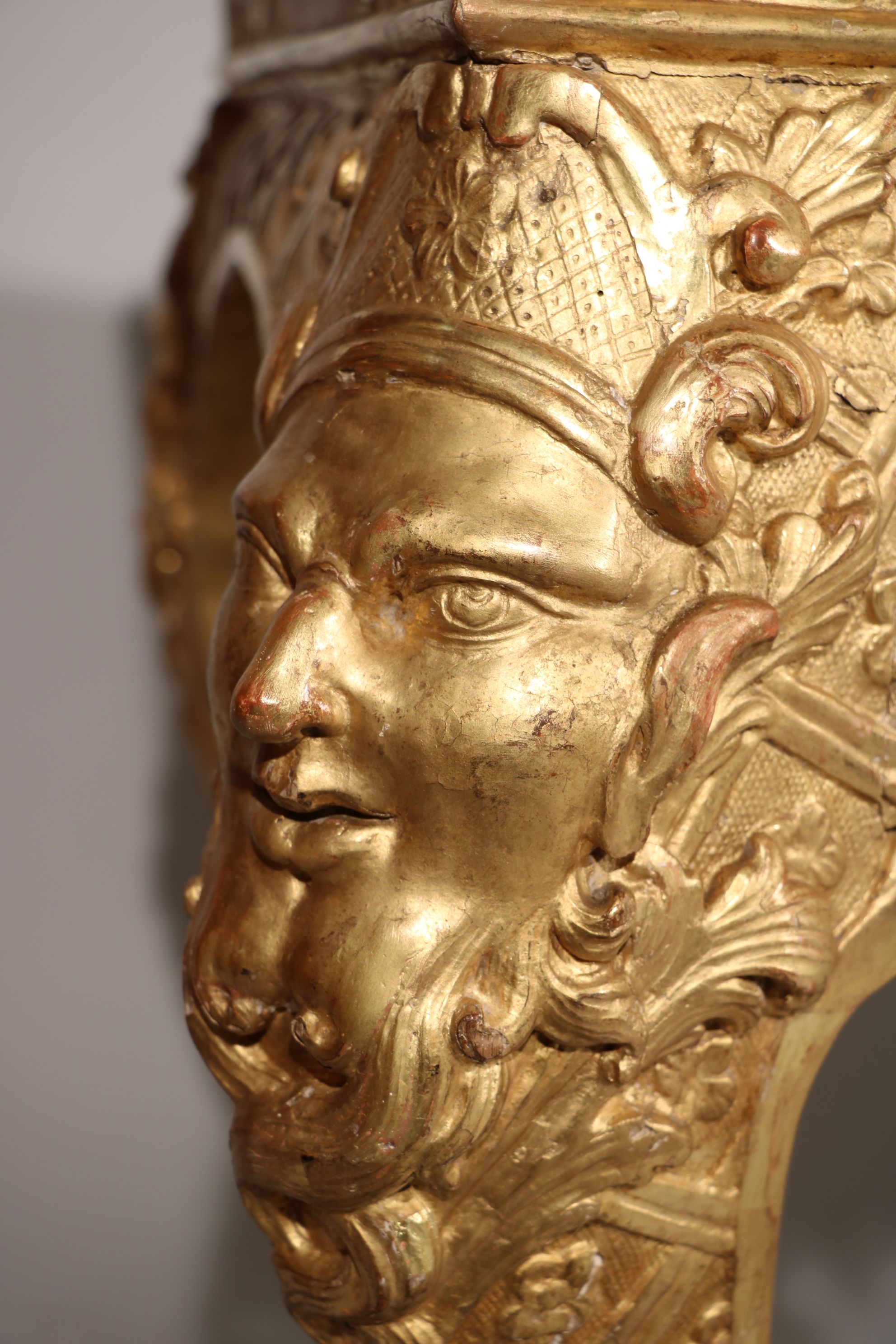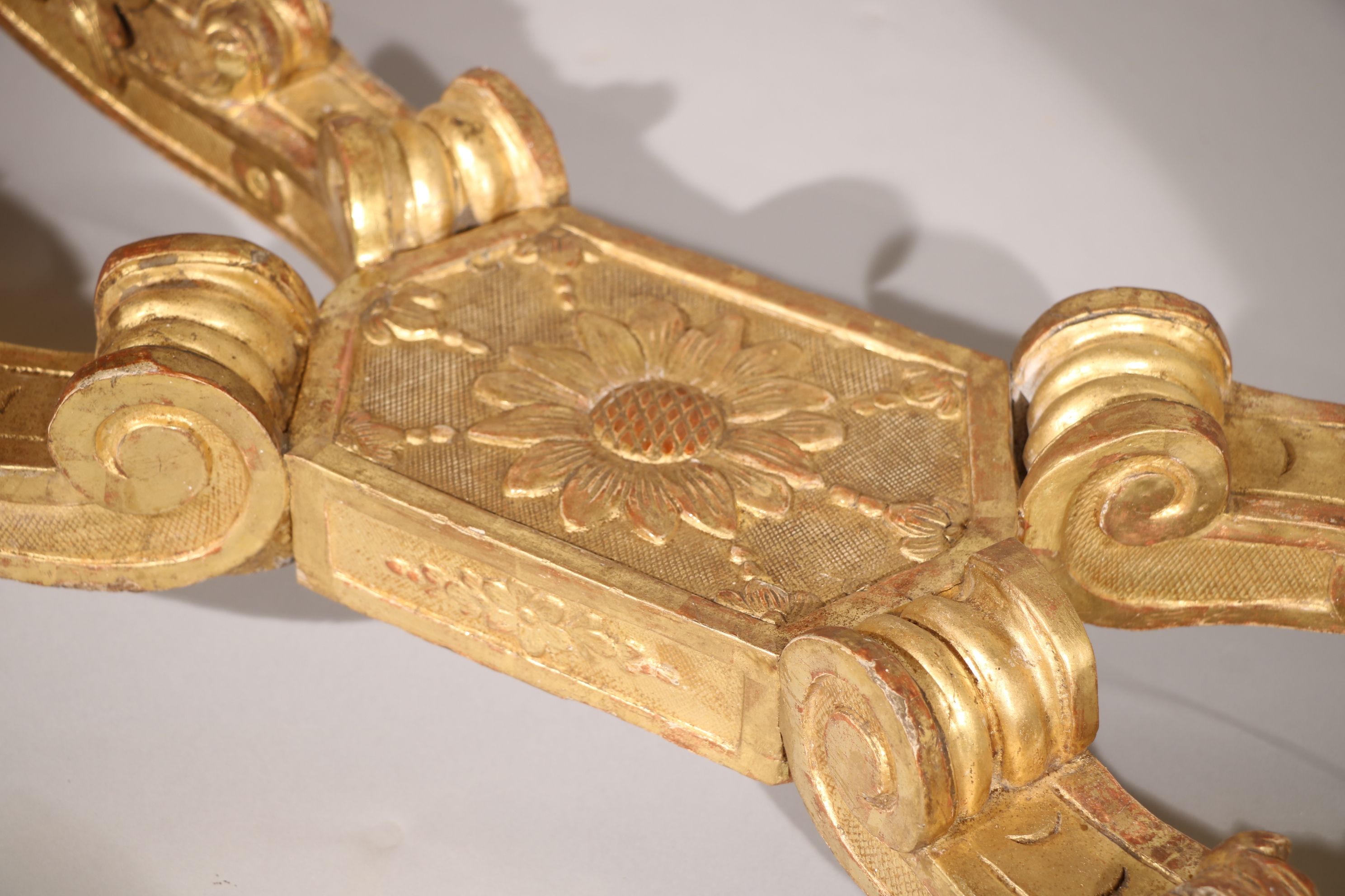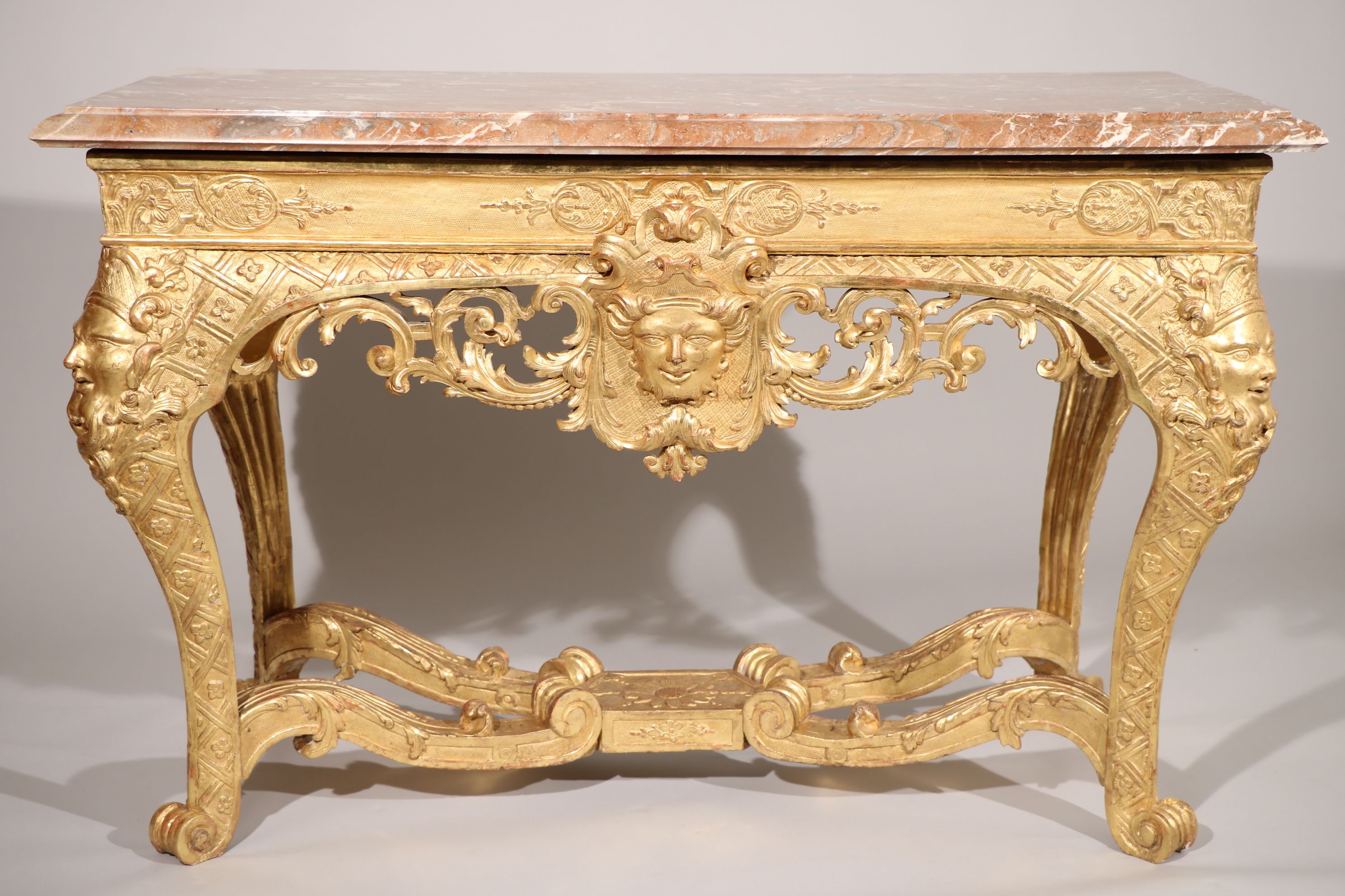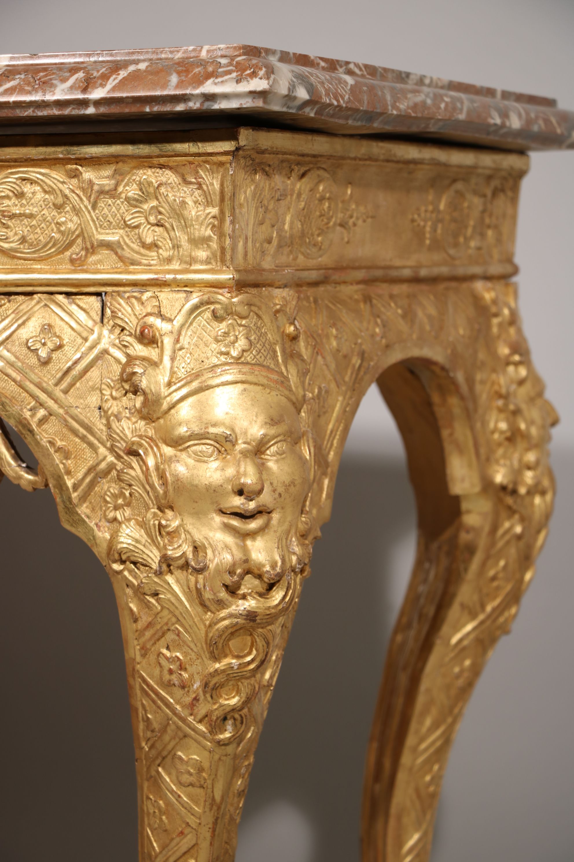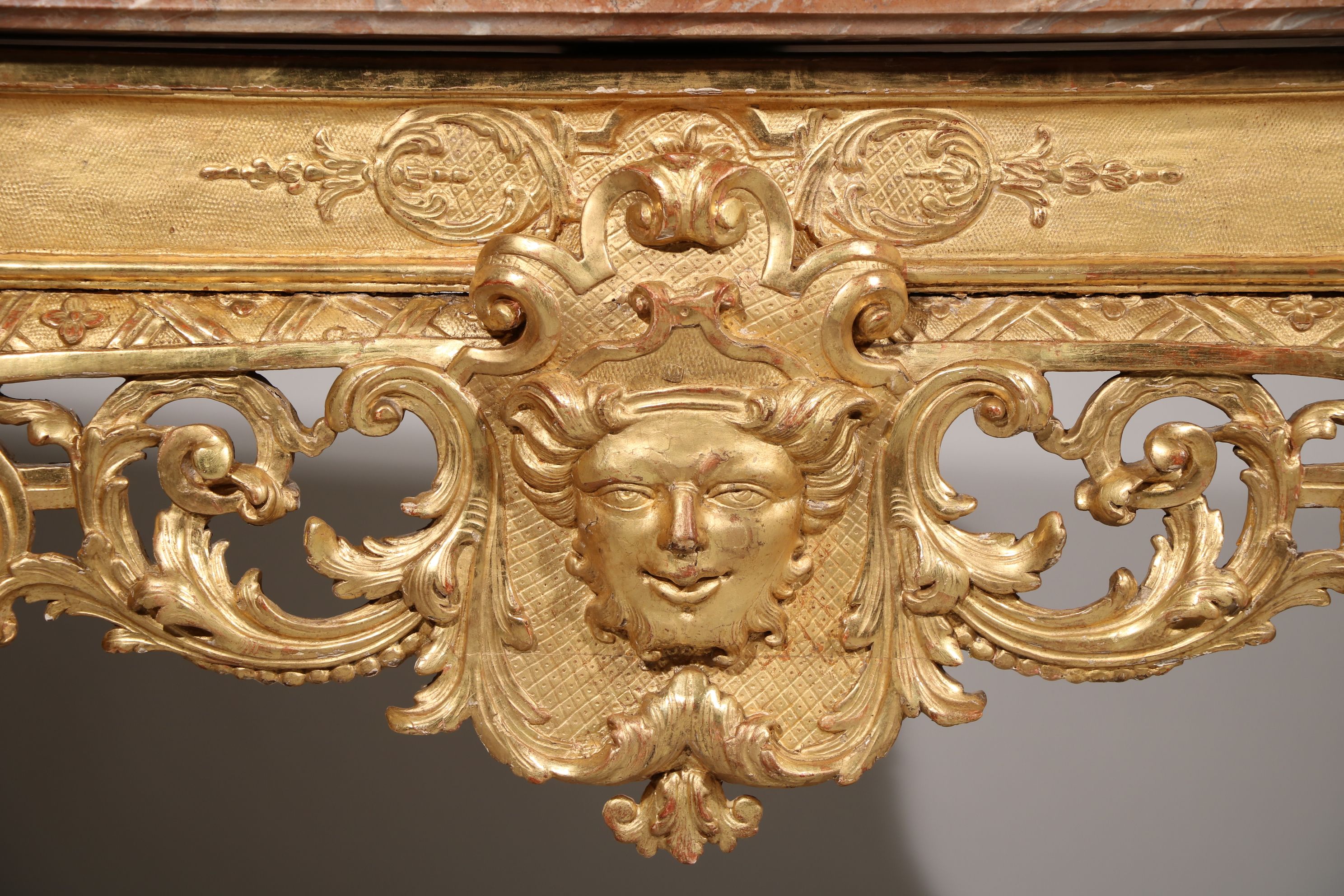 Une exceptionnelle console d’applique en bois doré et sculpté reposant sur quatre pieds cambrés, sculptés en leur chute de tête de satyre, reliés entre eux par une entretoise en console inversée sculptée de volutes, de feuillages, stylisée décorée en son centre par une fleur de tournesol. L’intérieur des pieds est cannelé. La dite console est soulignée par des motifs décoratifs se composant d’entrelacs et de fleurs quadrilobes. La façade est richement décorée par un mascaron couronné sur un fond composé d’un lambrequin encadré par des volutes et des rinceaux stylisés. Le tout est surmonté par des sculptures représentant des motifs à la Bérain. Les côtés sont sculptés de manière identique à la façade. La console est surmontée d’un marbre Rouge Belge. Epoque Louis XIV Restaurations d’usage, restaurations à la dorure, marbre d’époque XVIIIe siècle rapporté H. 82 x L. 128 x P. 61 cm Une console plus qu’identique est conservée au château de Versailles (numéro d’inventaire : V4634). Il s’agit sans doute du même sculpteur pour les deux oeuvres.