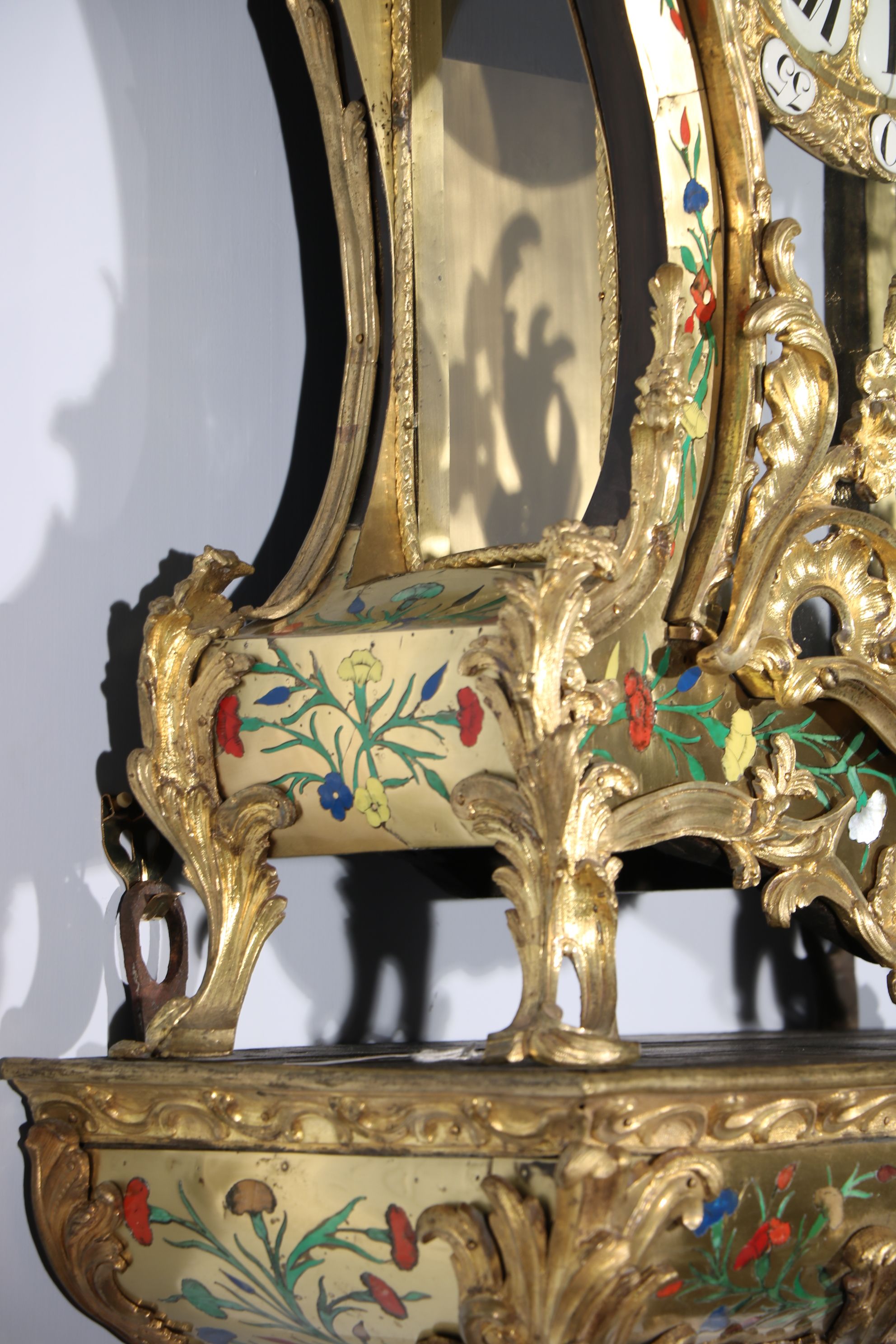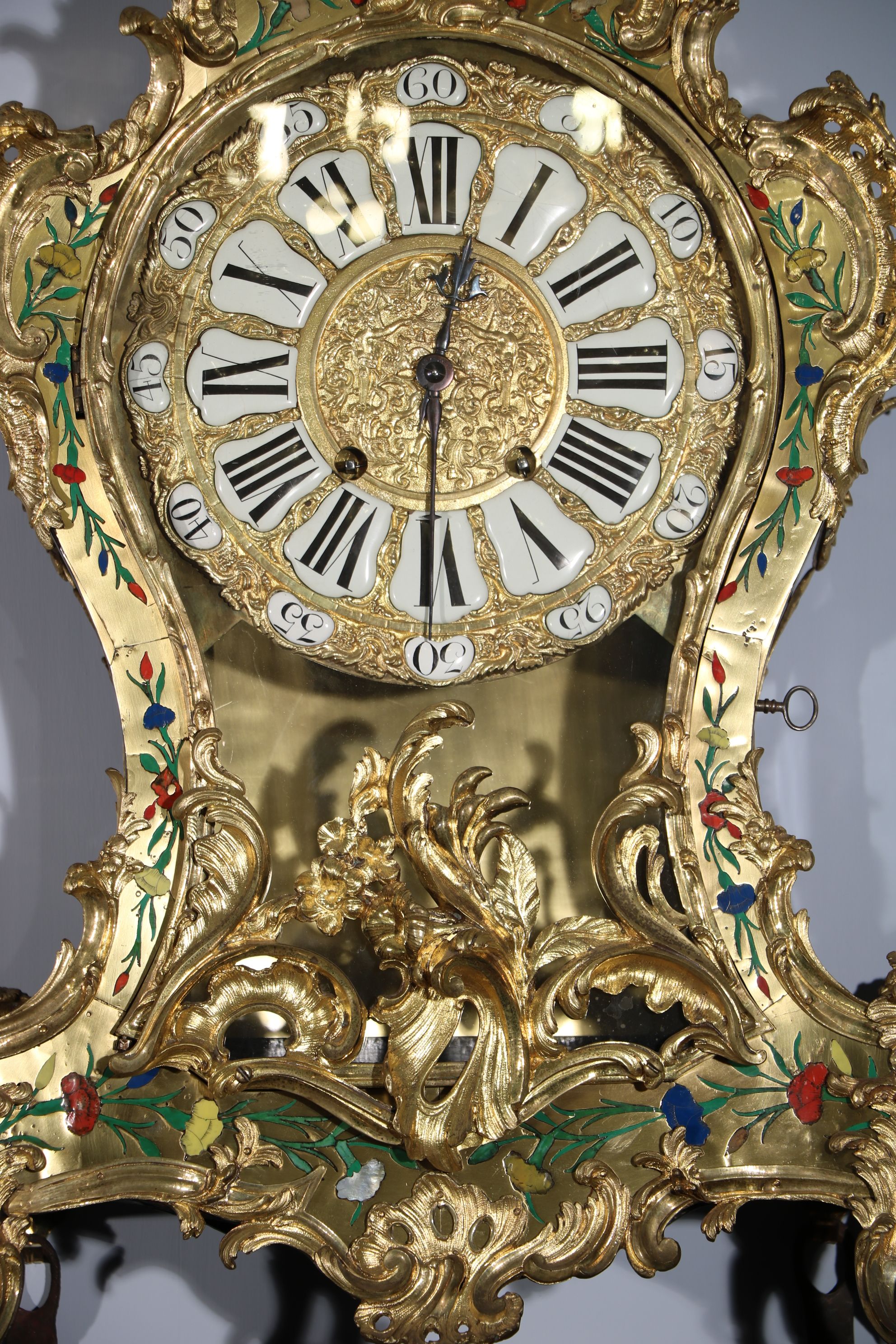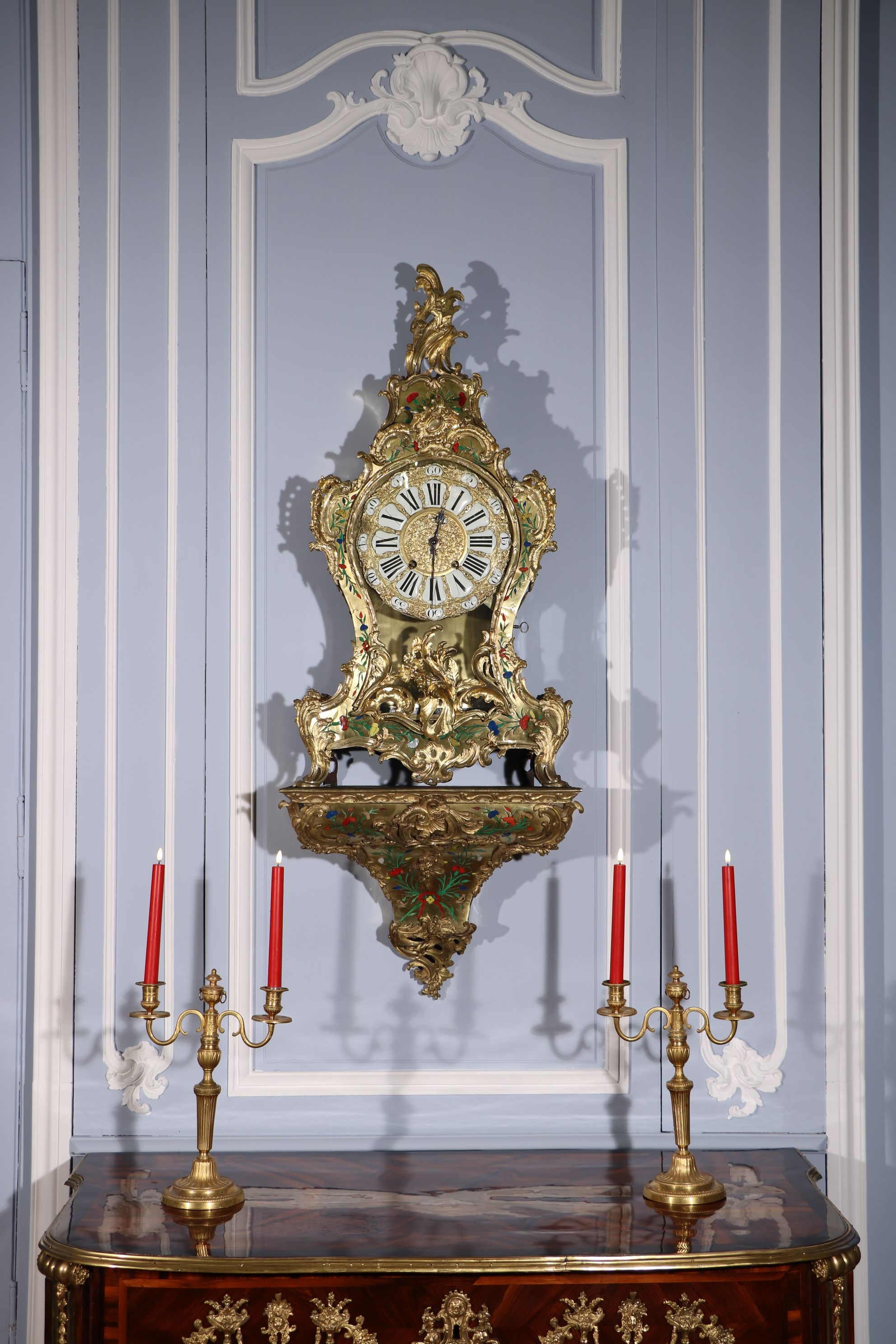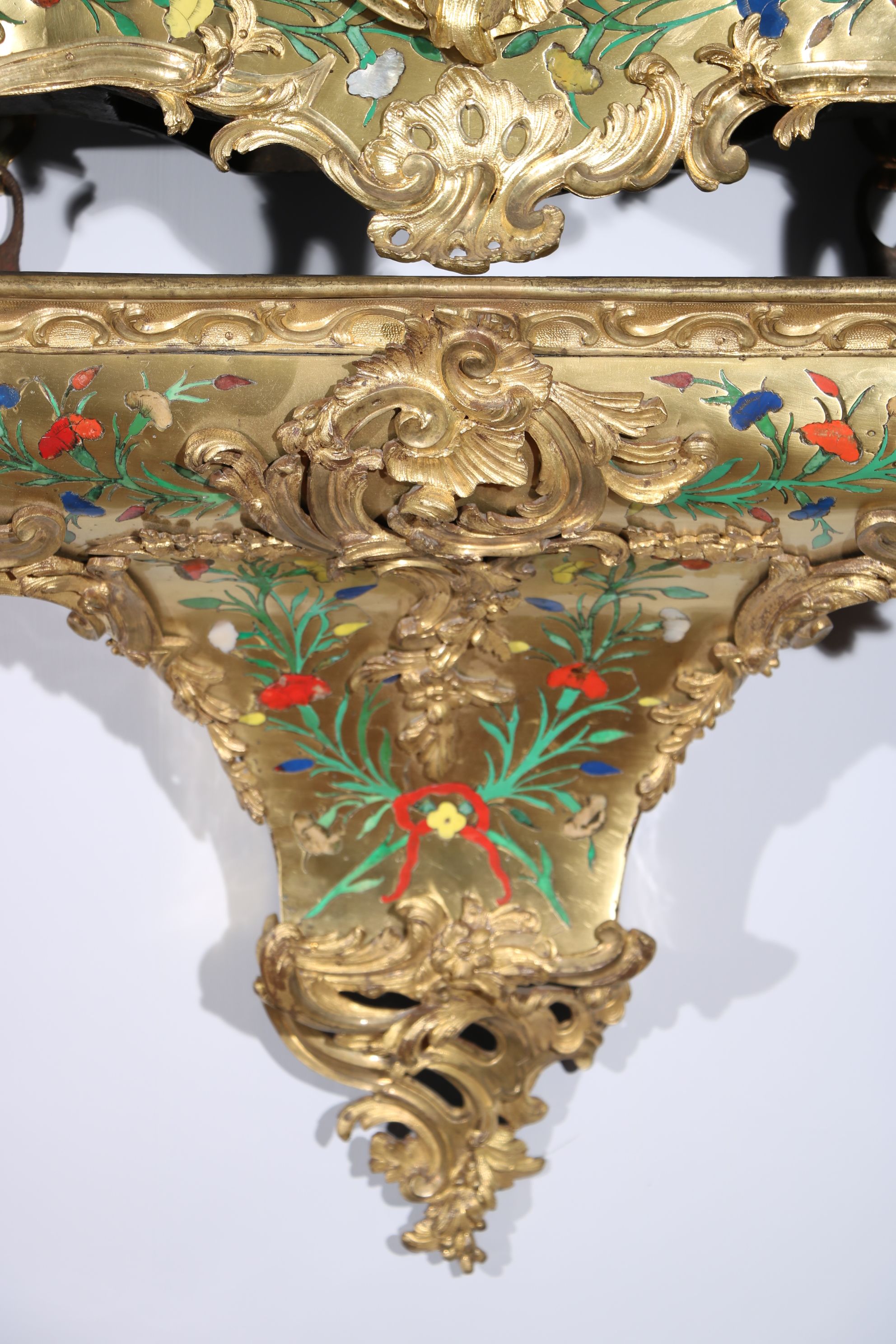 Impressionnant cartel et sa console « aux cinq couleurs » marquetés en contreparties de laiton et de cornes colorées de motifs floraux et richement garnie de bronzes dorés et ciselés à décor de Rocaille, de volutes s’entremêlant et de feuillages. Le cadran est composé d’une partie émaillée où sont inscrit les chiffres romains et d’une partie centrale en bronze doré richement décorée d’une composition présentant des animaux et des personnages. Epoque Louis XV Restaurations d’usage, échappement changé au XIXe siècle H. 145 x L. 53 x P. 26 cm