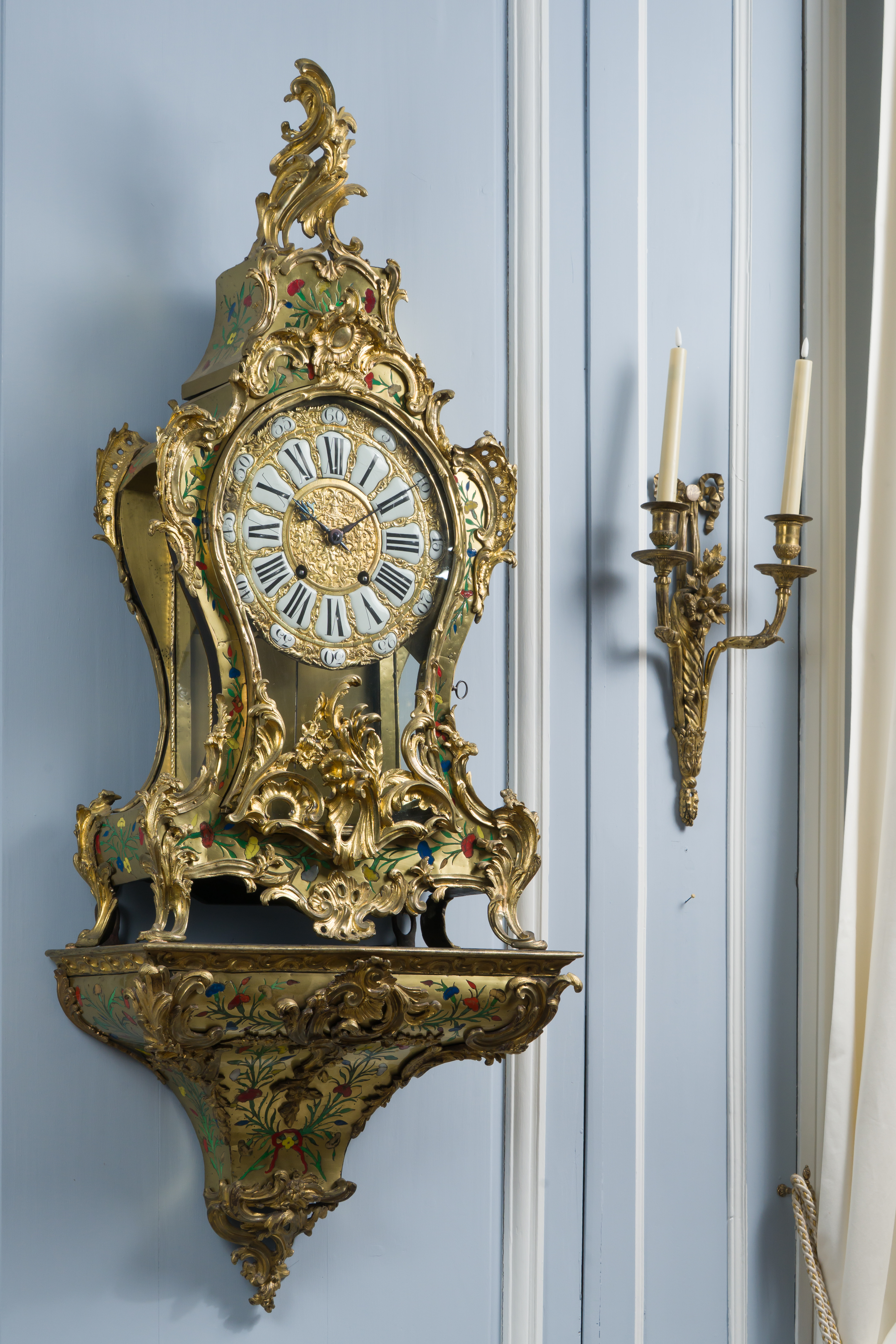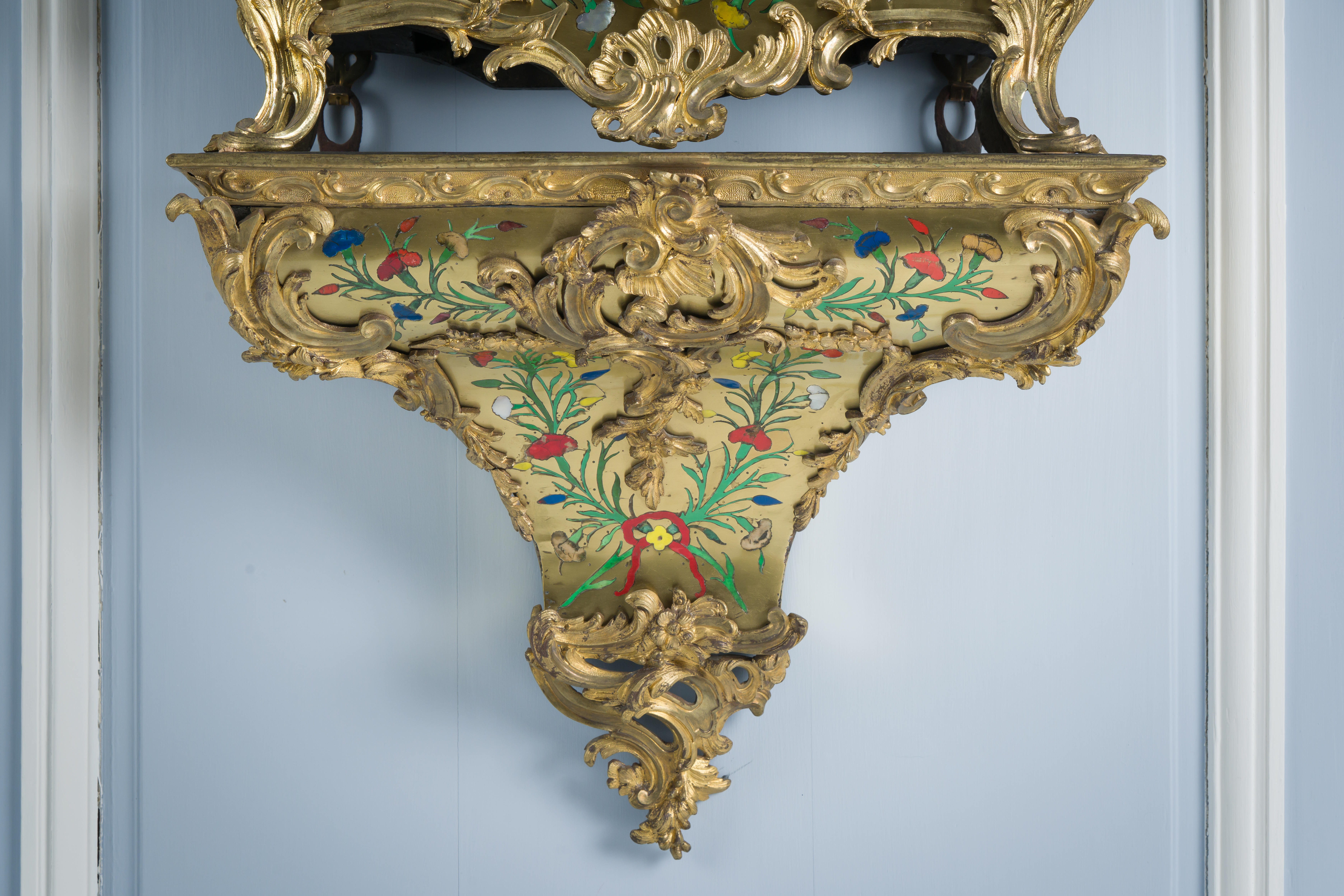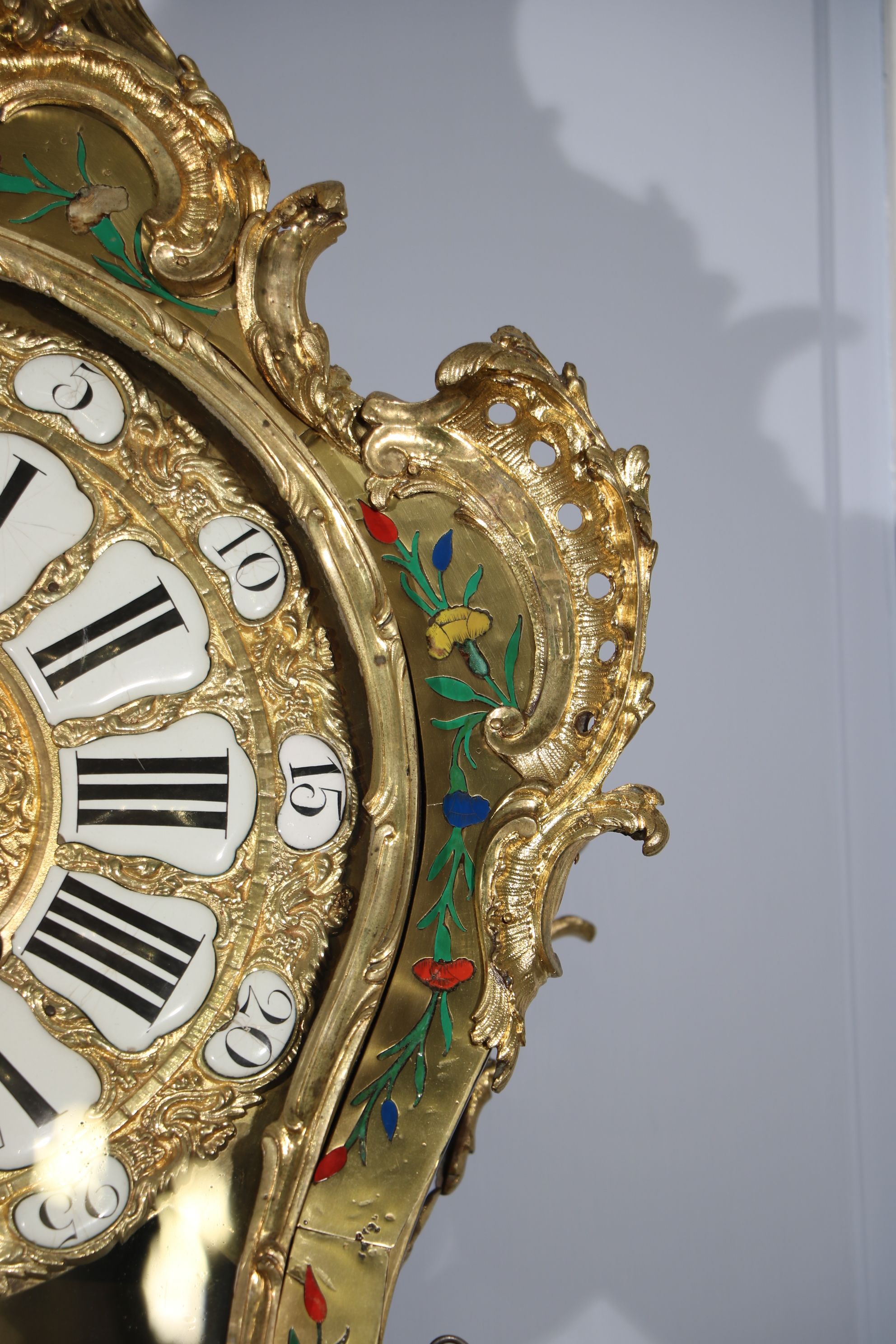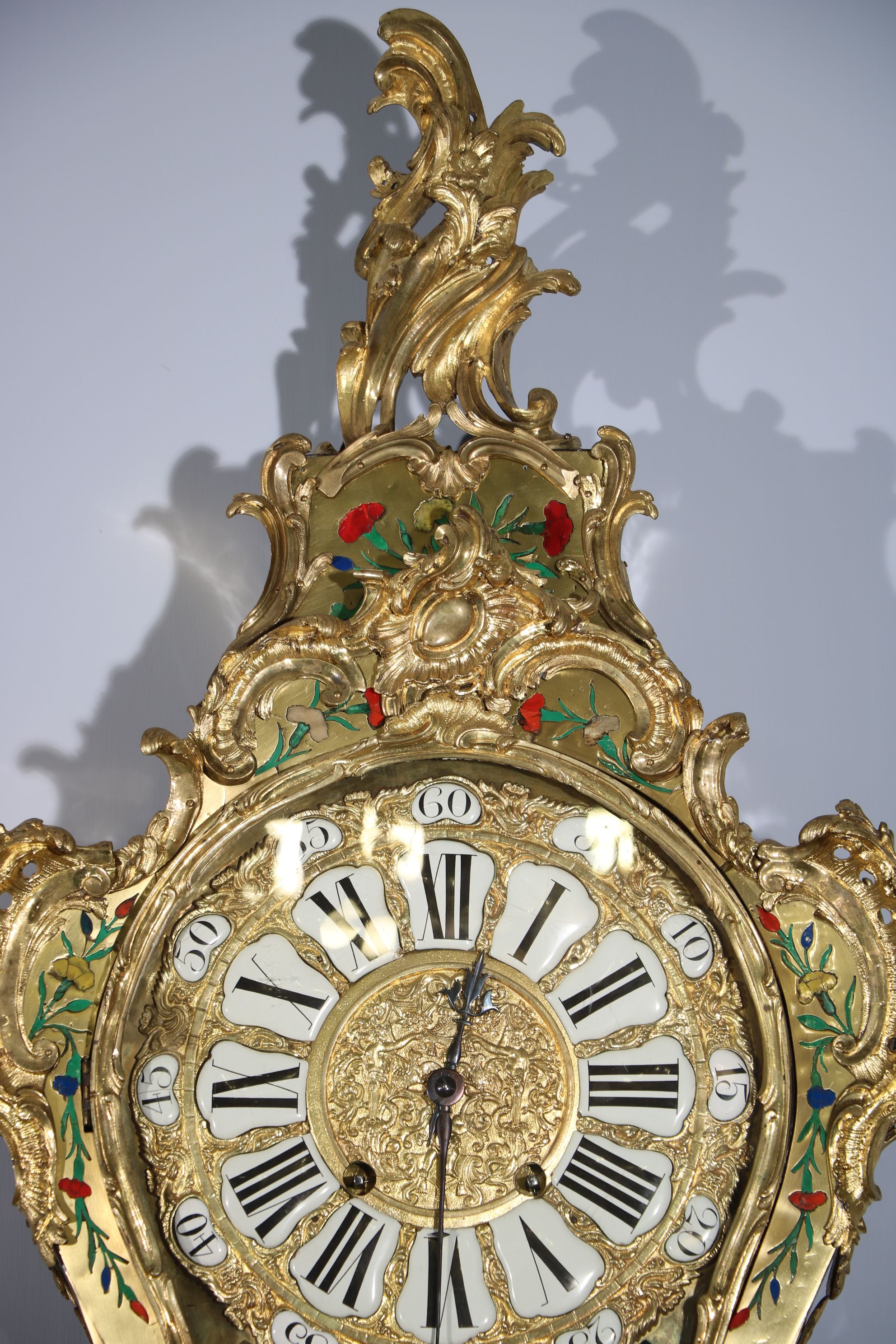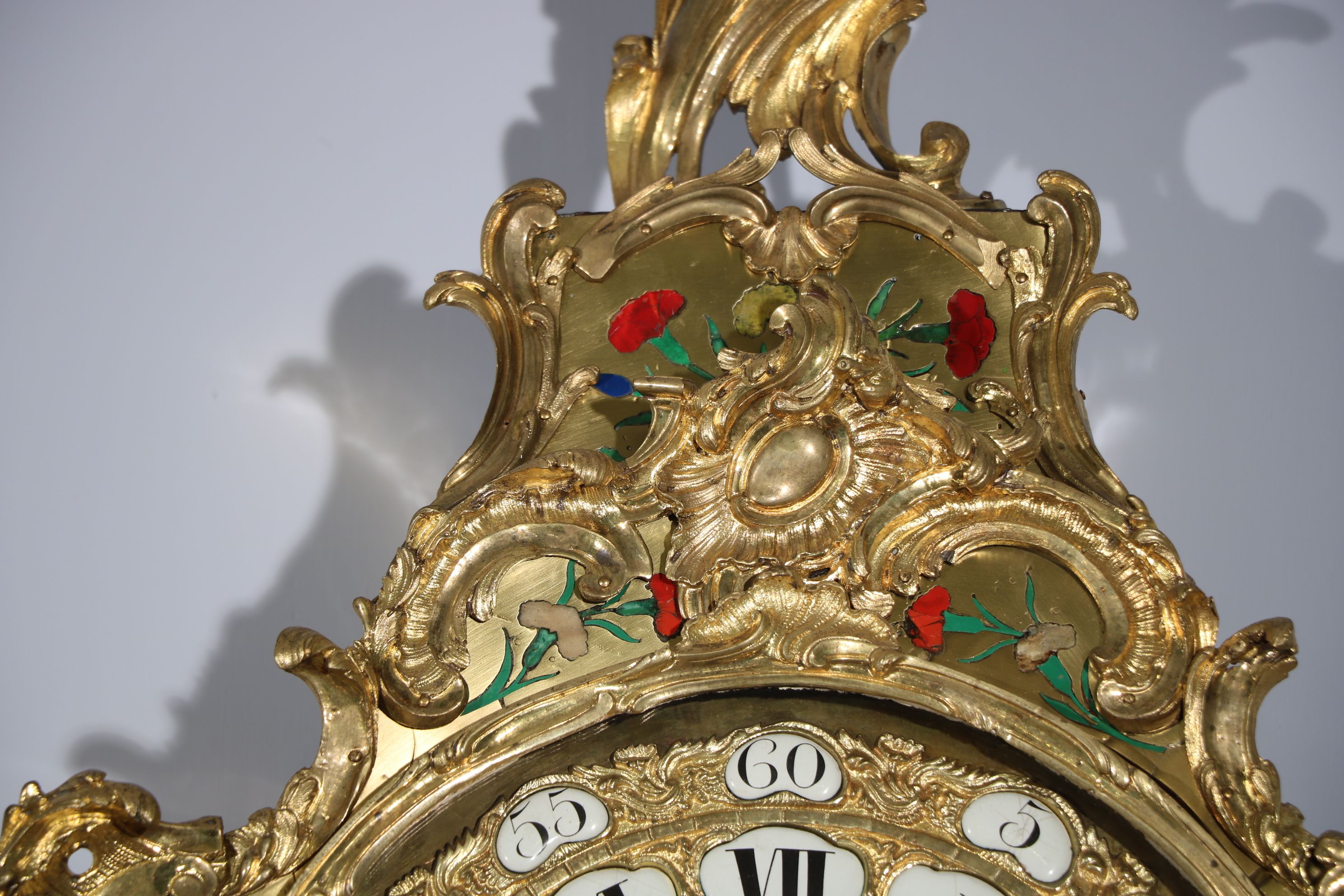 Impressionnant cartel et sa console « aux cinq couleurs » marquetés en contreparties de laiton et de cornes colorées de motifs floraux et richement garnie de bronzes dorés et ciselés à décor de Rocaille, de volutes s’entremêlant et de feuillages. Le cadran est composé d’une partie émaillée où sont inscrit les chiffres romains et d’une partie centrale en bronze doré richement décorée d’une composition présentant des animaux et des personnages. Epoque Louis XV Restaurations d’usage, échappement changé au XIXe siècle H. 145 x L. 53 x P. 26 cm