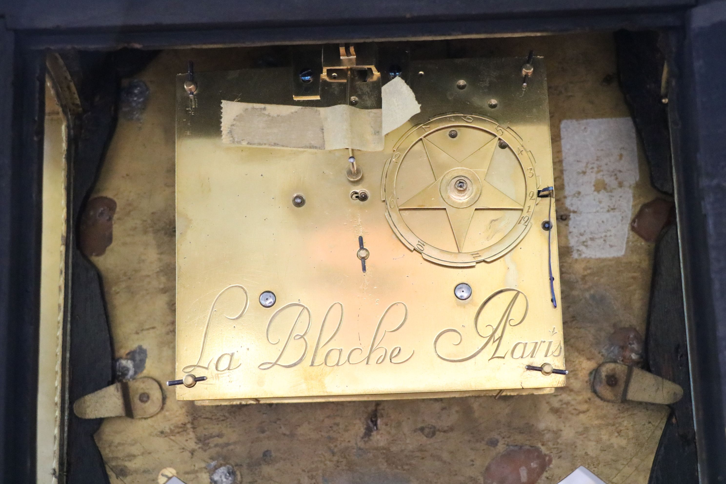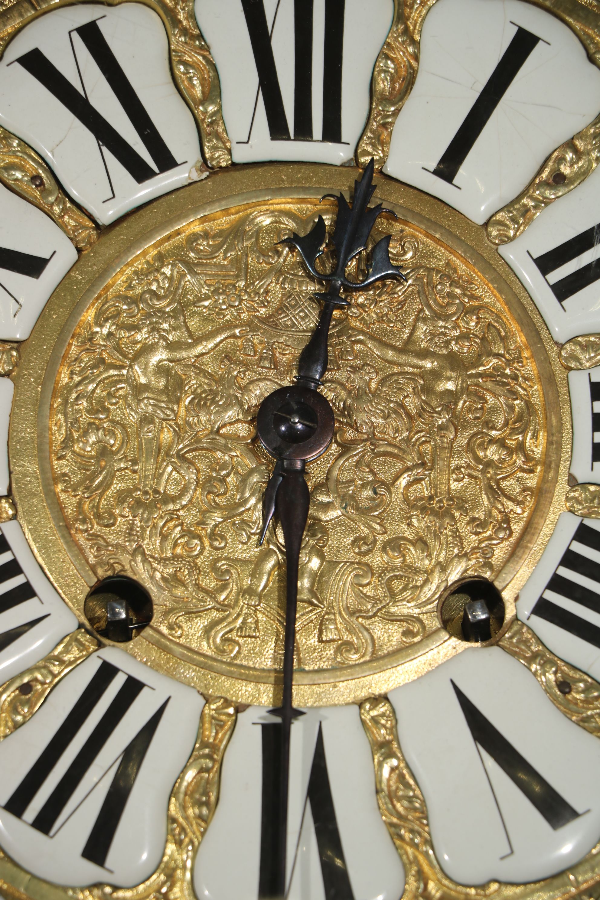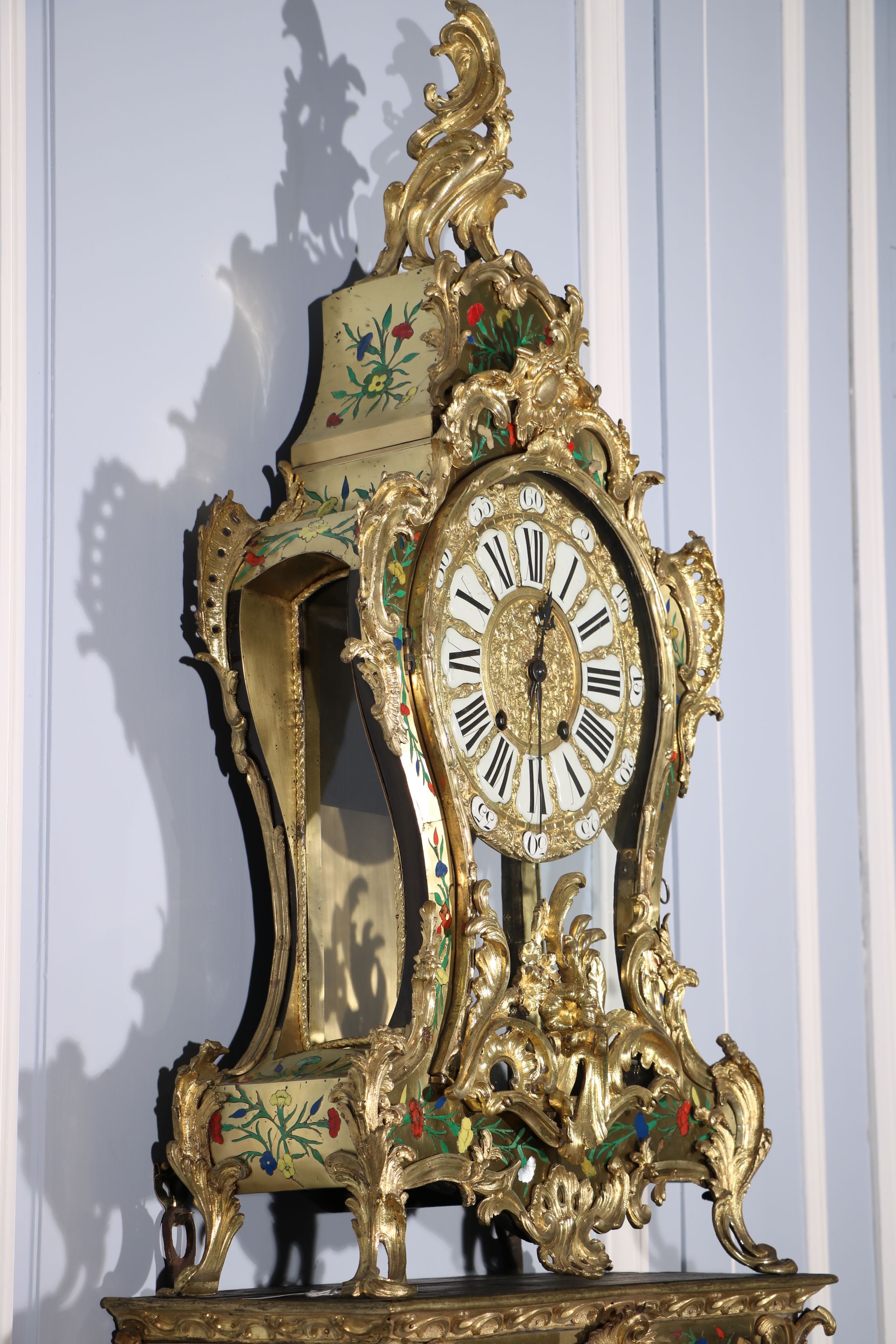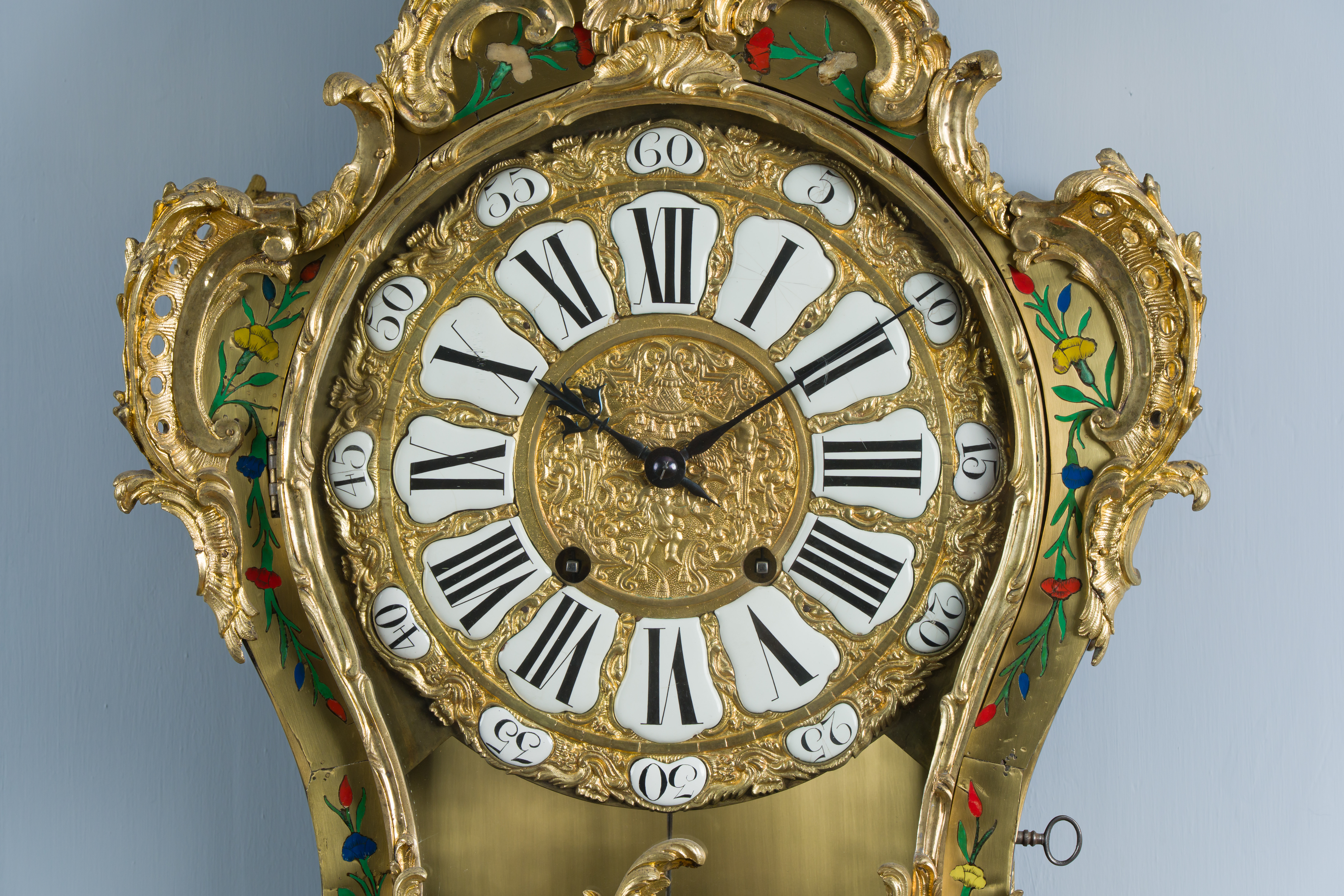 Impressionnant cartel et sa console « aux cinq couleurs » marquetés en contreparties de laiton et de cornes colorées de motifs floraux et richement garnie de bronzes dorés et ciselés à décor de Rocaille, de volutes s’entremêlant et de feuillages. Le cadran est composé d’une partie émaillée où sont inscrit les chiffres romains et d’une partie centrale en bronze doré richement décorée d’une composition présentant des animaux et des personnages. Epoque Louis XV Restaurations d’usage, échappement changé au XIXe siècle H. 145 x L. 53 x P. 26 cm