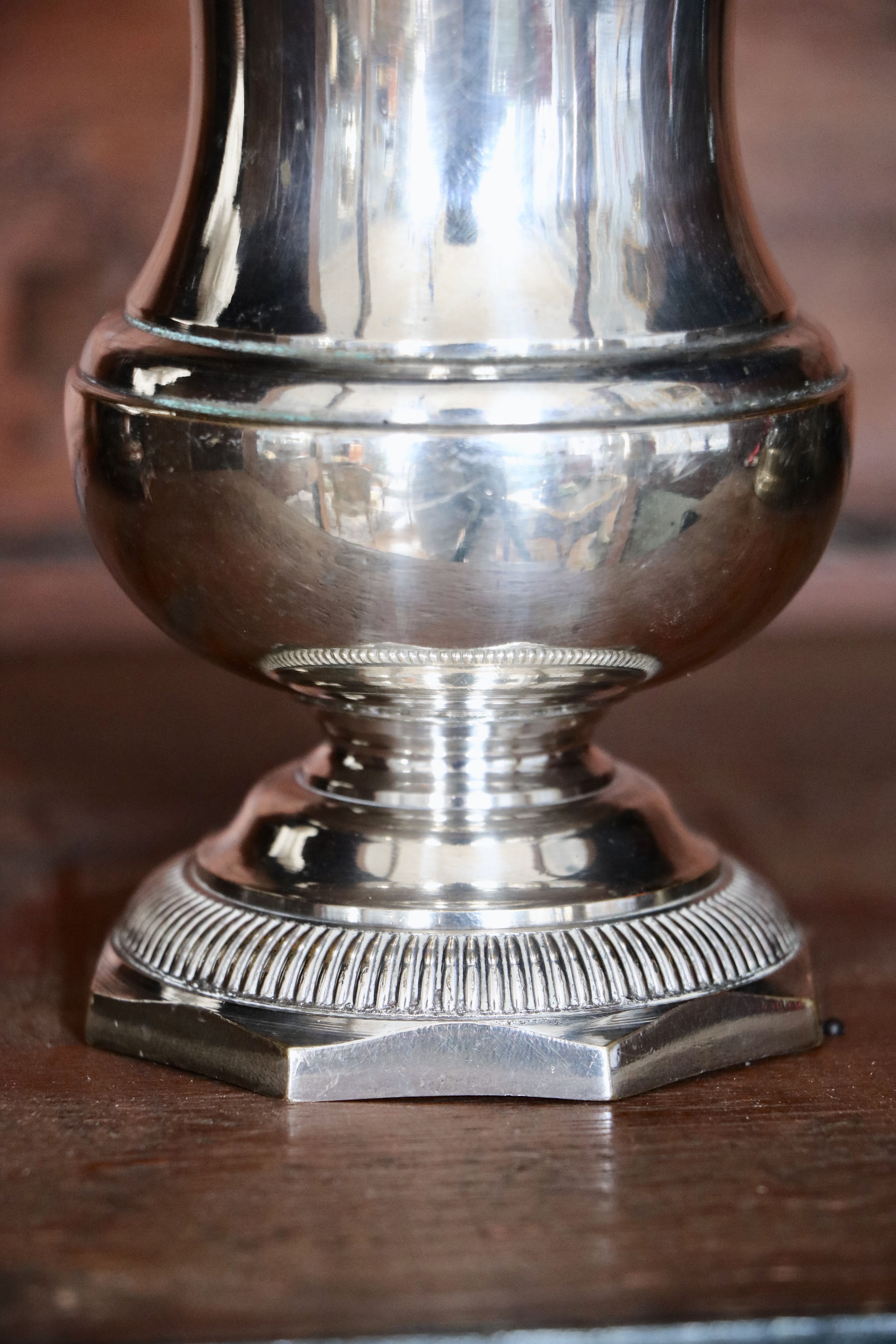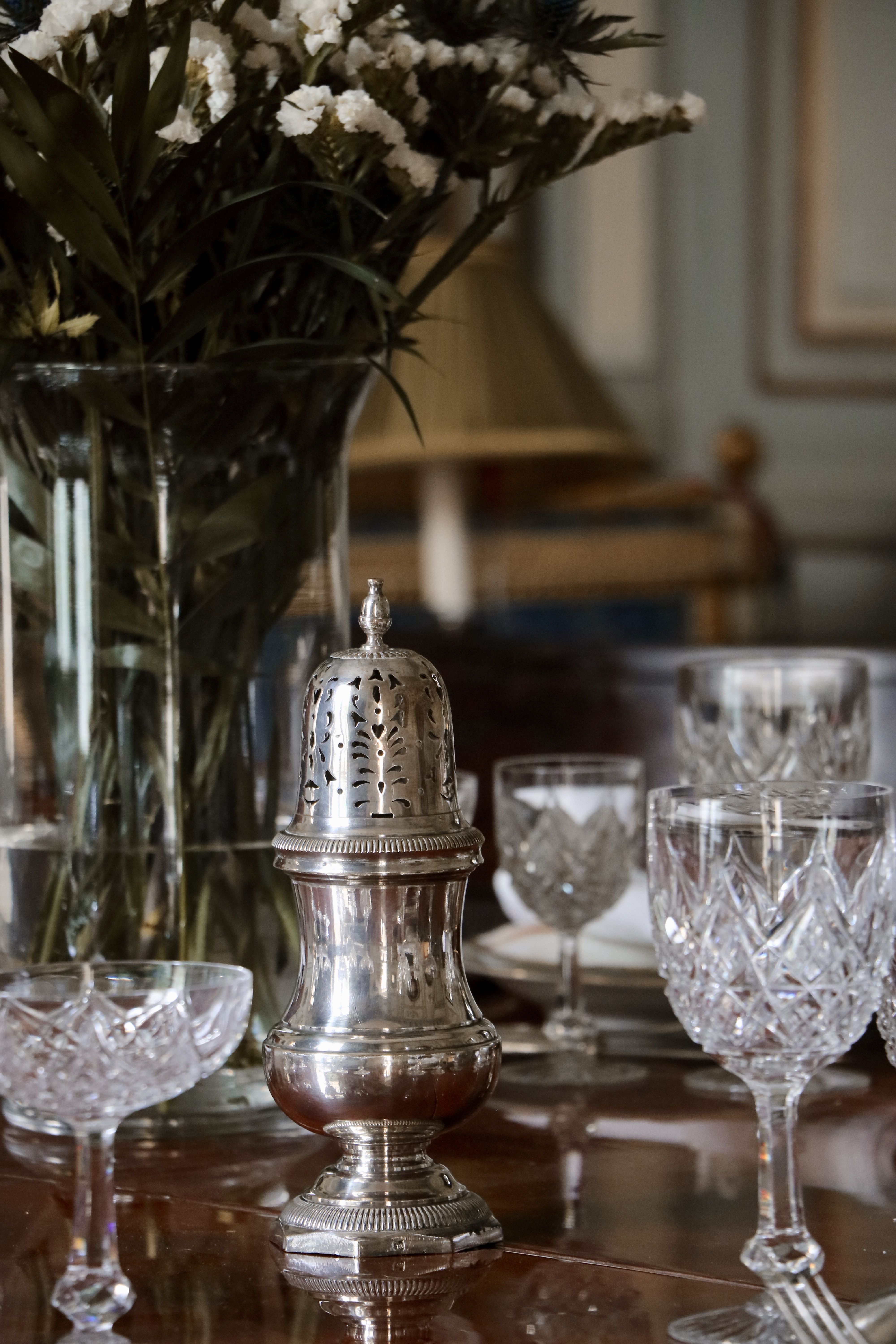 Saupoudreuse en métal argenté uni en forme de balustre. Elle repose sur un piédouche et est cerclée de joncs gondronés. Le couvercle possède un décor ajouré, surmonté d’un fretel en forme de pomme de pin. Époque XVIIIe siècle Restauration d’usage H. 24 x D. 18,5 (de la base) cm