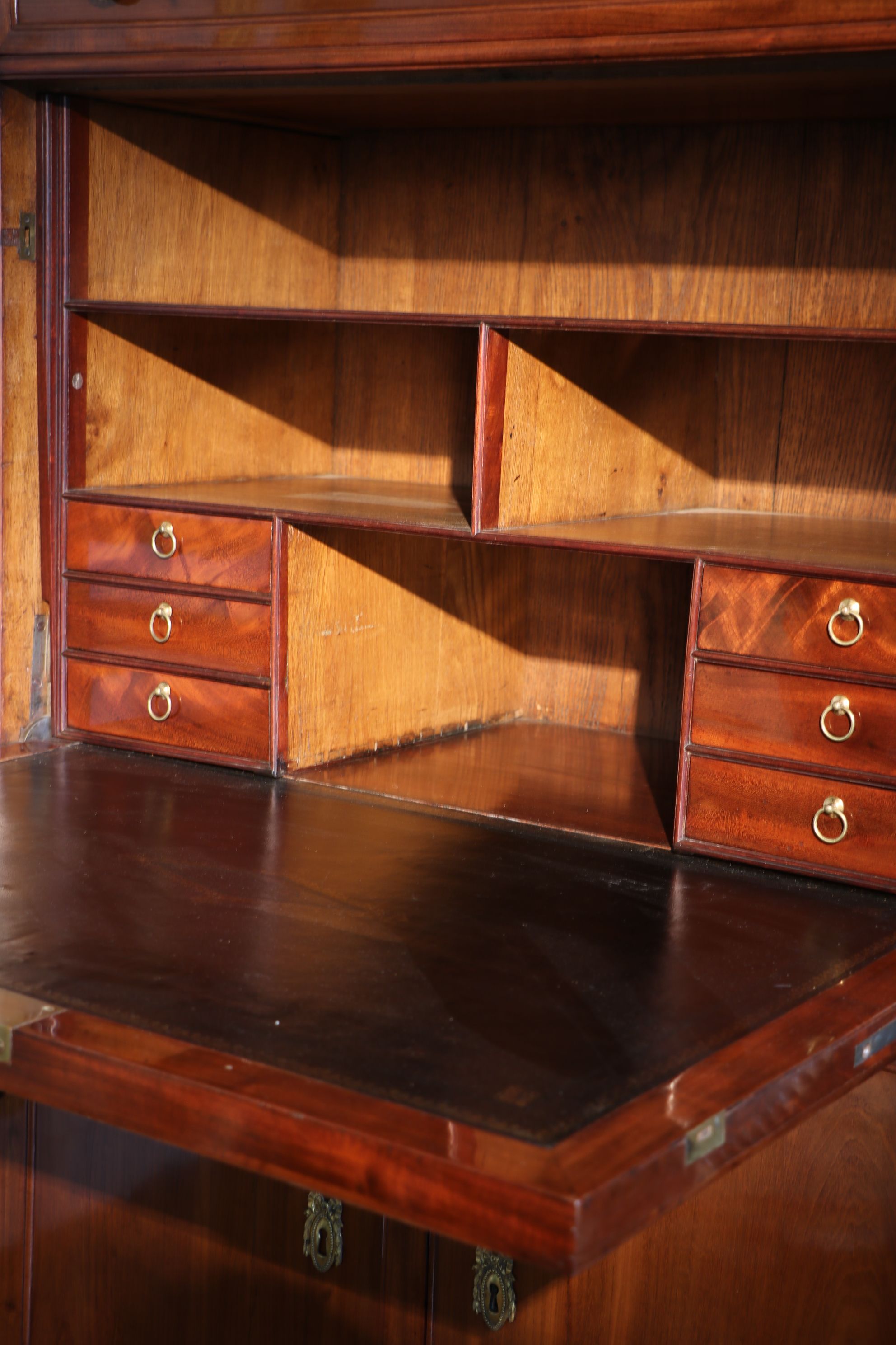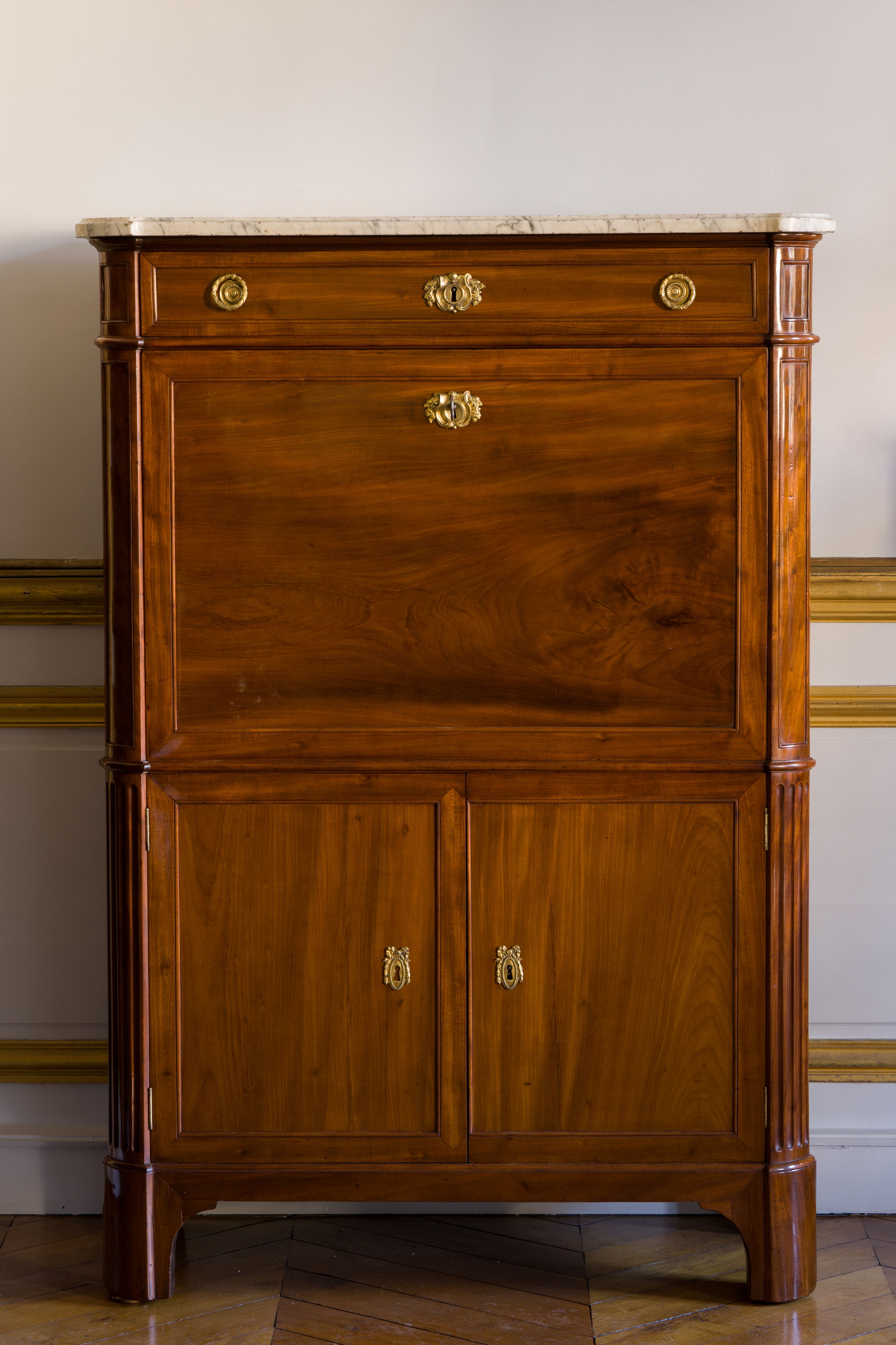 Secrétaire à abattant en acajou et placage d’acajou mouluré. Le secrétaire ouvre en partie haute par un large tiroir et par un abattant laissant découvrir une écritoire, quatre casiers et six petits tiroirs. La partie basse ouvre par deux vantaux et laisse découvrir deux étagères. Le secrétaire repose sur quatre petits pieds surmontés par des montants galbés et ornés de cannelures. Le secrétaire est surmonté d’un dessus en marbre blanc de Carrare mouluré. Il est garni de bronzes dorés et ciselés en entrées de serrures et en anneaux de tirage. Estampillé Jean-Henri Riesener Epoque Louis XVI Restaurations d’usage H. 141 x L. 97 x P. 40,5 cm