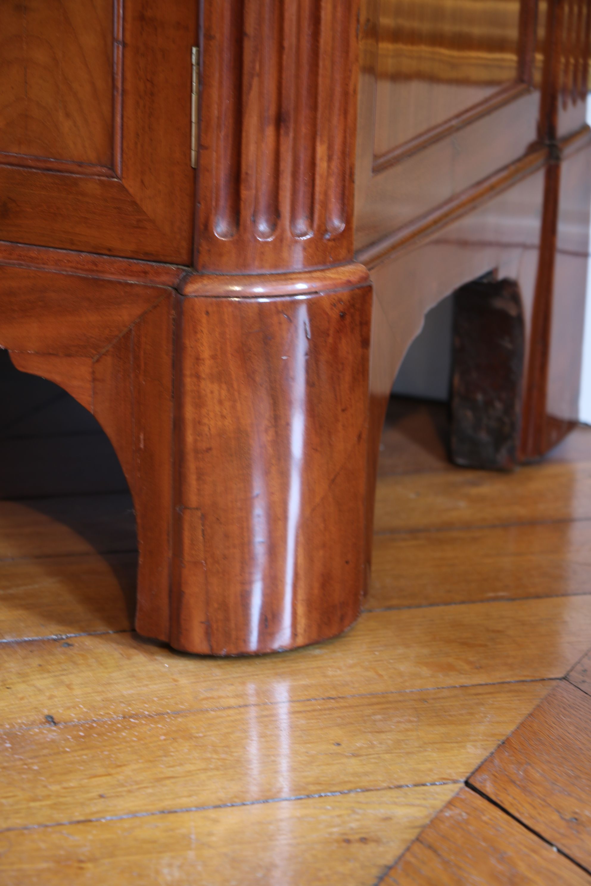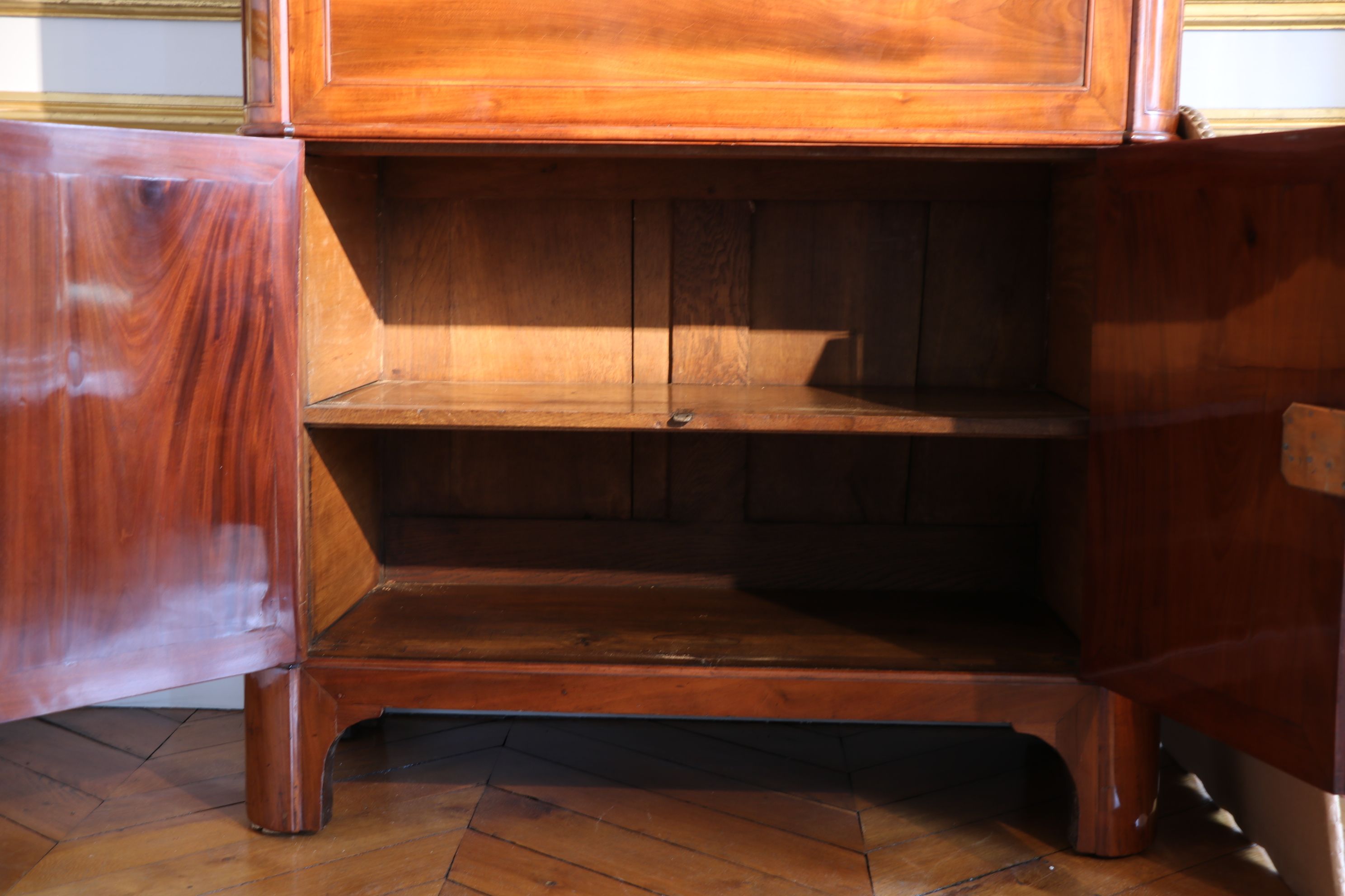 Le secrétaire que nous présentons aujourd’hui porte la marque du célèbre ébéniste Jean-Henri Riesener (1734-1806). C’est notamment son parcours qu’il faut mettre en lumière pour comprendre quelle place ont eue ses meubles au sein de l’évolution de la production d’art décoratif français. Ce dernier est d’origine allemande et vient s’installer dans sa jeunesse à Paris. Il entre alors dans un des plus prestigieux ateliers de la capitale : celui de Jean-François Oeben. Sa carrière décolle : il devient un des principaux collaborateurs de l’atelier, puis prend sa direction à la mort de son fondateur en 1763. Par la suite, il épouse la veuve d’Oeben, Françoise Marguerite, et obtient enfin ses propres lettres de maîtrise : sa réussite est totale. Véritable sacre, il devient même fournisseur attitré de la cour pendant plus de dix ans. Ebéniste au succès considérable, il livre les châteaux royaux, les demeures princières, etc. Pierre Kjellberg le nomme « le maître incontesté du meuble Louis XVI ». Ses meubles témoignent tous d’une qualité de fabrication exceptionnelle. La diversité de son oeuvre est tout à fait remarquable également. Il produit des commodes et des secrétaires abondamment décorés. Il développe de complexes marqueteries et d’élégants bronzes. D’autre part, sa production compte aussi des meubles plus légers et à la sobriété étonnante, tel que le prouve notre secrétaire. Il met alors en avant, dans ce cas, l’acajou dans de discrètes mais élégantes lignes moulurées. Comme des peintures, l’abattant et les vantaux du secrétaire permettent une mise en valeur du matériau de prédilection de l’ébéniste, les bois précieux. Il s’agit ici de toute l’esthétique et de l’élégance du style Louis XVI, dans l’épuration du décor.