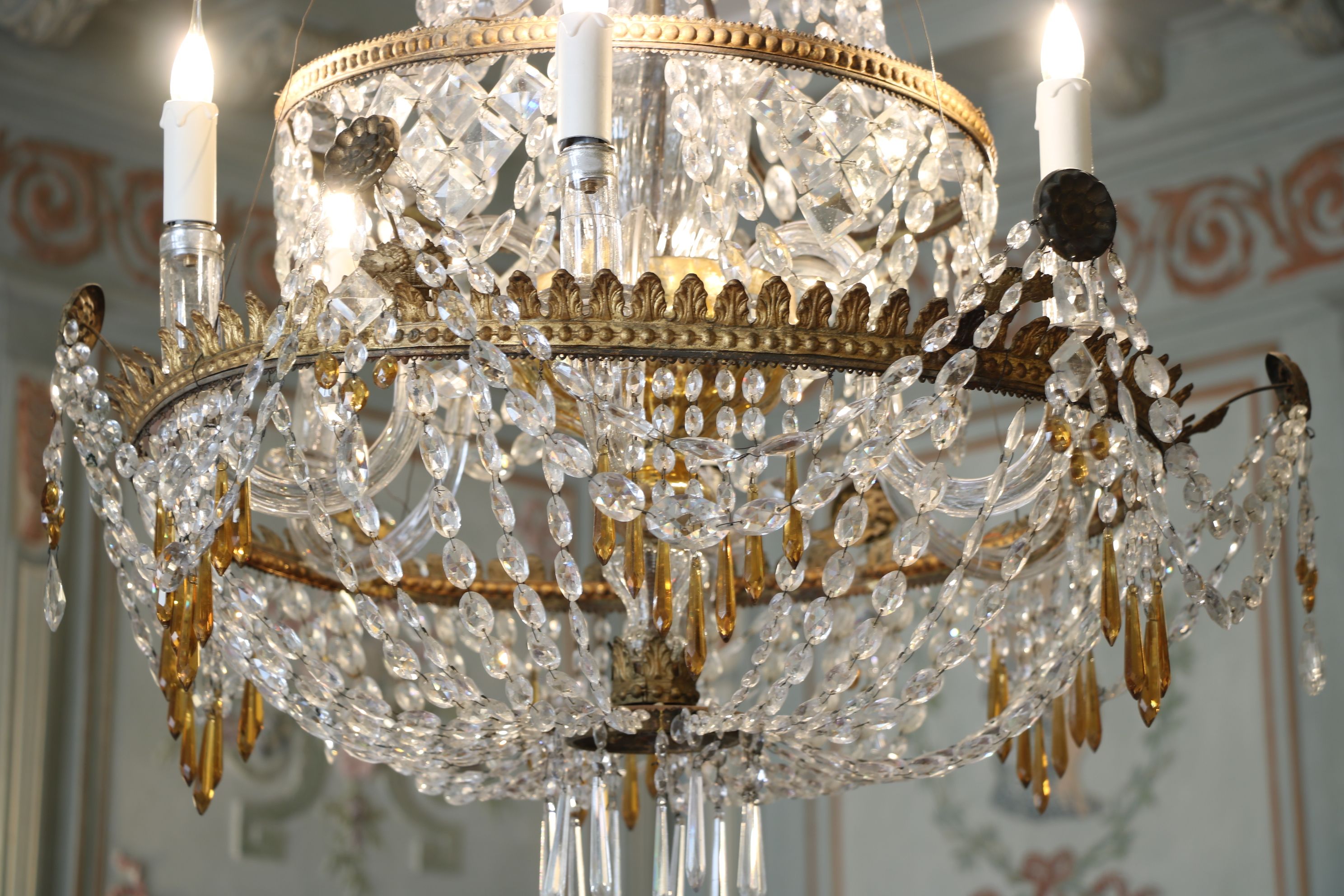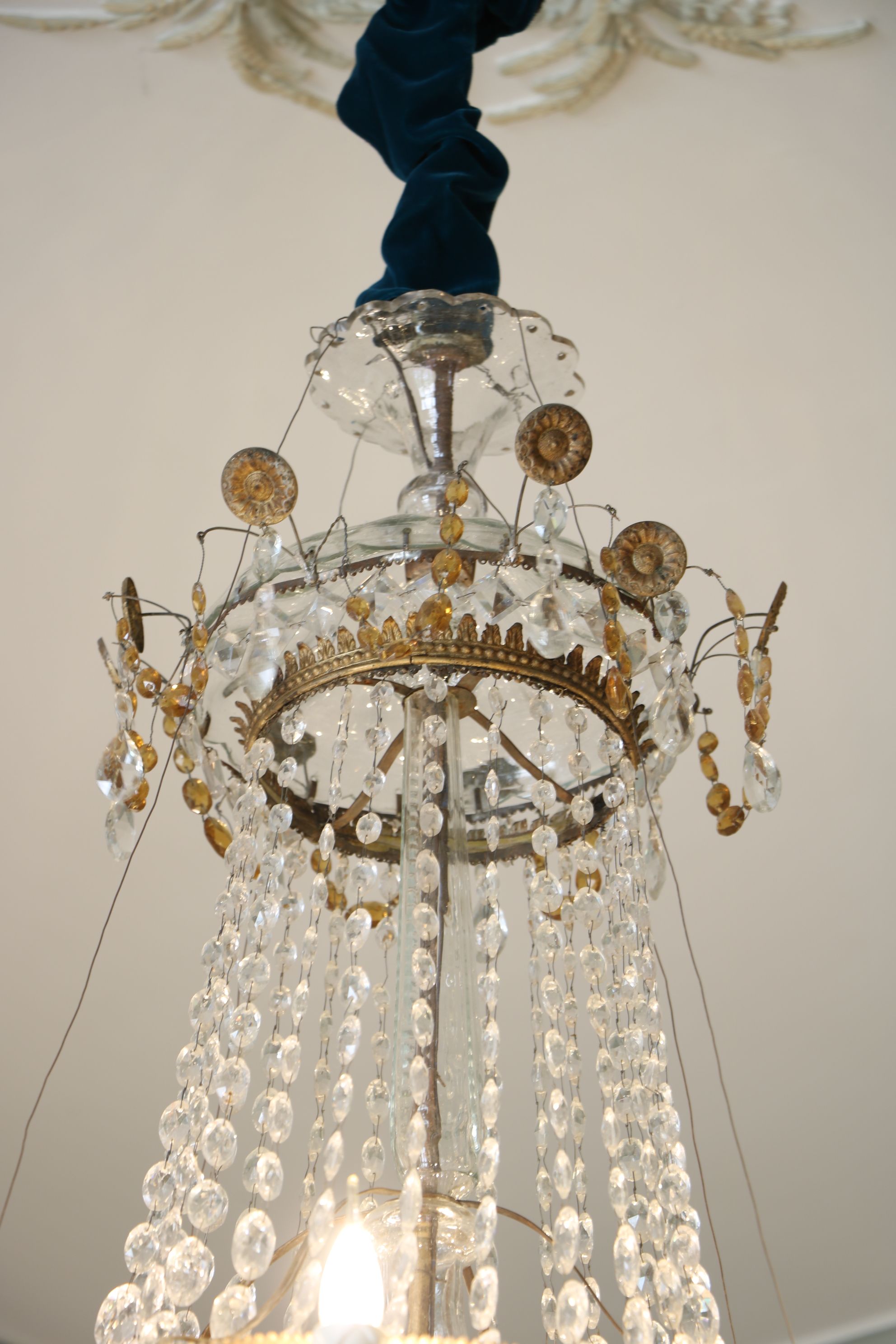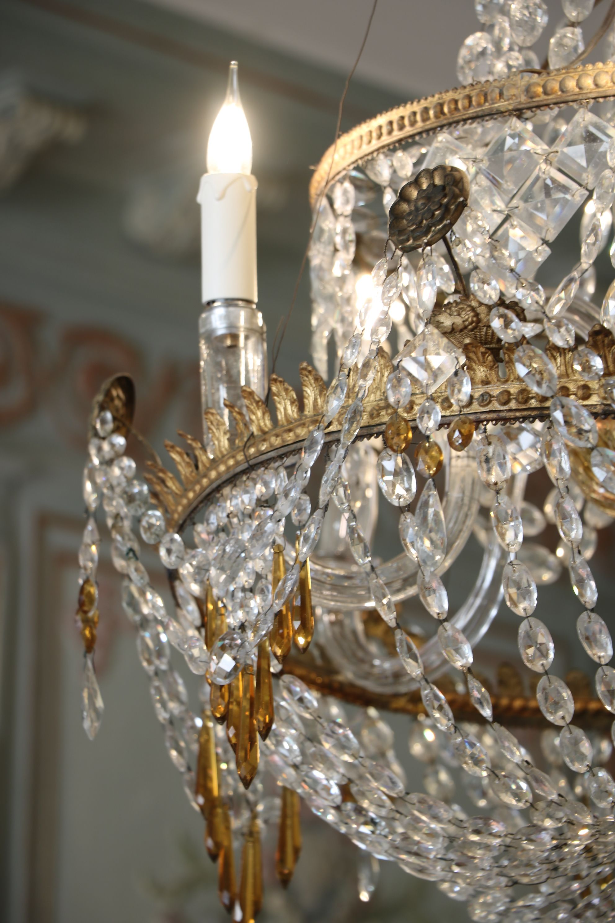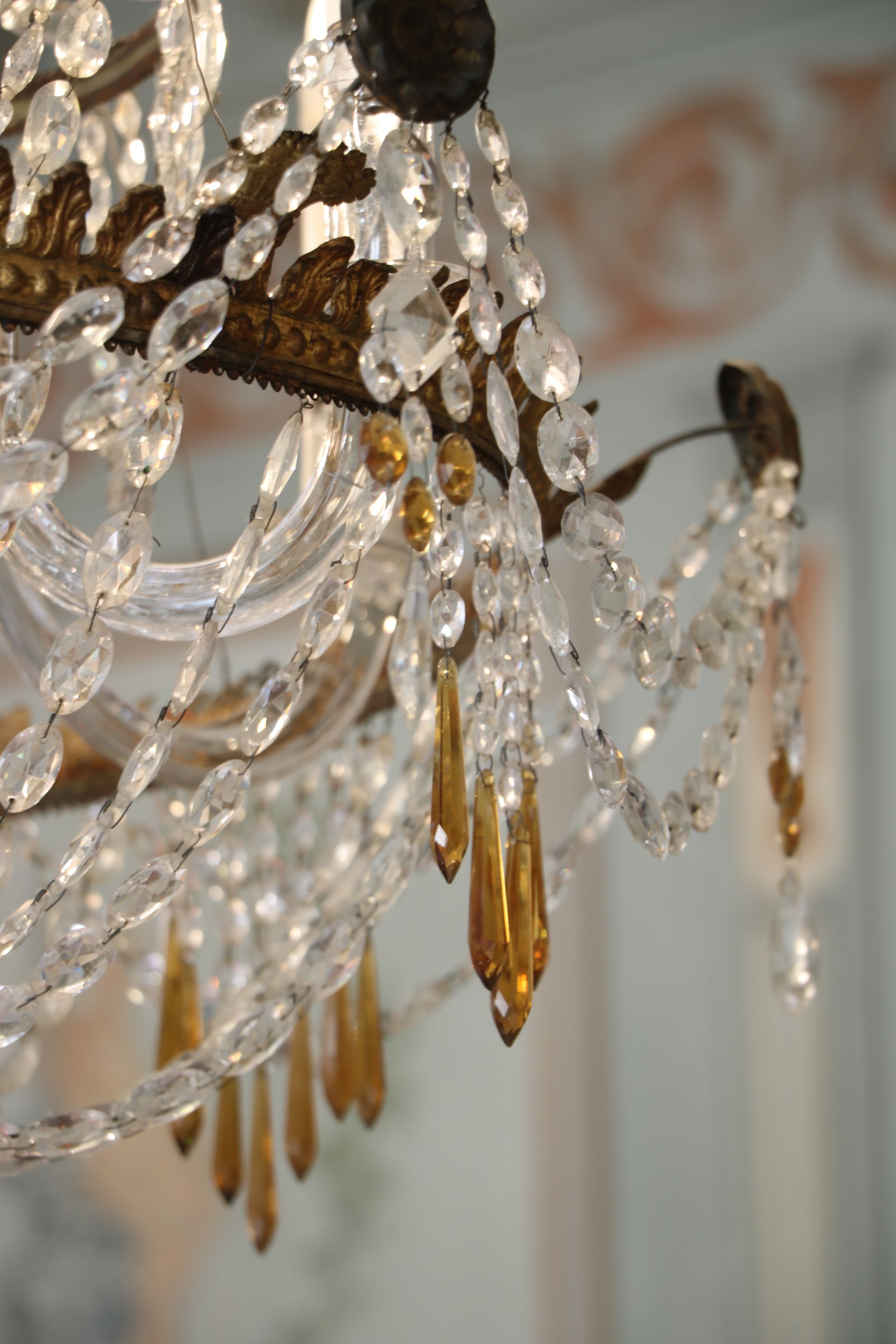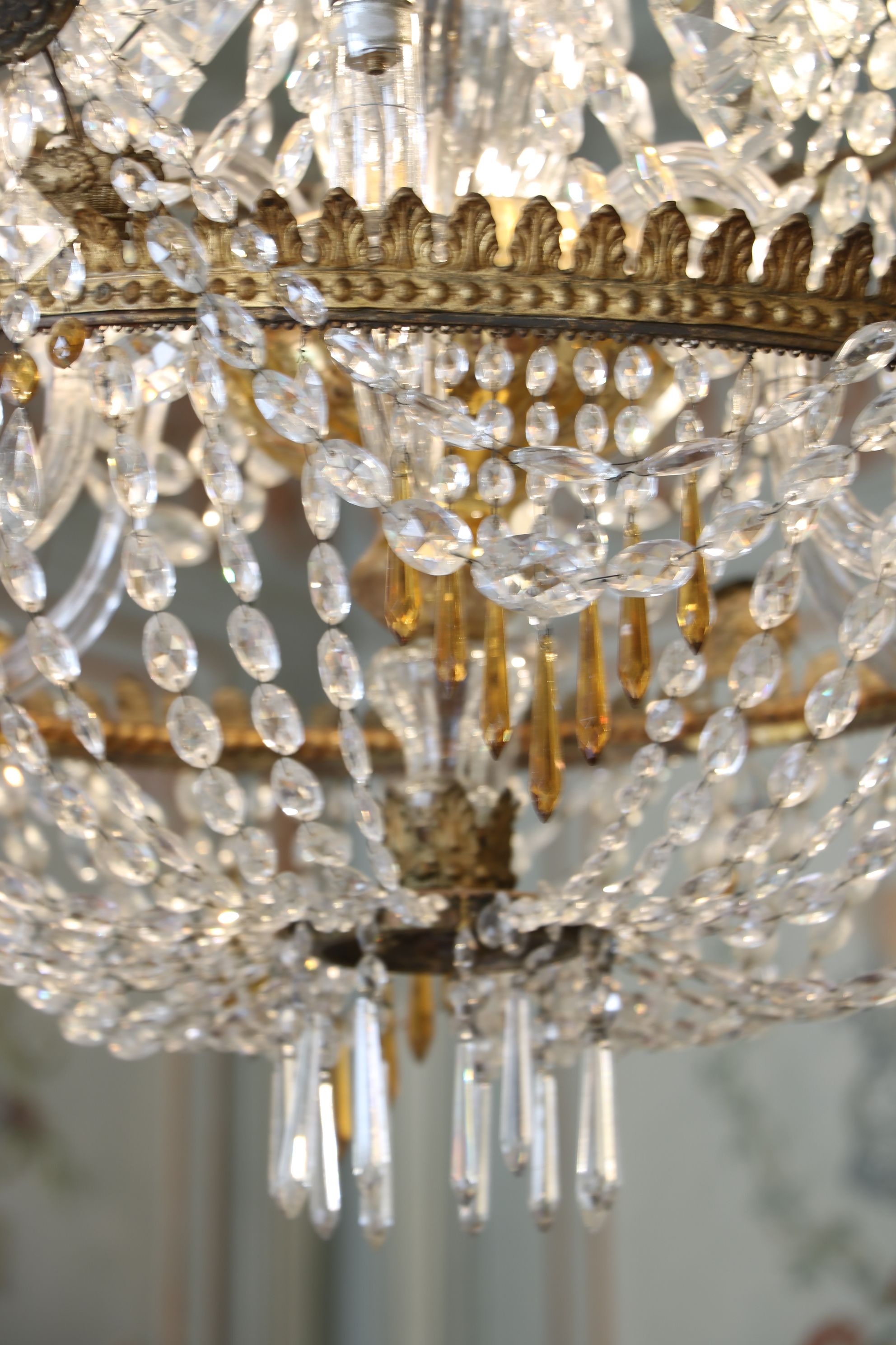 Lustre à six bras de lumières de forme corbeille en bronze doré et en cristal. De nombreuses guirlandes de cristaux et de pamplilles ornent le lustre. Travail italien Epoque Louis XVI Restaurations d’usage H. 102 x D. 70 cm