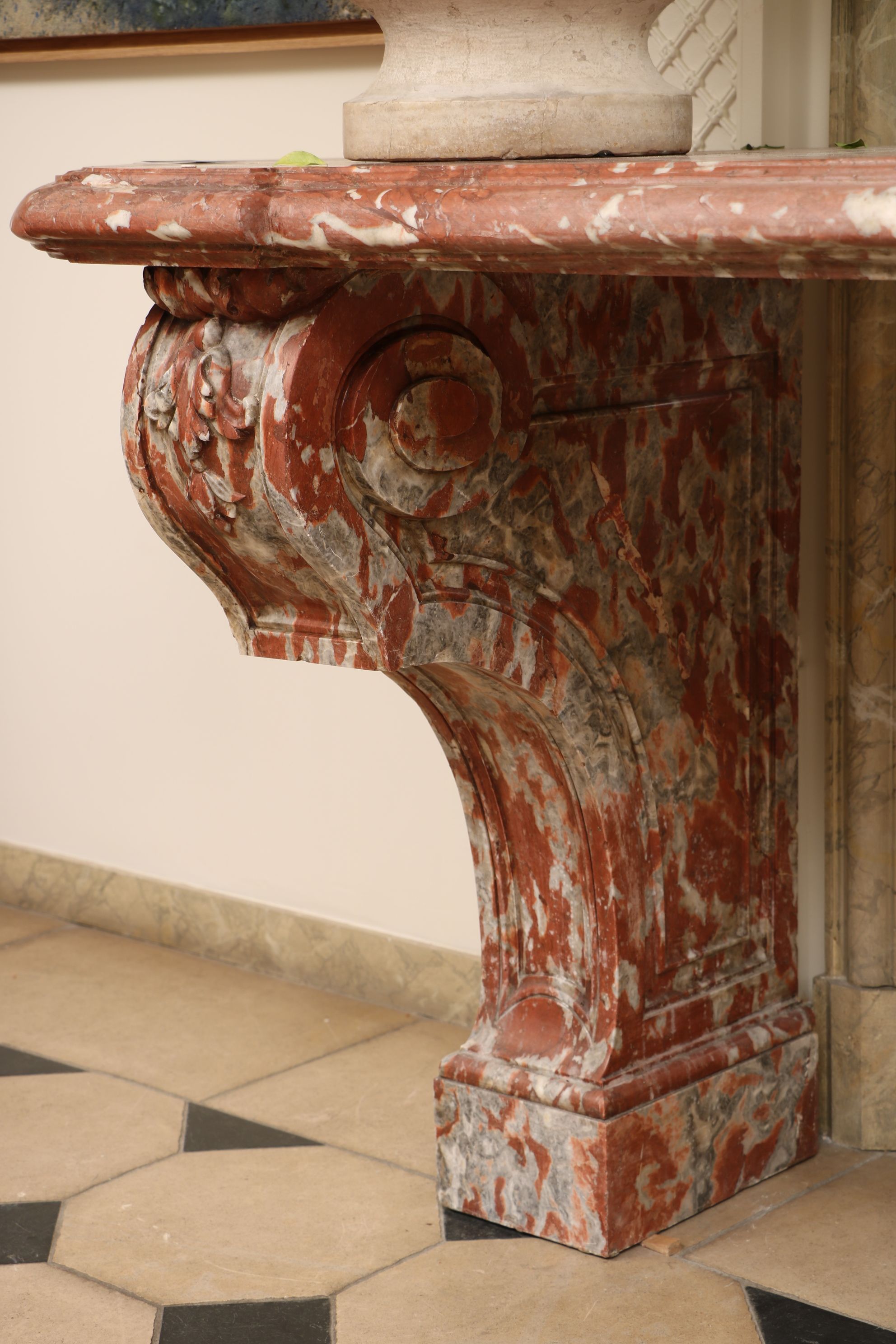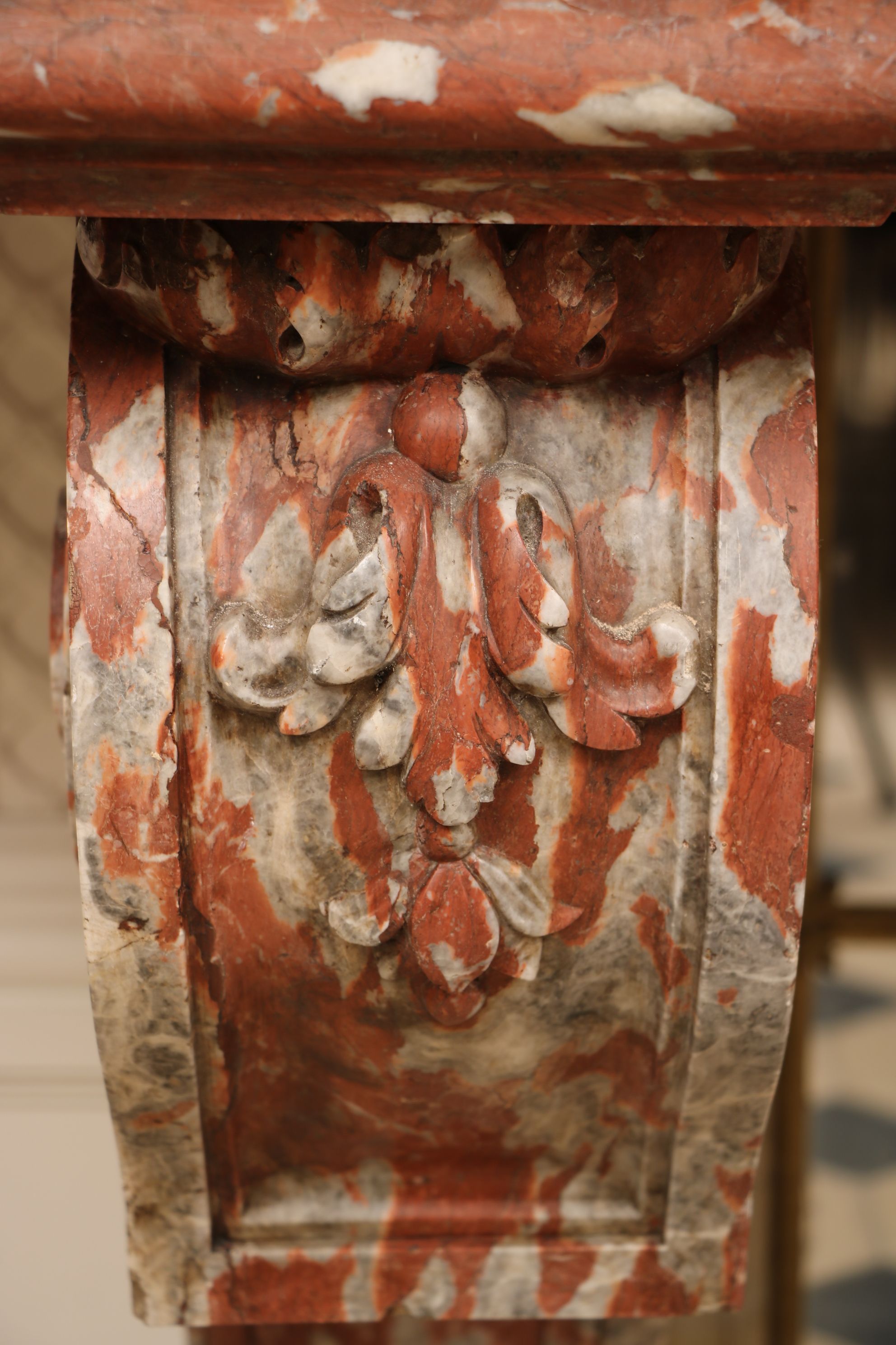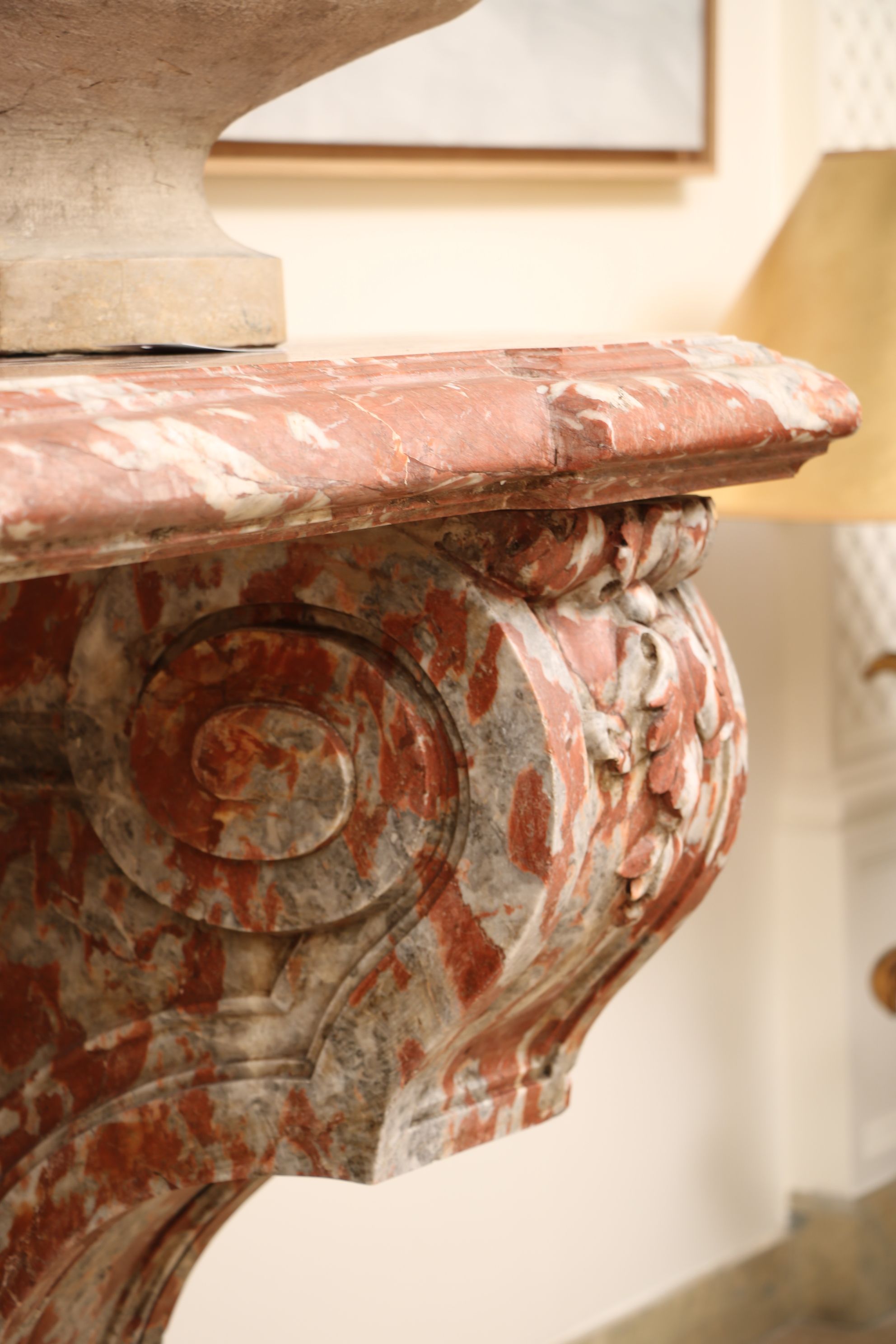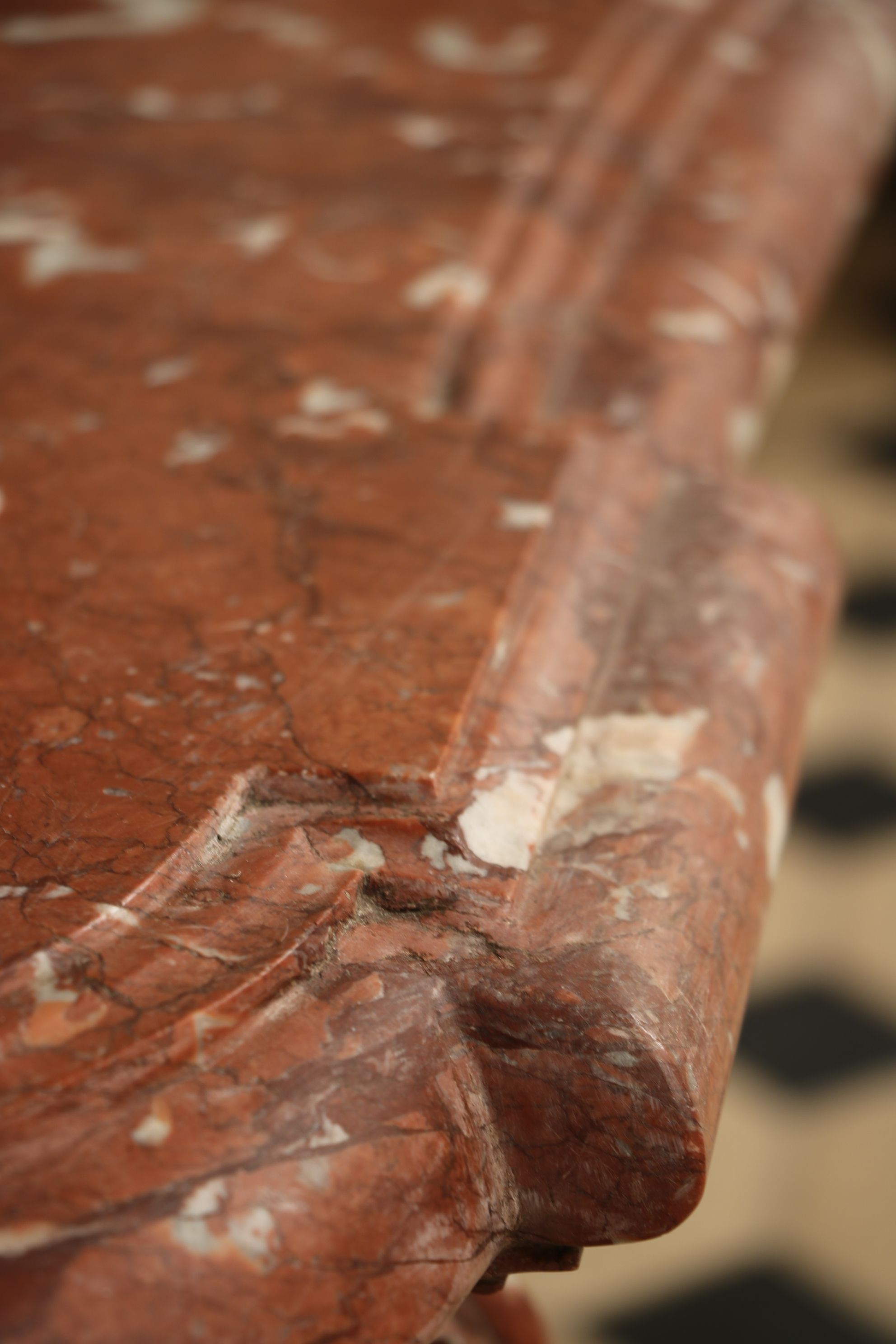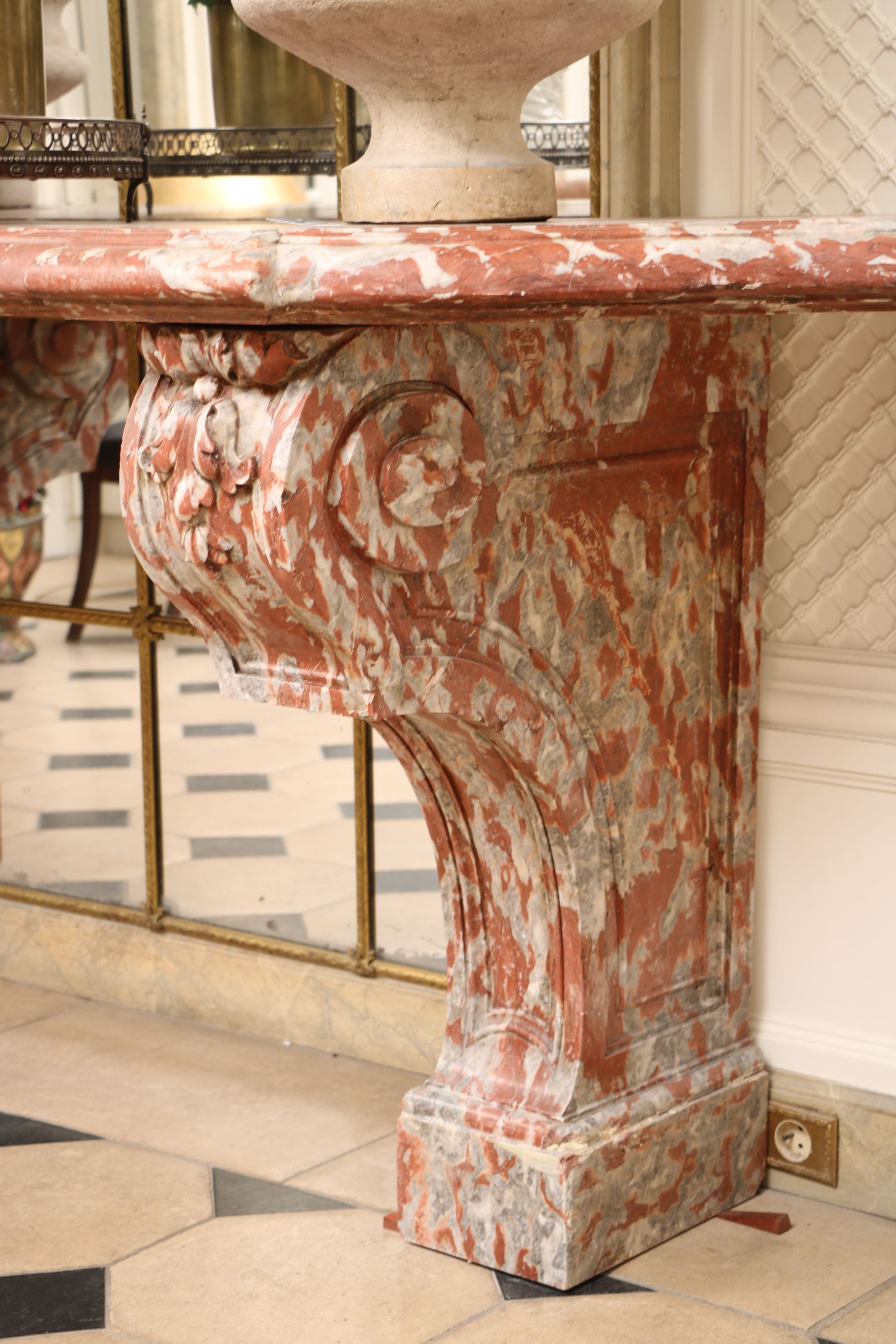 Rare grande console en marbre rouge du Languedoc moulurée et sculptée. La console est composée d’un large plateau à double décrochement en bec de corbin et reposant sur deux montants représentant des volutes décorées d’une feuille de lotus et de fleurons. Epoque Louis XIV Restaurations d’usage, petits éclats H. 95 x L. 275 x P. 75 cm