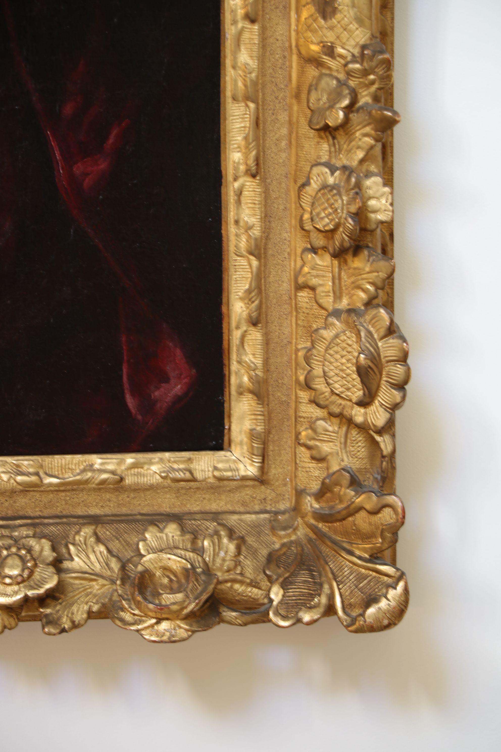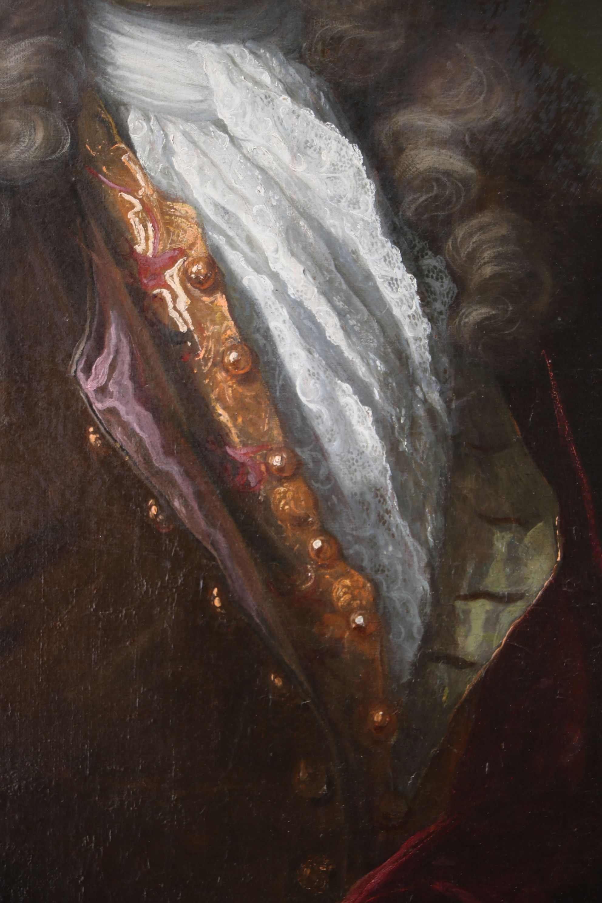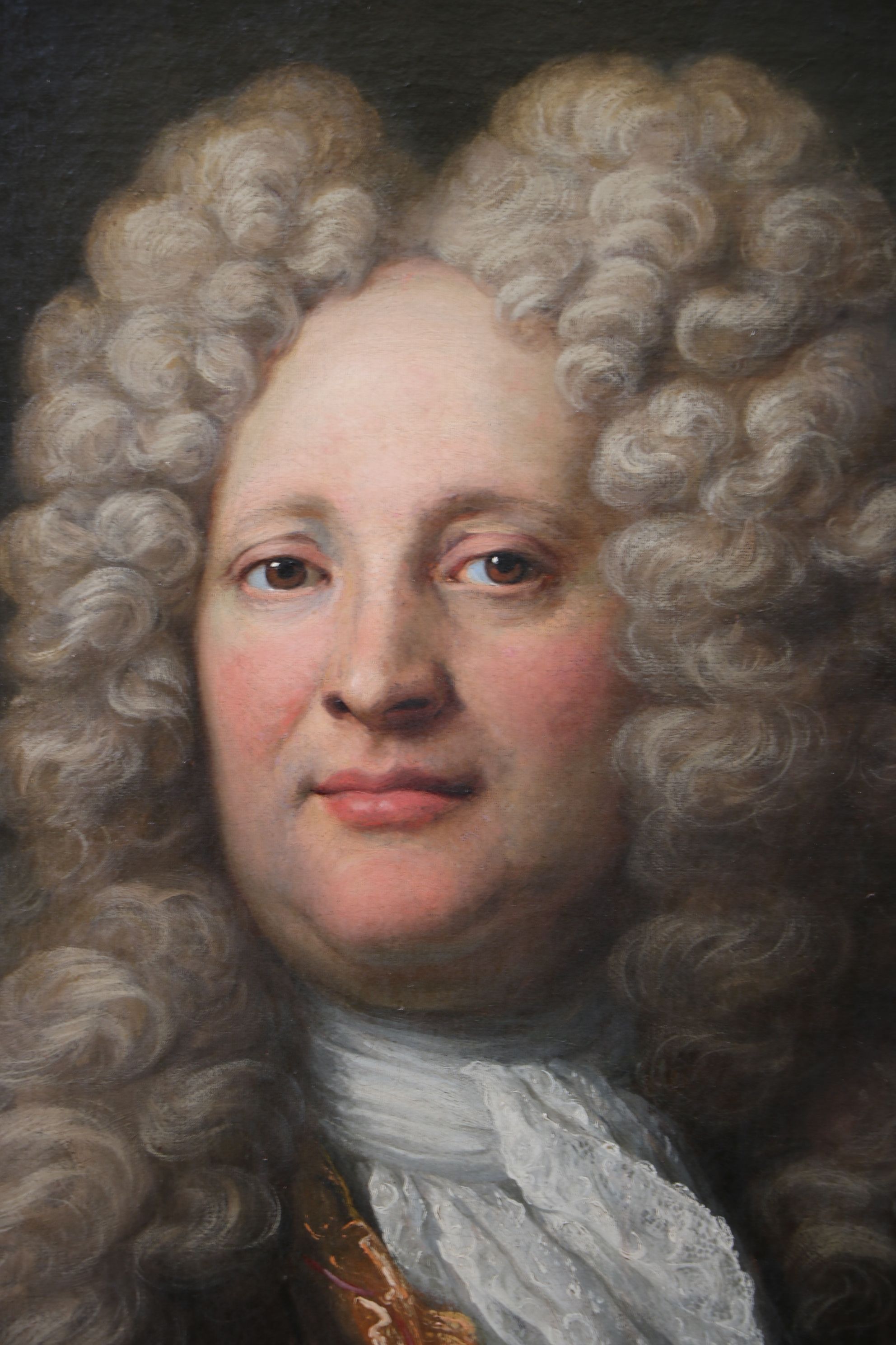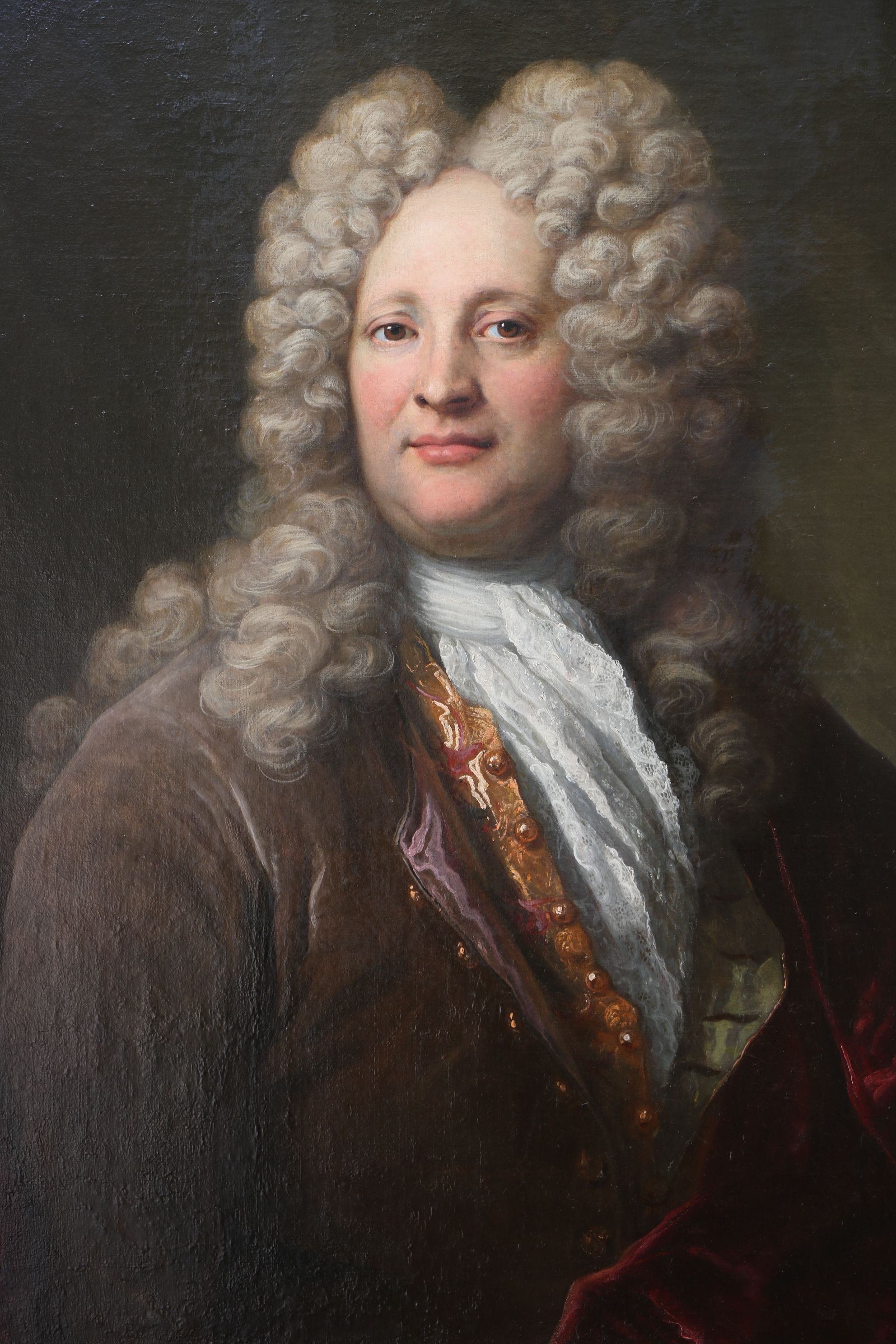 Portrait en buste de trois quart d’un gentilhomme en habit portant une imposante perruque, une redingote, un gilet et un jabot de dentelles. Il est enveloppé par un épais tissu rouge. Huile sur toile encadrée dans un cadre en bois doré d’époque. Attribué à Henri Millot (?-1756) Restaurations d’usage H. 98 x L. 82 cm (avec cadre)