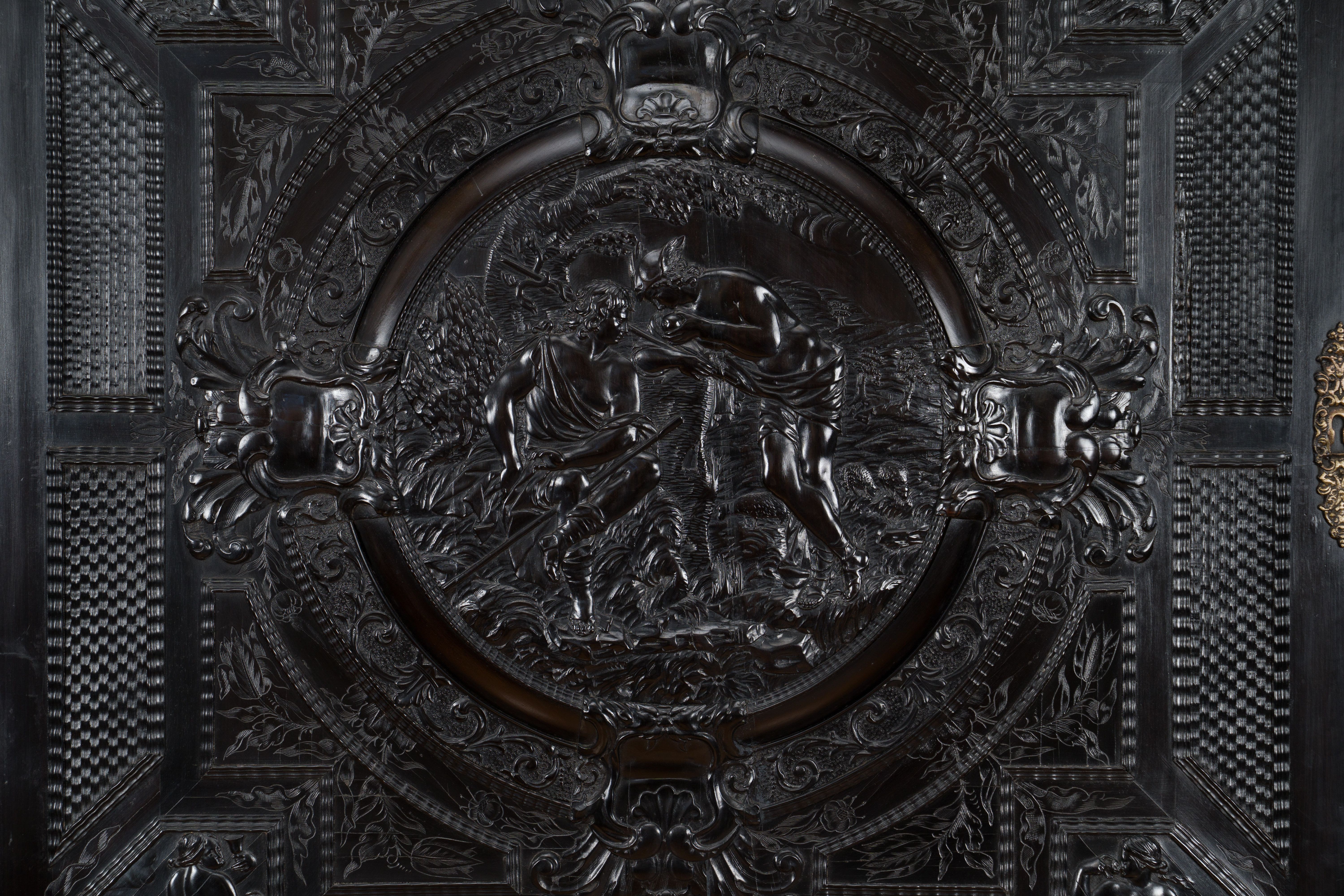 Le jugement de Pâris : Les deux médaillons sculptés des portes extérieures représentent le jugement de Pâris. Sur la porte de gauche, on voit Hermès présentant la pomme de la discorde à Pâris, qui est assis. Le jeune homme est reconnaissable à son bâton de berger. Bien que prince troyen, il est, à ce moment de l’histoire, en train de garder les troupeaux sur le Mont Ida. On reconnaît Hermès, le messager des dieux, à son caducée : deux serpents entourent une baguette de laurier ou d’olivier. Il est également identifiable grâce aux ailes qu’il possède sur son casque. Sur la porte de droite, on observe trois femmes qui se trouvent être Aphrodite, Héra et Athéna. On reconnaît Aphrodite, déesse de l’amour et du désir, à sa beauté, à sa nudité et à Amour, enfant ailé, qui se trouve à sa droite. Athéna, déesse de la guerre et de la sagesse, est reconnaissable à sa tenue de guerrière . Enfin, on identifie Héra grâce à son animal fétiche qui l’accompagne: le paon. L’épisode du jugement de Pâris est très important, puisque c’est l’élément qui déclenchera la guerre de Troie. Cet épisode s’inscrit à la suite d’un précédent événement : la pomme de la discorde. En l’honneur des noces de Pélée et Thétis, les dieux organisèrent un festin sur l’Olympe. Cependant, la déesse Eris, déesse de la discorde, jalouse de ne pas y avoir été invitée, décida d’envoyer sur la table du banquet une pomme d’or sur laquelle on pouvait lire « pour la plus belle ». Trois déesses se disputèrent cette pomme : Aphrodite, Athéna et Héra. Afin de les départager et de savoir à qui cette pomme reviendrait, Zeus décida qu’un humain serait juge, et il envoya Hermès réveiller Pâris, prince troyen, qui faisait la sieste sur le mont Ida. Apparurent alors à Pâris les trois déesses, qui lui proposèrent chacune un cadeau si ce dernier consentait à leur décerner la pomme. Aphrodite lui promit la main de la plus belle femme du monde, Athéna lui promit les plus grande victoire et Héra la souveraineté sur tous les hommes. Pâris choisit de décerner la pomme à Aphrodite. Hélène étant alors la plus belle femme du monde, Pâris ira la ravir à Ménélas et l’emmènera à Troie, déclenchant ainsi la longue guerre de Troie, puis le retour chaotique de Ulysse et de ses compagnons qui seront les sujets de l’Illiade et de l’Odyssée. Pan : Plusieurs éléments évoquent le dieu Pan, divinité des bergers, des troupeaux et des bois. Dès la renaissance, ce dieu, qui se présente sous la forme d’un satyre, est associé à la luxure. Ces représentations se trouvent principalement sur les tiroirs sculptés du haut du cabinet. On y voit des enfants (ou putti) qui jouent avec les nymphes, une chèvre (tiroir de gauche) ou encore en train de chevaucher un satyre (tiroir de droite). Ces putti se mélangent avec des femmes lascivement allongées sur les côtés des tiroirs (les nymphes), parfois dans des scènes très suggestives comme sur le tiroir de droite où un enfant soulève la robe d’une de ces nymphe. Sur les portes on observe également des médaillons dans lesquels sont sculptés des femmes qui pourraient représenter les cinq sens. Une femme se regarde dans un miroir (la vue), l’une tient un oiseau (le toucher et l’ouïe), une autre porte une fleur à son nez (l’odorat) et la dernière tient un verre à la main (le goût). En effet, Pan possède une prédilection pour les plaisirs des sens, ce que pourraient représenter ces figures de femmes. Galatée et Polyphème : Galatée est une divinité marine aimée du cyclope Polyphème (le fameux cyclope chez qui échouera Ulysse et ses compagnons de voyage lors de leur retour de Troie). Cependant, Galatée aime Acis, fils du dieu Pan. Un jour qu’ils sont tous deux enlacés, Polyphème les surprend. Fou de jalousie, il lance un énorme rocher sur le jeune berger et le tue. Galatée transformera alors son bien aimé en fleuve. Sur ces peintures, on voit Galatée à gauche et Polyphème, prêt à jeter son rocher, à droite. Galatée est reconnaissable au grand voile qu’elle tient dans sa main, que l’on retrouve très souvent dans les représentations de la divinité. Aphrodite et Ploutos : Les deux figures mythologiques gravées sur les portes intérieures pourraient être Aphrodite et Ploutos. En effet, la femme à gauche, représentée nue, est accompagnée d’amour, enfant ailé avec son arc et ses flèches. Le jeune homme de la porte de droite tient une serpe dans sa main droite et une corne d’abondance de l’autre côté. Ploutos, souvent représenté sous les traits d’un jeune homme étant le fils de Déméter, cela pourrait expliquer la serpe. La corne d’abondance est son attribut.