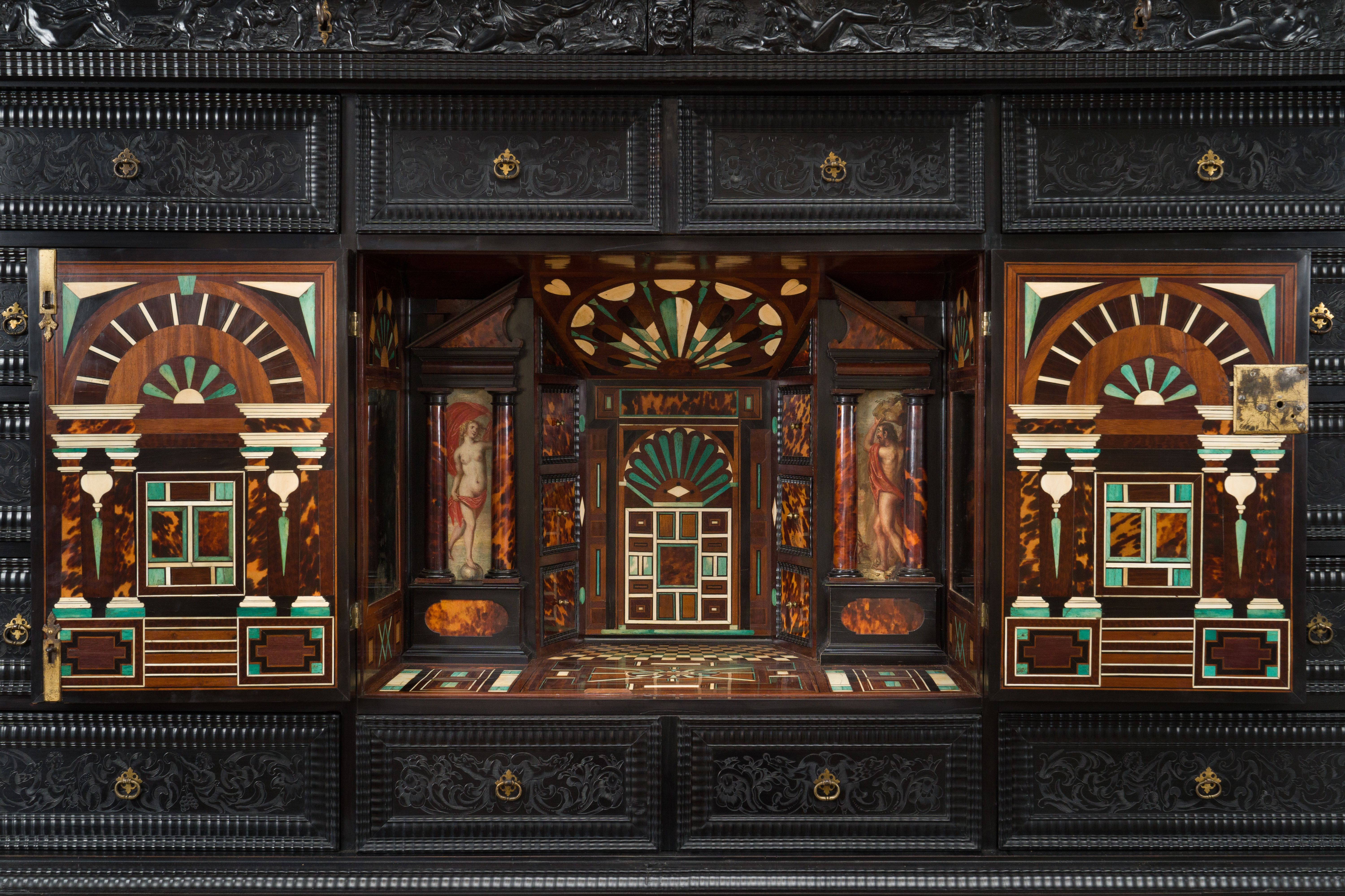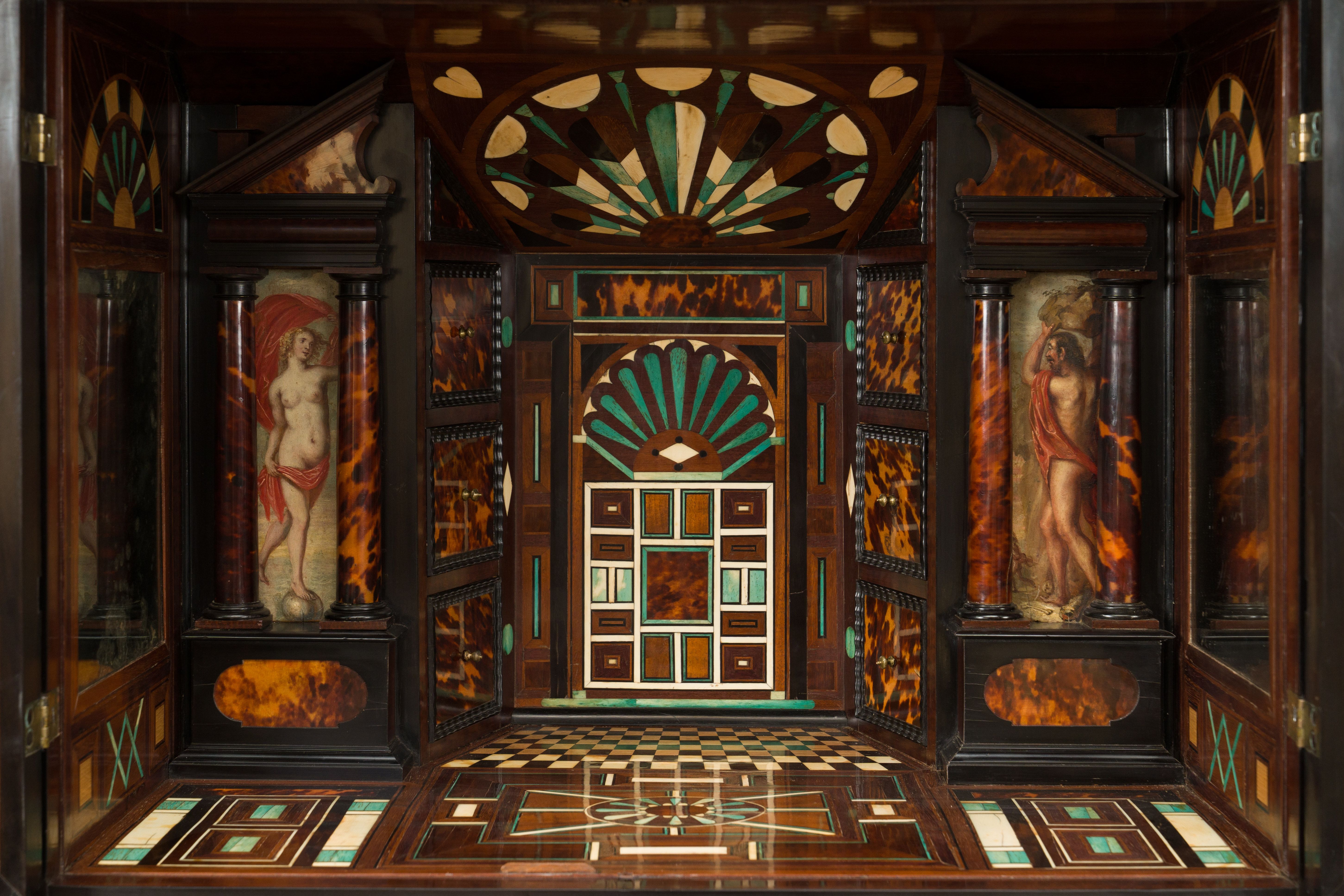 Cabinet en ébène, peuplier, poirier, amarante, amourette, satiné, écaille de torture, ivoire et os teinté. Il est composé de deux parties distinctes: la partie haute et le piétement. La partie haute est surmontée d’une corniche et de deux tiroirs sur la longueur du bâti. On observe différents personnages sculptés sur ces tiroirs, principalement des enfants et des nymphes. En dessous se trouvent deux vantaux comportant chacun un médaillon sculpté représentant une scène mythologique : le jugement de Pâris. Ces vantaux s’ouvrent sur douze tiroirs entourant deux portes intérieures. Lorsqu’elles sont ouvertes, ces portes laissent apparaître un théâtre entièrement marqueté de bois exotiques, d’os teinté et d’écaille de tortue. De chaque côté du théâtre se trouvent des miroirs qui agrandissent l’espace et accentuent l’aspect architectural. Deux peintures se situent de part et d’autre : Galatée à gauche et le cyclope Polyphème à droite, mis en valeur par l'habile jeu de glace. Le piétement du meuble possède quatre tiroirs dont la façade, cernée de moulures guillochées entourant une gravure, est similaire aux façades des tiroirs intérieurs du cabinet. Deux panneaux gravés représentant des paysages de campagne se situent derrière cinq colonnes torses. Quatre tabliers représentant des chimères aux influences asiatiques se trouvent entre les colonnes, en façade. Epoque XVIIe siècle Restaurations réalisées par monsieur Henri Collet H. 203 x L. 170 x P. 56 cm