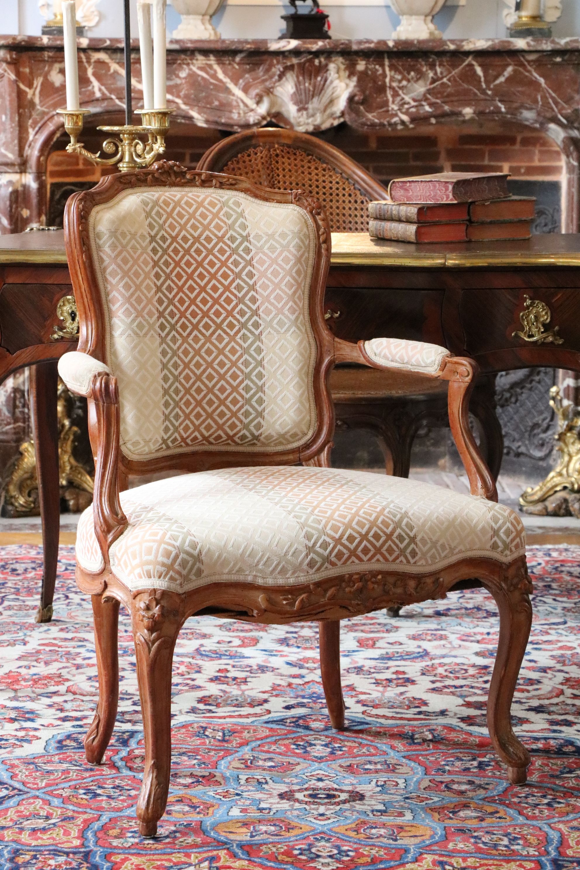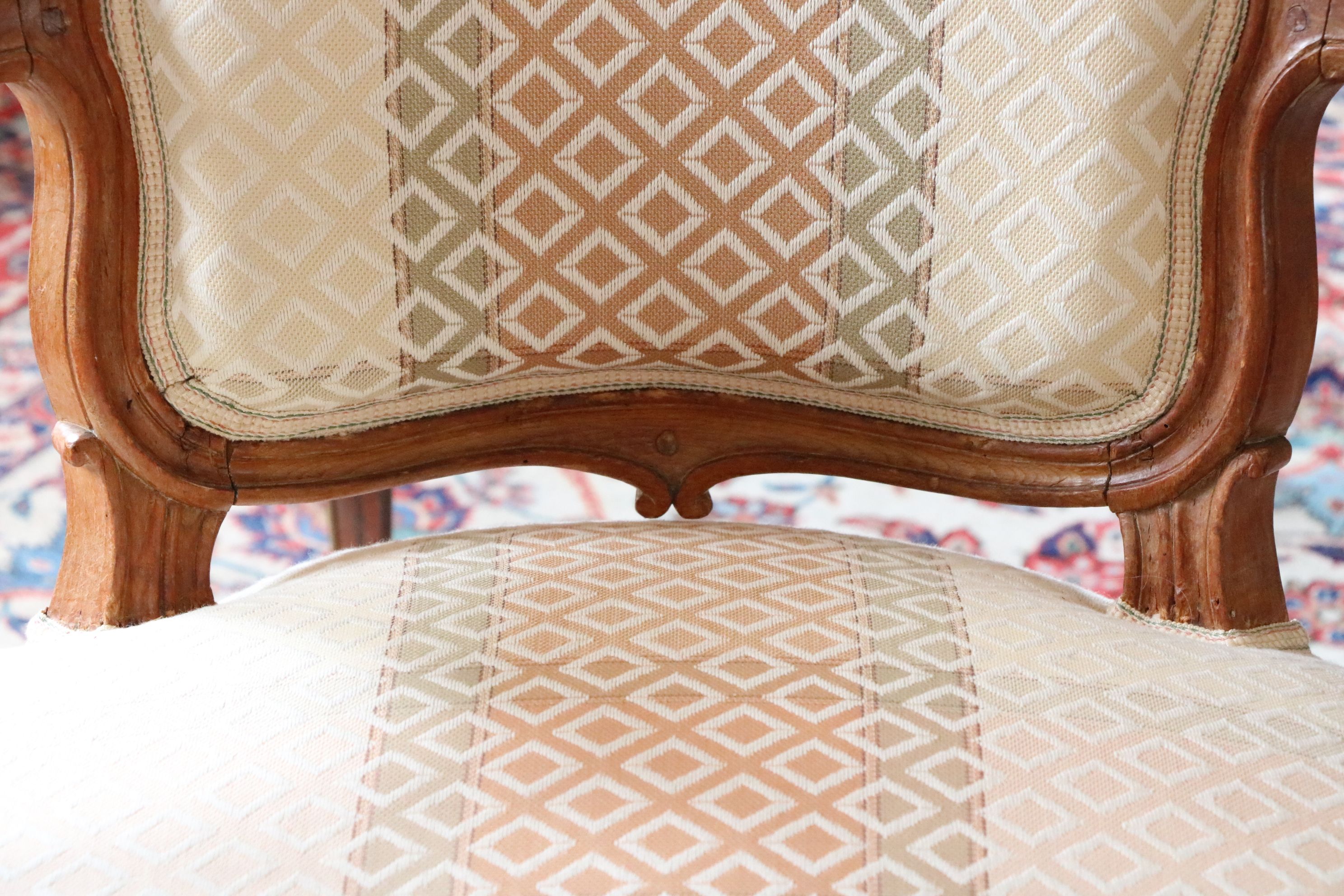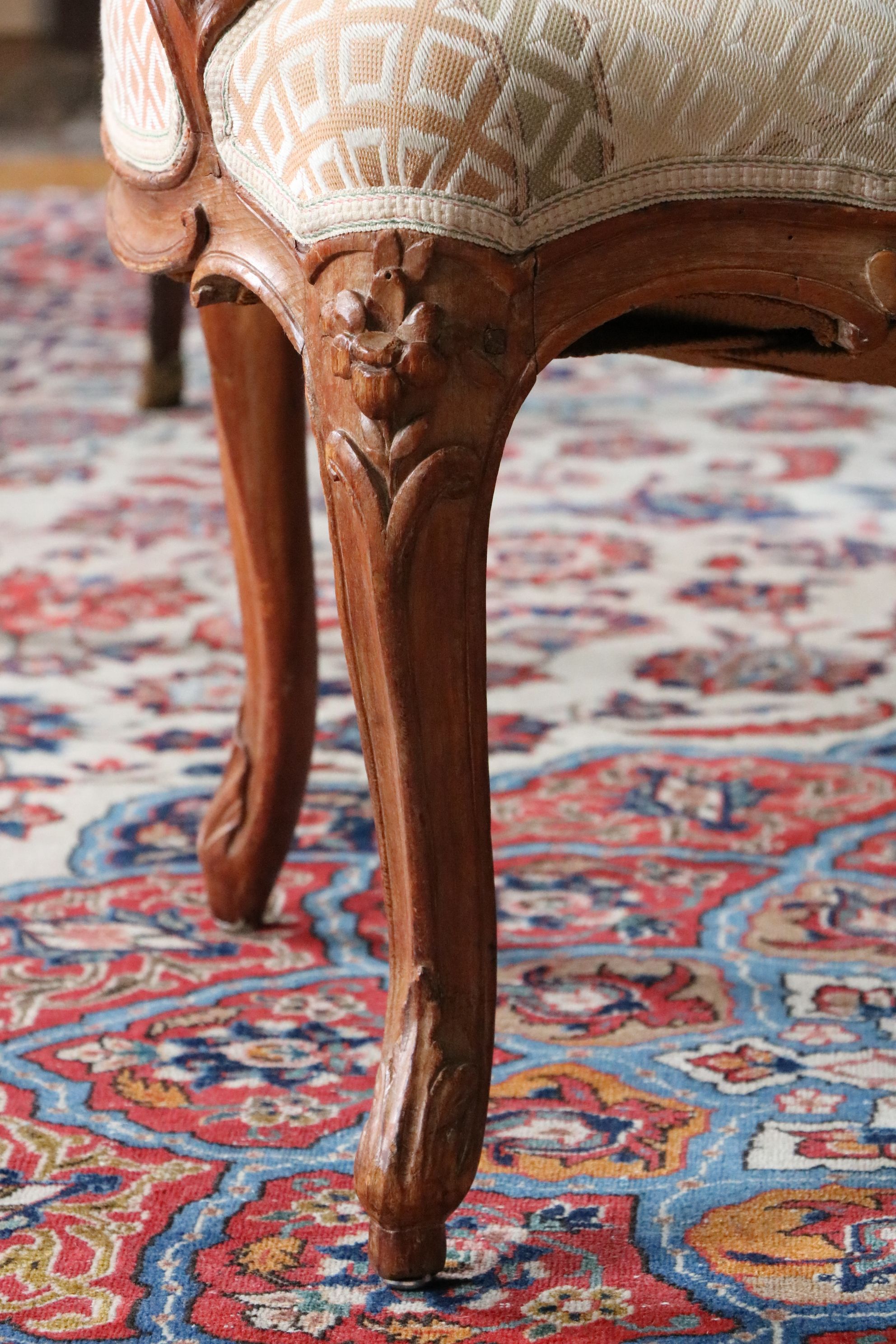 Paire de fauteuils en bois naturel mouluré et sculpté de forme mouvementée. Reposant sur quatre pieds galbés, ces fauteuils sont très finement sculptés de feuillages et fleurs sur les traverses de l’assise, les montants et traverses du dossier. Les consoles d’accotoir sont en coup de fouet. Estampillée Bauve Epoque Louis XV Restaurations d’usage, garniture moderne H. 86 x L. 62 x P. 50 cm Mathieu Bauve ou Debauve est un menuisier devenu maître en 1754. Décédé vers 1786, sa veuve continuera quelques temps son travail. Il réalise en majorité des ouvrages Louis XV pour lequel il excelle. Ces sièges-ci sont de très bonne qualité tel que l’écrit Pierre Kjellberg dans le livre « Le mobilier français du XVIIIe siècle ». Notre paire de fauteuils témoigne en effet du talent de l’artiste qui a conçu des sculptures d’une grande profondeur.