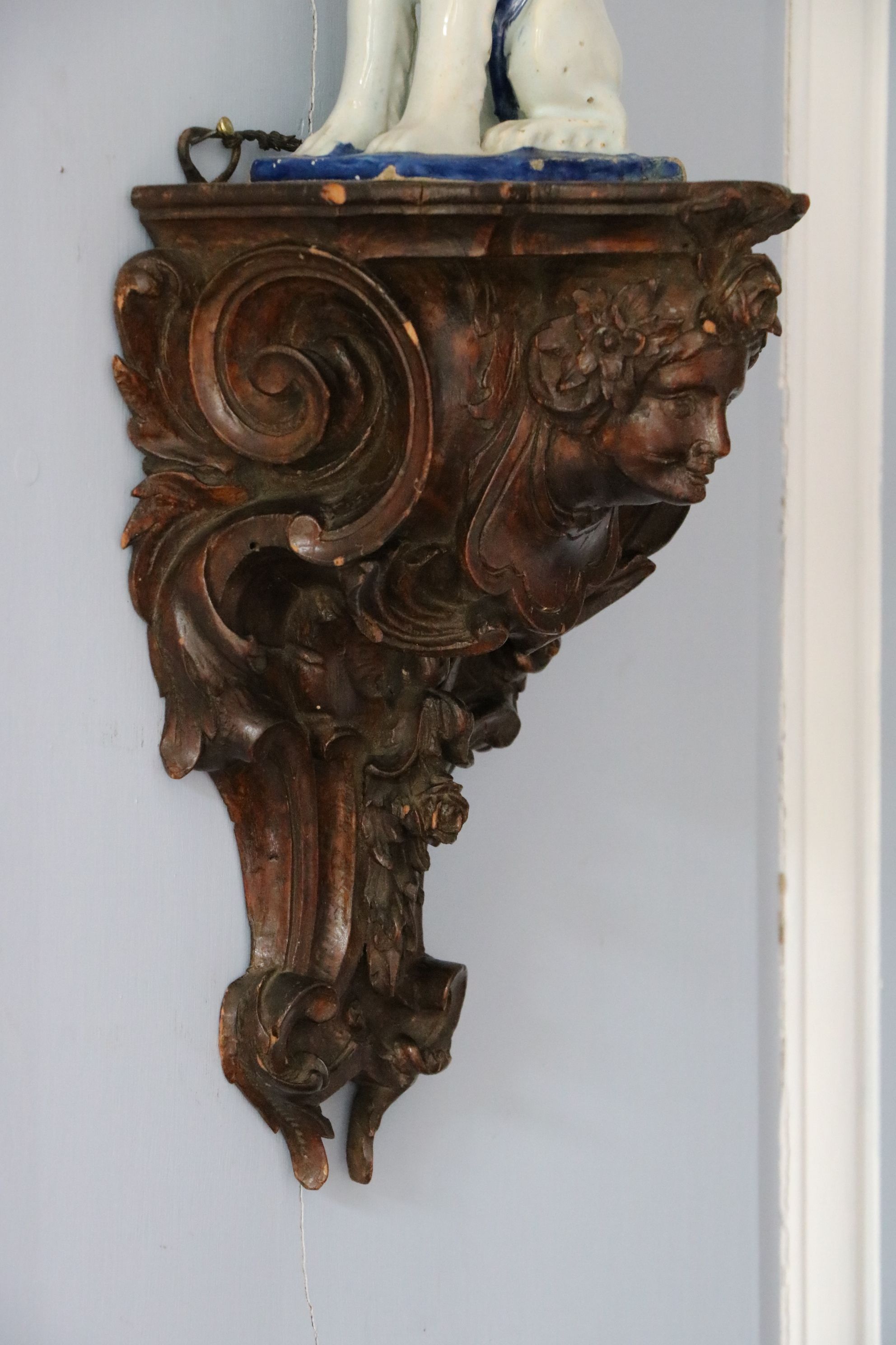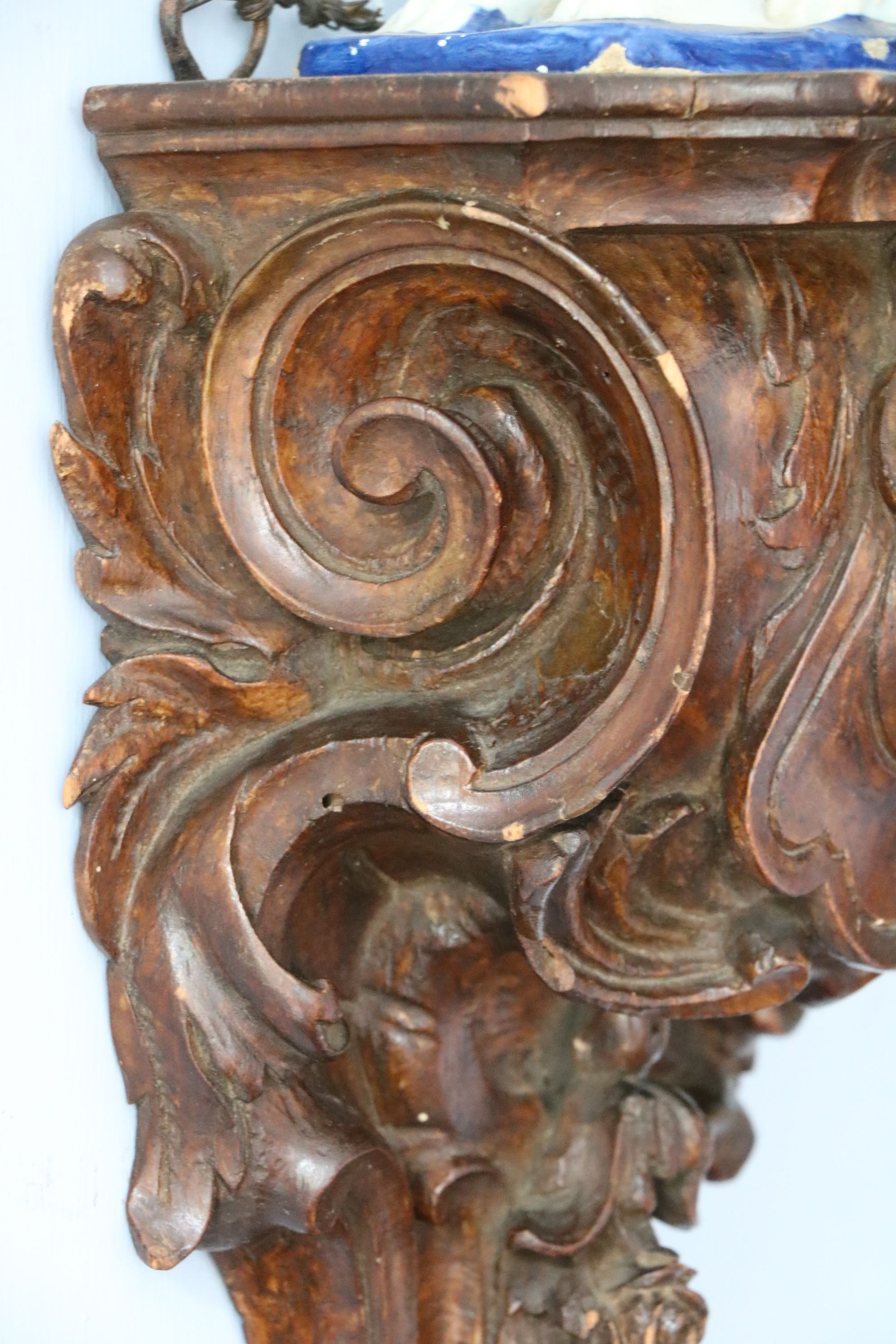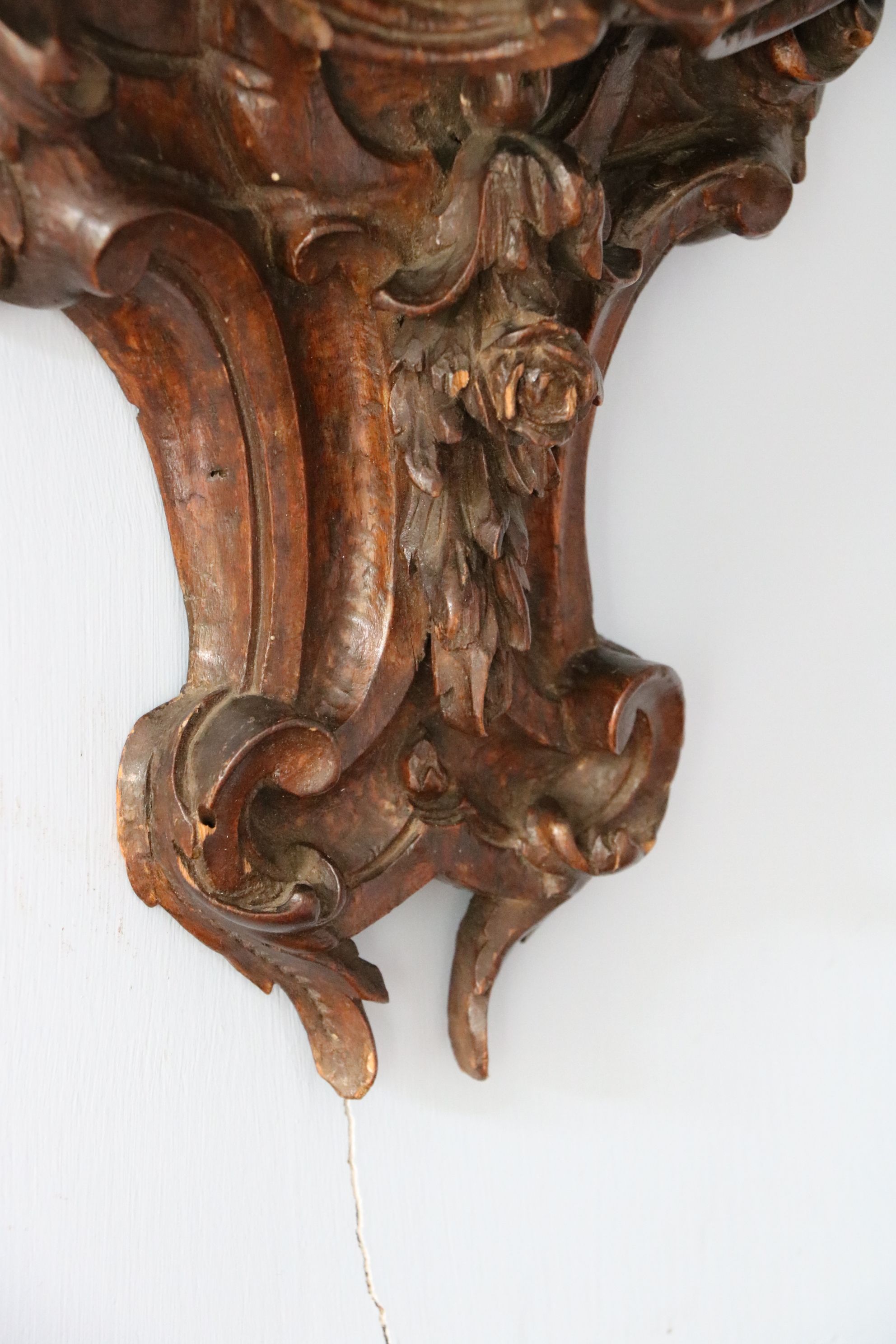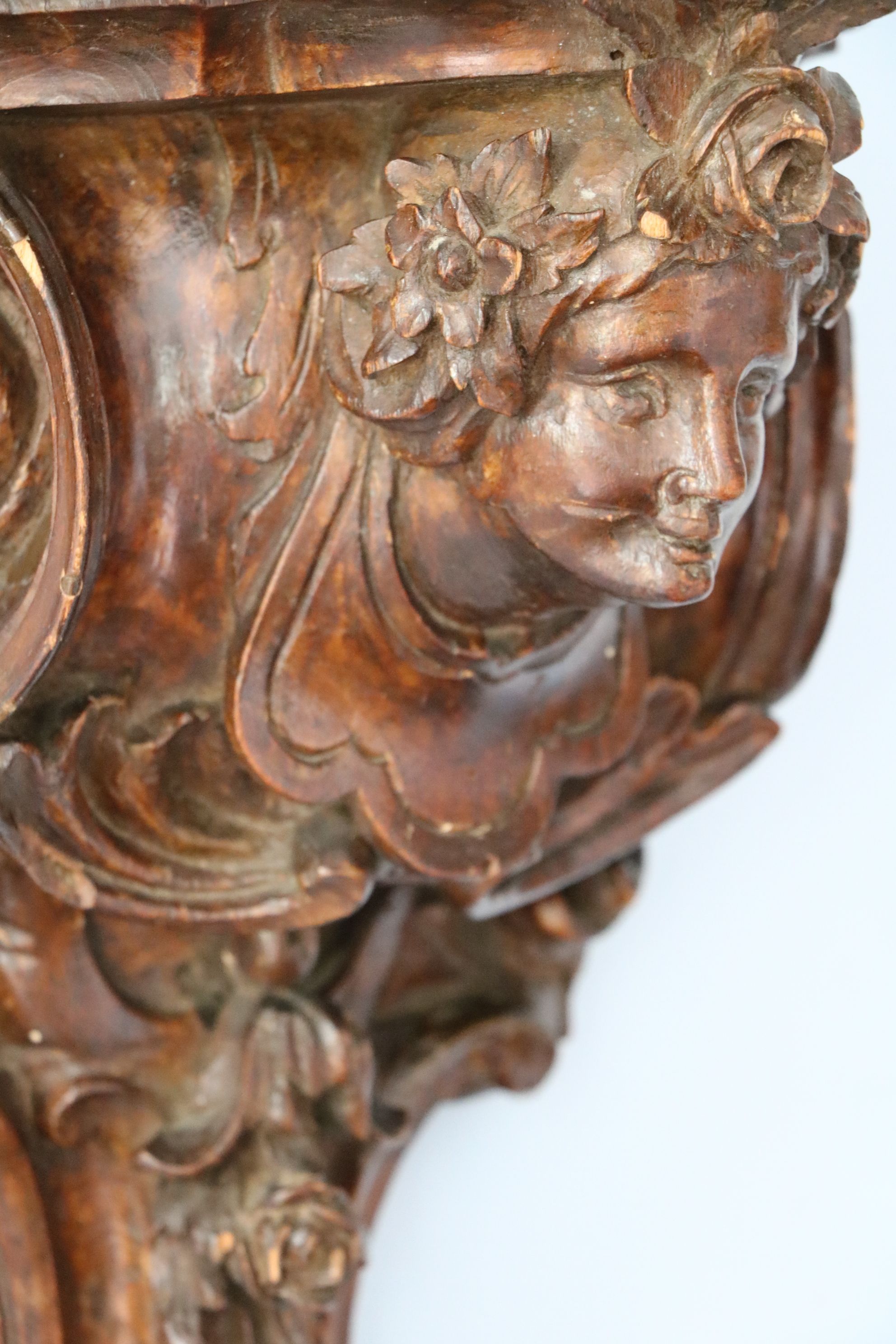 PAIRE DE CONSOLES D’APPLIQUES mouvementées en bois richement sculpté d’enroulements feuillagés, de fleurs et de mascarons féminins. Époque Régence quelques petits éclats H.28 x L.20 x P.15,5 cm
