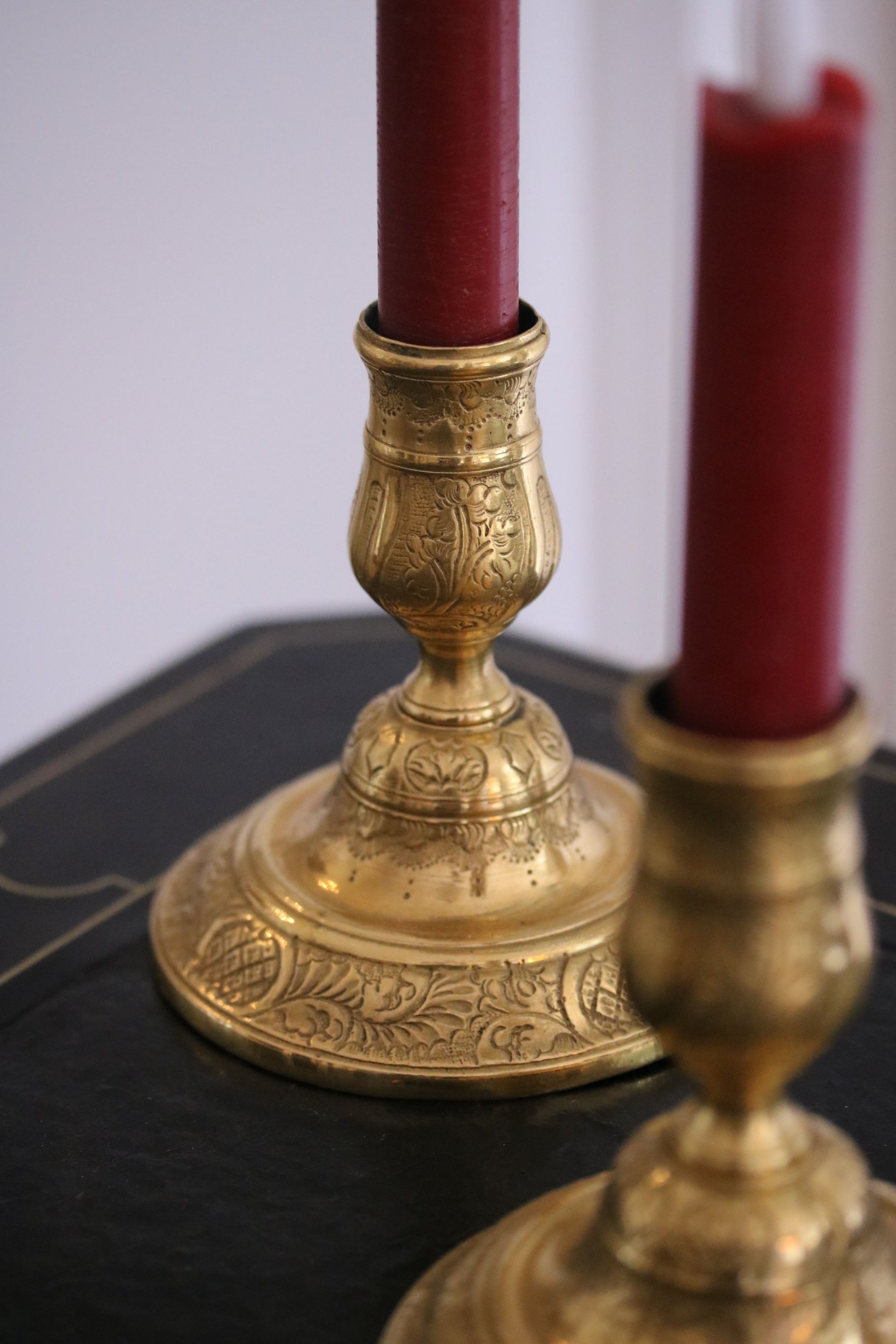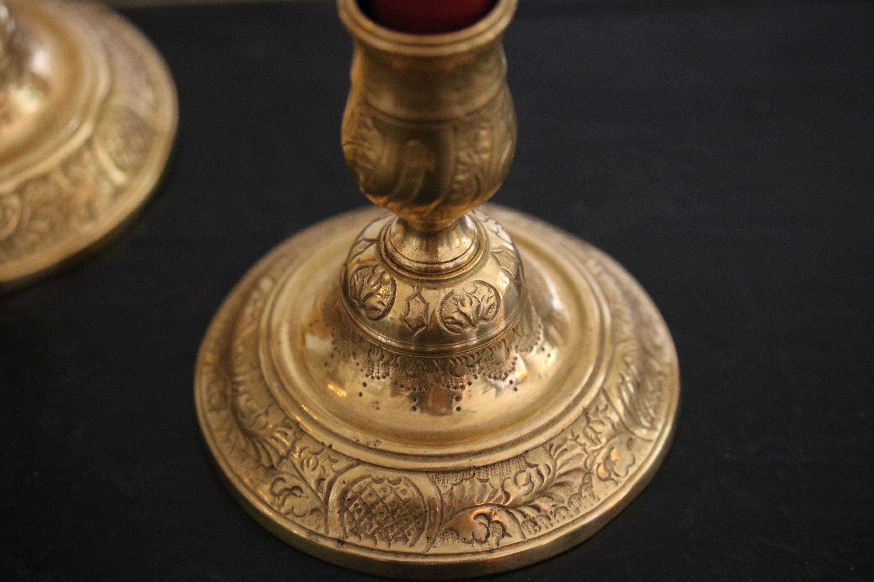 Paire de bougeoirs bout de table en bronze doré à décor de feuillages et de motifs géométriques. Epoque Régence Restaurations d’usage H. 11 x D. 10 cm