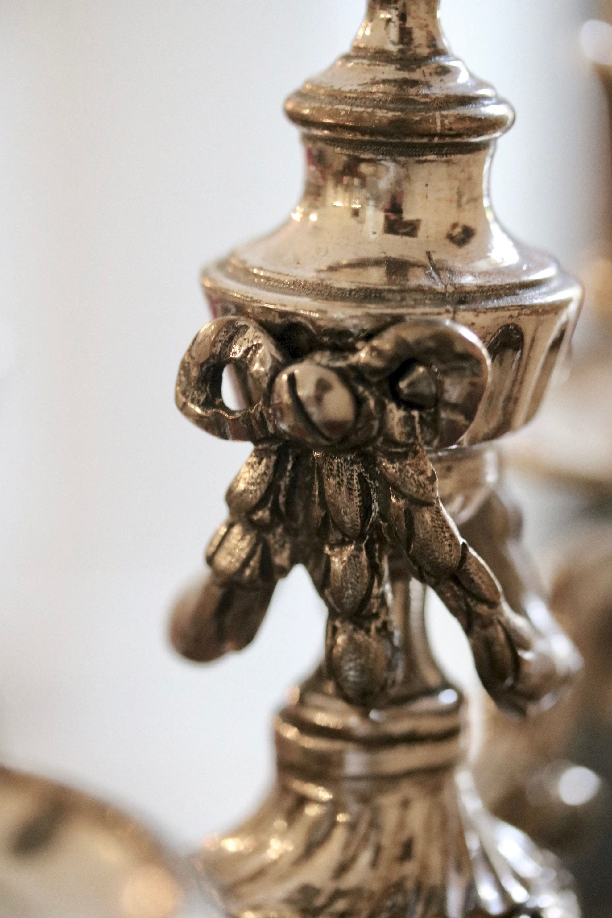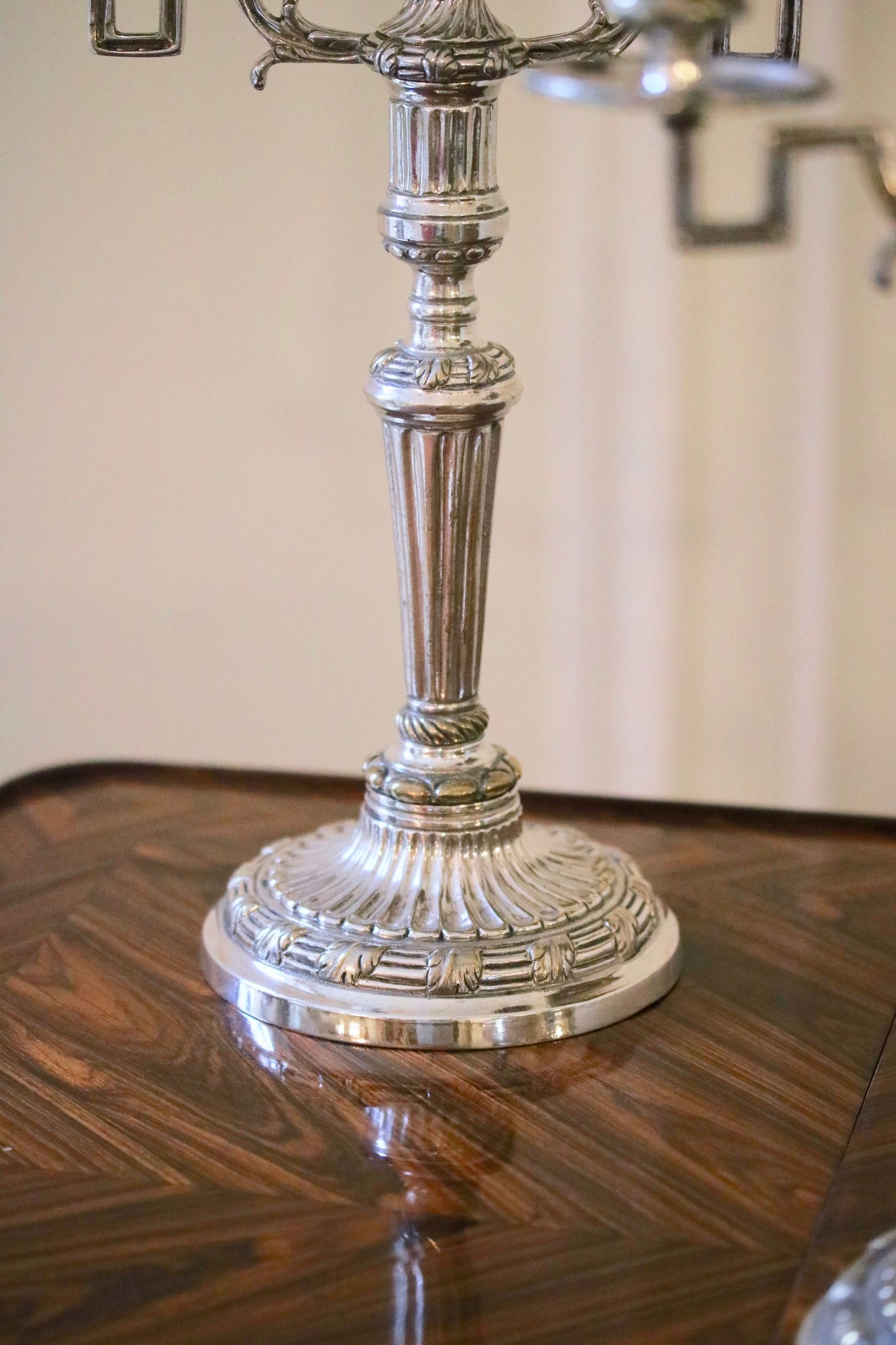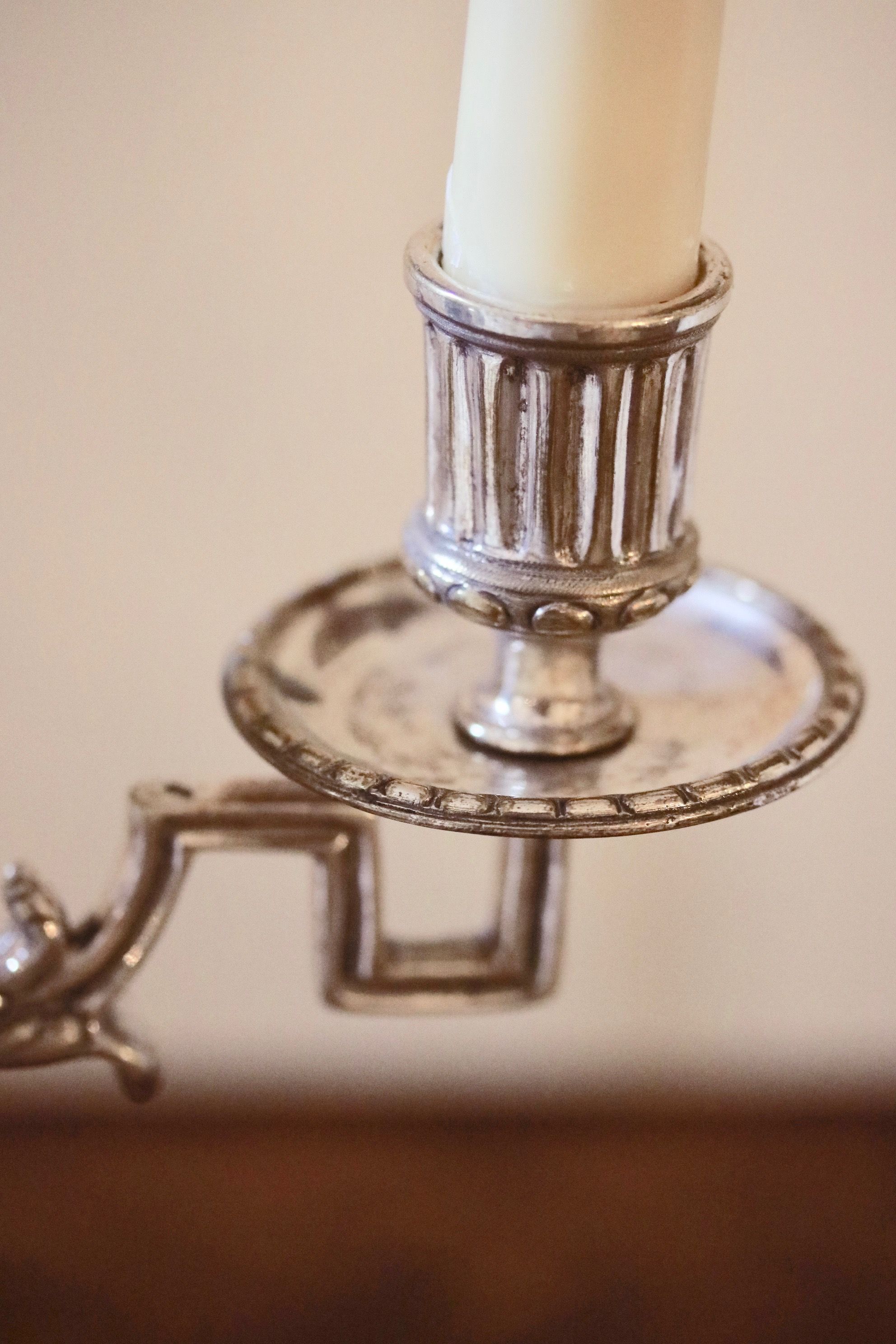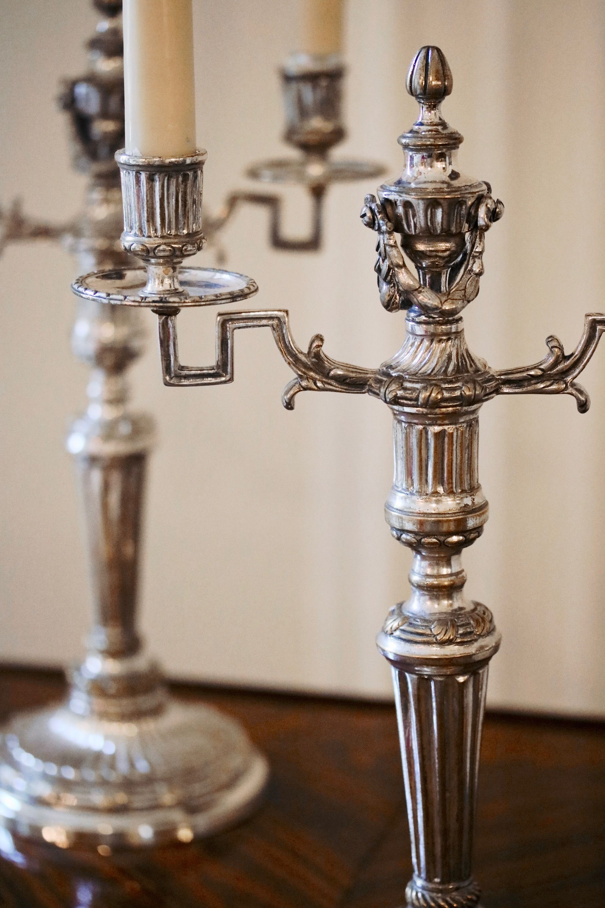 Paire de candélabres en métal plaqué à deux bras de lumières. Epoque Louis XVI Restaurations d’usage H. 37 x L. 24 cm