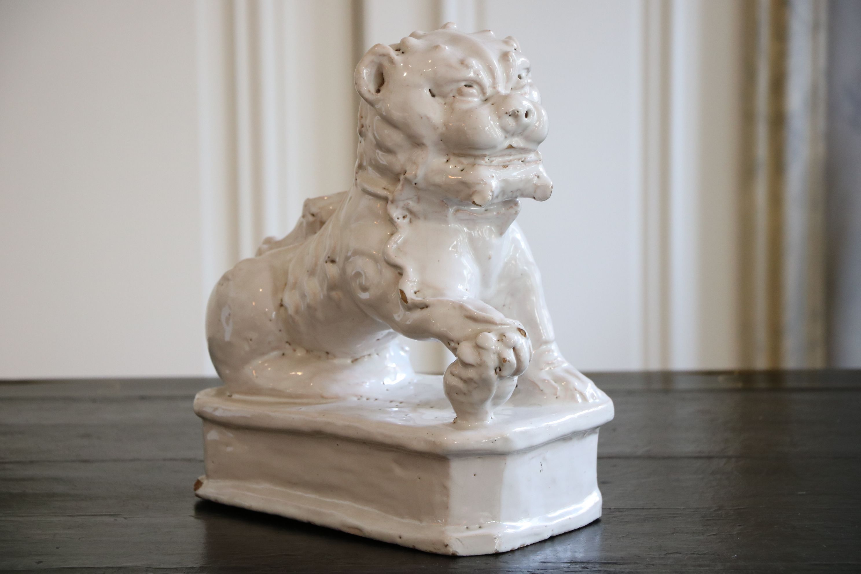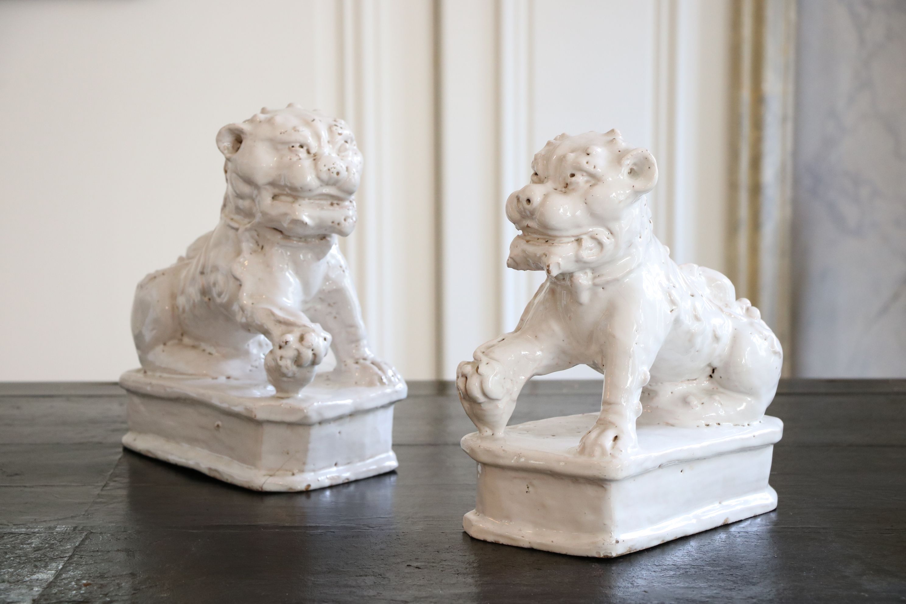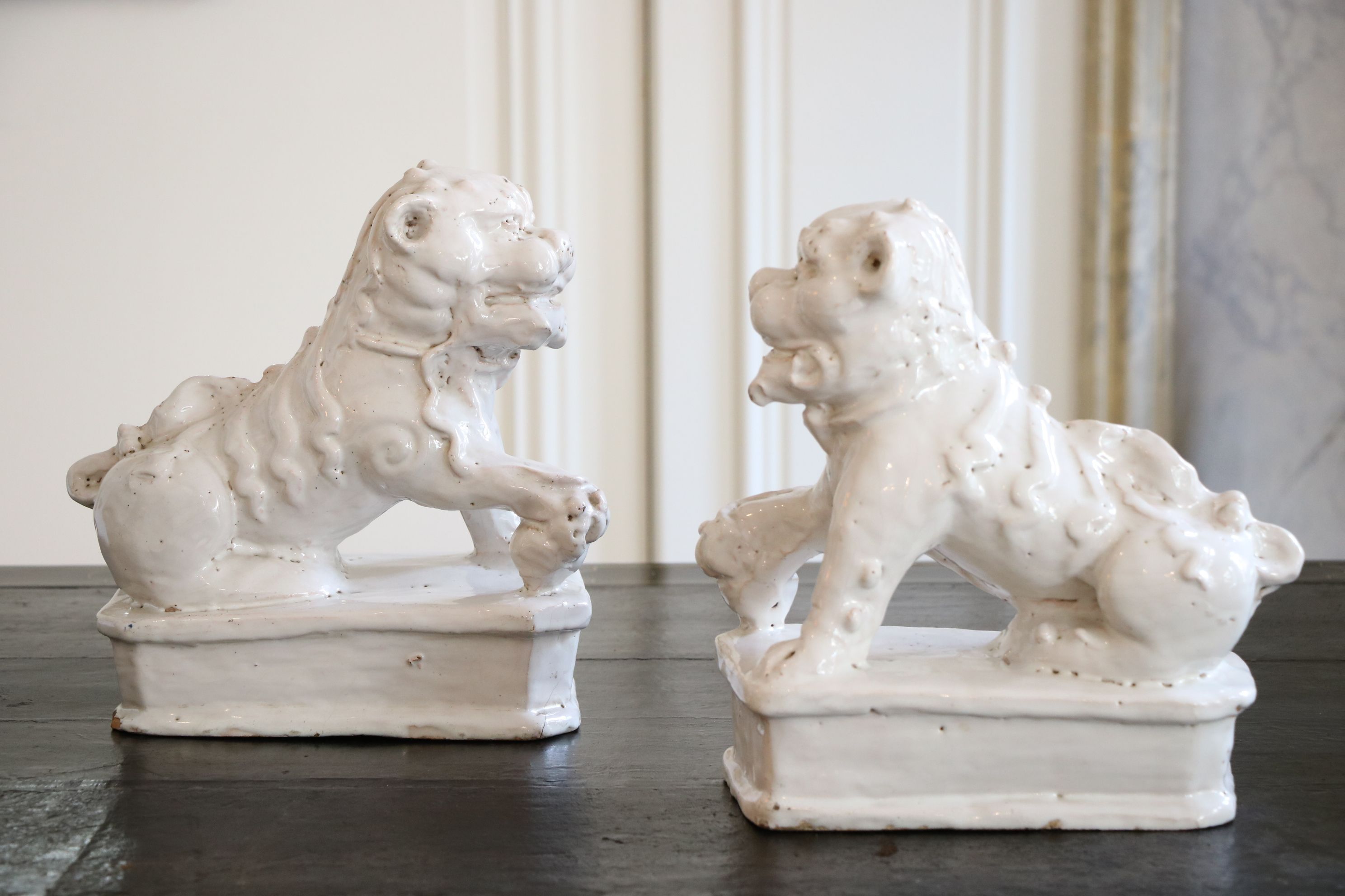 Paire de chiens de Phô en faïence reposant sur un socle. Travail de la ville de Nevers Epoque de la fin du XVIIe siècle Restaurations d’usage H. 28 x L. 13,5 x P. 23 cm Une paire identique avec un décors bleu a été vendu chez Christie’s le 17 novembre 2010 sous le lot 65.