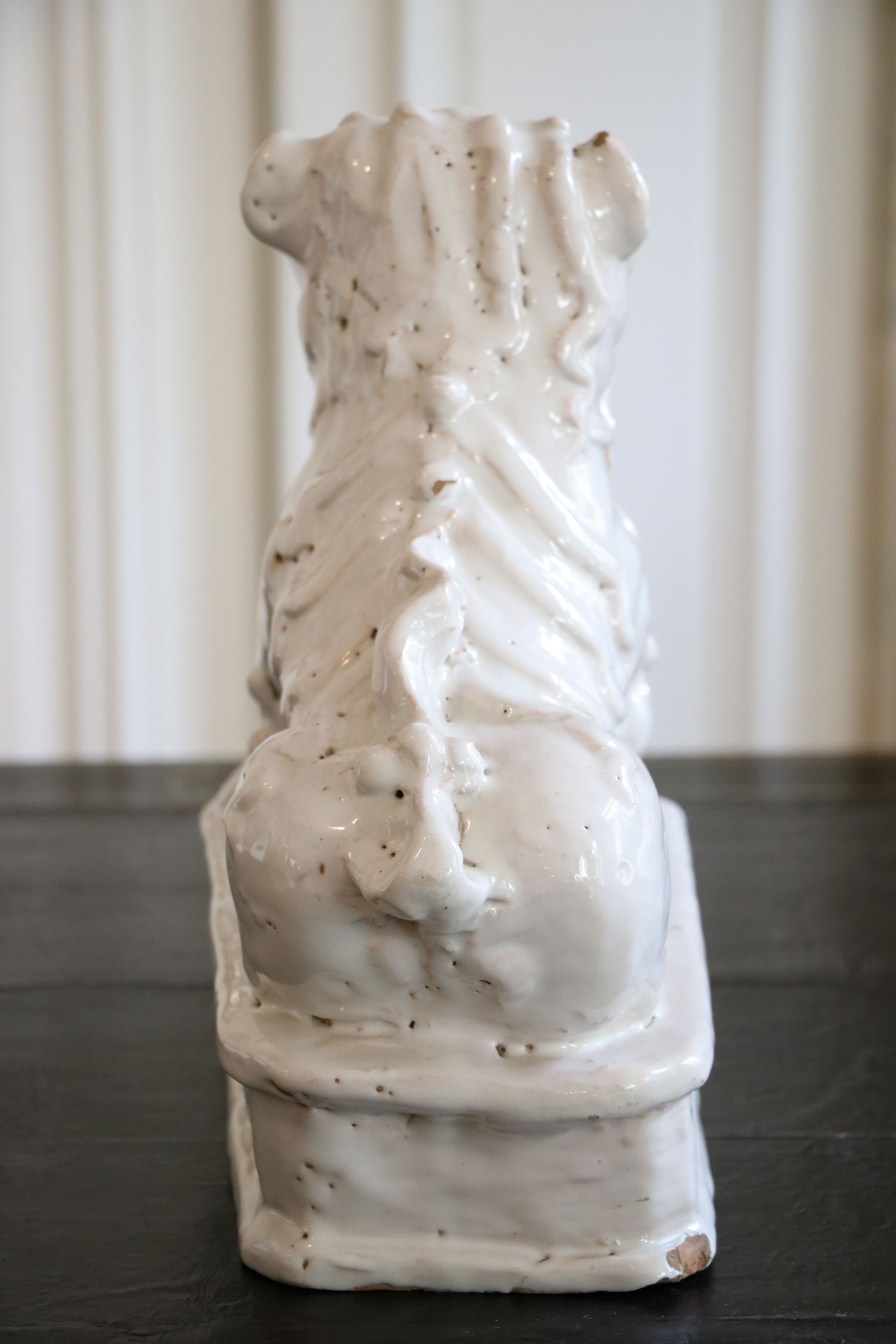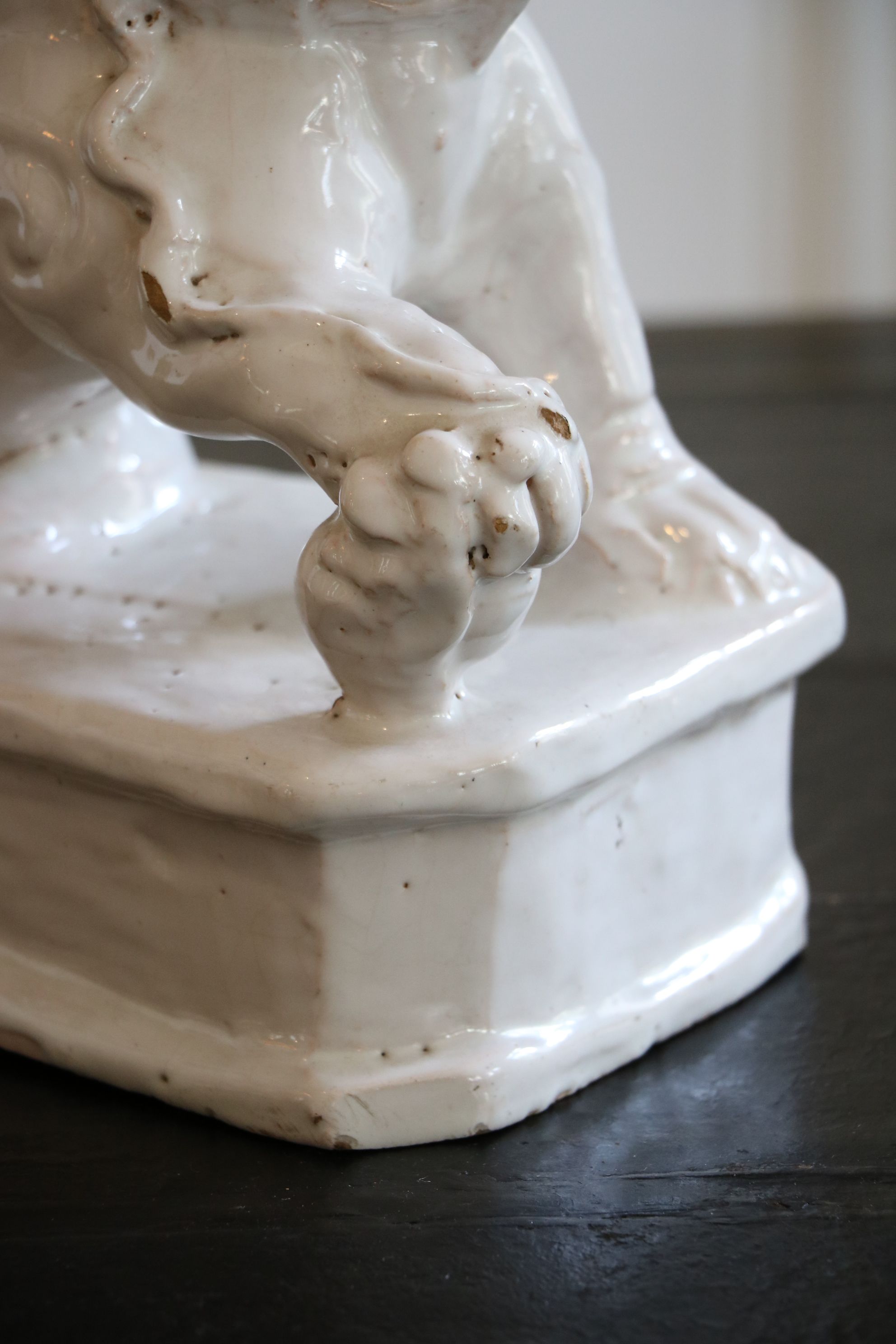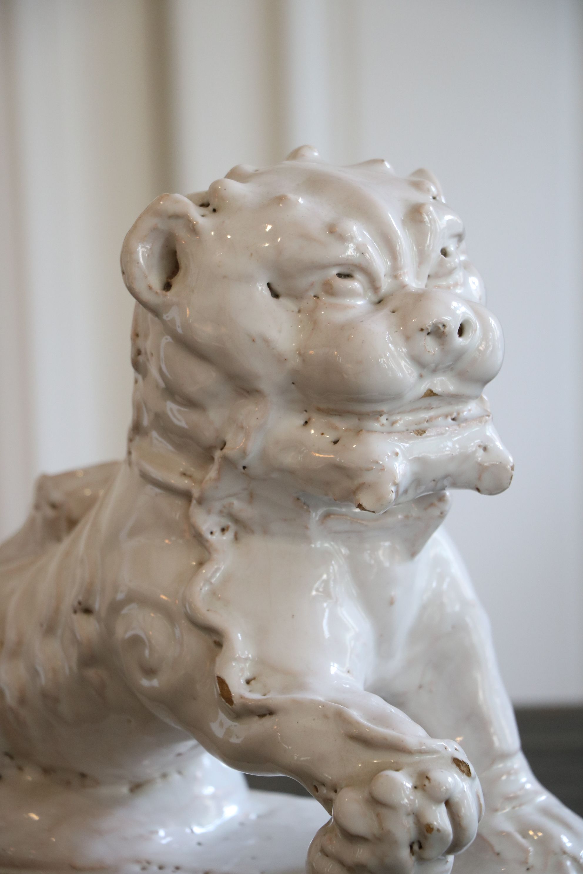 Paire de chiens de Phô en faïence reposant sur un socle. Travail de la ville de Nevers Epoque de la fin du XVIIe siècle Restaurations d’usage H. 28 x L. 13,5 x P. 23 cm Une paire identique avec un décors bleu a été vendu chez Christie’s le 17 novembre 2010 sous le lot 65.