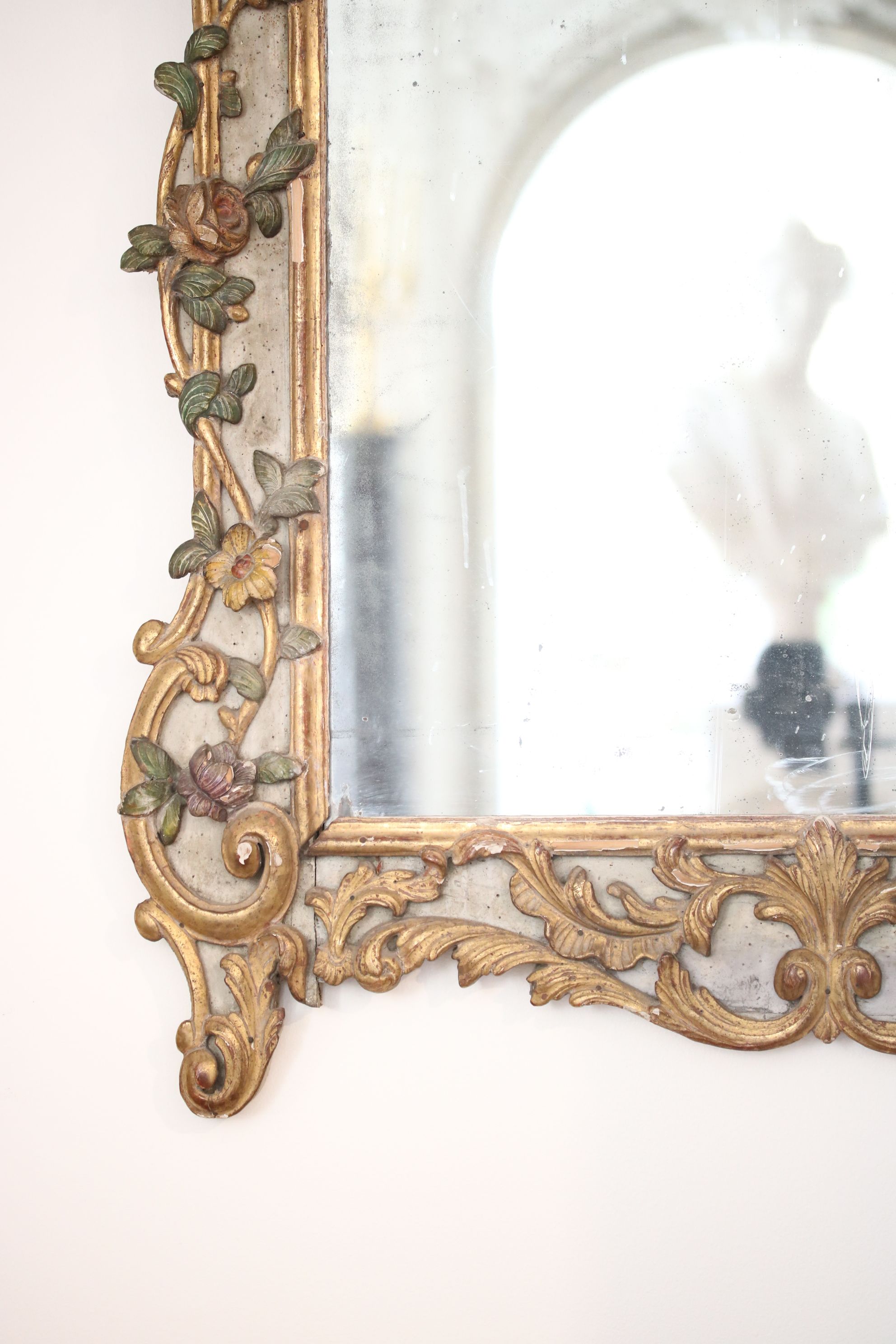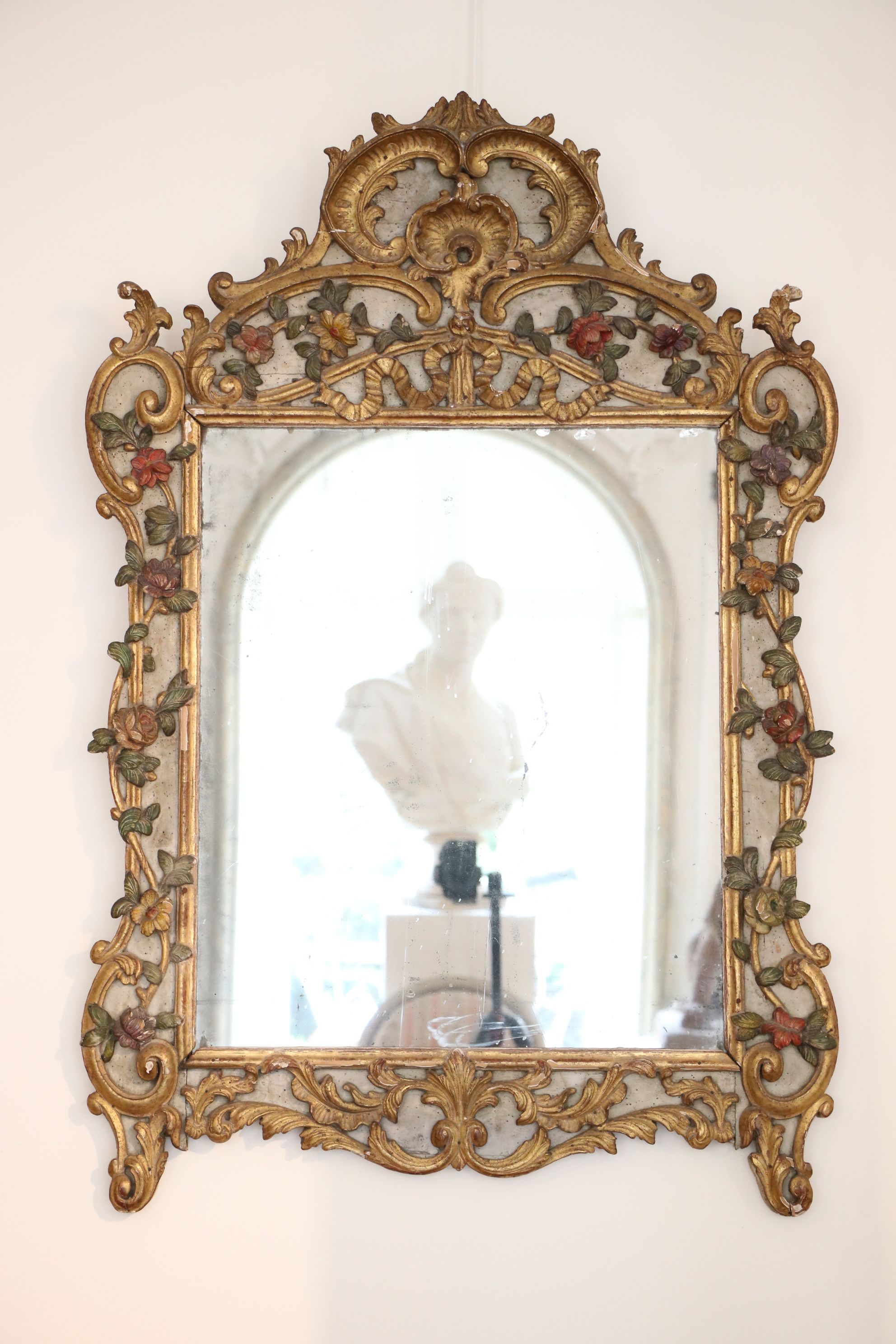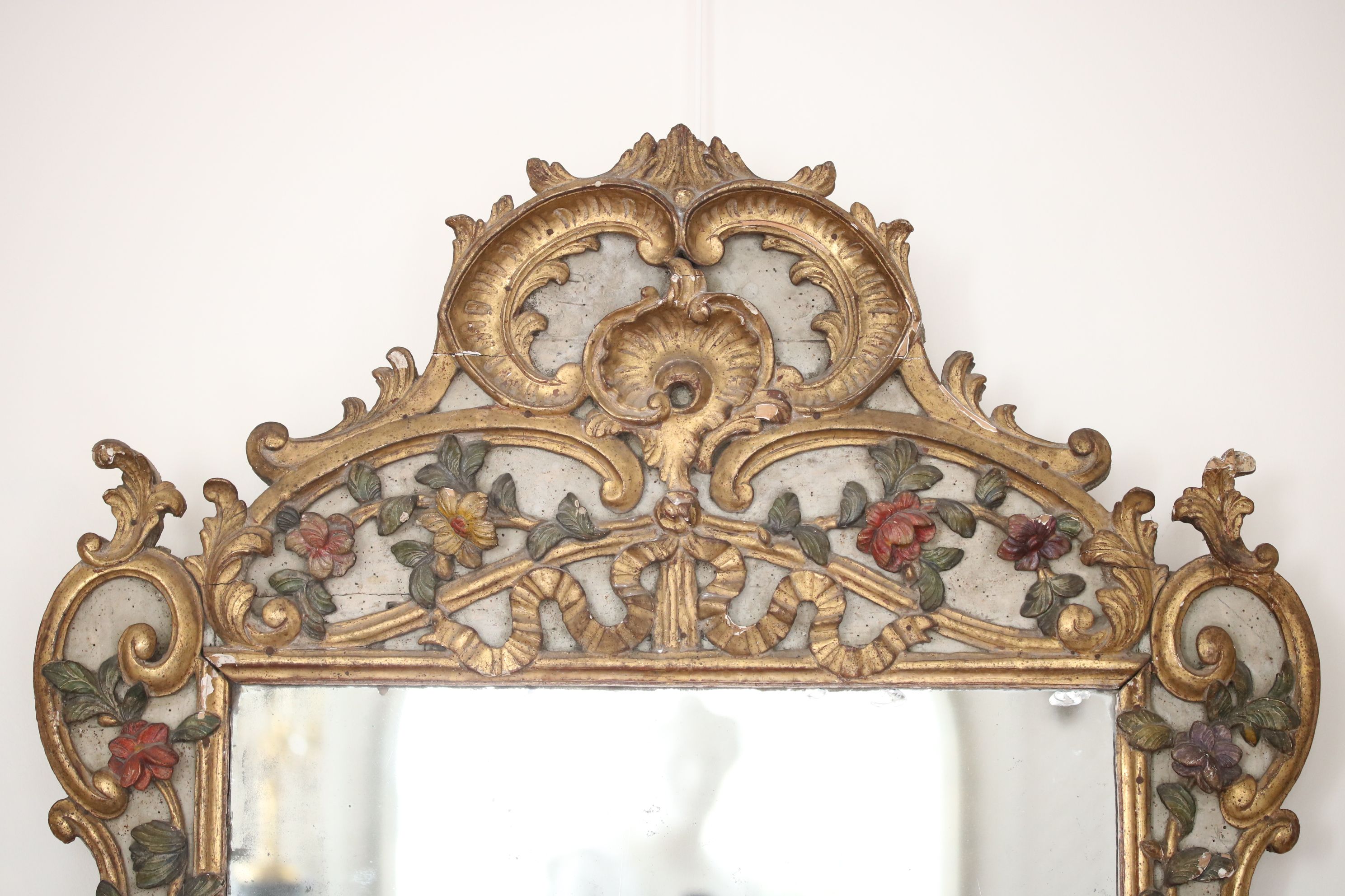 Miroir en bois doré rechampi vert à décors de guirlandes de fleurs et de feuilles peintes en rose et en vert plus foncé. Les éléments sculptés en bois doré forment des courbes et contre courbes moulurées sur le tour du cadre. La partie basse de la glace est agrémentée de feuilles d’acanthe et de feuilles de refans composées de manière symétrique. Enfin, le fronton présente une coquille et un ruban noué, en plus de larges et complexes courbes. Epoque Louis XV Restaurations d’usage H. 120 x L. 80 cm
