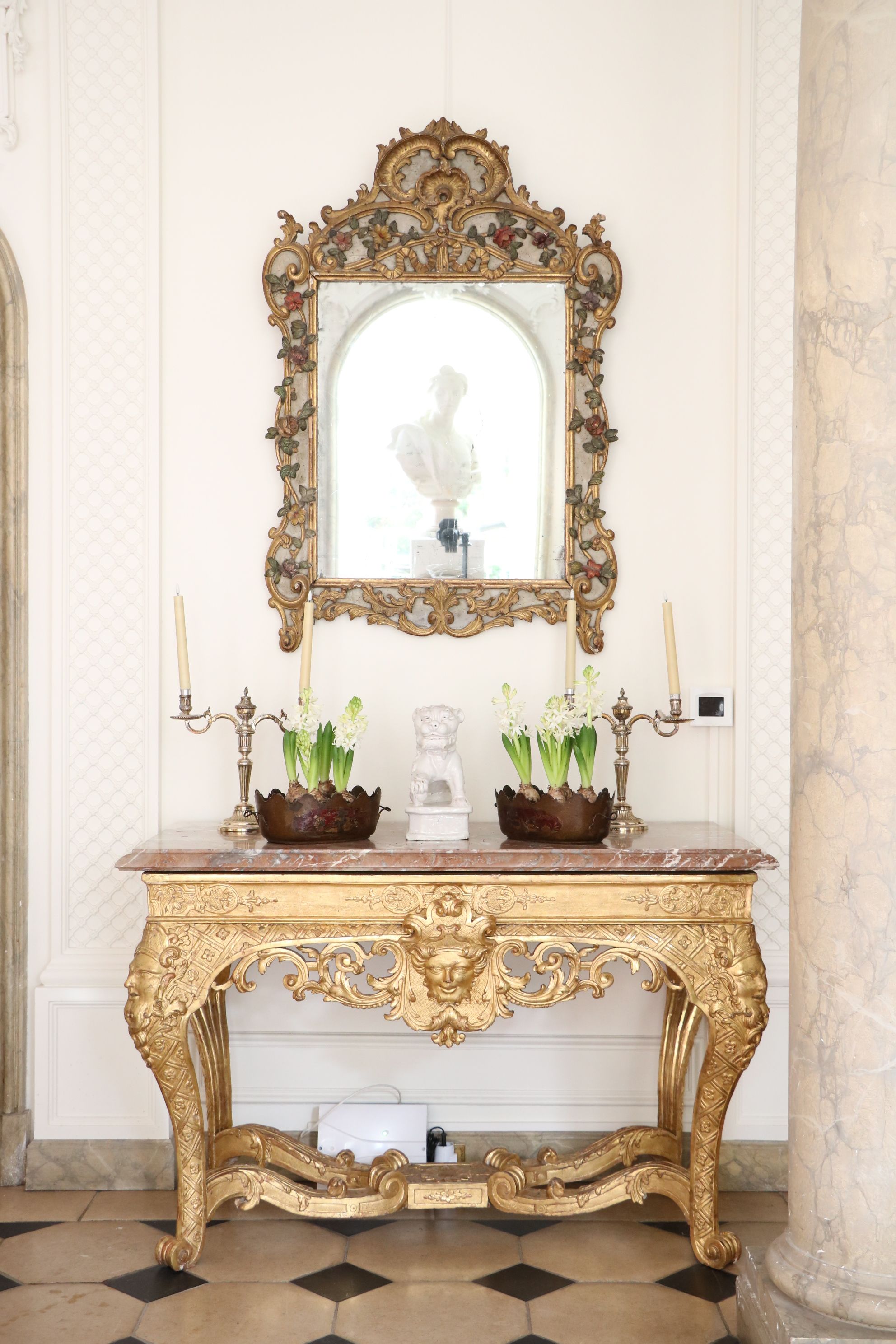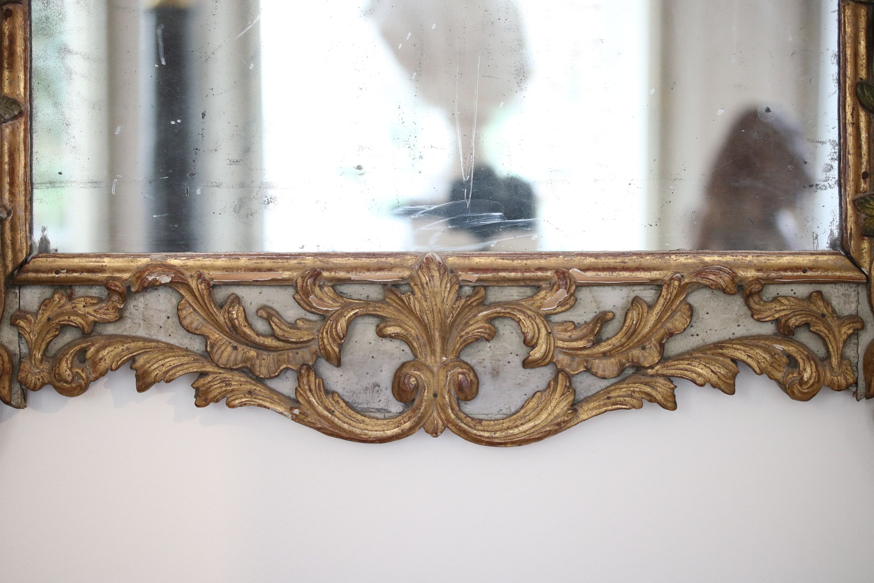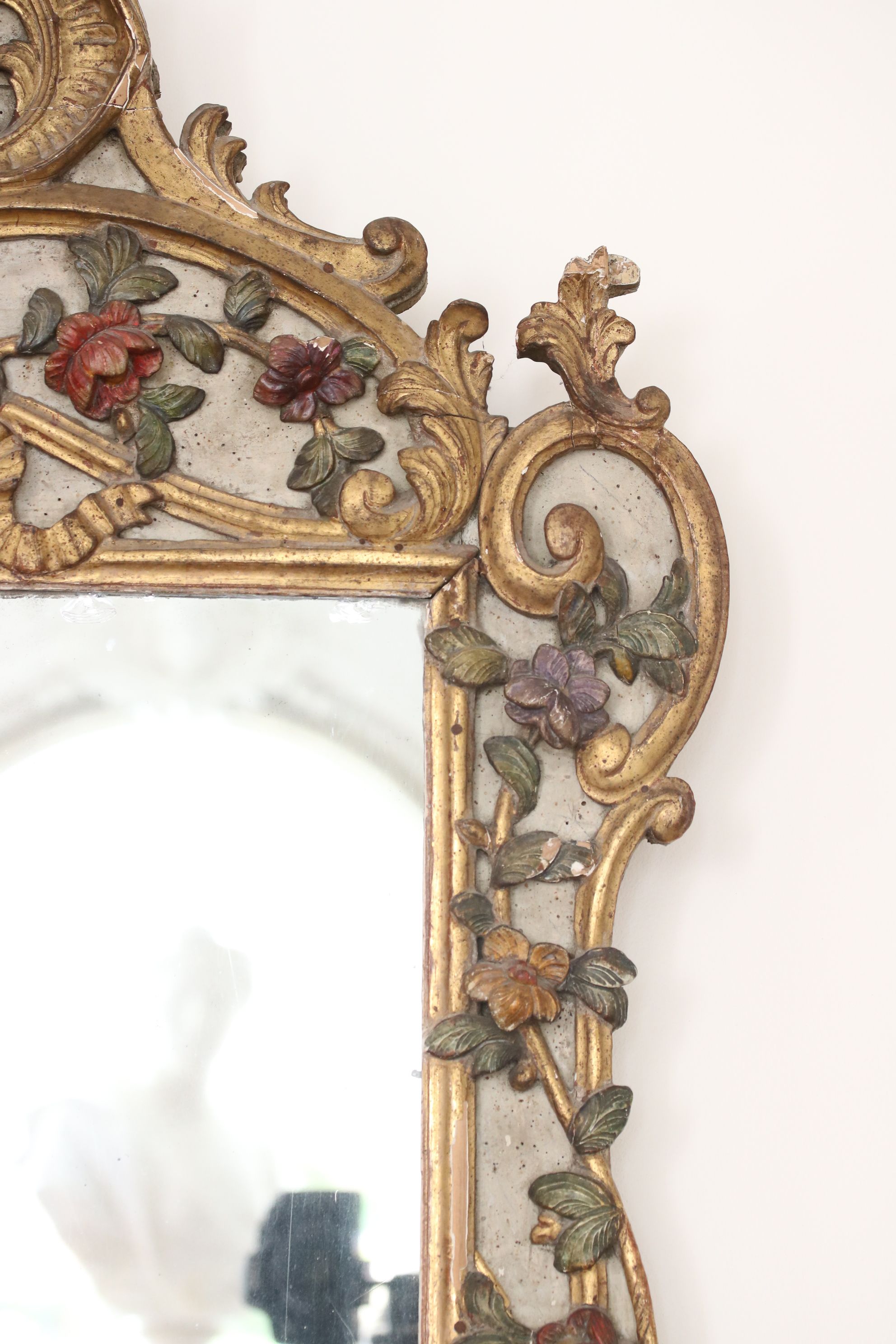 Miroir en bois doré rechampi vert à décors de guirlandes de fleurs et de feuilles peintes en rose et en vert plus foncé. Les éléments sculptés en bois doré forment des courbes et contre courbes moulurées sur le tour du cadre. La partie basse de la glace est agrémentée de feuilles d’acanthe et de feuilles de refans composées de manière symétrique. Enfin, le fronton présente une coquille et un ruban noué, en plus de larges et complexes courbes. Epoque Louis XV Restaurations d’usage H. 120 x L. 80 cm