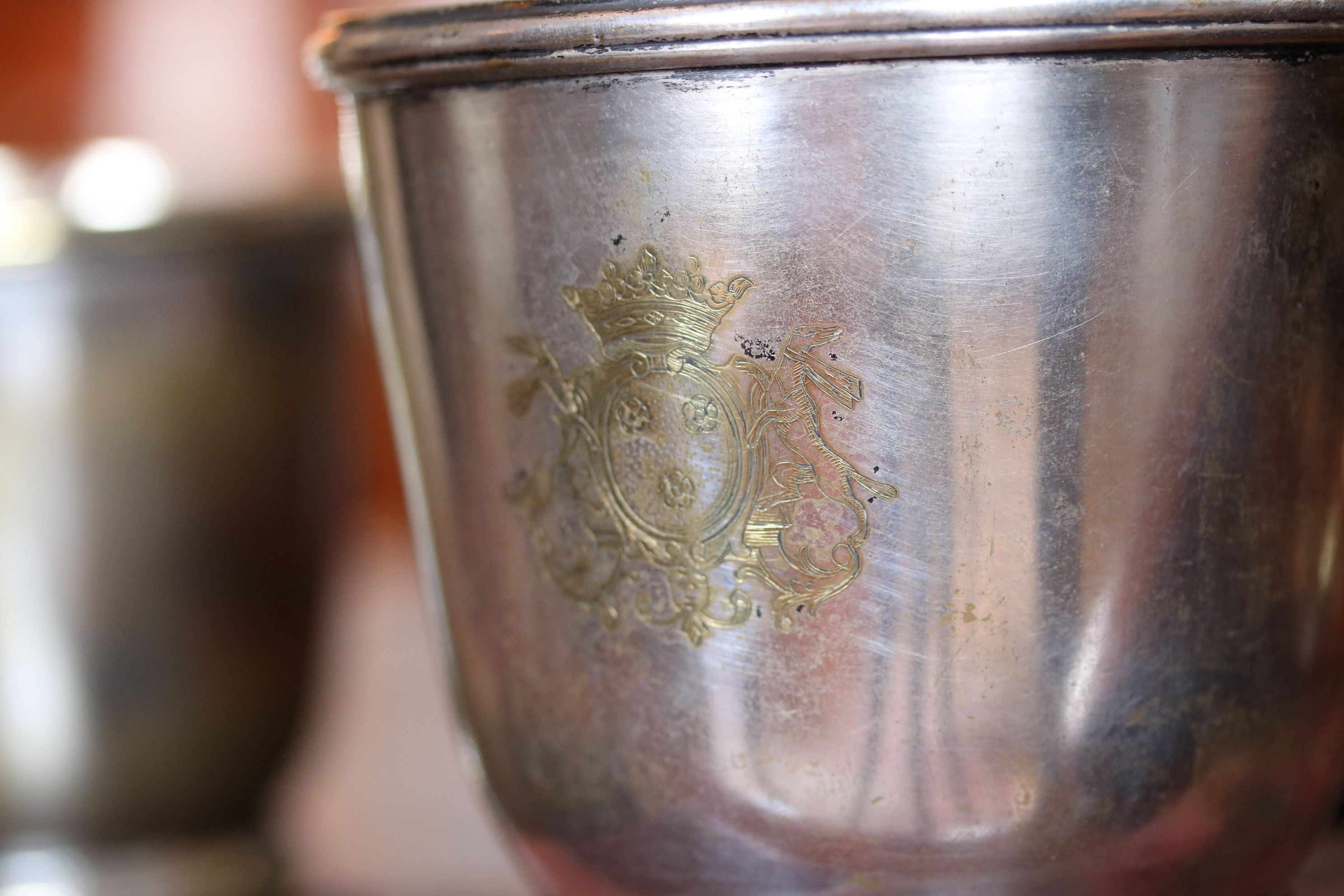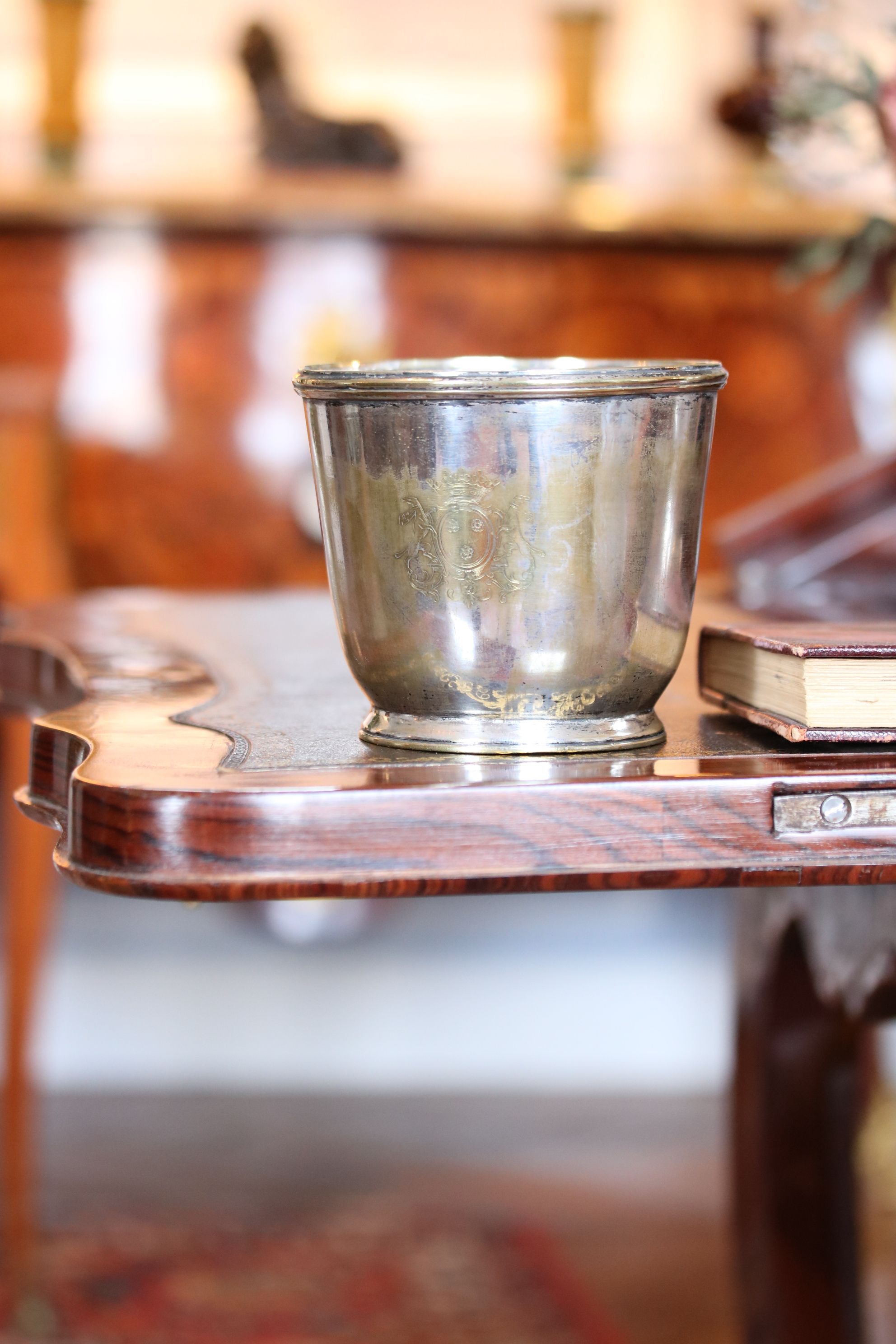 Paire de petits rafraichissoirs à verres armoiriées en métal argenté. Ils présentent la marque du C couronné. Les armes gravées appartiennent au marquis de Rosen. Epoque Louis XV Restaurations d’usage H.10 x D.11,5 cm