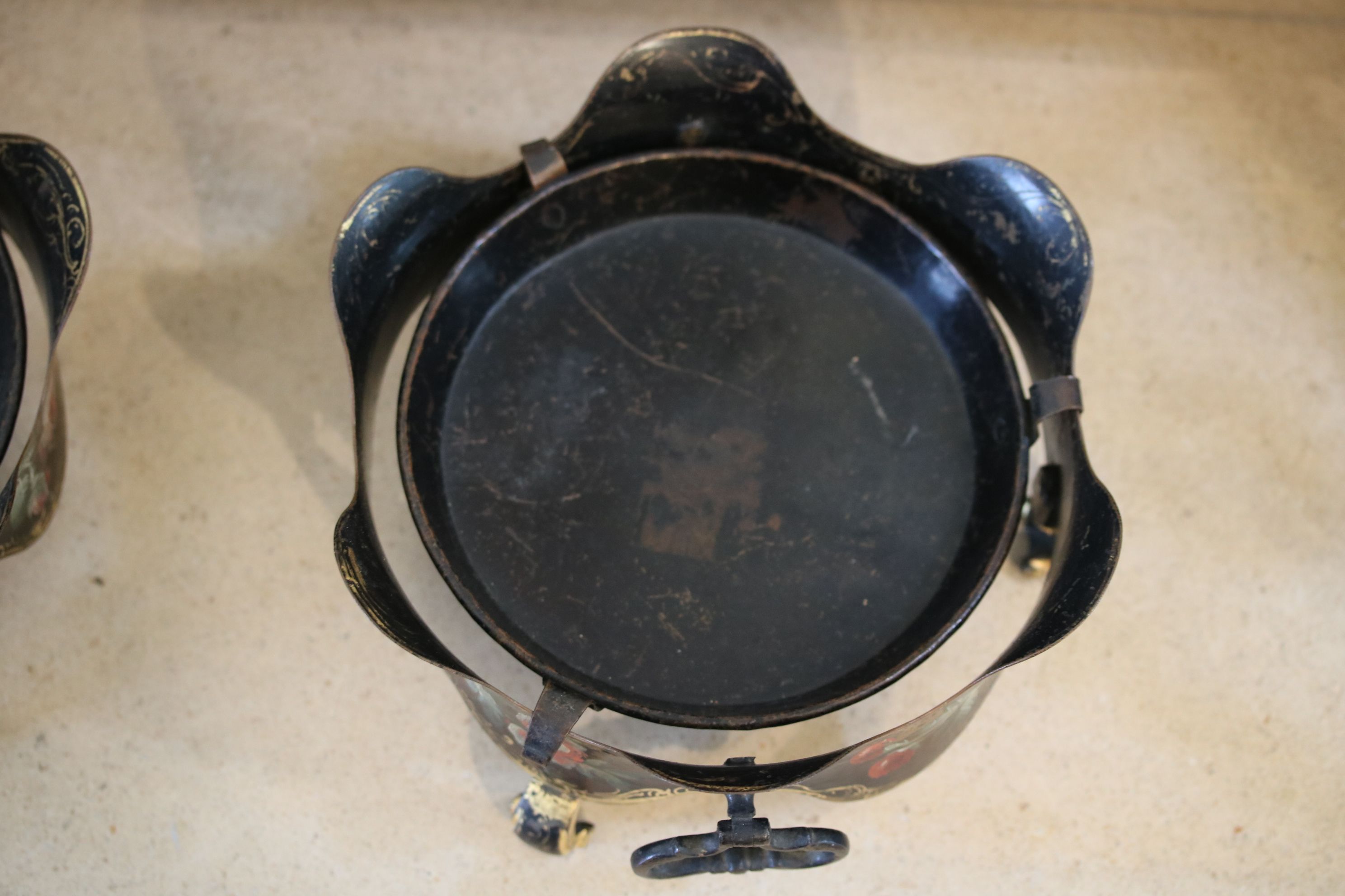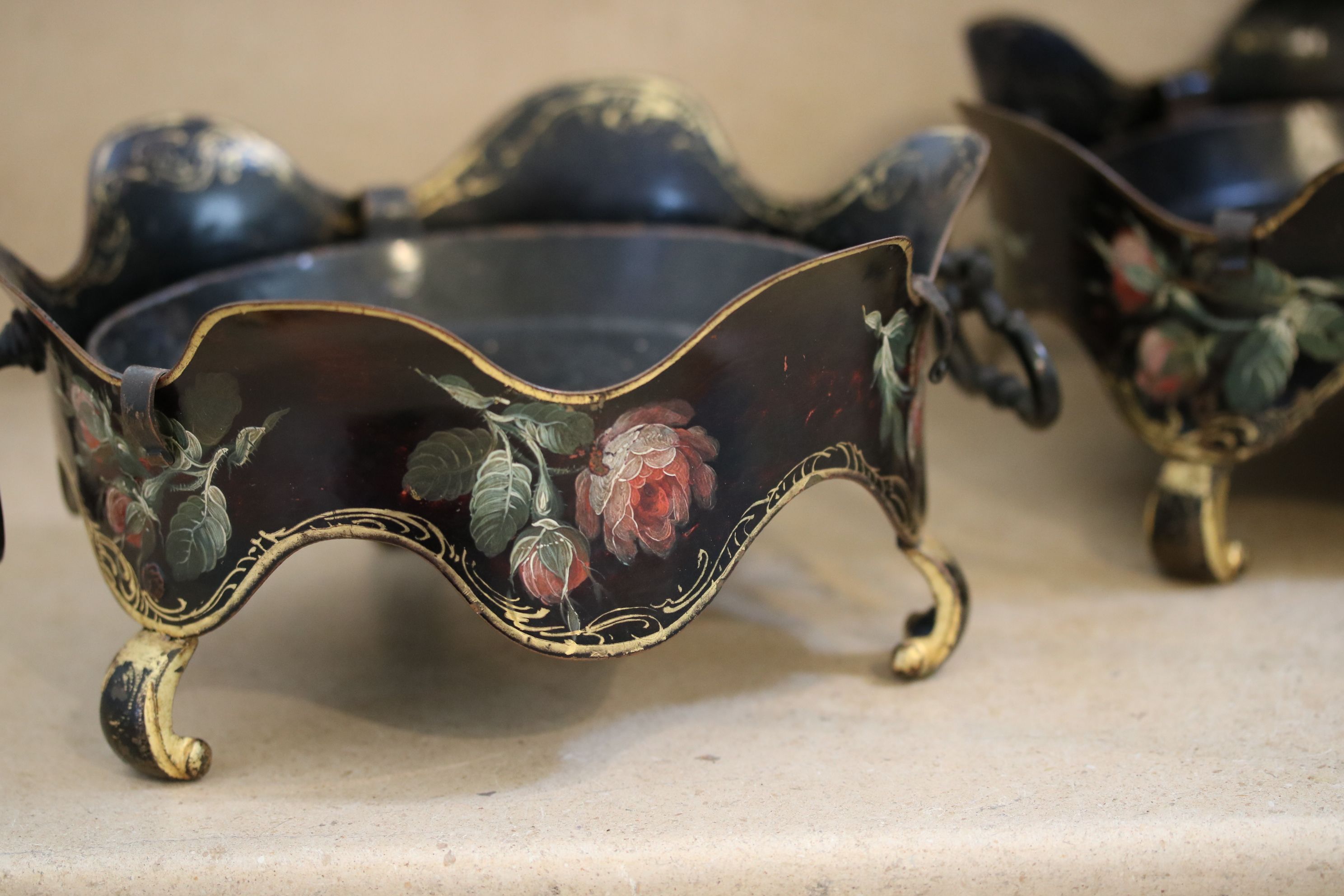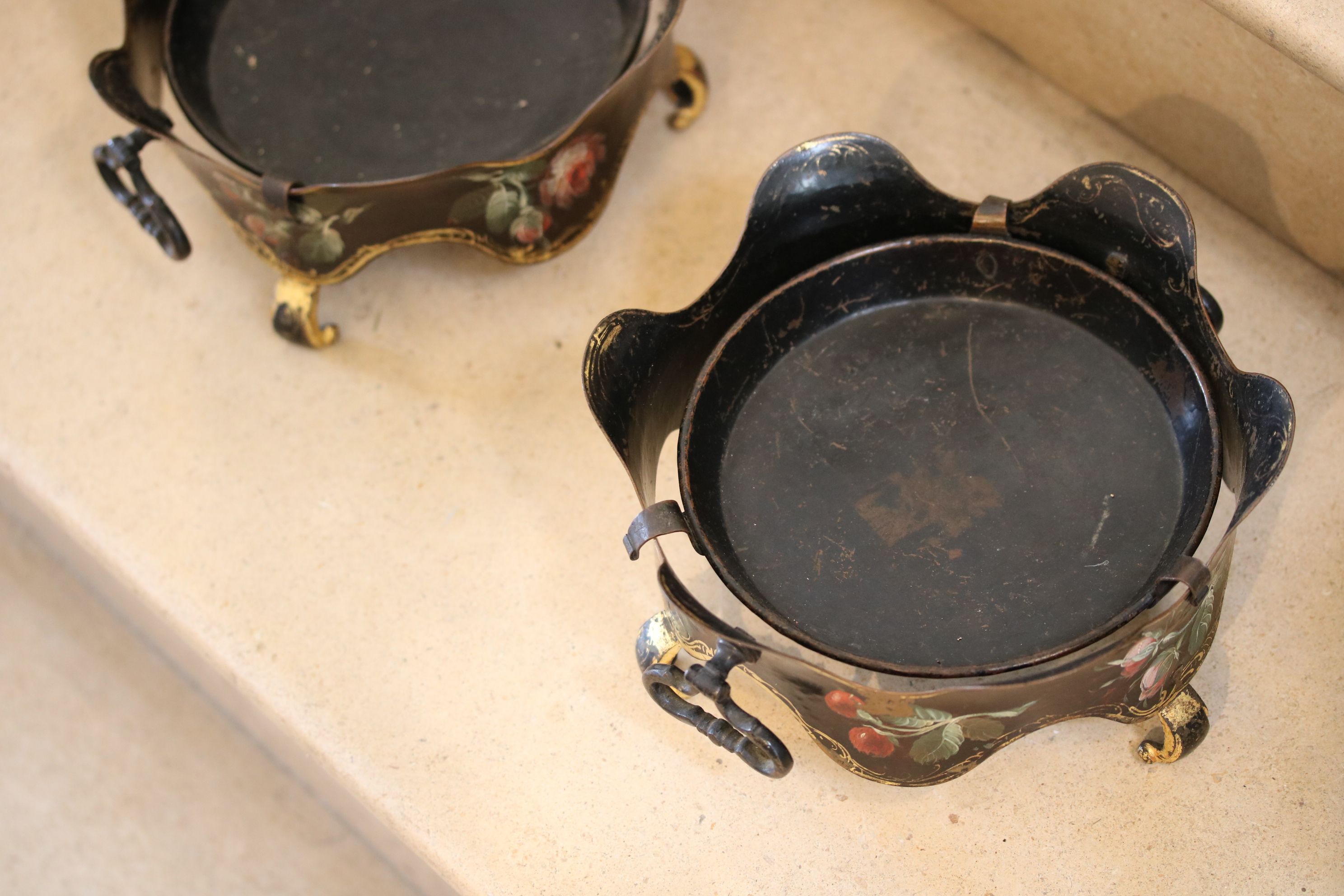 Paire de probable portes jardinière reposant sur trois petits pieds dorés et encadrés par deux poignées mobiles. Les deux éléments sont laqués noir et ornés d’un décor de fleurs polychromes peintes. Le centre de chacun d’eux présente un plateau amovible. Epoque Louis XV Restaurations d’usage H. 10 x D. 21 cm